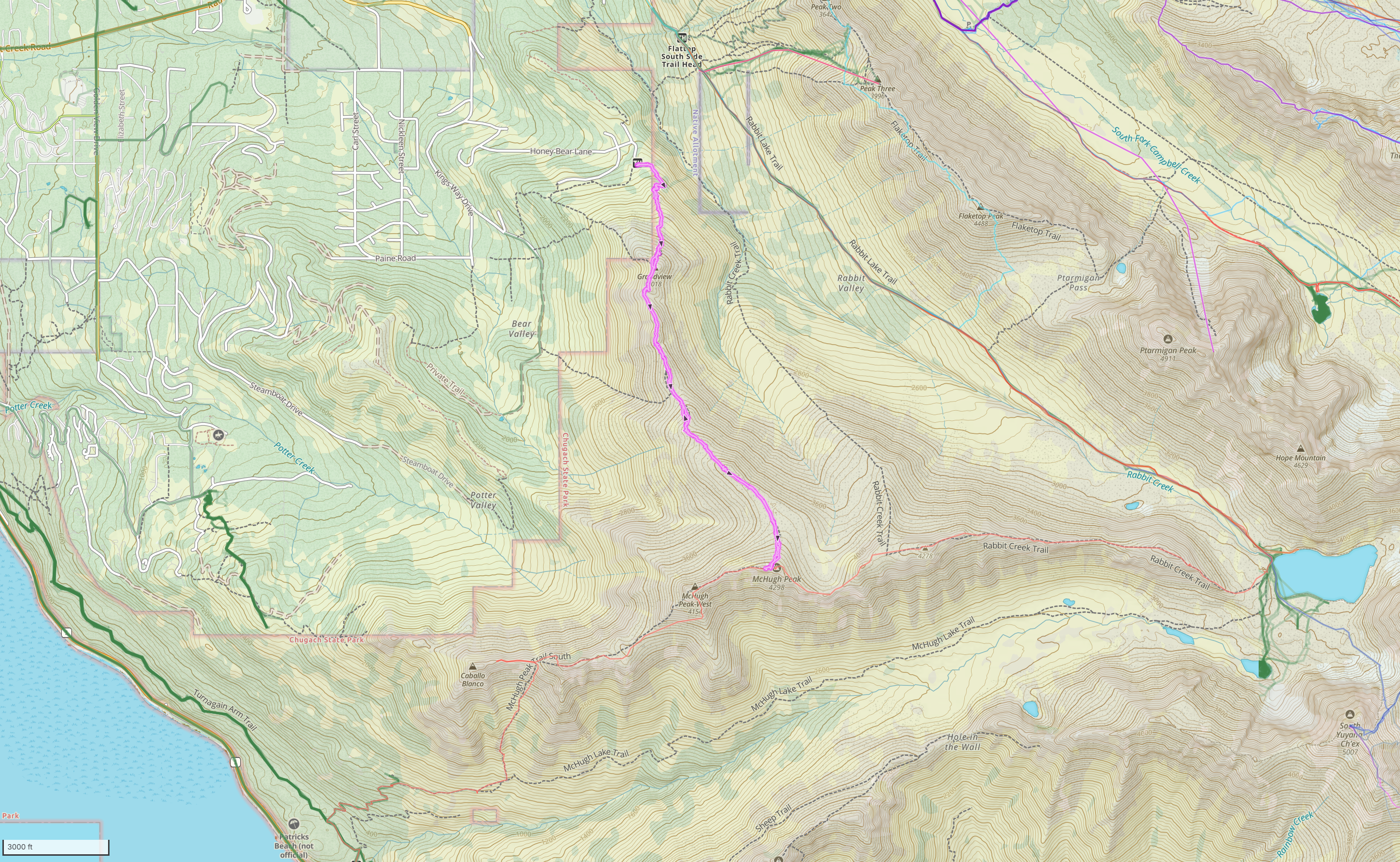 The trail starts off with a climb of ~.8 mile and ~900′ of vertical gain to achieve the point labeled as “Turtle Point” on some maps and “Grandview” on others. Grandview was a fitting name for this day, with an incredible view of the Alaska Range, including Denali, Hunter and Foraker.