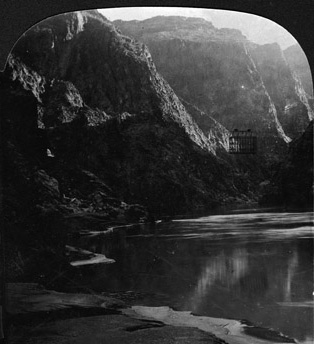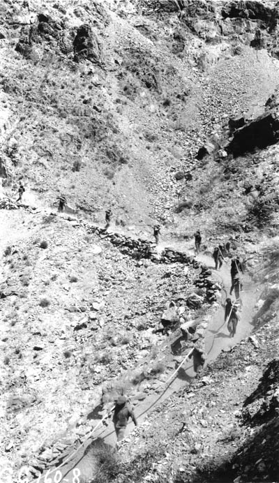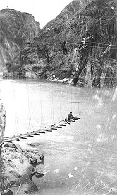 Until this 440-foot-long bridge was built in 1928, crossing the Colorado here was treacherous, first requiring a boat, then in 1913 a cableway, and in 1920 a suspension bridge that was deemed unsafe due to lack of structural stiffness. Being that there were no roads to access the site, all of the 122 tons of building materials for The Black Bridge were brought down 9 miles from the South Kaibab Trailhead, by human and mule, including the one ton, 550 long suspension cables that were carried by 42 single file walking Havasupai Tribesman.