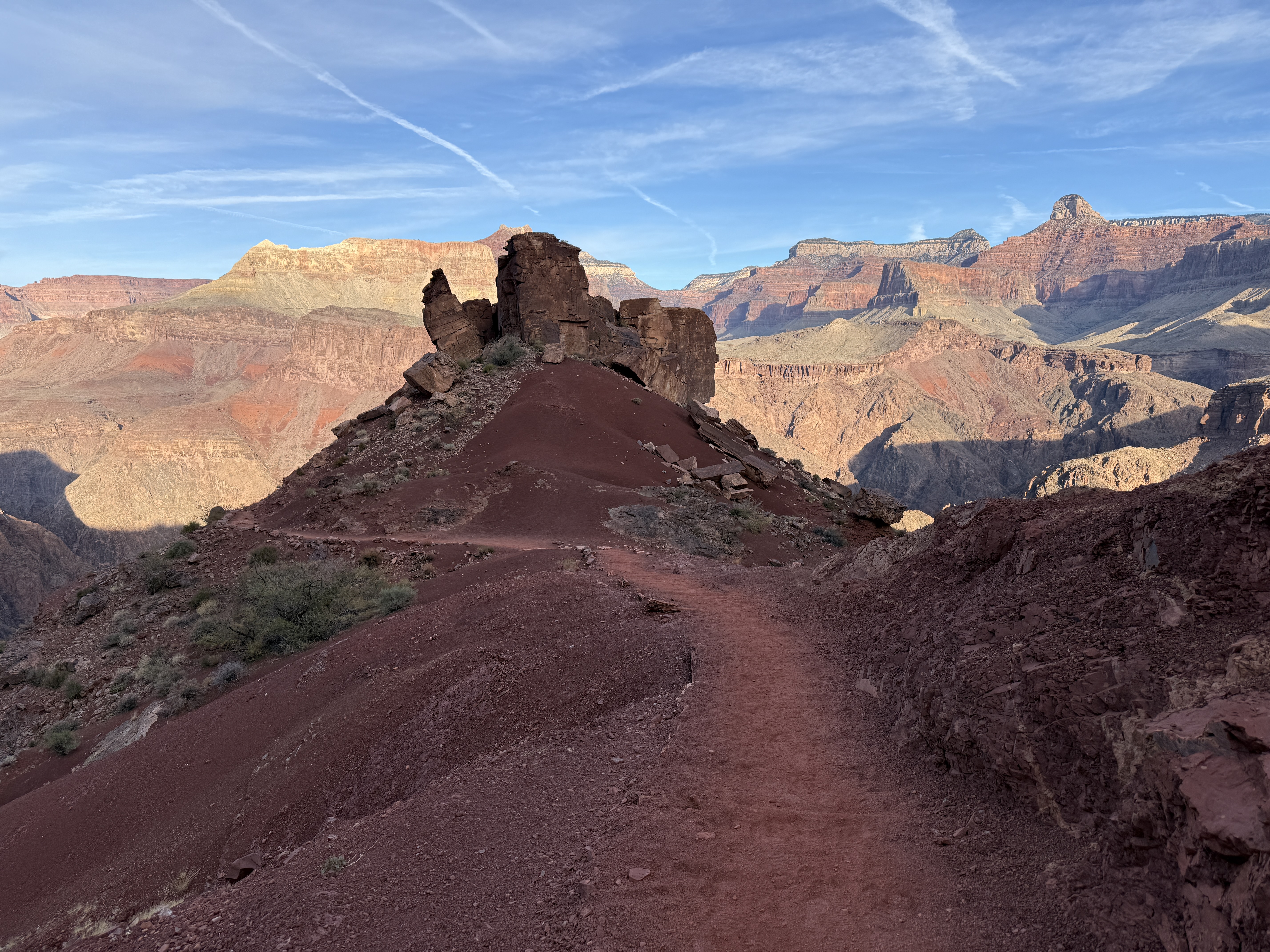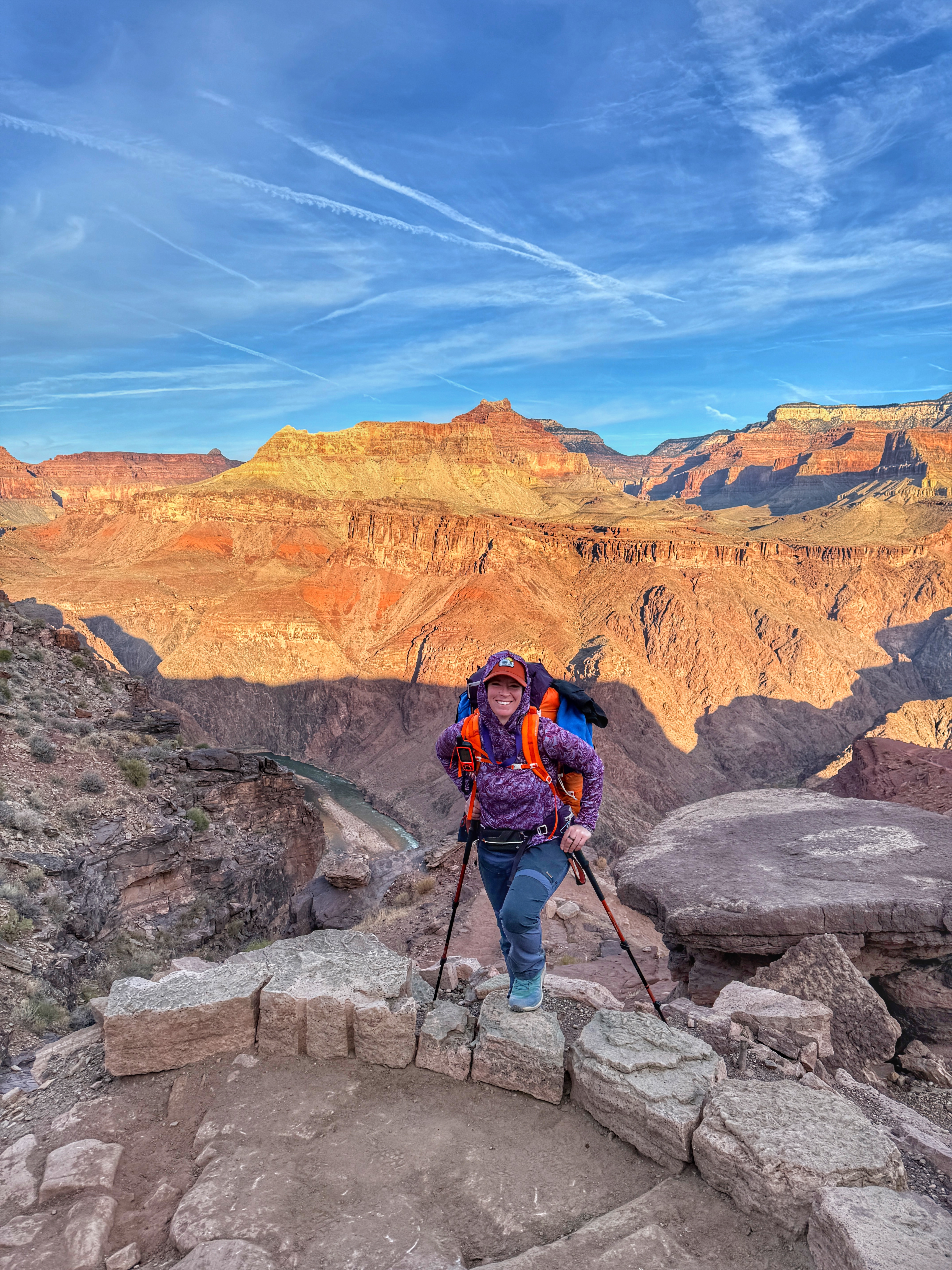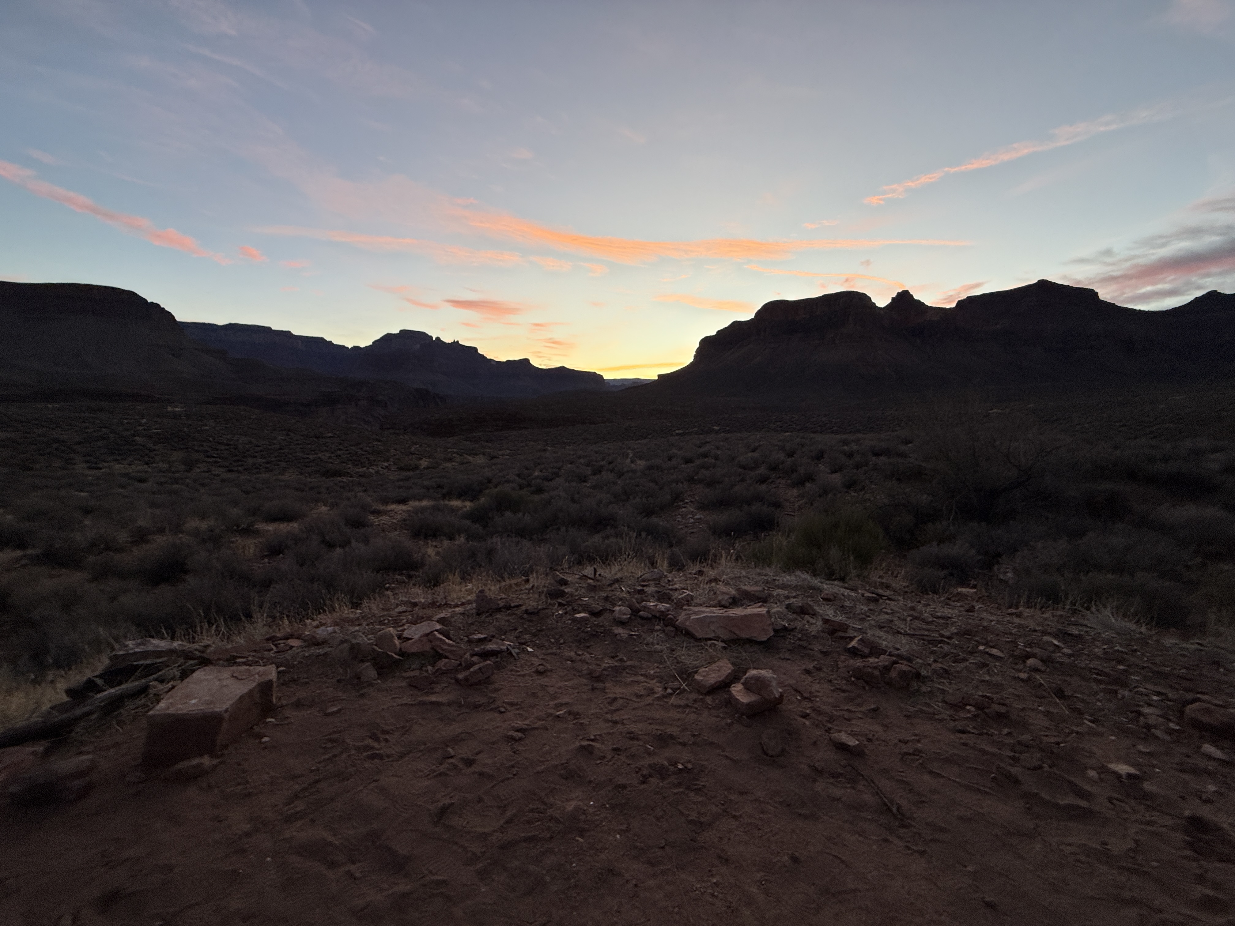 I woke before the daylight, rested and excited to see what was to come. As the pink clouds signaled the rising of the sun, I made some coffee and oatmeal and ate and drank as I broke down camp. There are no bathroom facilities in this remote area so I carried wag bags, but decided I could make it the almost two miles back to Tip Off, where there is a composting toilet. If not, I would have to carry the used wag bag for the next 5 days. I could hold it. I poured out some of my excess water, knowing that I could refill in about 5 miles at Phantom Ranch, and my legs were very happy about that!