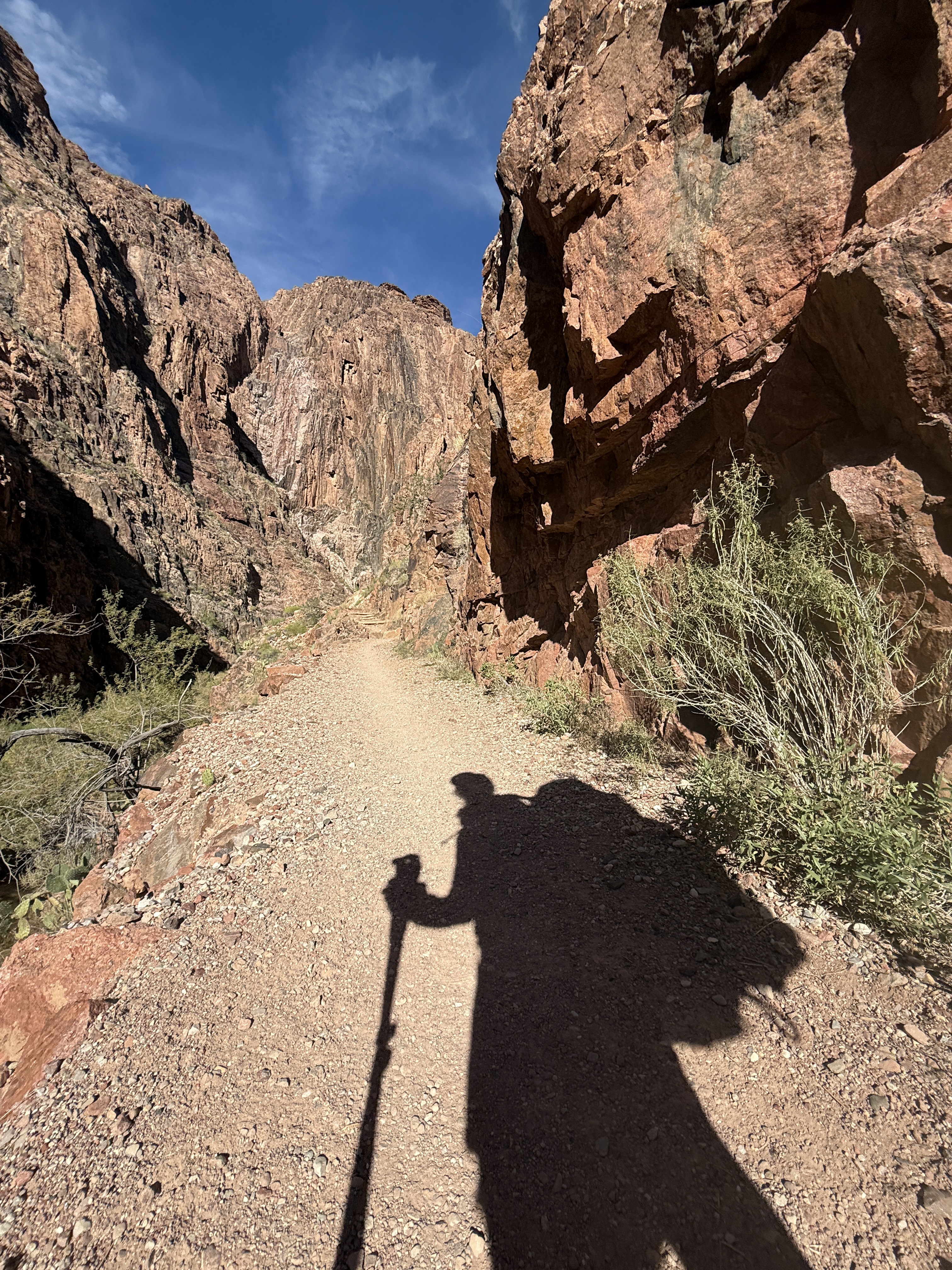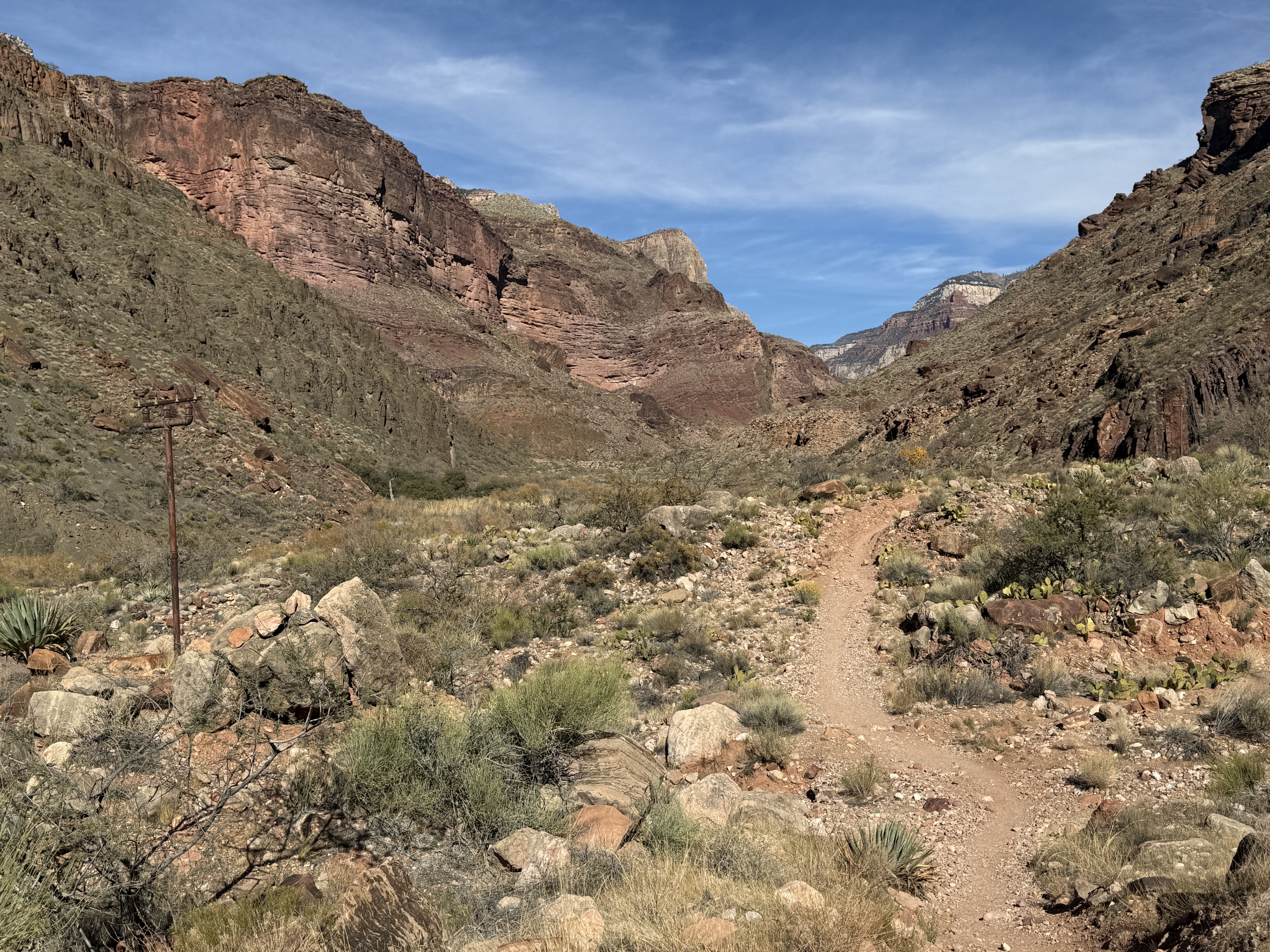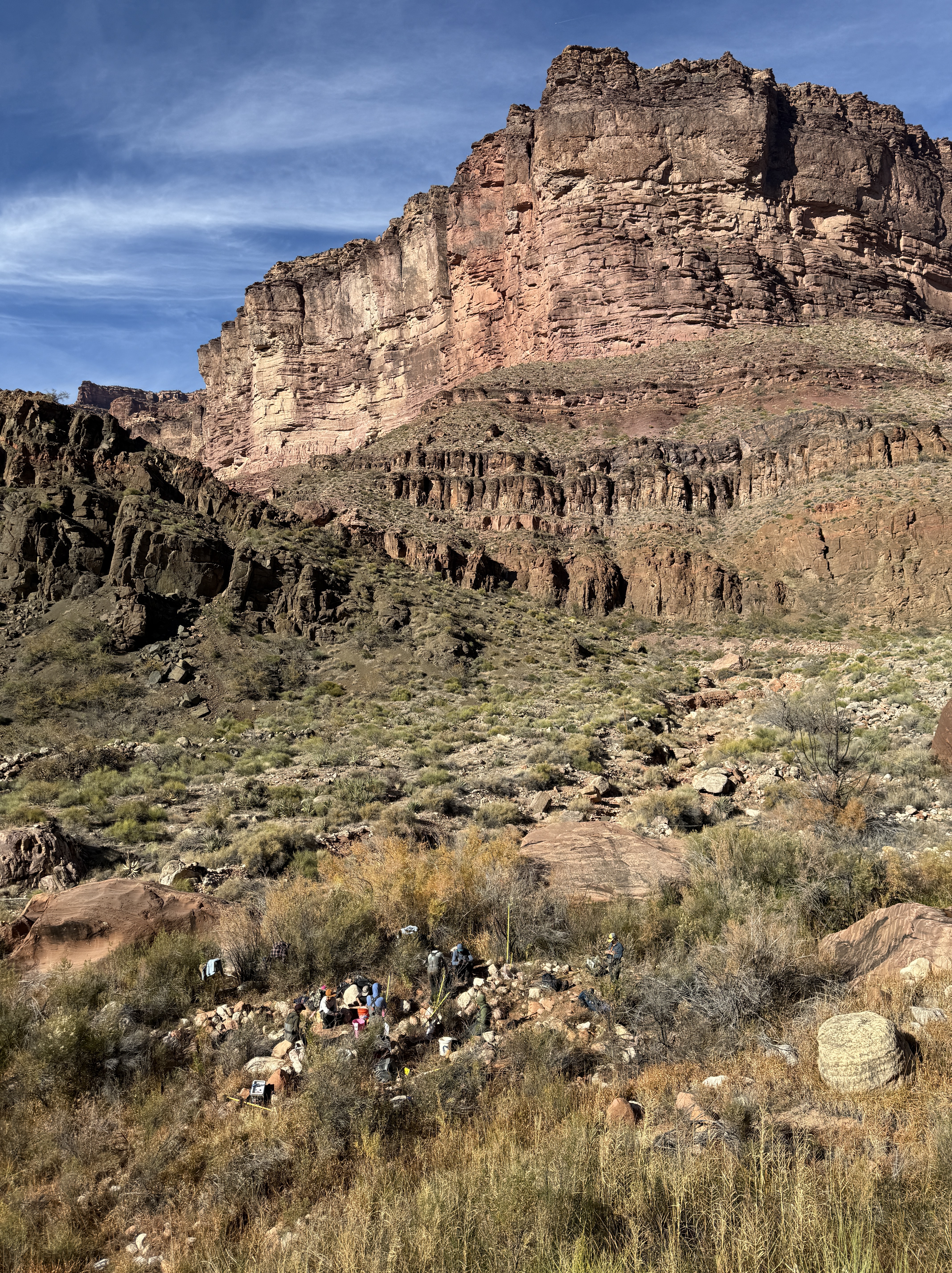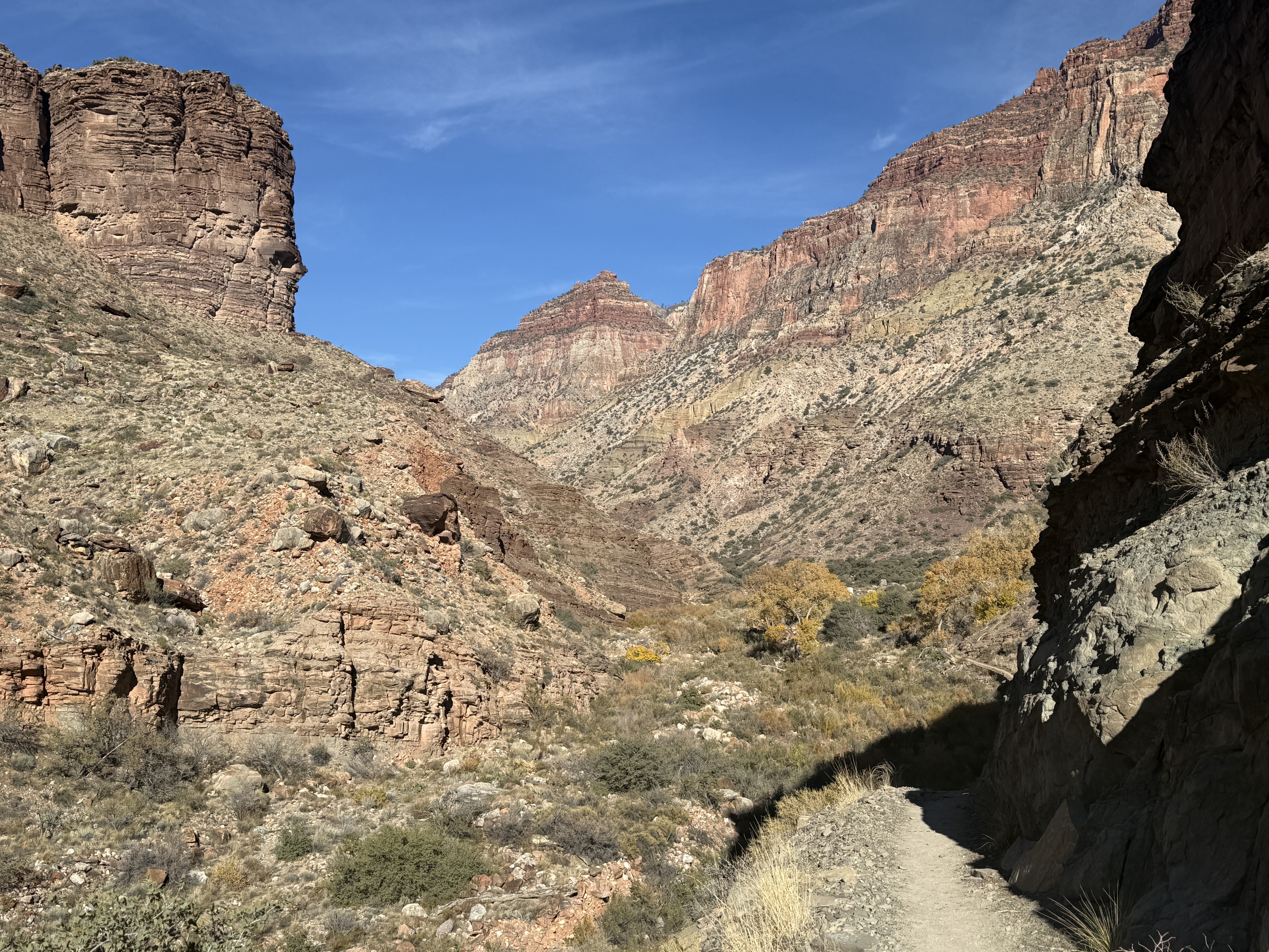 Eventually, the box canyon opened up into a wide Valley and I was in the sun again. The temperatures had been long sleeve sun shirt warm in the canyon, but now I was sure it was in the mid 60s. I stripped off a layer and changed into shorts. I looked back at where I had come from and realized that I was gaining quite a bit of elevation, now 30 or 40 feet above Bright Angel Creek at some points and maybe 1,000’ above the Colorado River. I passed a group of biologists who were doing fish studies and removing invasive species. I moved by silently, snapping a photo, but we would meet in a couple of days, further up the trail.