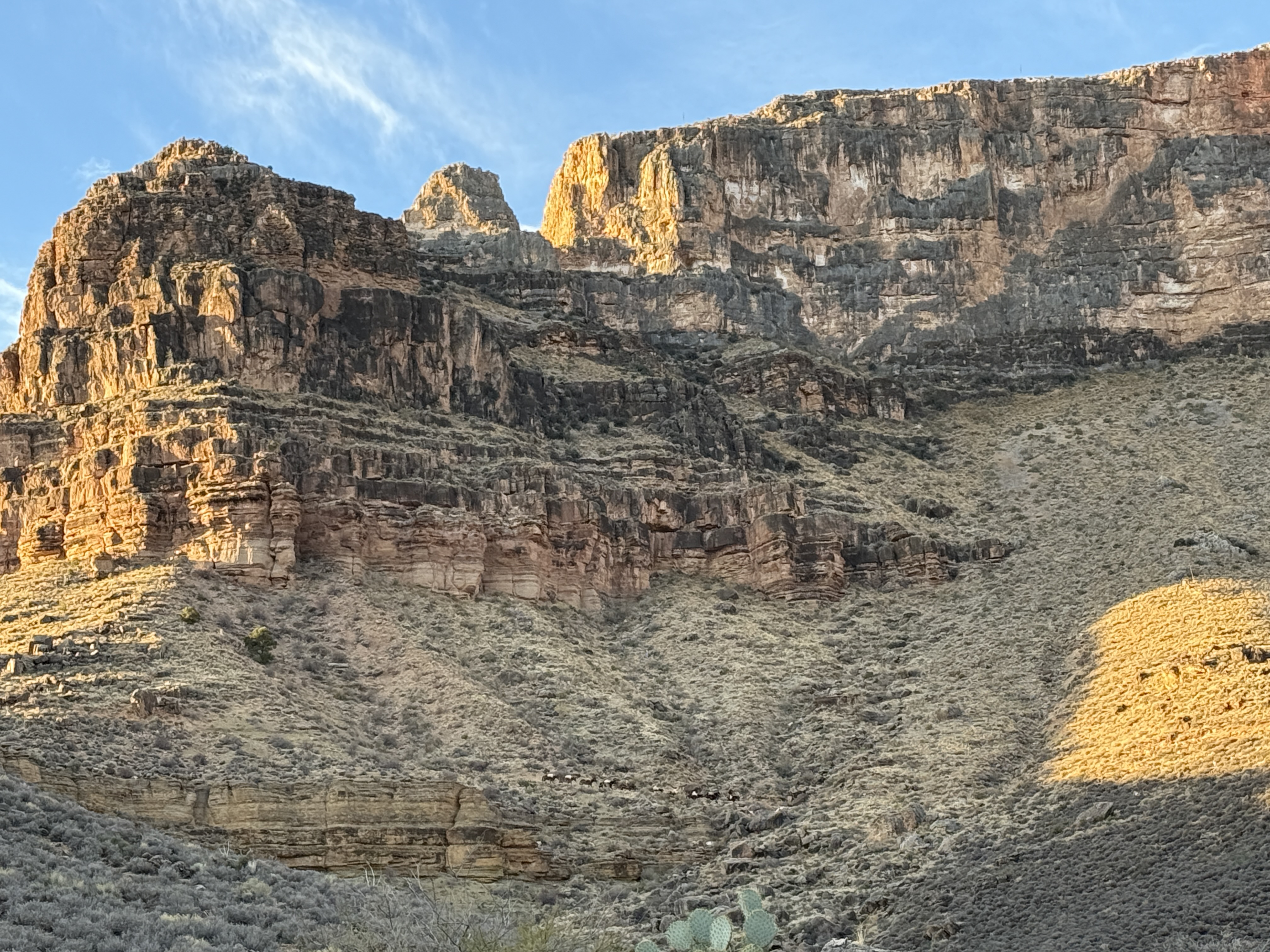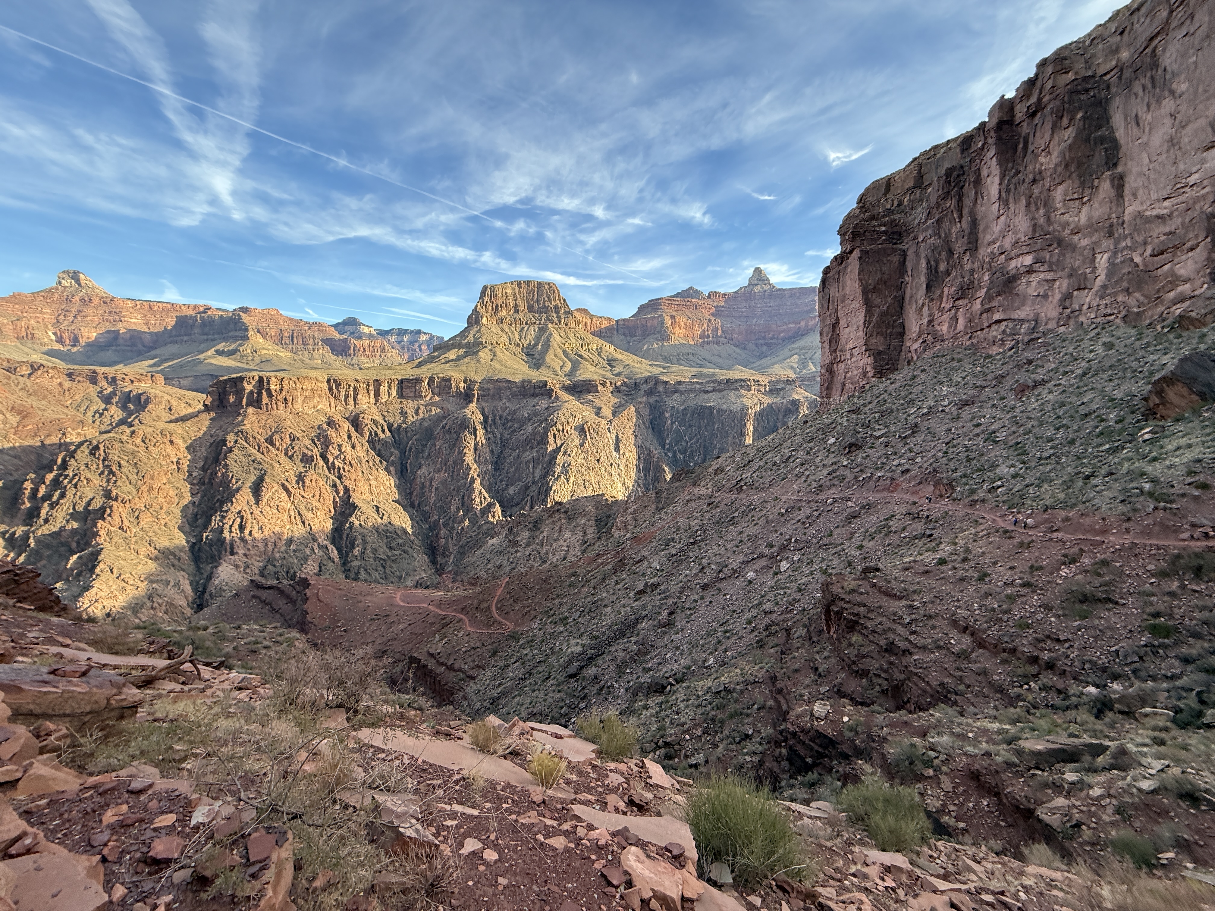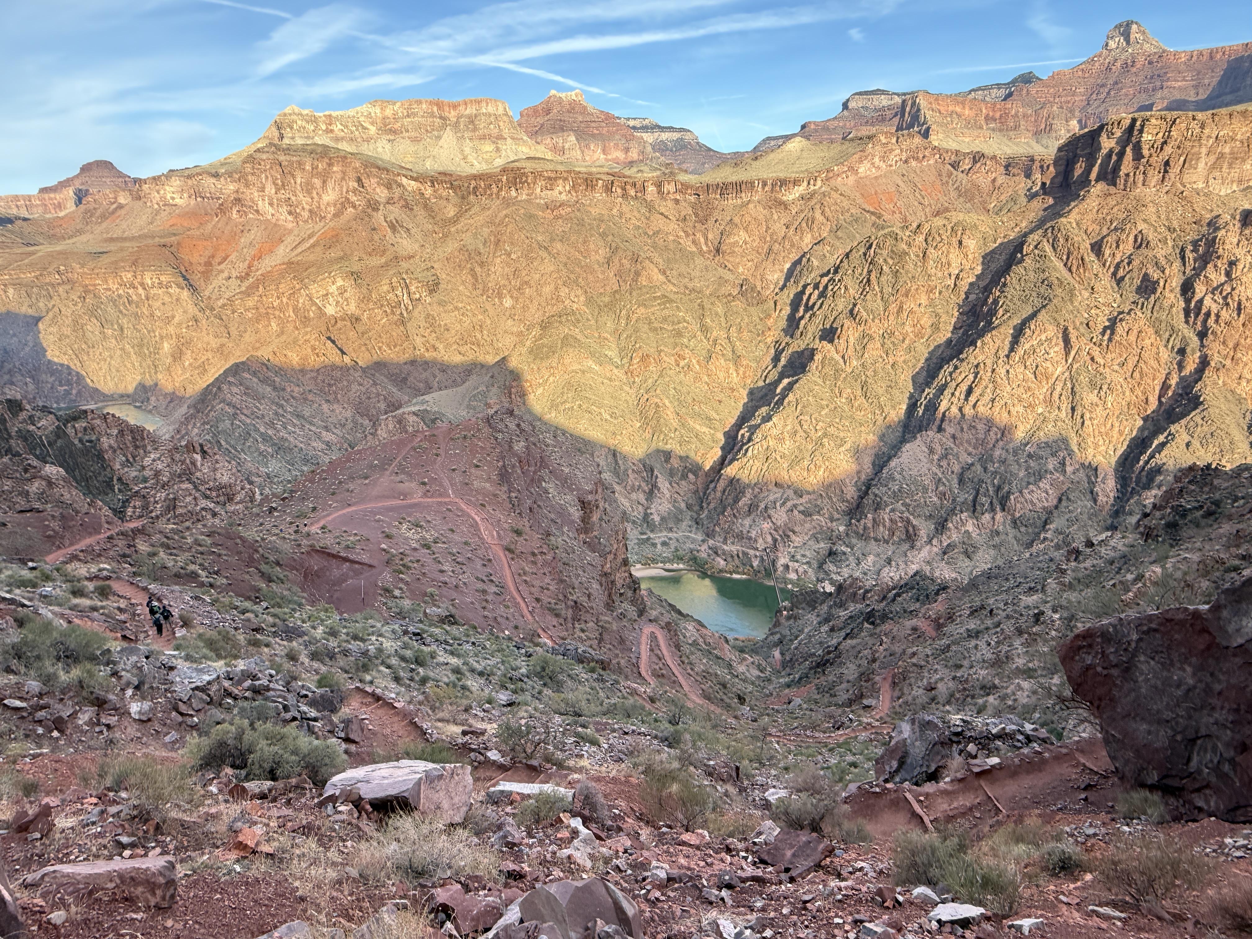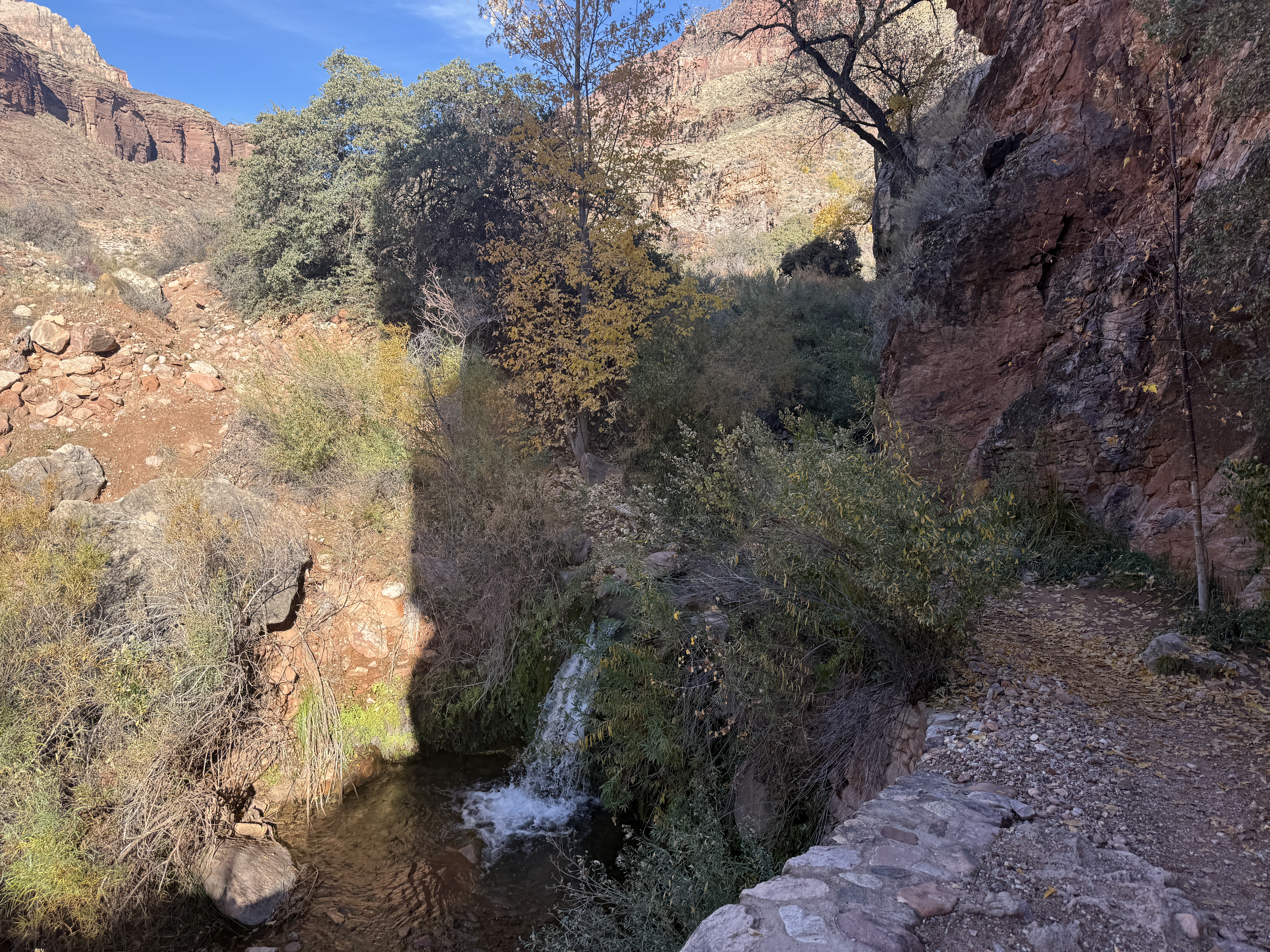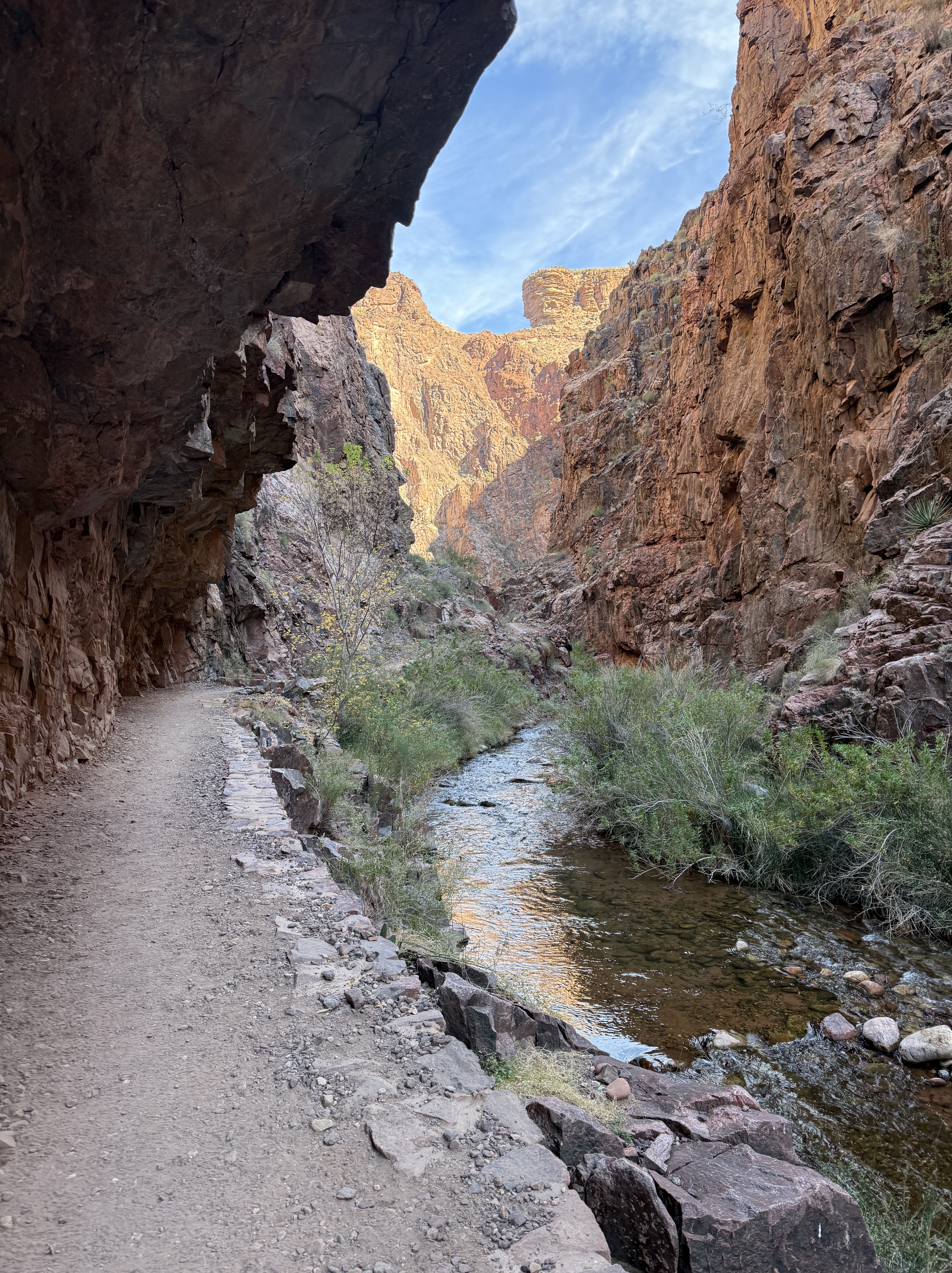 Eventually, the box canyon opened up into a wide Valley and I was in the sun again. The temperatures had been long sleeve sun shirt warm in the canyon, but now I was sure it was in the mid 60s. I stripped off a layer and changed into shorts. I looked back at where I had come from and realized that I was gaining quite a bit of elevation, now 30 or 40 feet above Bright Angel Creek at some points and maybe 1,000’ above the Colorado River. I passed a group of biologists who were doing fish studies and removing invasive species. I moved by silently, snapping a photo, but we would meet in a couple of days, further up the trail.