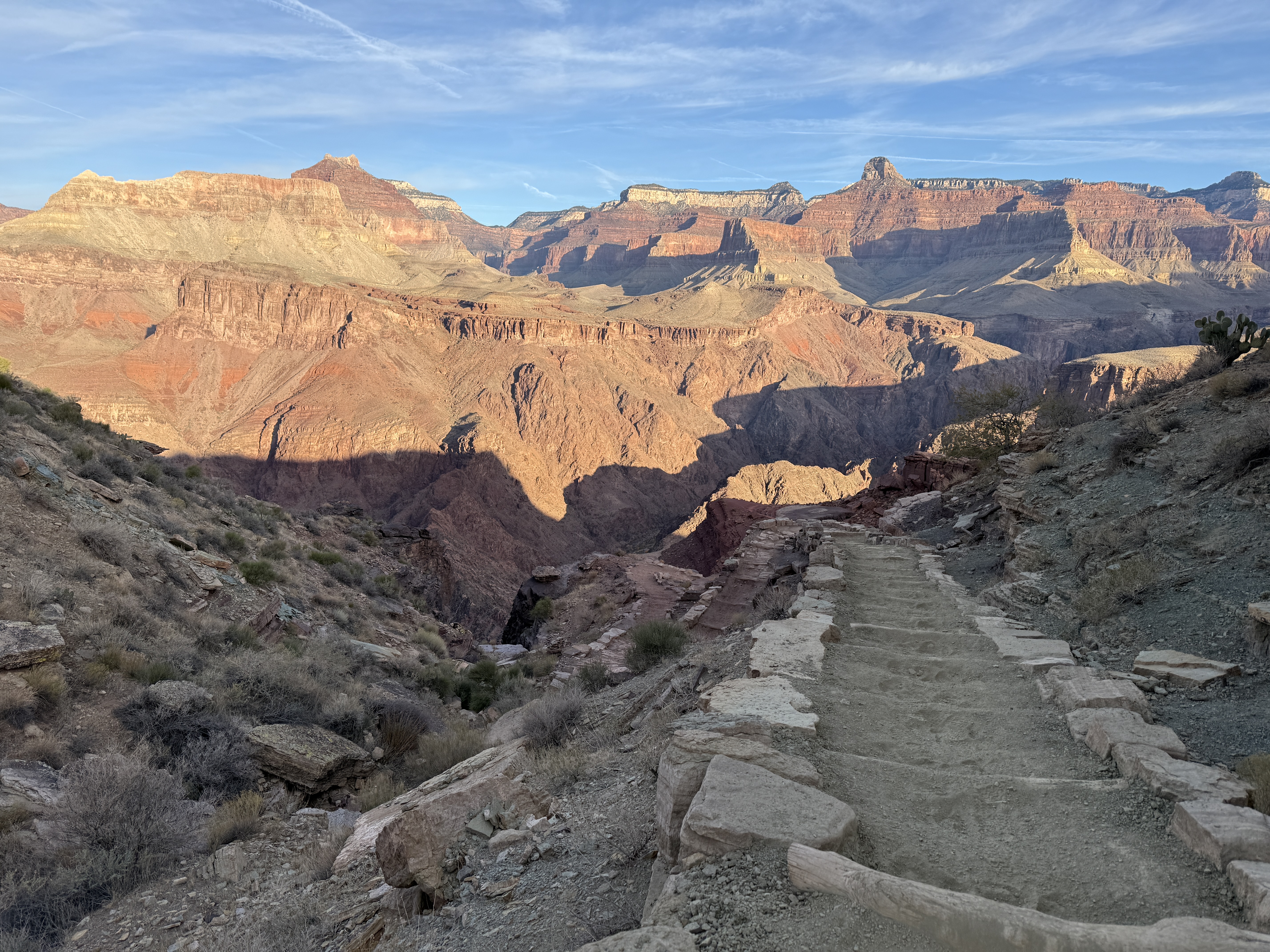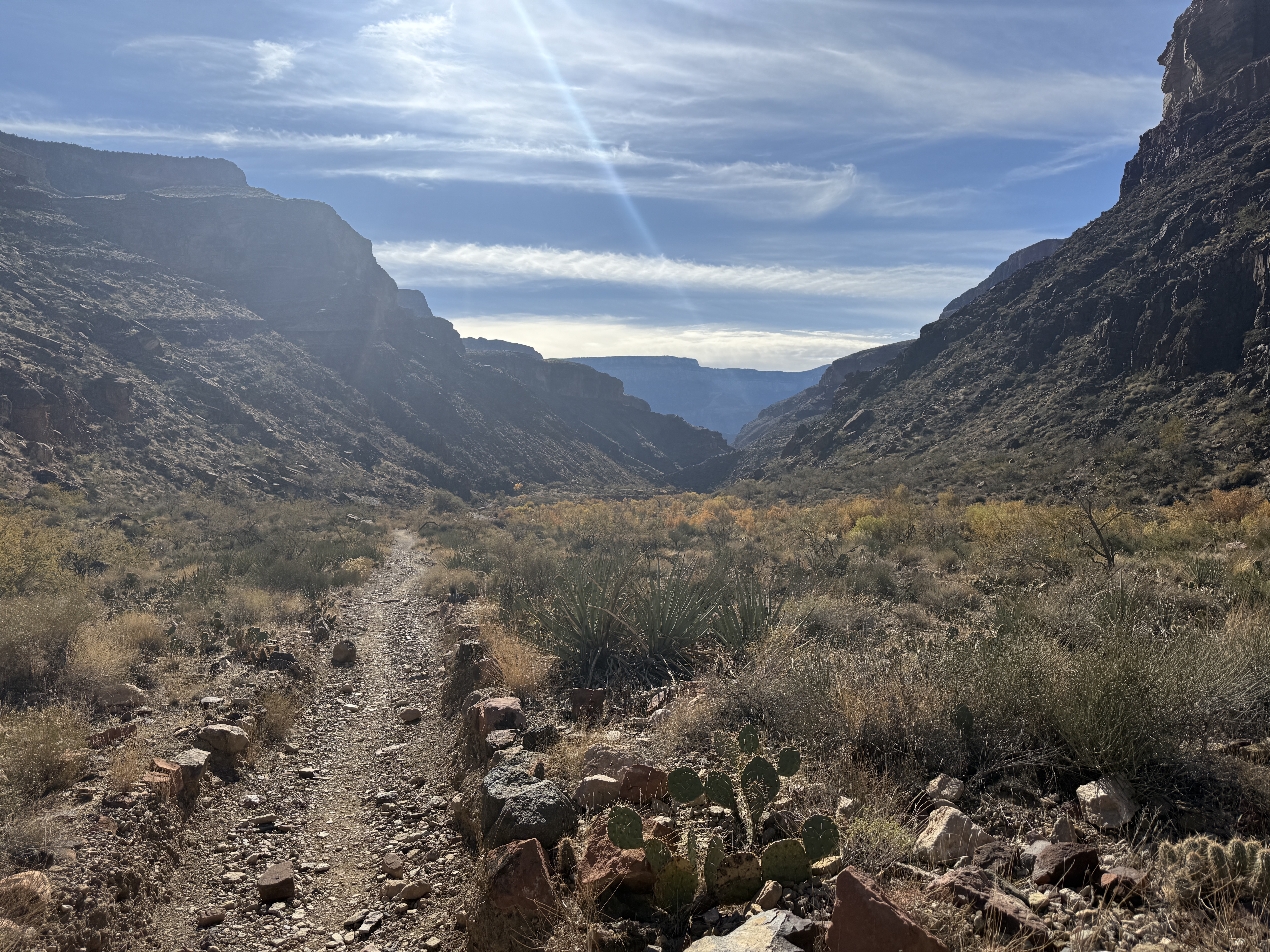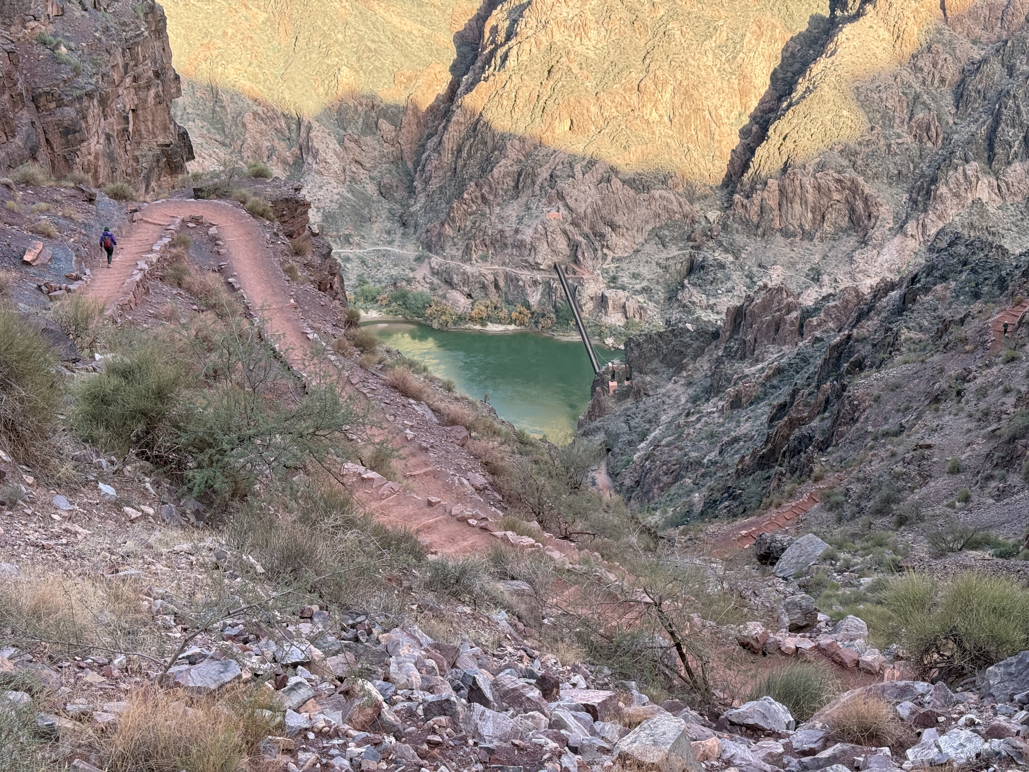 The trail from Tip Off down to the Colorado River is a well-engineered path, descending from 4000′ to 2400′ at the Colorado River. I probably took twice as long as I should have on my way down to the “Black Bridge,” stopping every few steps to get another picture or video. My mind was blown. The ochre-colored dirt was a beautiful contrast to the blue green tone of the Colorado River and the yellow of the Cottonwood trees at Phantom Ranch.