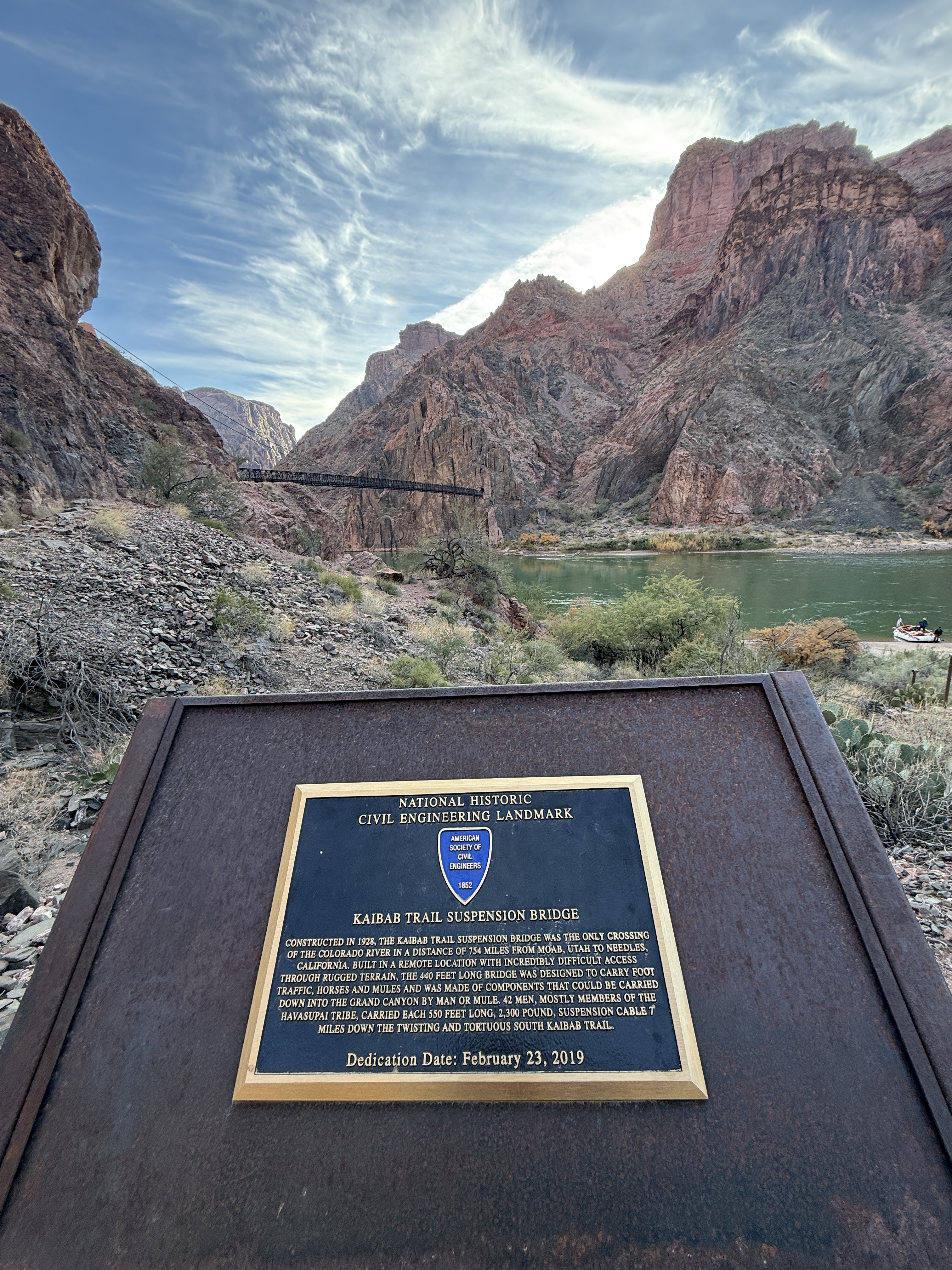 On the far side of the bridge, I looked back and marveled at the engineering wonder I had just crossed. As a civil engineer, I have great appreciation and respect for all who were involved in the construction of this bridge, listed as a National Historic Civil Engineering Landmark in 2019. I passed a plaque that spoke of the great feat and of the importance of the work. For many years, it had been the only bridge over the Colorado for 754 miles, from Moab, Utah to Needles, California.