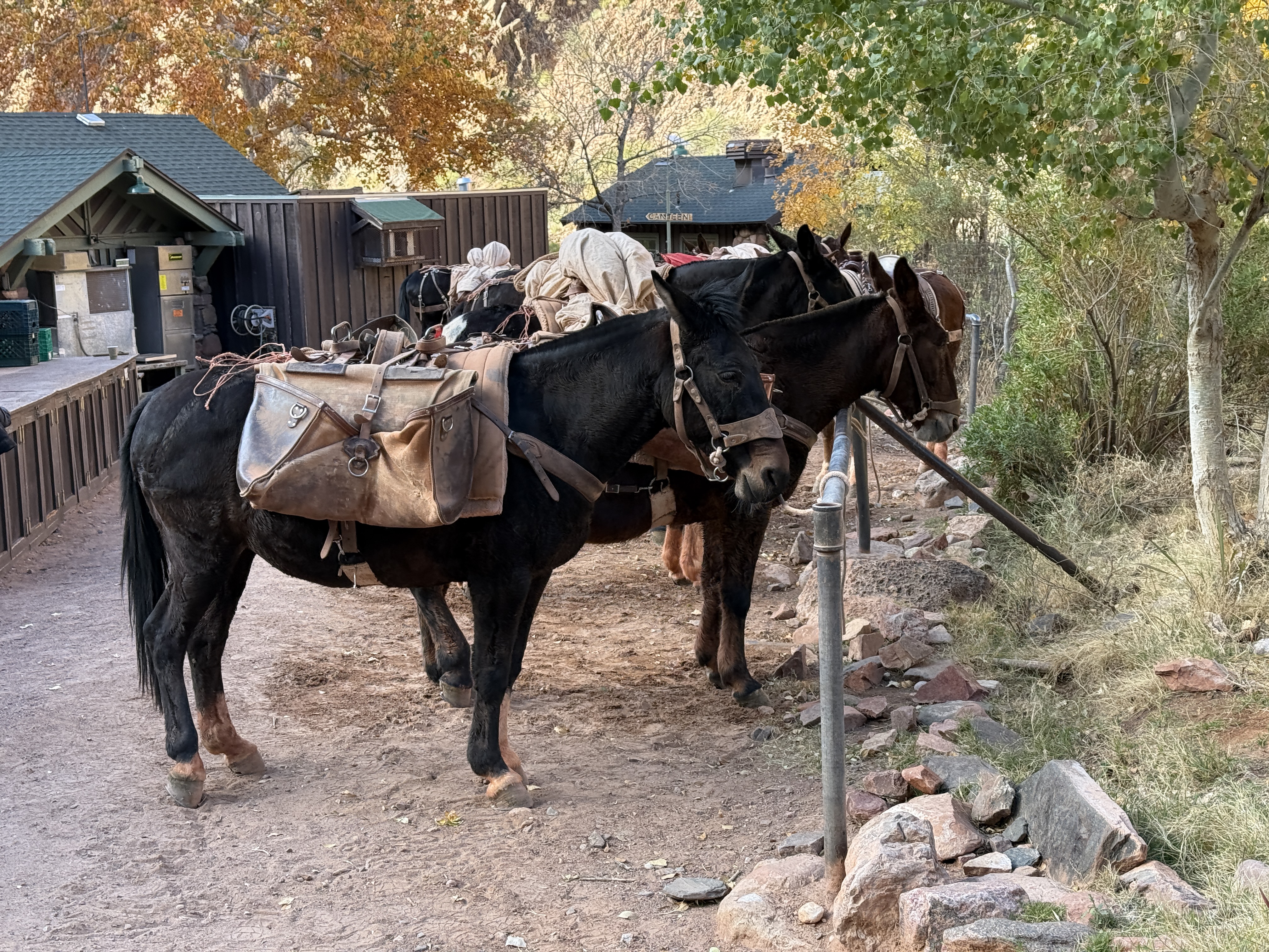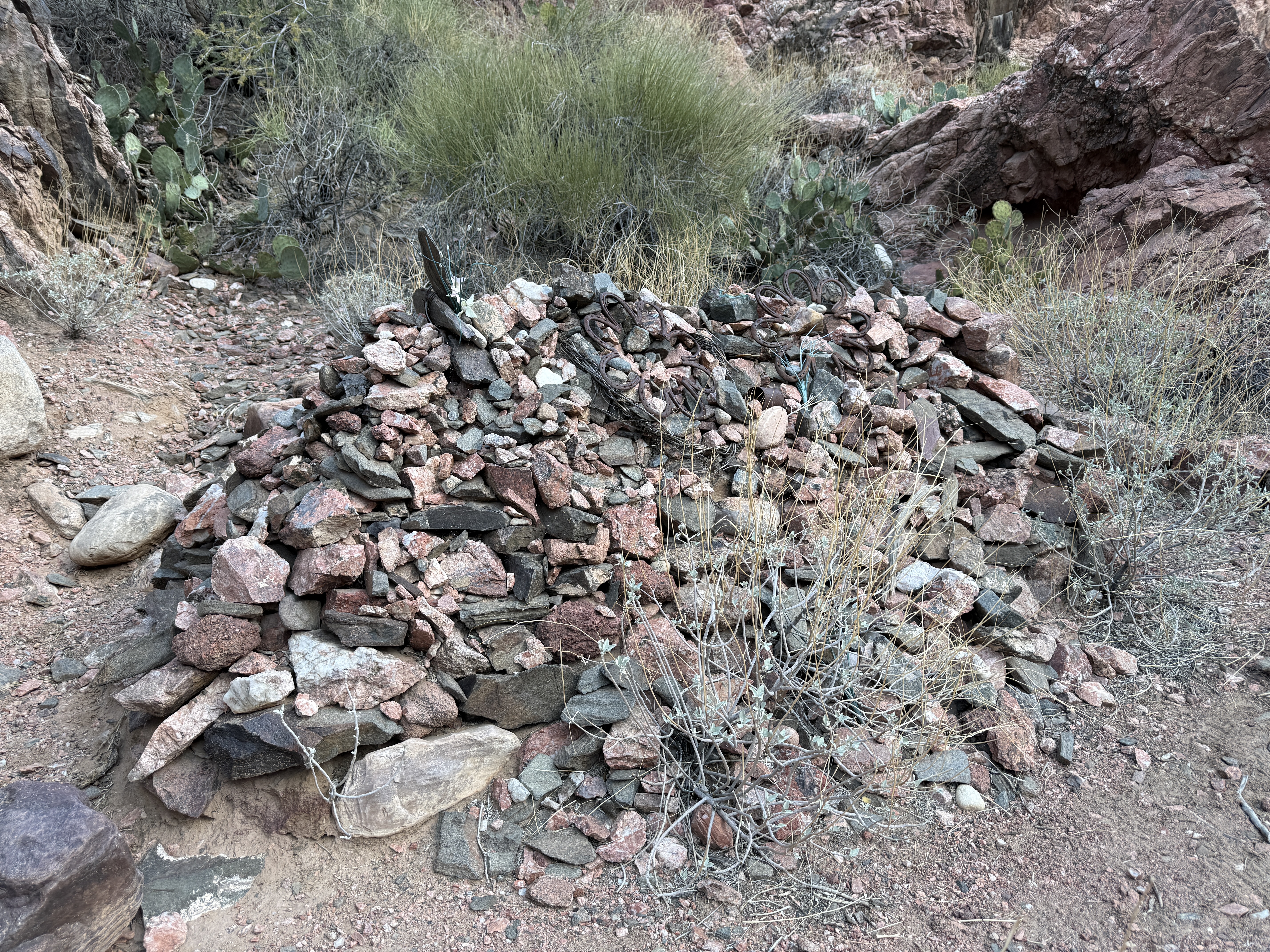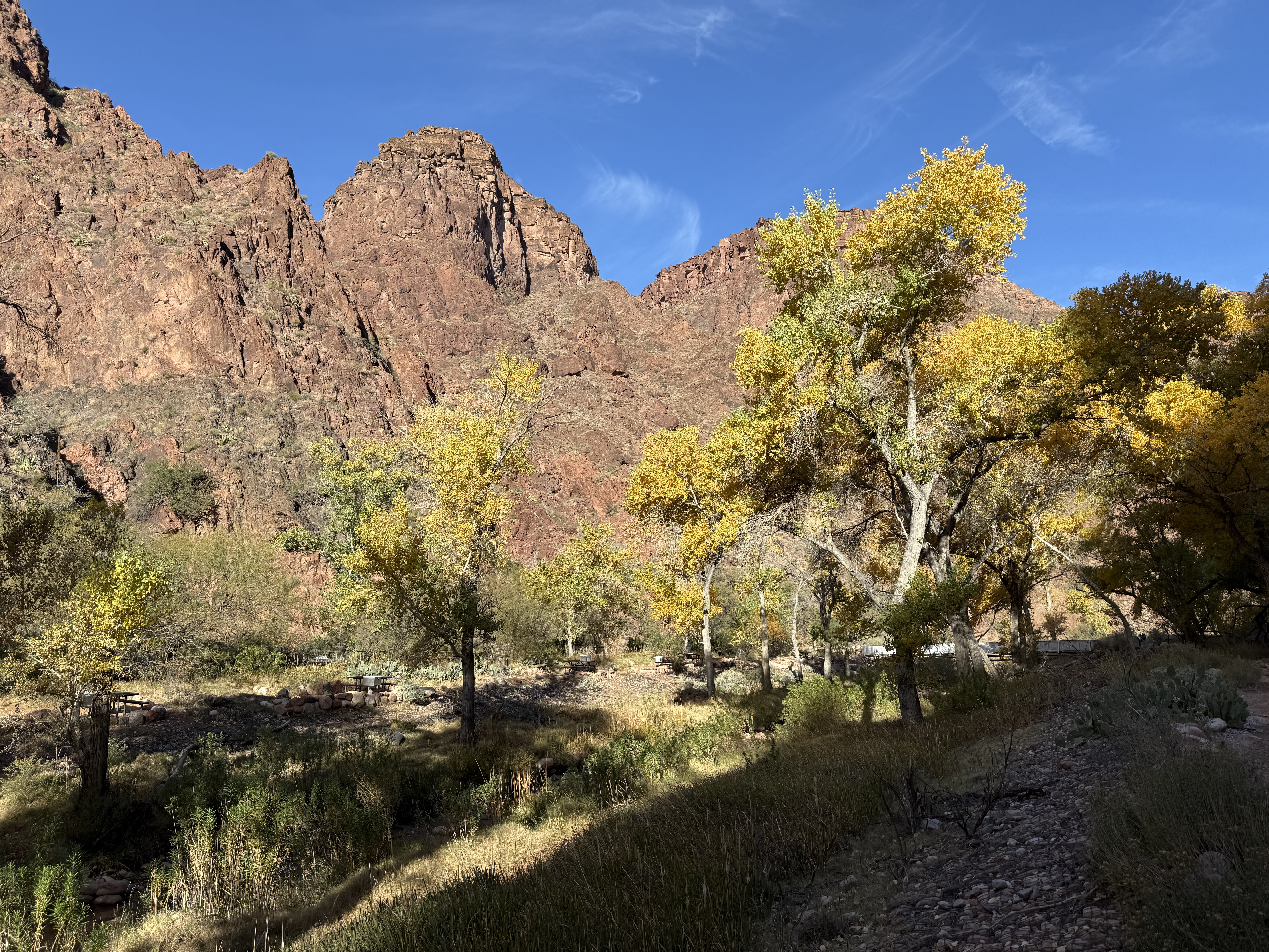 I pulled myself away from the history and sauntered on towards Phantom Ranch, now less than a mile away. Passing a pile of rocks adorned with horseshoe flowers, likely a monument to a well-loved mule, the scenery changed drastically, from brown desert to lush cottonwood forest. I could see Bright Angel Campground across the creek and knew I would have to come back one day and camp here.