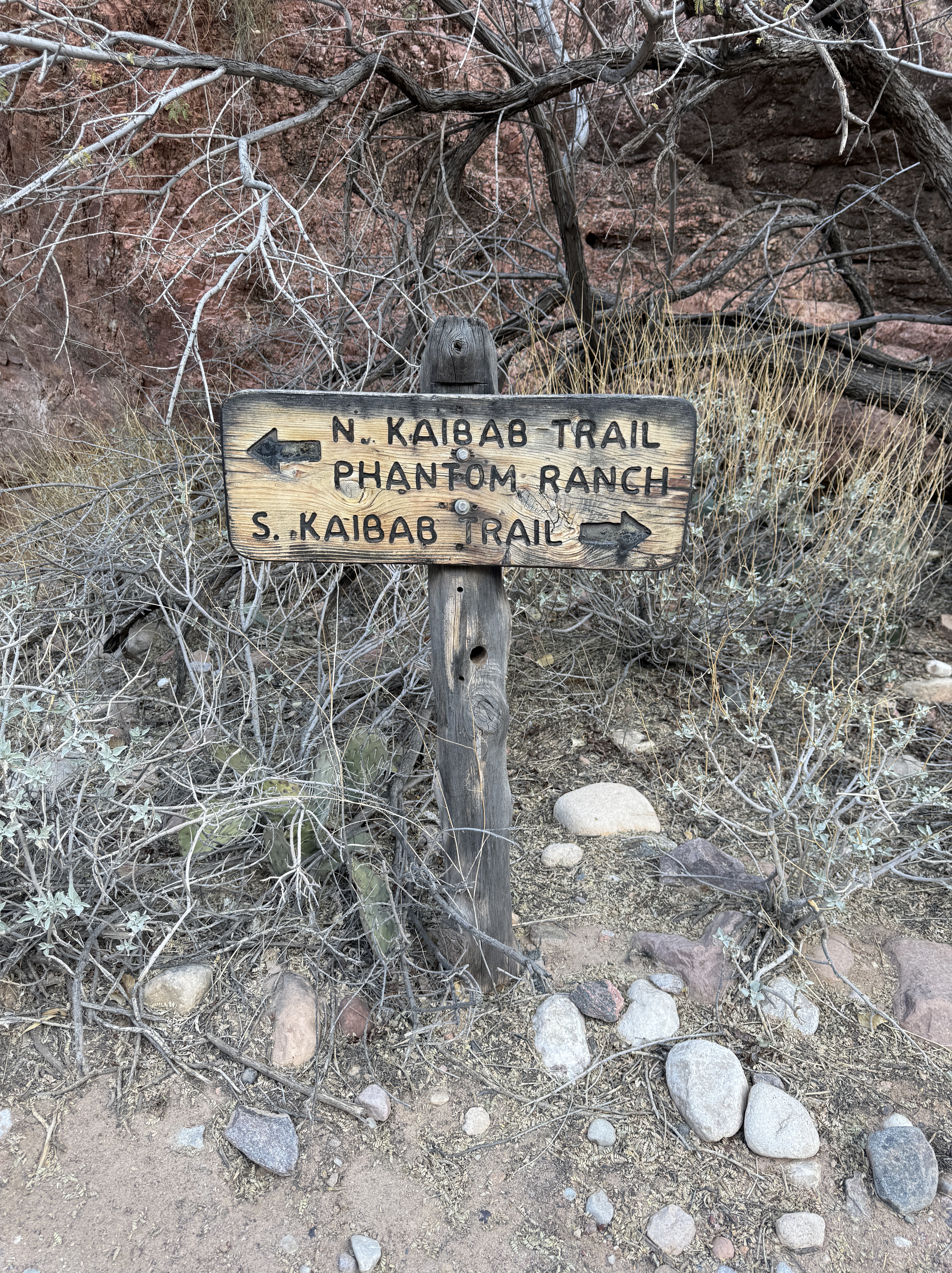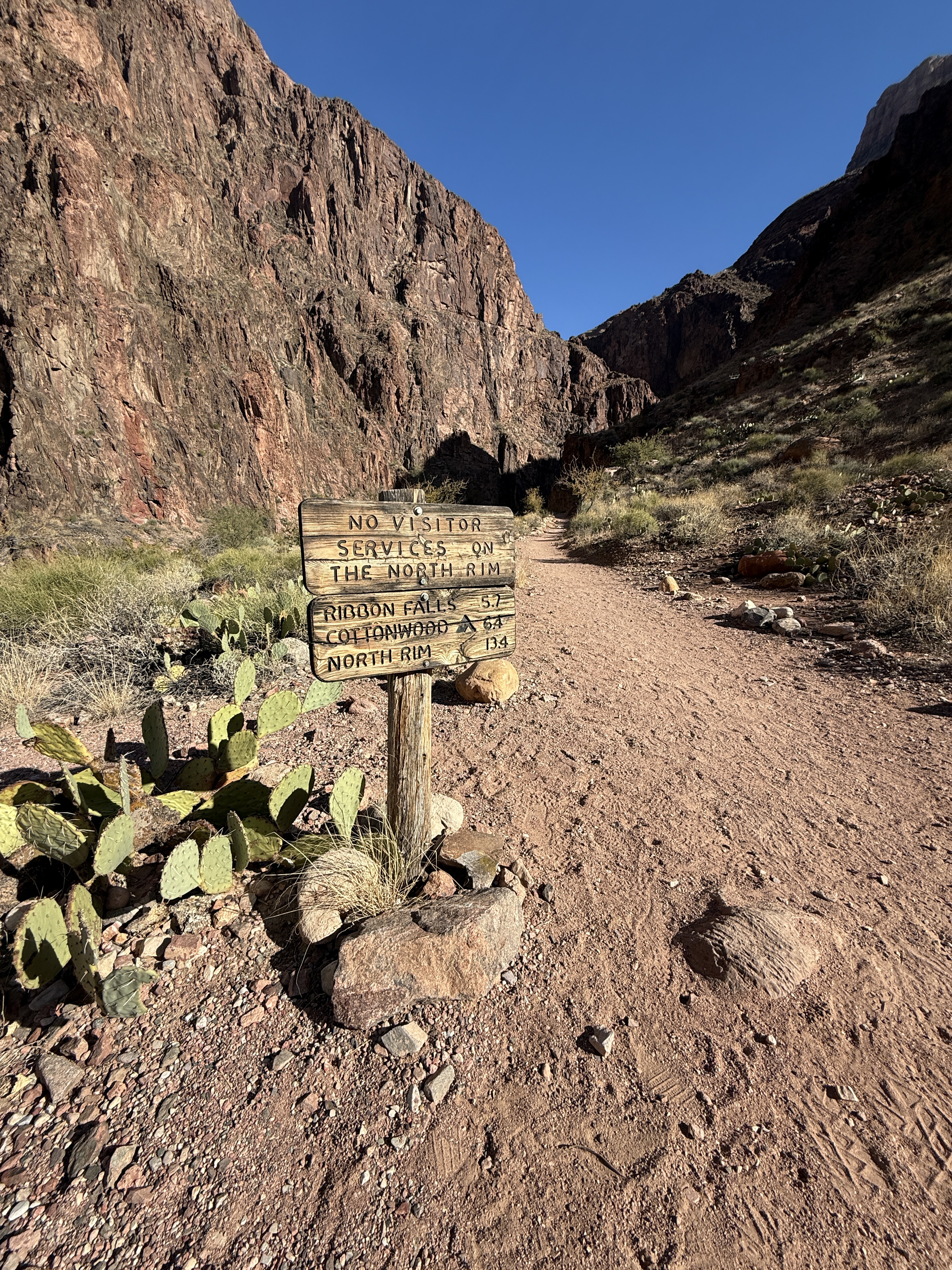 I found the canteen, but was sad to see it would be closed for the duration of my trip in the Canyon due to the waterline repair work and new breaks in the line. I was able to fill up my water bottle with fresh drinking water at a spigot outside the canteen and finished up my oatmeal that I had been too excited to eat before leaving camp that morning. A quick bathroom break at the facilities and a check of the weather forecast posted on a bulletin board, and I moved on. About a mile down the trail, a wooden sign warned me that there were no services on the north rim this time of the year and informed me that I had 6.4 miles to go to reach my home for the next three nights at Cottonwood Campground. I was now on the North Kaibab Trail.