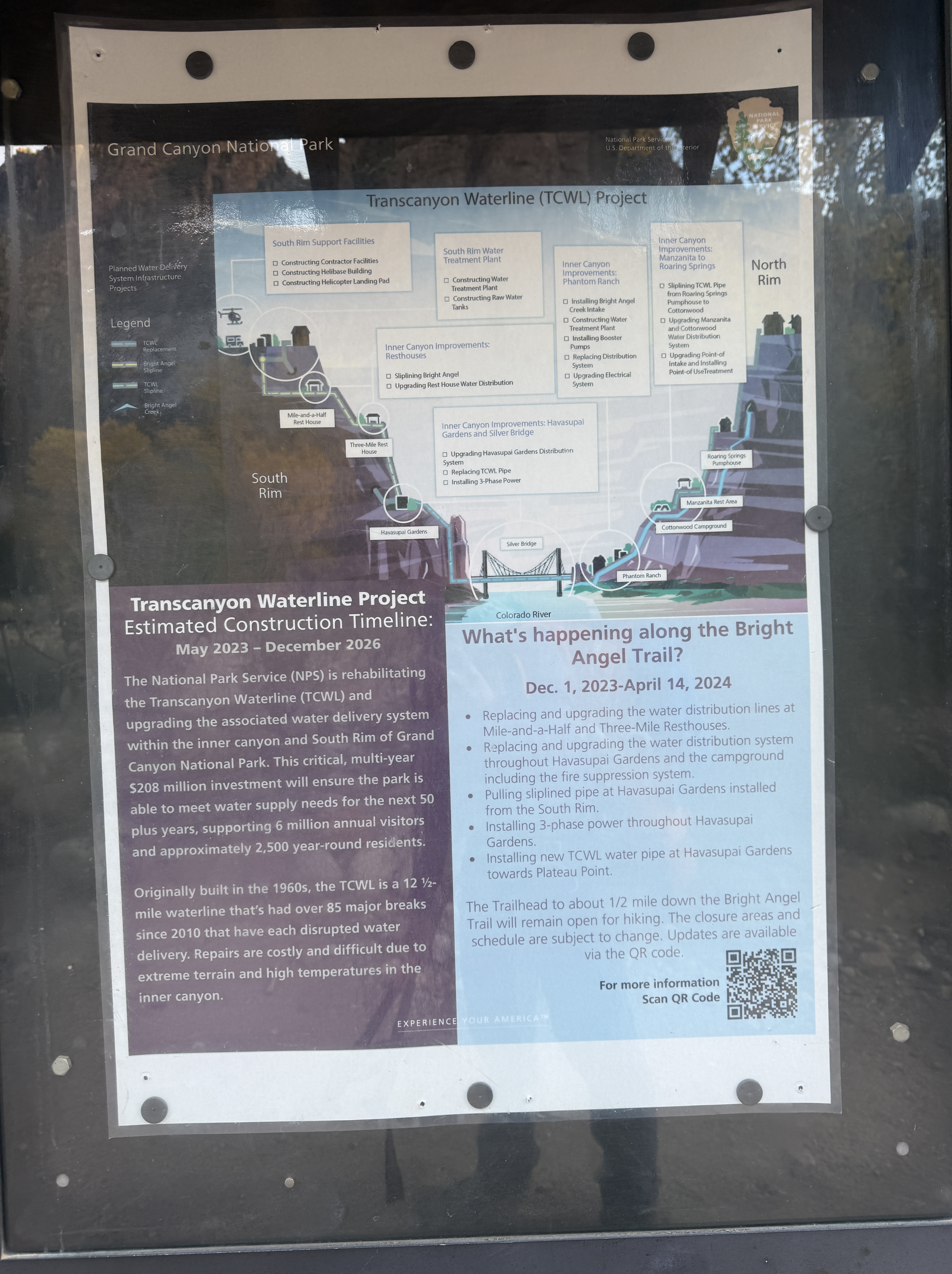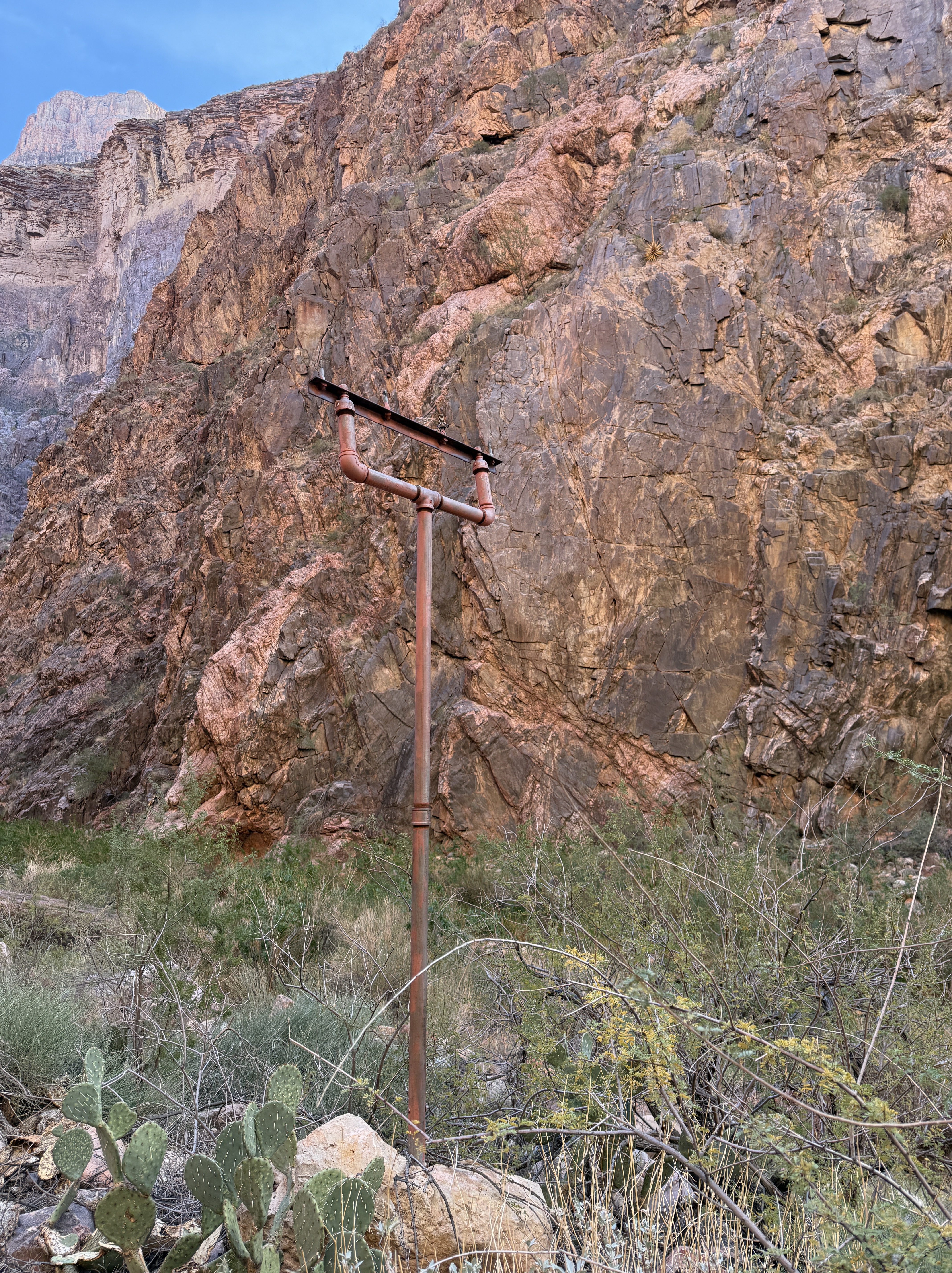 Walking along the Vishnu Basement Rocks in The Box for about 4 miles, I was entranced by the geology I was observing. Millions and even billions of years of layers built up here before being sliced open by streams and rivers. I resolved to carry a geology guide for the area on my next trip, but for now I would just take it all in… and take a ton of pictures. I passed a few workers who had excavated around the Trans Canyon Waterline that runs under the trail, fixing one of the many breaches in the 50-year-old infrastructure. A $208 million dollar project is currently underway to upgrade the ancient system.