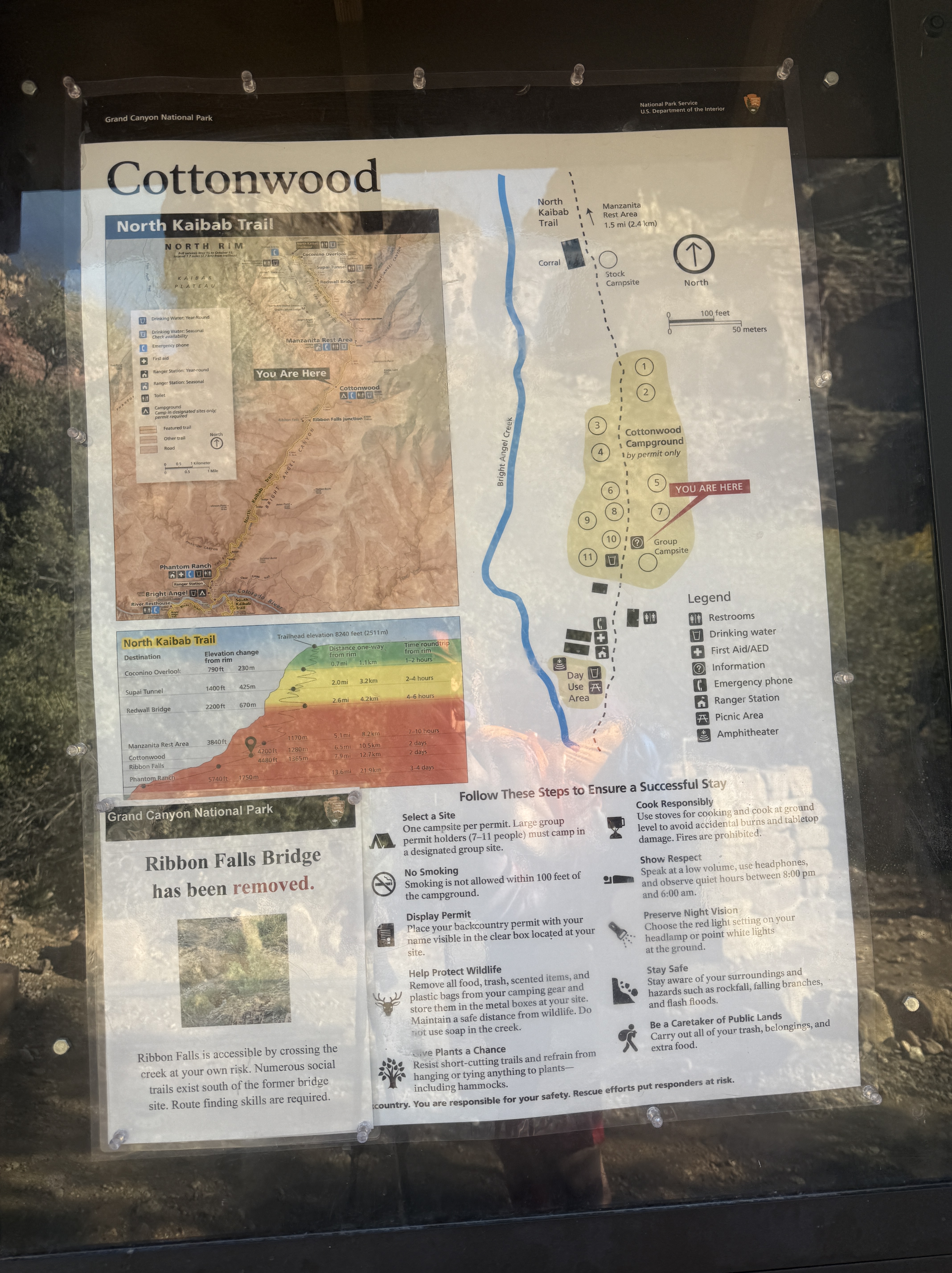 5. Give yourself more than one night at Cottonwood Campground to allow for a side trip to Chimik’yana’kya Deya’ (Ribbon Falls) or a day hike to the North Rim, plus a rest day. I found 3 nights at Cottonwood to be perfect.