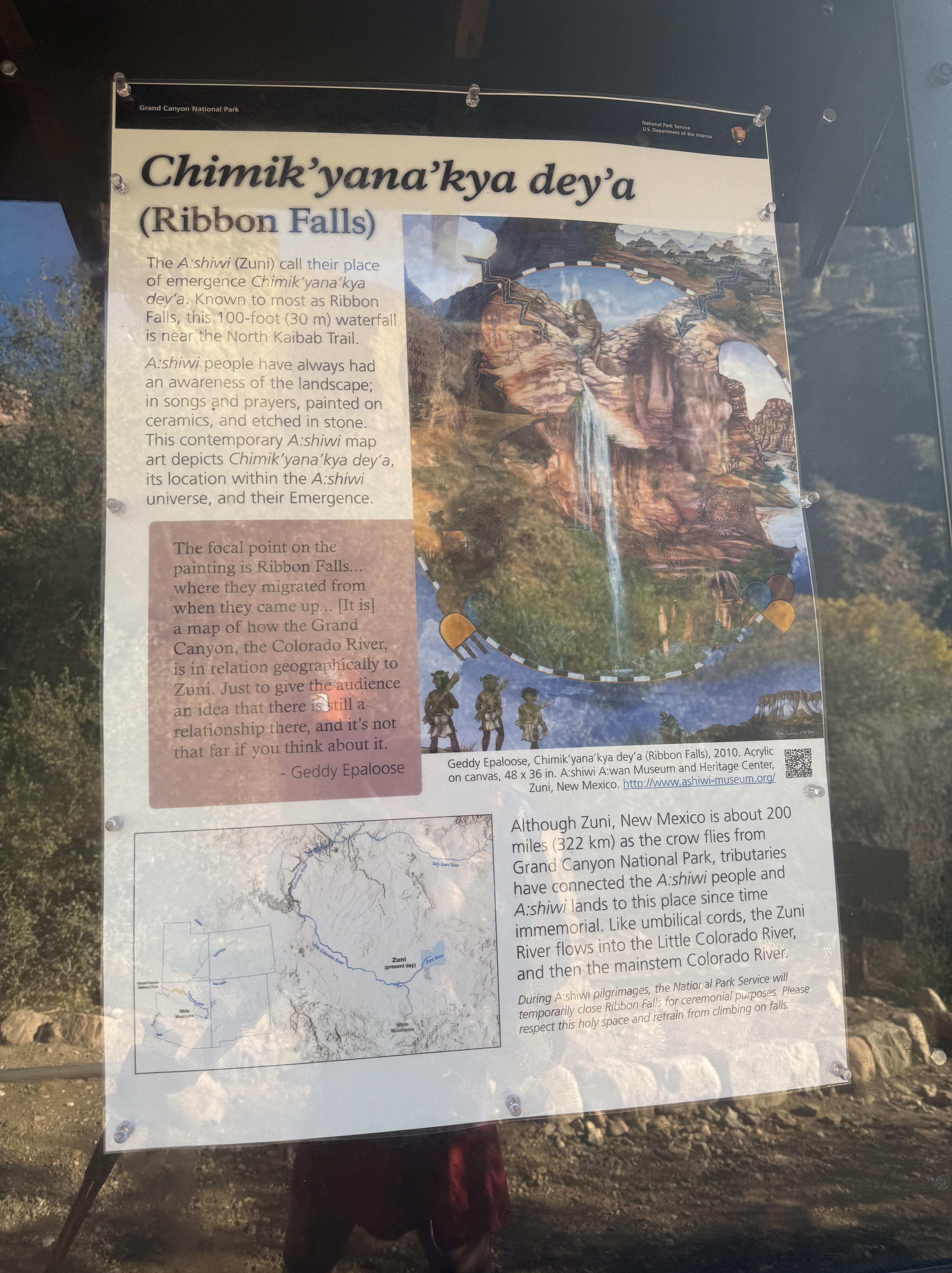 I decided to skip Chimik’yana’kya Dey’a (Ribbon Falls) for today, since I would be at Cottonwood for 3 nights, with one chill out day. I could make the mile or so walk back down to visit these sacred falls another time. The bridge to access this area had been removed, so it would be important for me to pick a good spot to cross the creek. I was getting tired after more than 11 miles for the day and didn’t have the bandwidth to experience such a special place. The Zuni consider Chimik’yana’kya Dey’a (Ribbon Falls) to be where they were created. I wanted to give it full attention and respect.