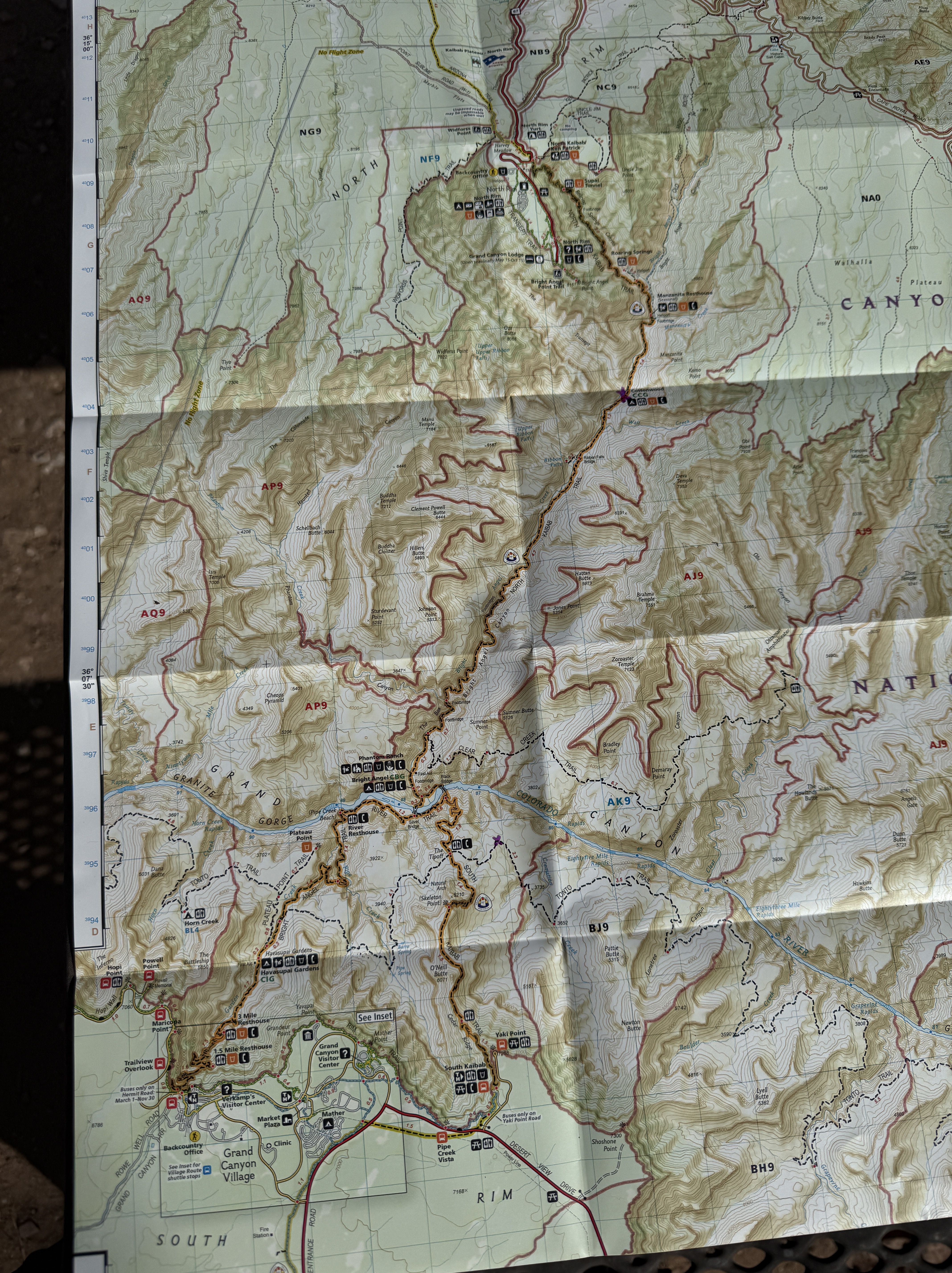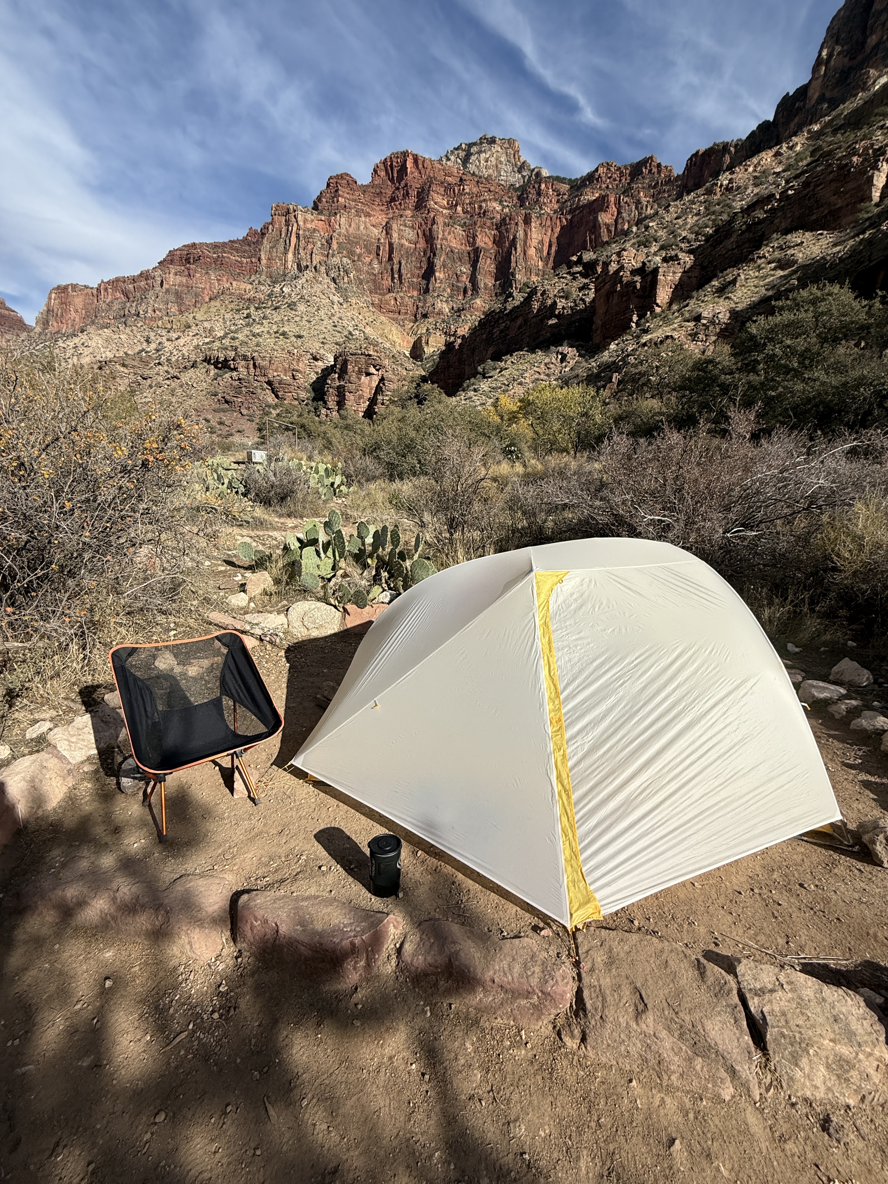 It became apparent immediately after I woke up that I would be taking a rest day and saving my day hike to the North Rim for tomorrow. I unzipped my tent and tried to stand. The overpacking had finally caught up to me. My legs were locked up, despite taking magnesium, electrolytes and staying hydrated. I crawled over to the picnic table and collected my supplies for morning coffee and breakfast. I would need to eat all day to get my load to something within reason for the last half of my trip.