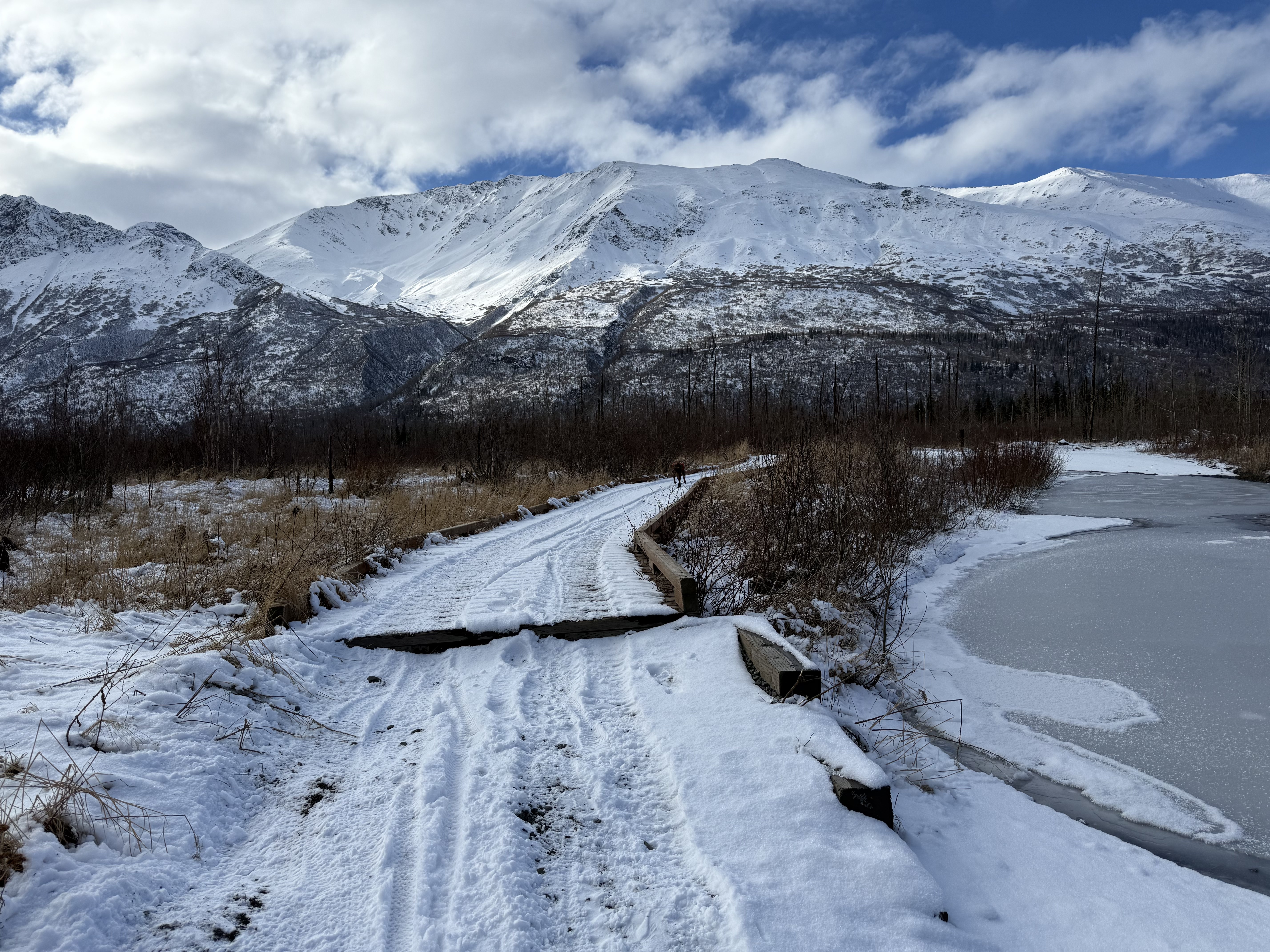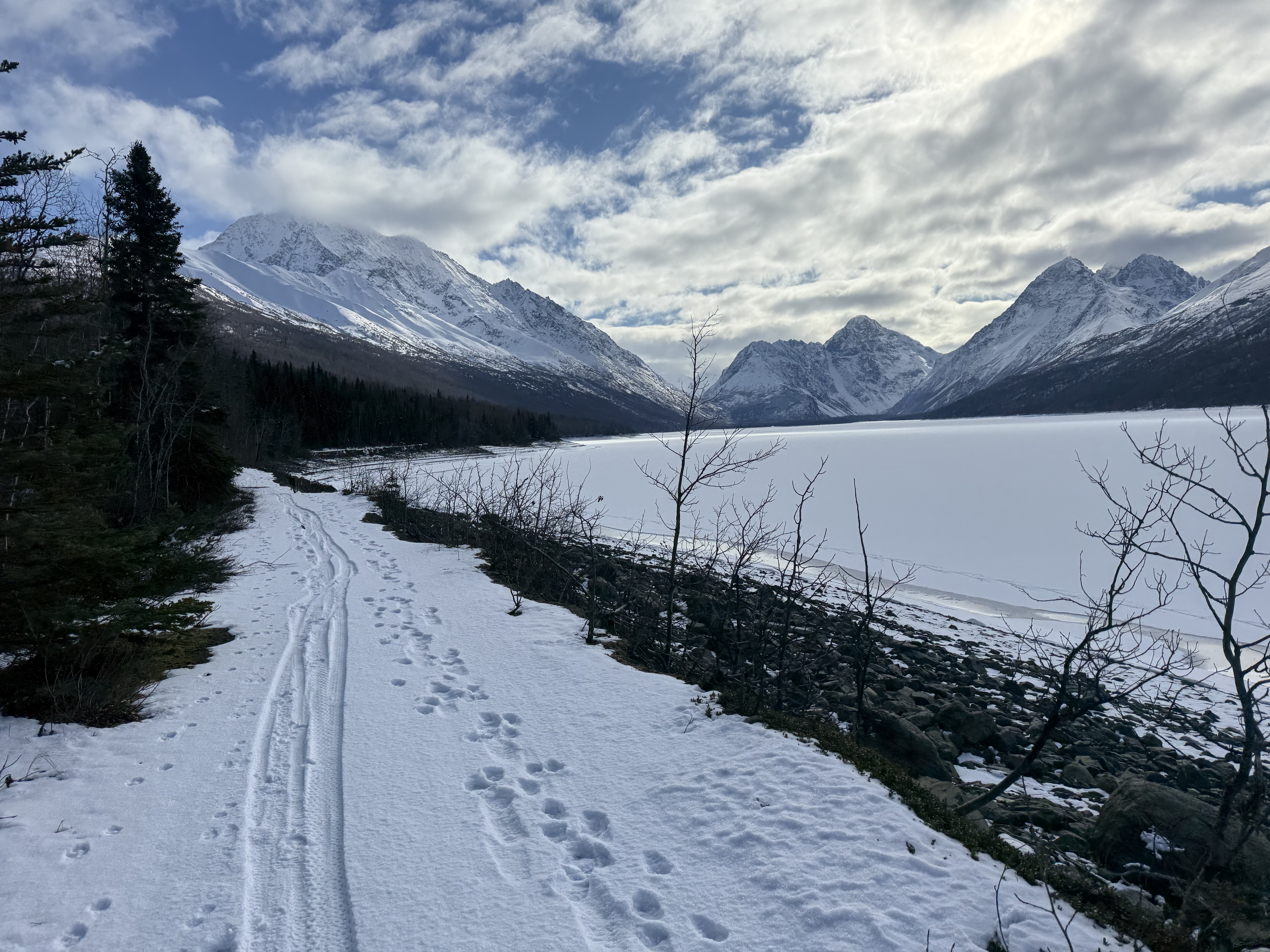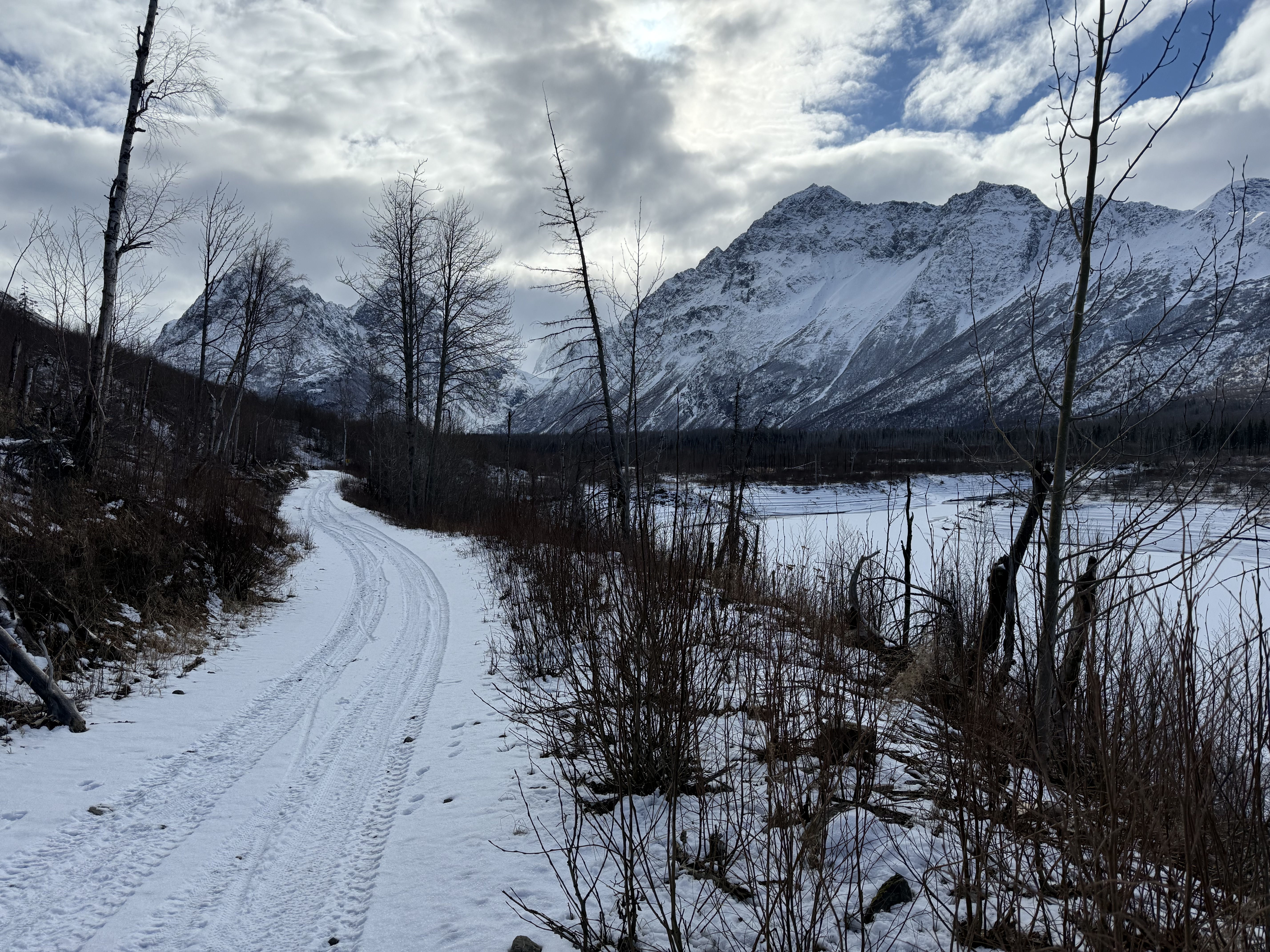 The Eklutna Lakeside Trail is shared motorized/non-motorized. Although there is a foot/bike only path closer to the lakeshore, the trail merges and shares the motorized trail intermittently. Once past mile 7.5, all traffic follows the same trail. Snowmachines are permitted once there is deemed to be adequate snow coverage (like this winter, sometimes there is not enough, and it doesn’t open at all for sleds). Four wheelers are only permitted Sunday-Wednesday, April 1 – November 30. A sign at the beginning of Eklutna Lake Road is updated with the status of the motorized trails.