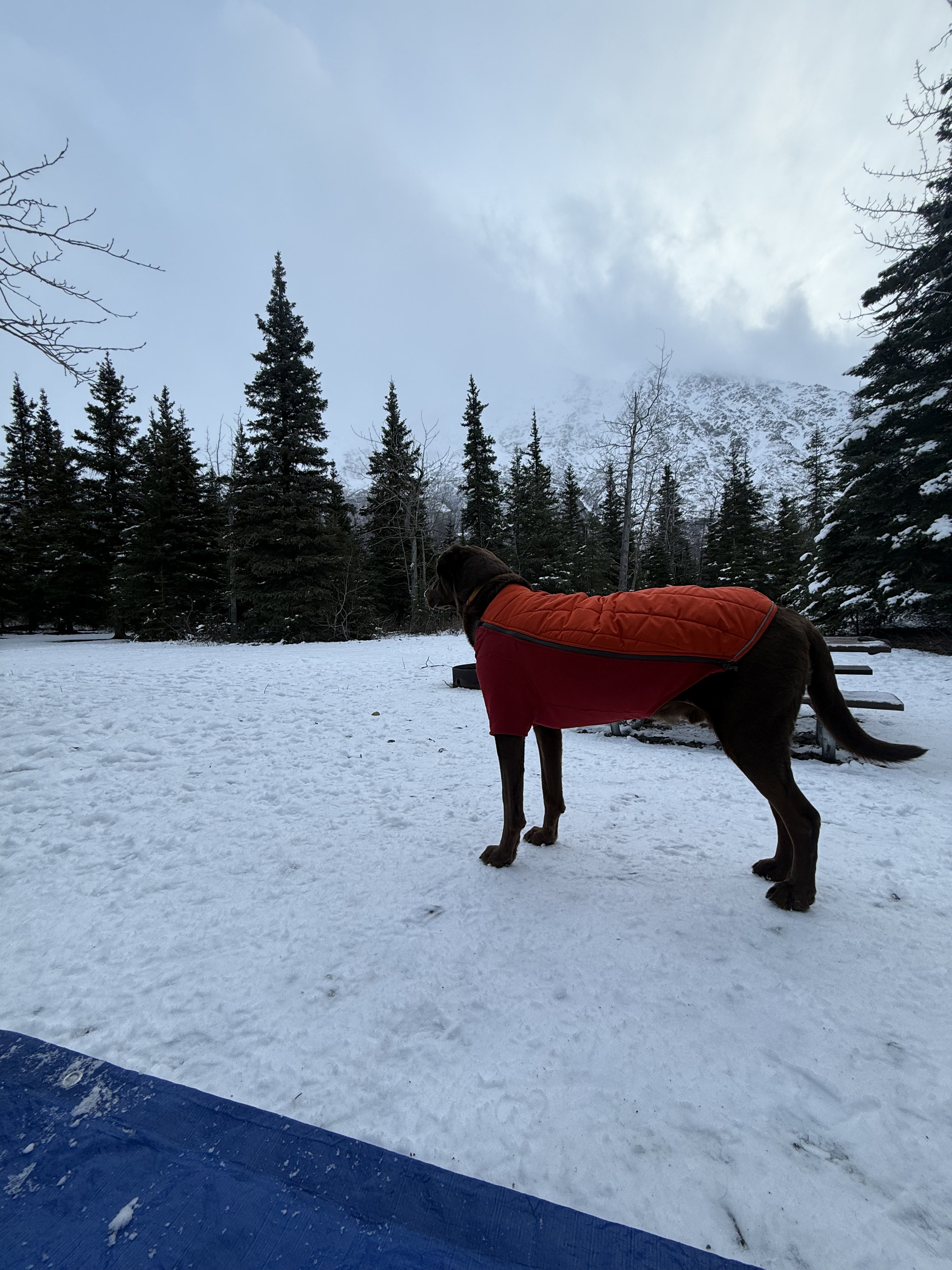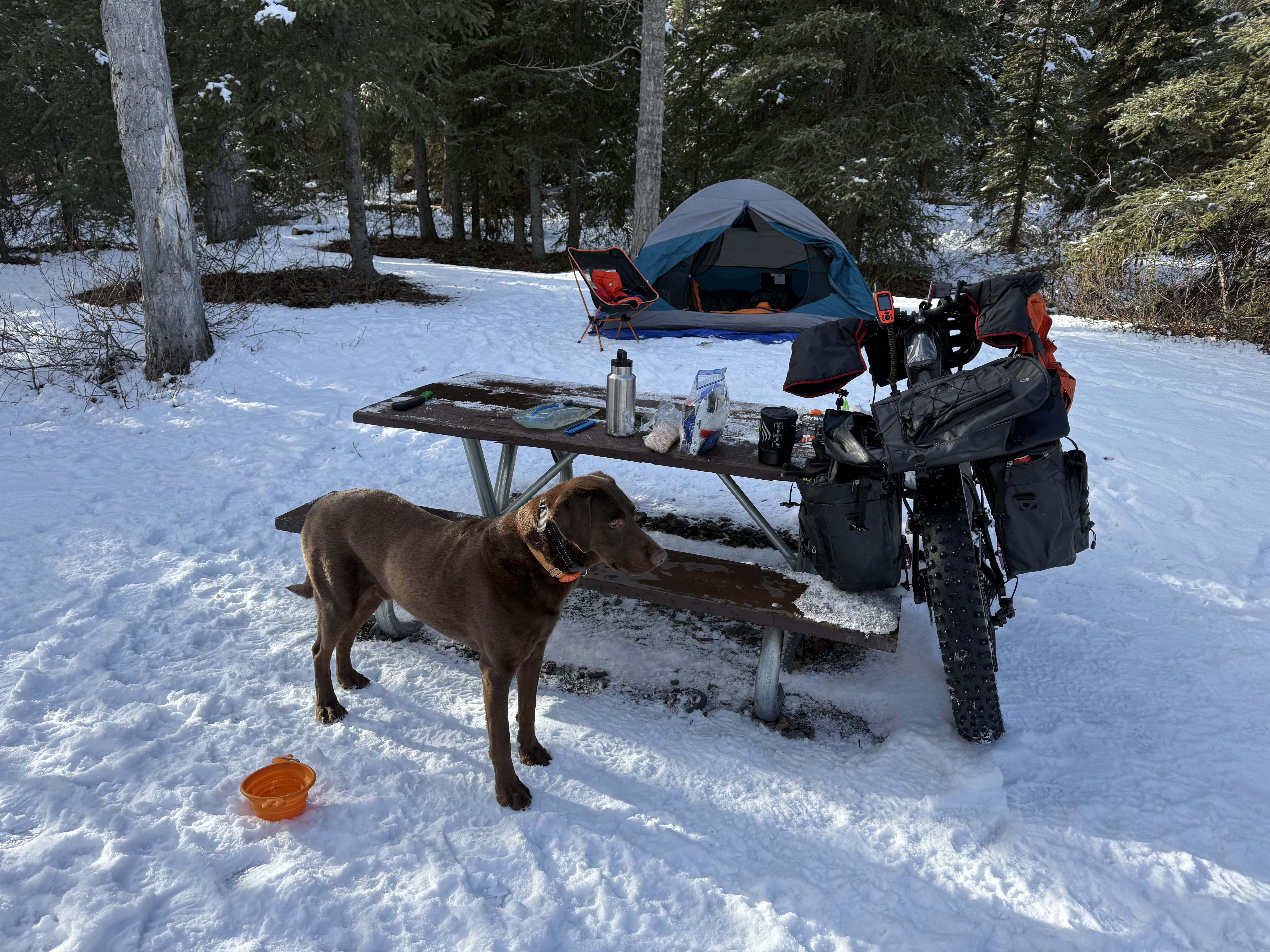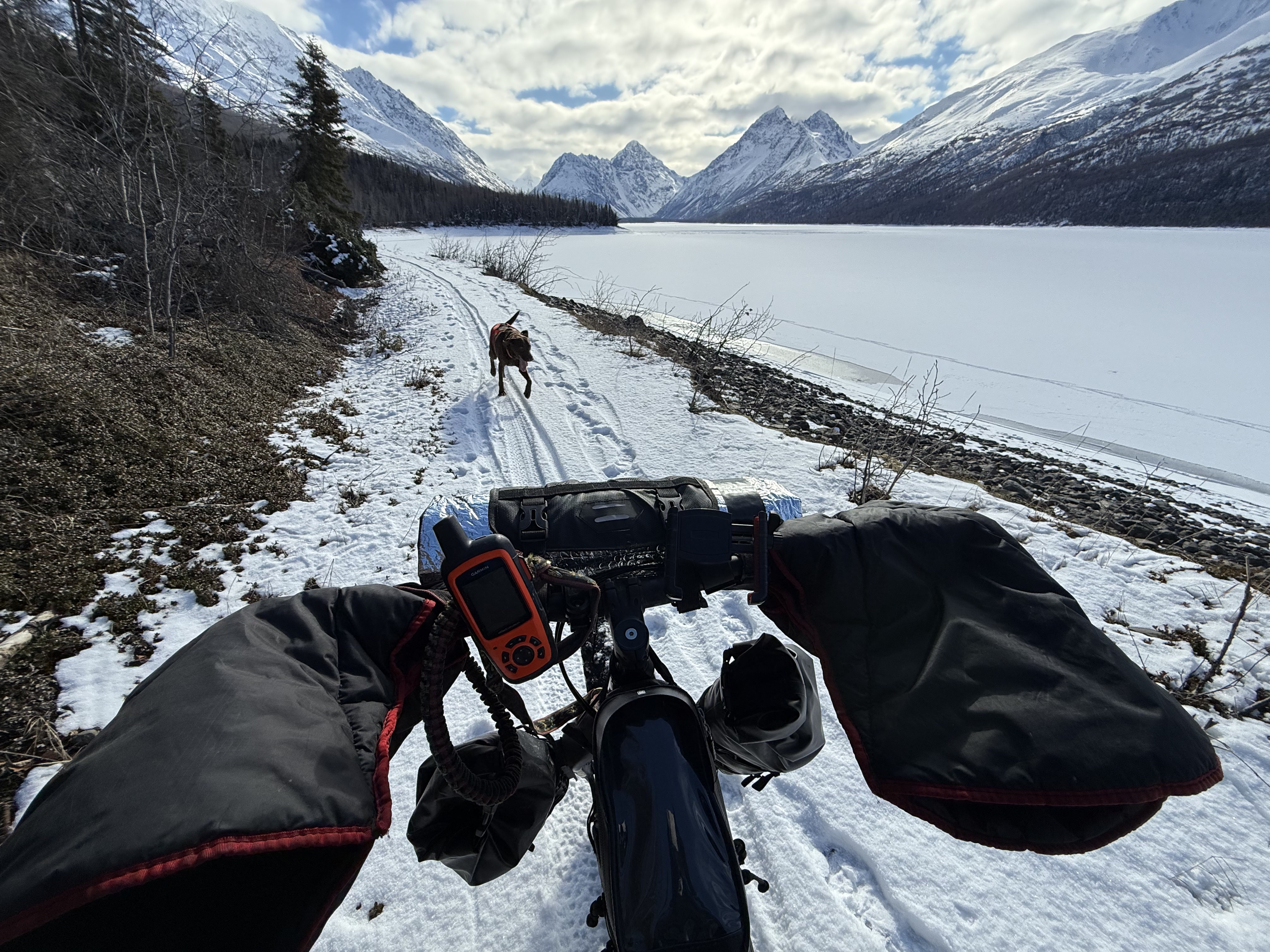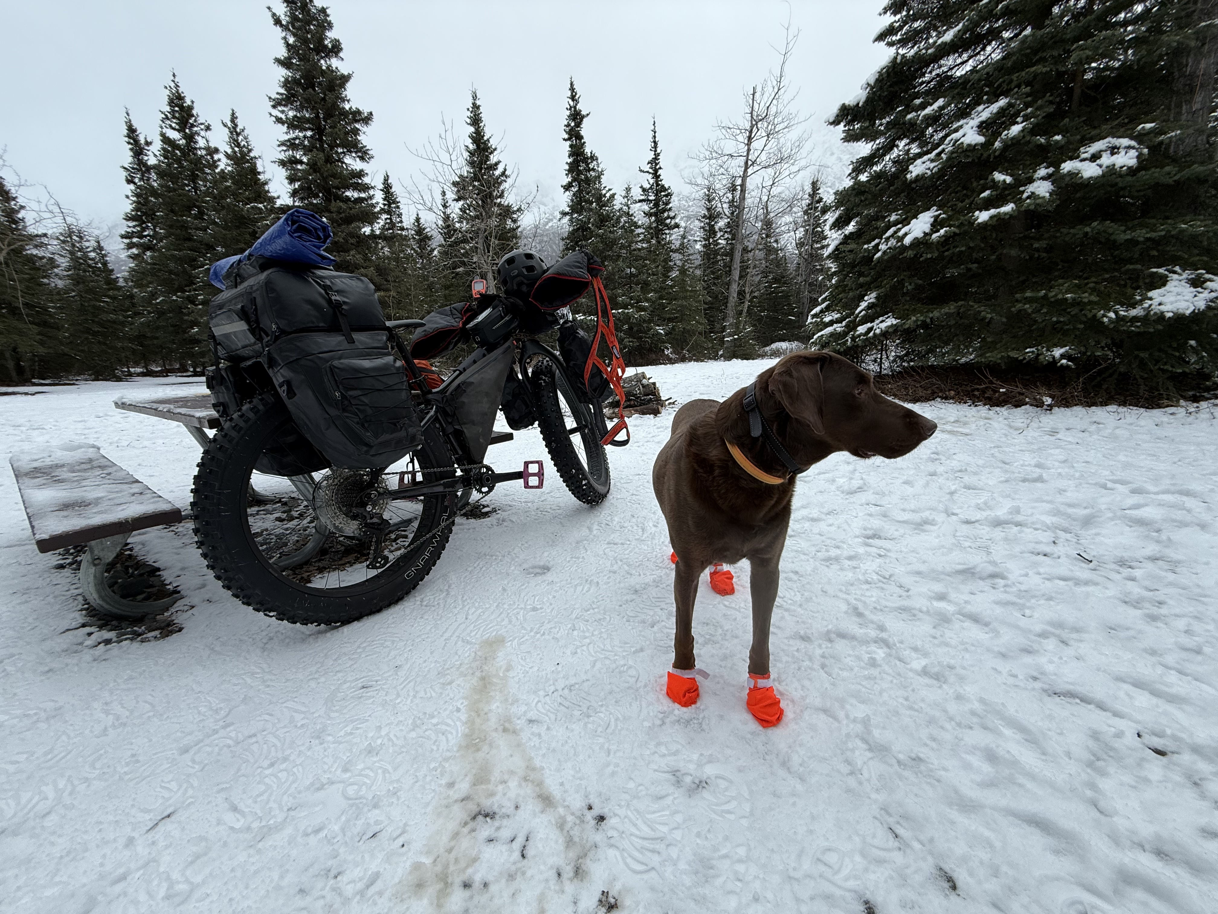 It was a sight to behold. Goose was hooked by bunjee line to the front of my fat tire bike, pulling me down the trail at speeds I was sure were nearing 20mph. I tried to balance my loaded down bike while simultaneously one-handed filming. Bikepacking-joring. I unhooked Goose at the mile 1 marker post, and, although he seemed strong and eager, I didn’t want to tire him out early in a long run. Plus, I was getting cold moving so fast!