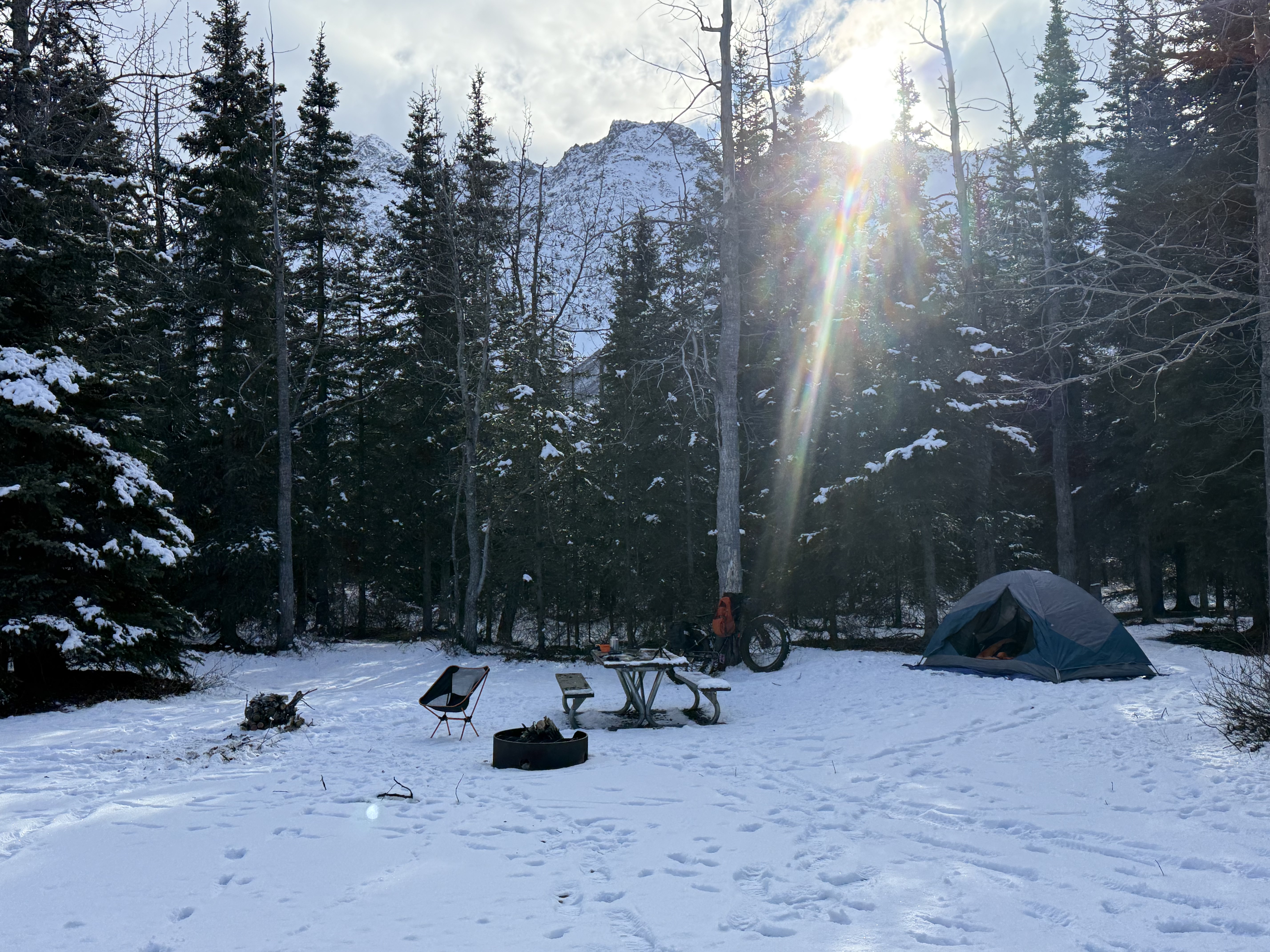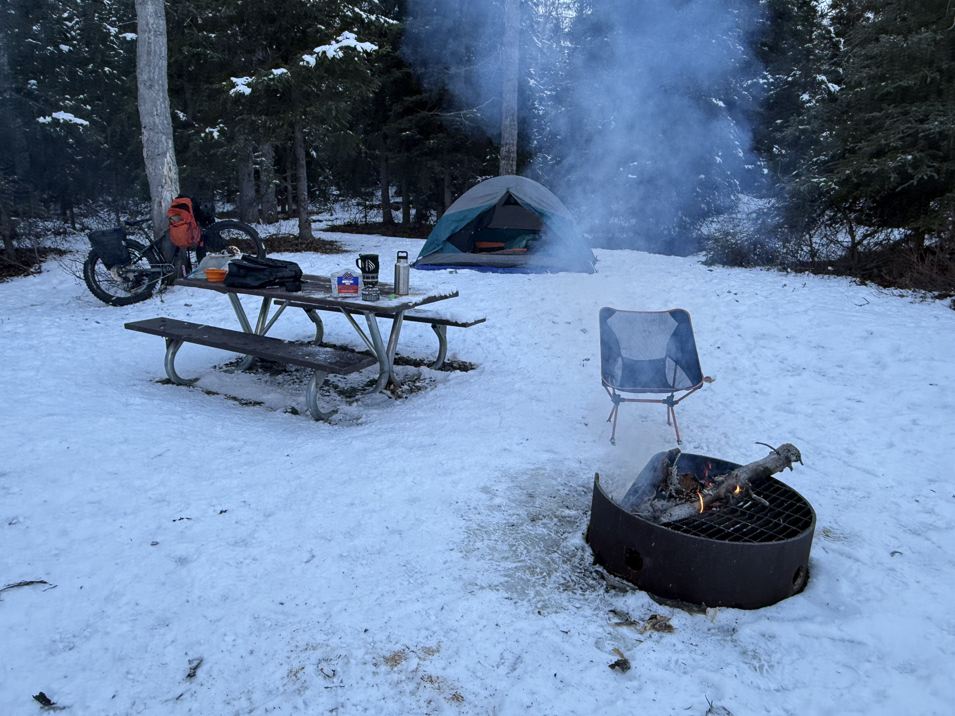 I turned on the noise cancelling in my ear buds to drown out the sounds of people and began clearing the picnic table of snow and ice. Unloading all of my gear, I laid it out and began to organize everything. My tent was set up quickly, I had brought my old Kelty, a sturdy shelter that I had used for years before purchasing my Big Agnes ultralight. The Kelty isn’t a winter tent, but robust enough to hold up to the mild conditions I would face.