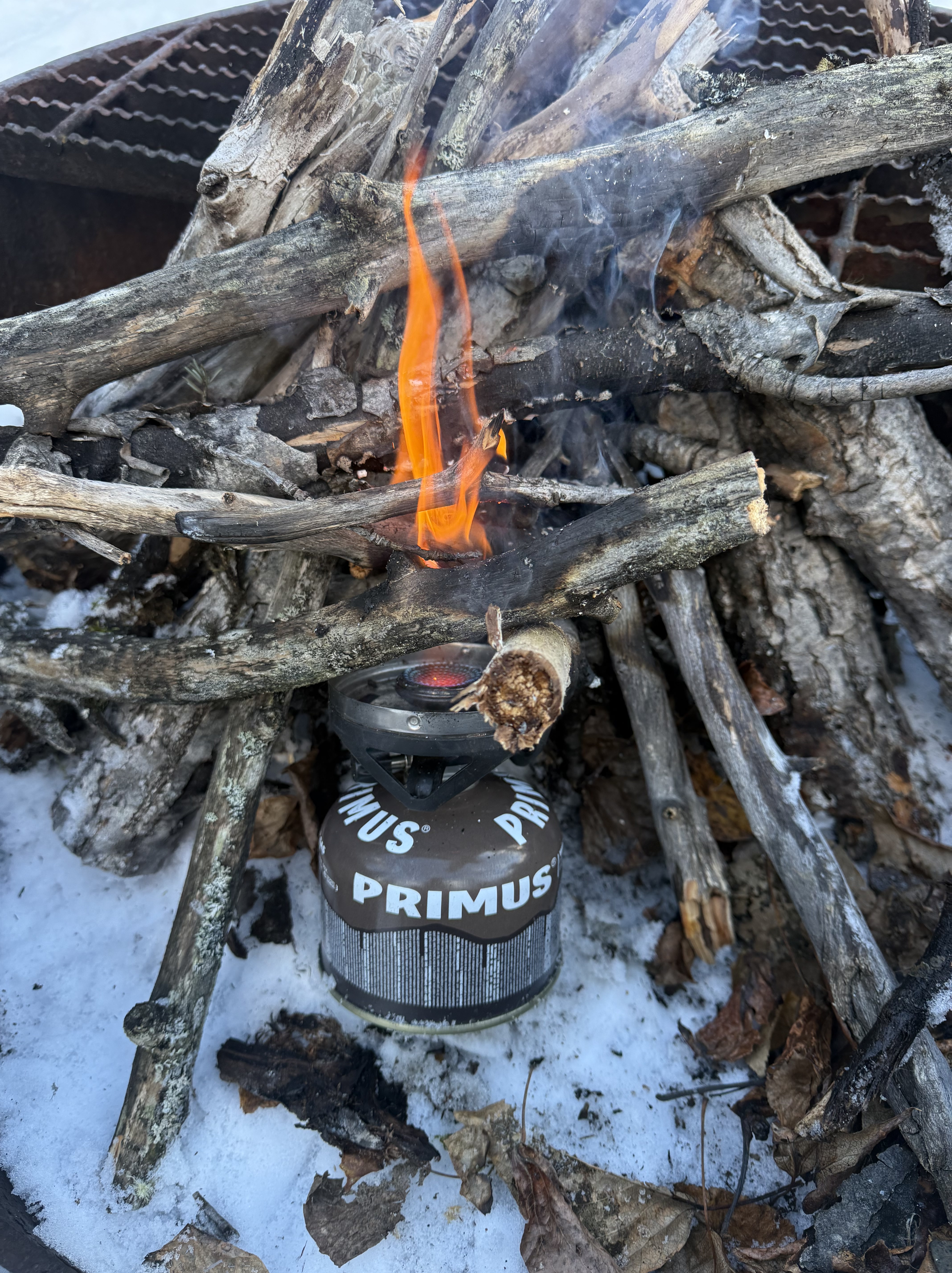 Lighting up my Jetboil Stove, I held it under the kindling until a small fire ignited and started to take off. I gingerly fed it larger and larger dry sticks, and soon I had the perfect campfire going. *I’m sure that Jetboil wouldn’t approve of my actions, so I won’t recommend it. Heating up the canister can result in an explosion, leading to severe injury or death. *