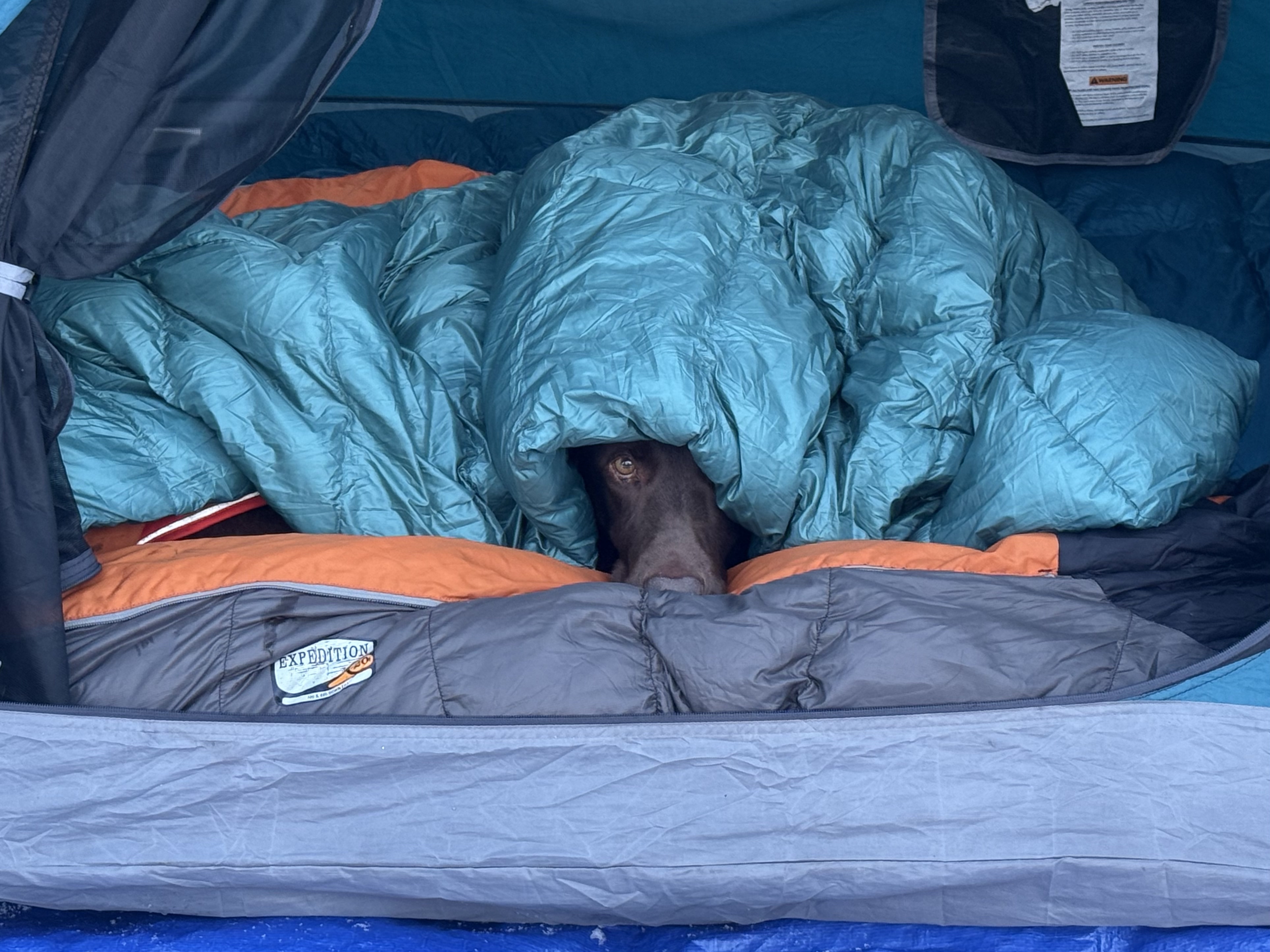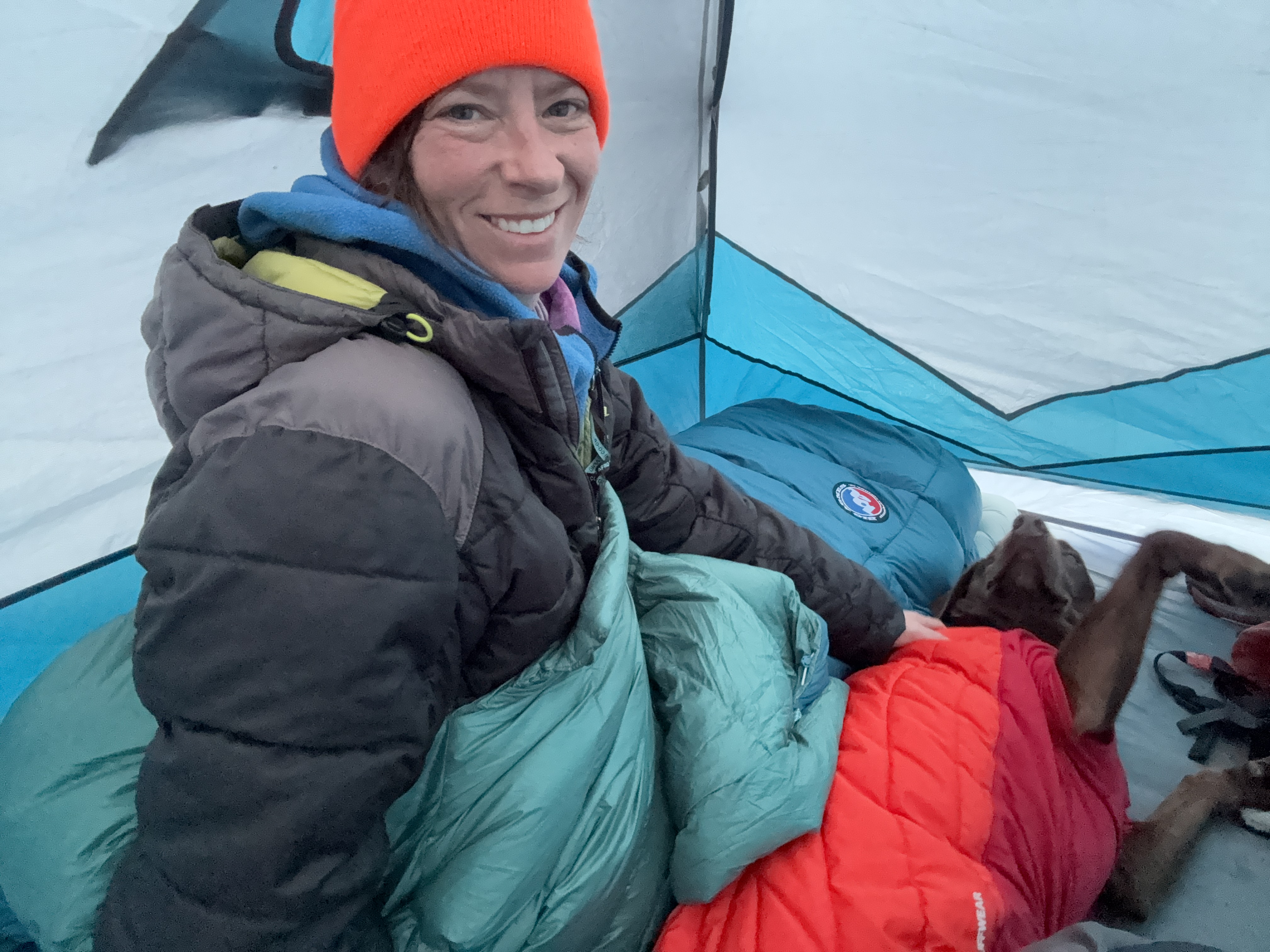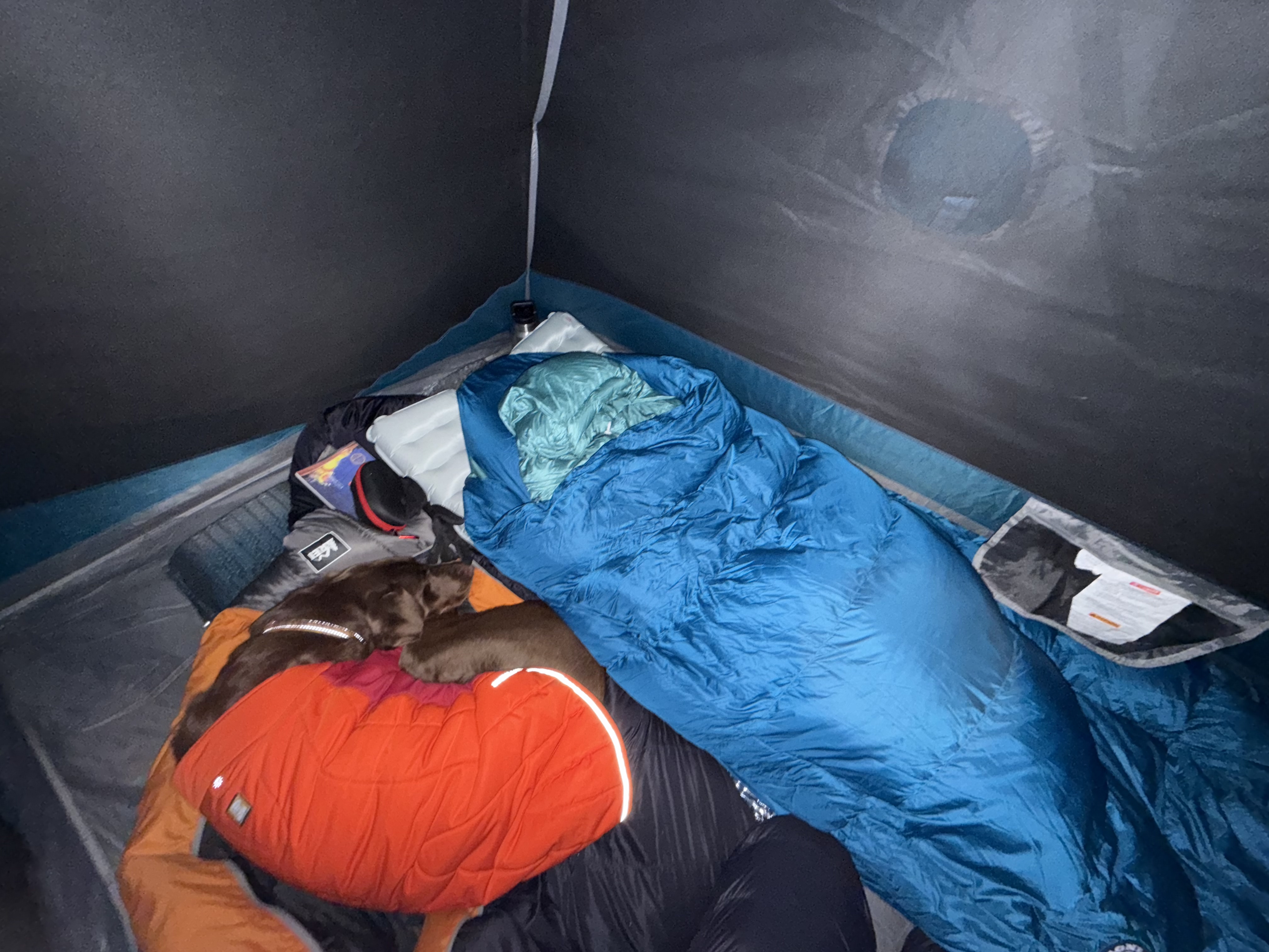 I joined Goose in bed at 830, excited to try my new Big Agnes Roxy Ann 3N1 sleeping bag. Although it is a 30-degree bag and the temperatures were going to be down in the low 20s and possibly teens, I wanted to test out its limits. I wore my jacket and down pants to bed and let Goose have my -20 bag. If I got too cold, I’d just swap with him. I read a page and a half of The Great Gatsby before falling into a deep sleep.