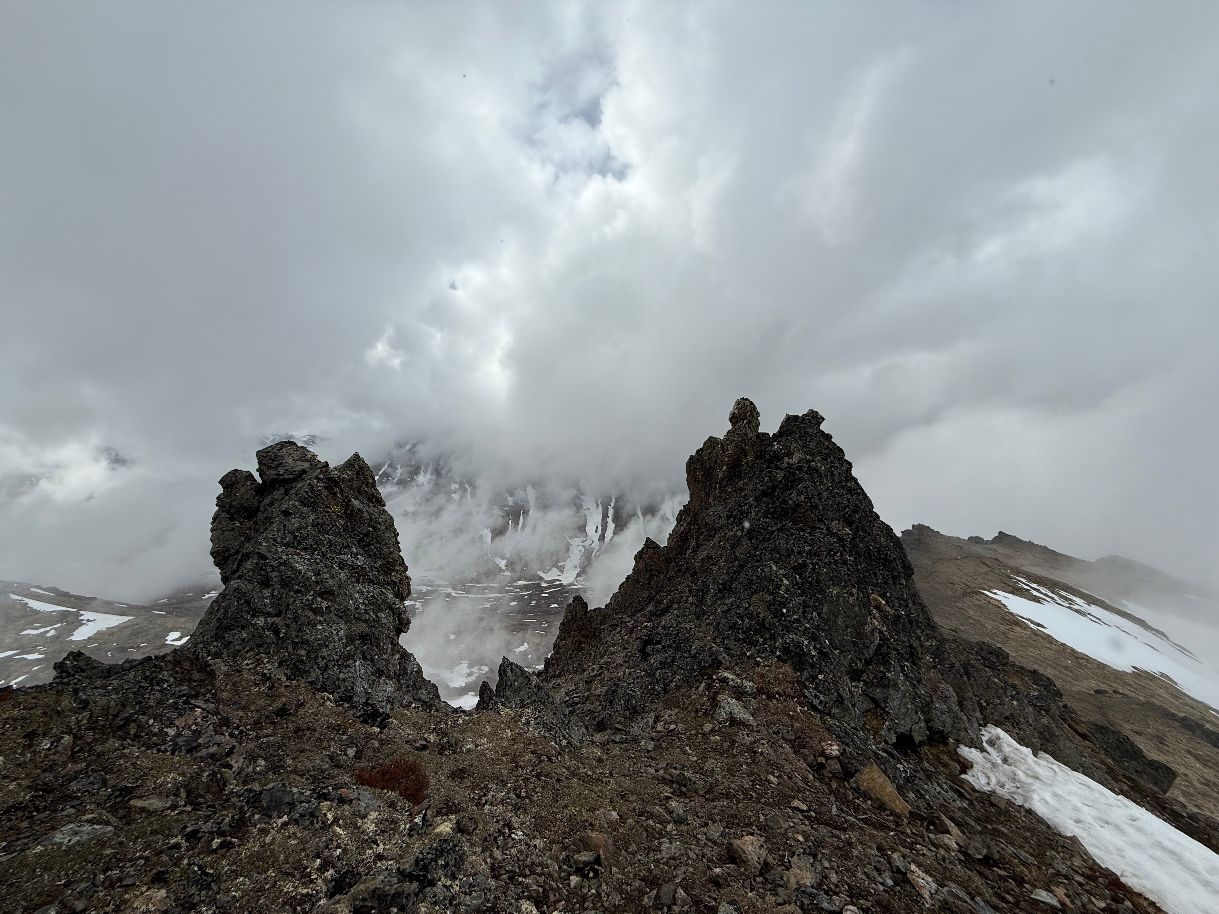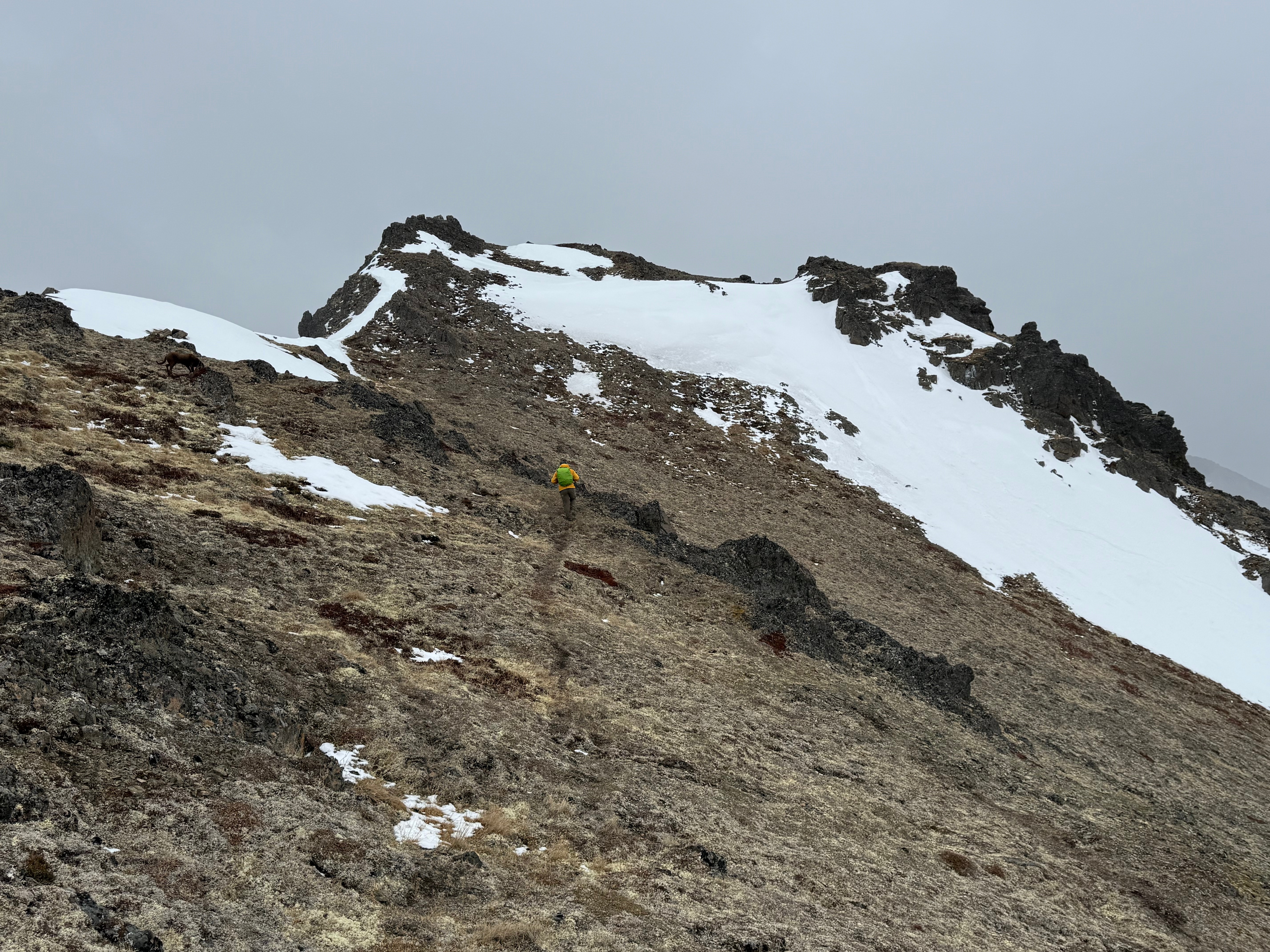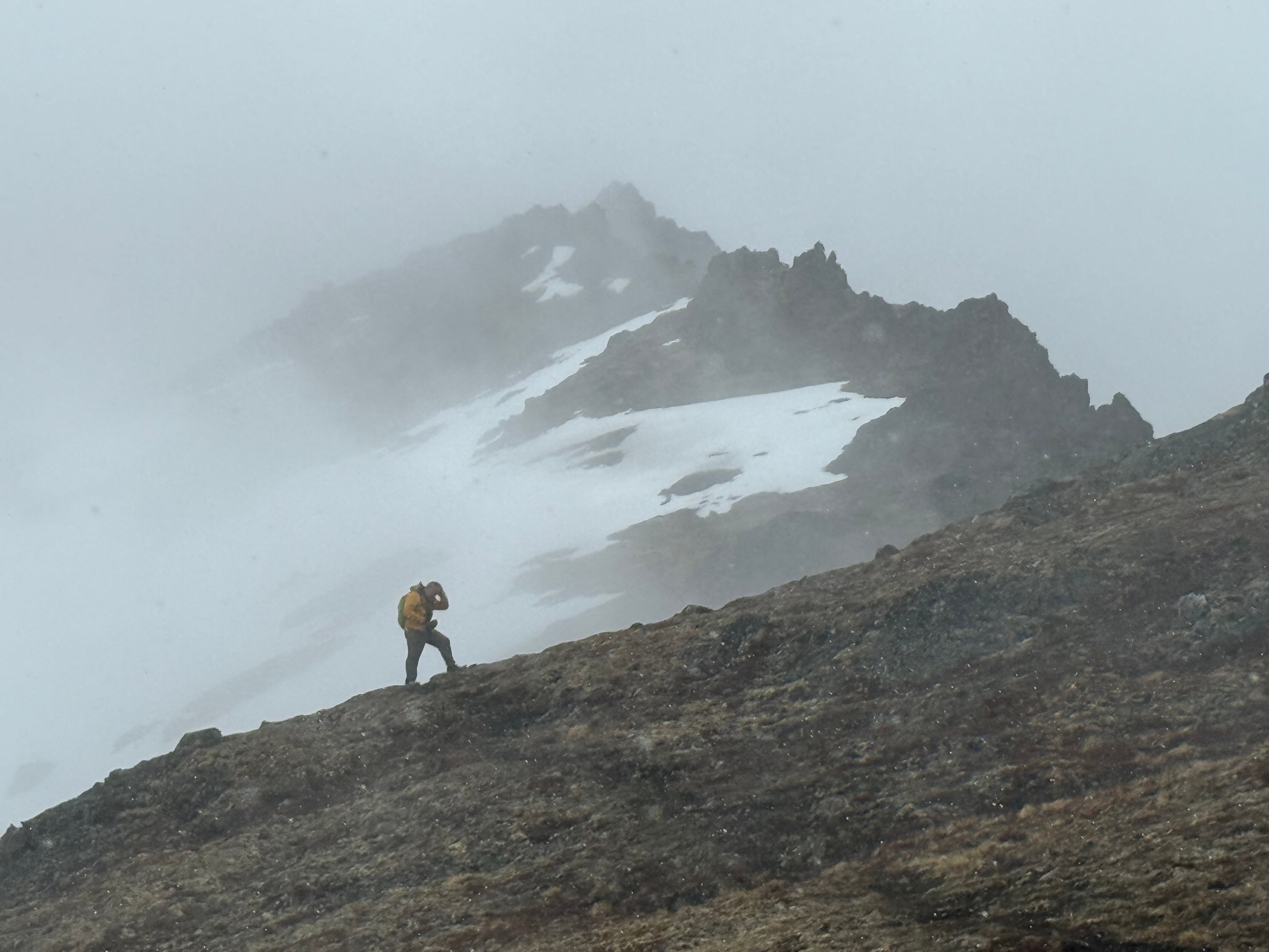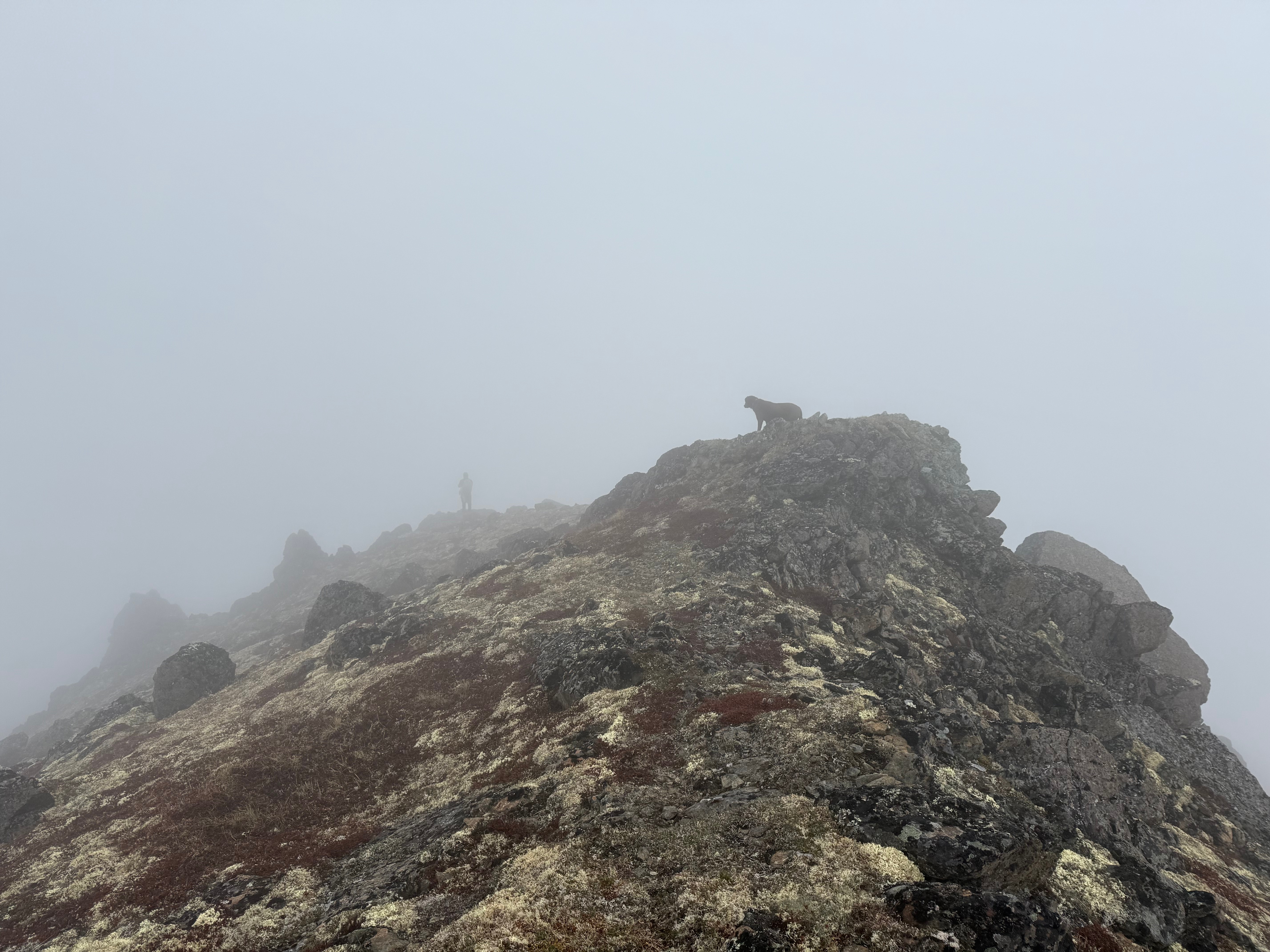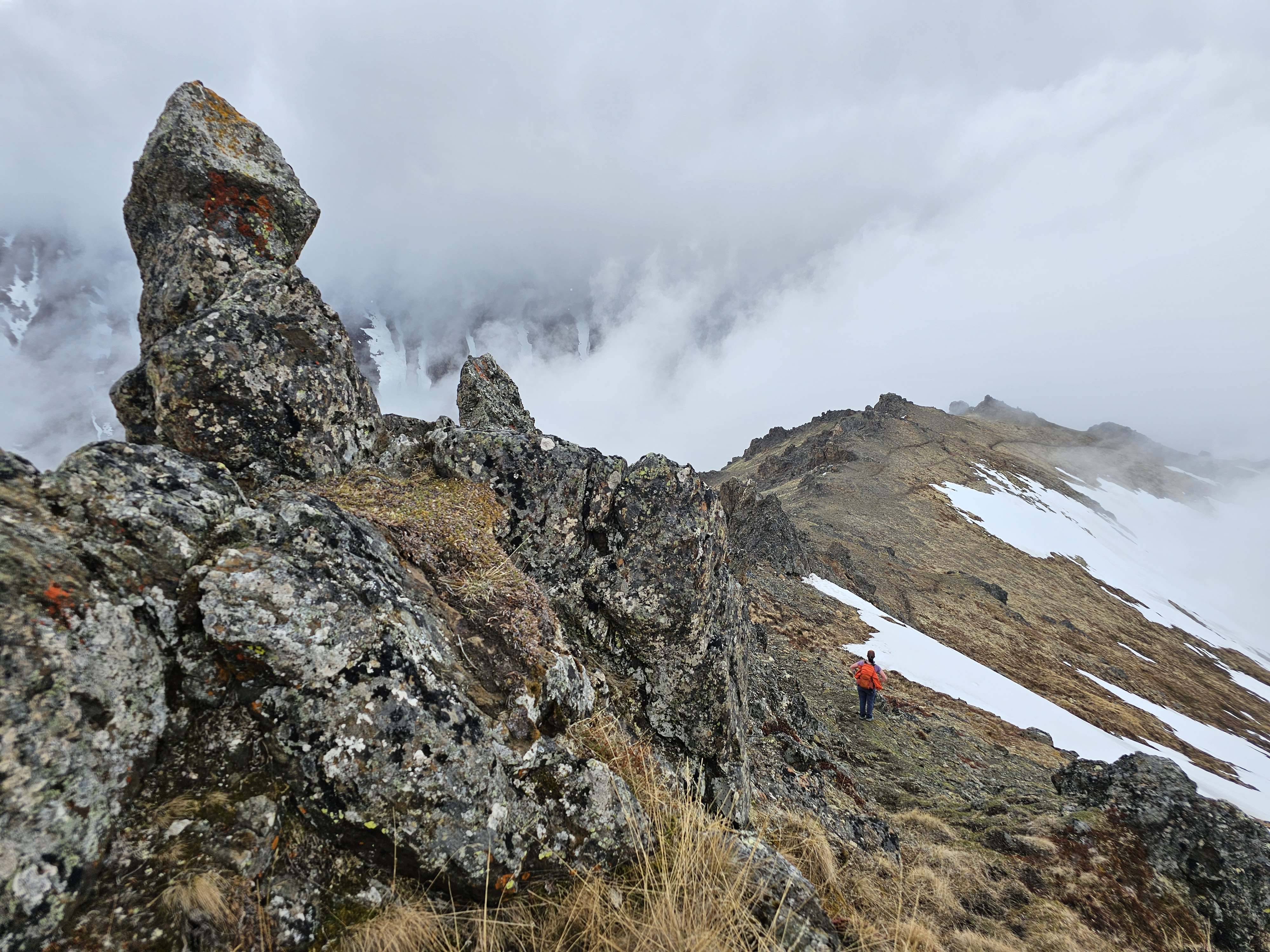 A solitary ptarmigan perched on a boulder welcomed us to the top of The Dome, where we paused for a quick bite before continuing up the ridge toward Knoya. The low ceiling of clouds persisted as we ascended the jagged ridge. From a distance, the ridgeline looks deceptively daunting, but once you’re on it, the walking is fairly straightforward with no scrambling required.