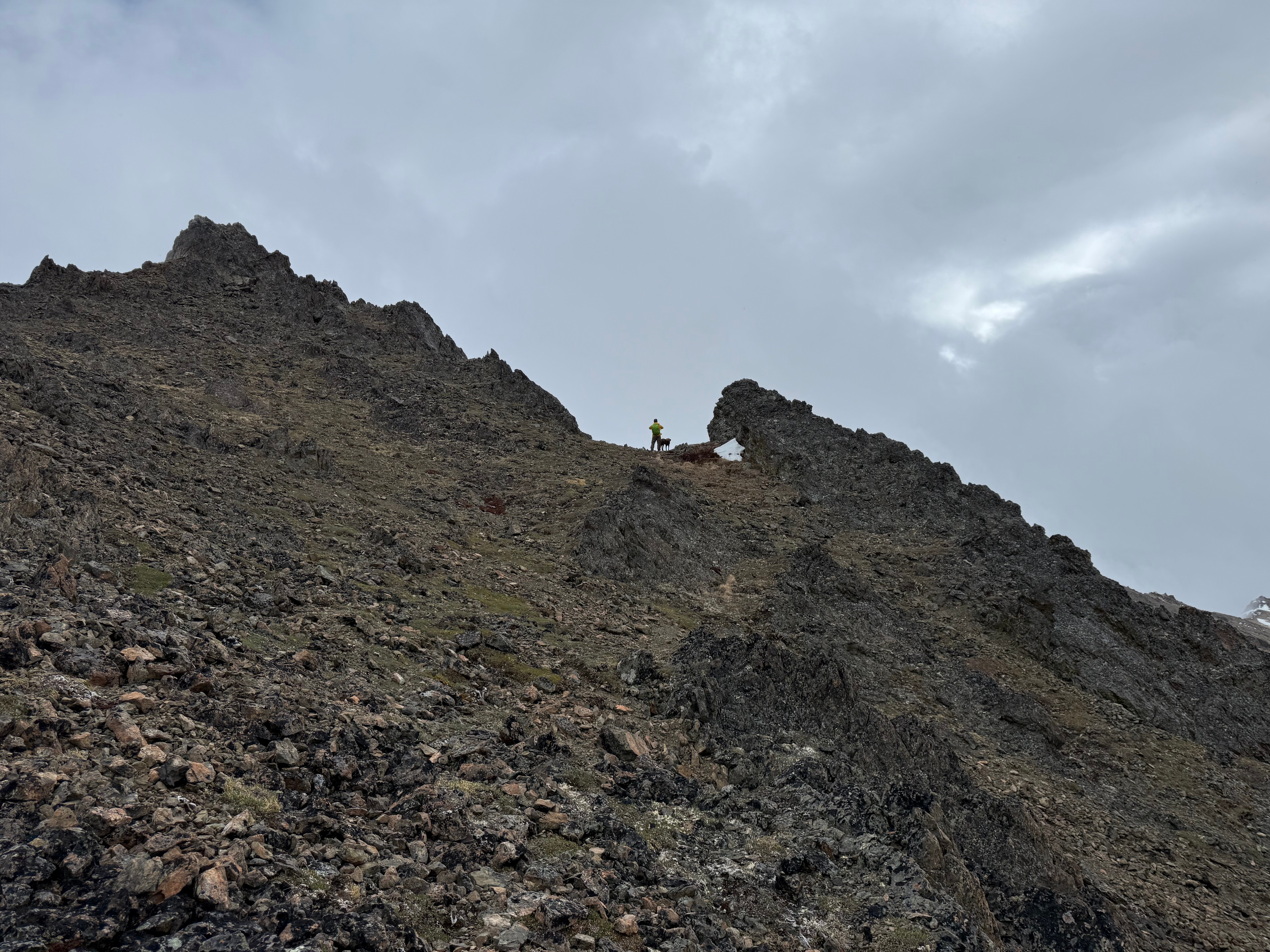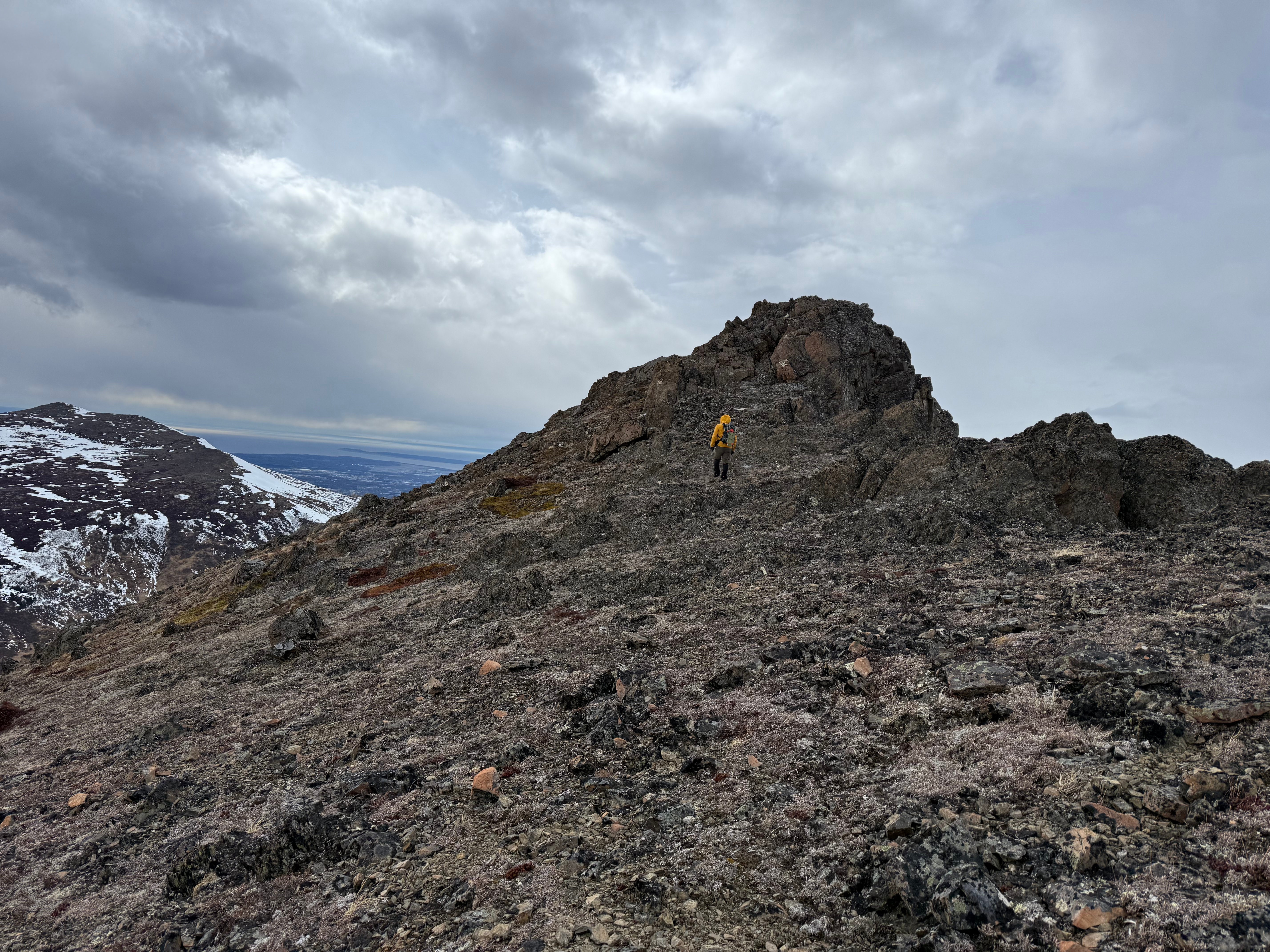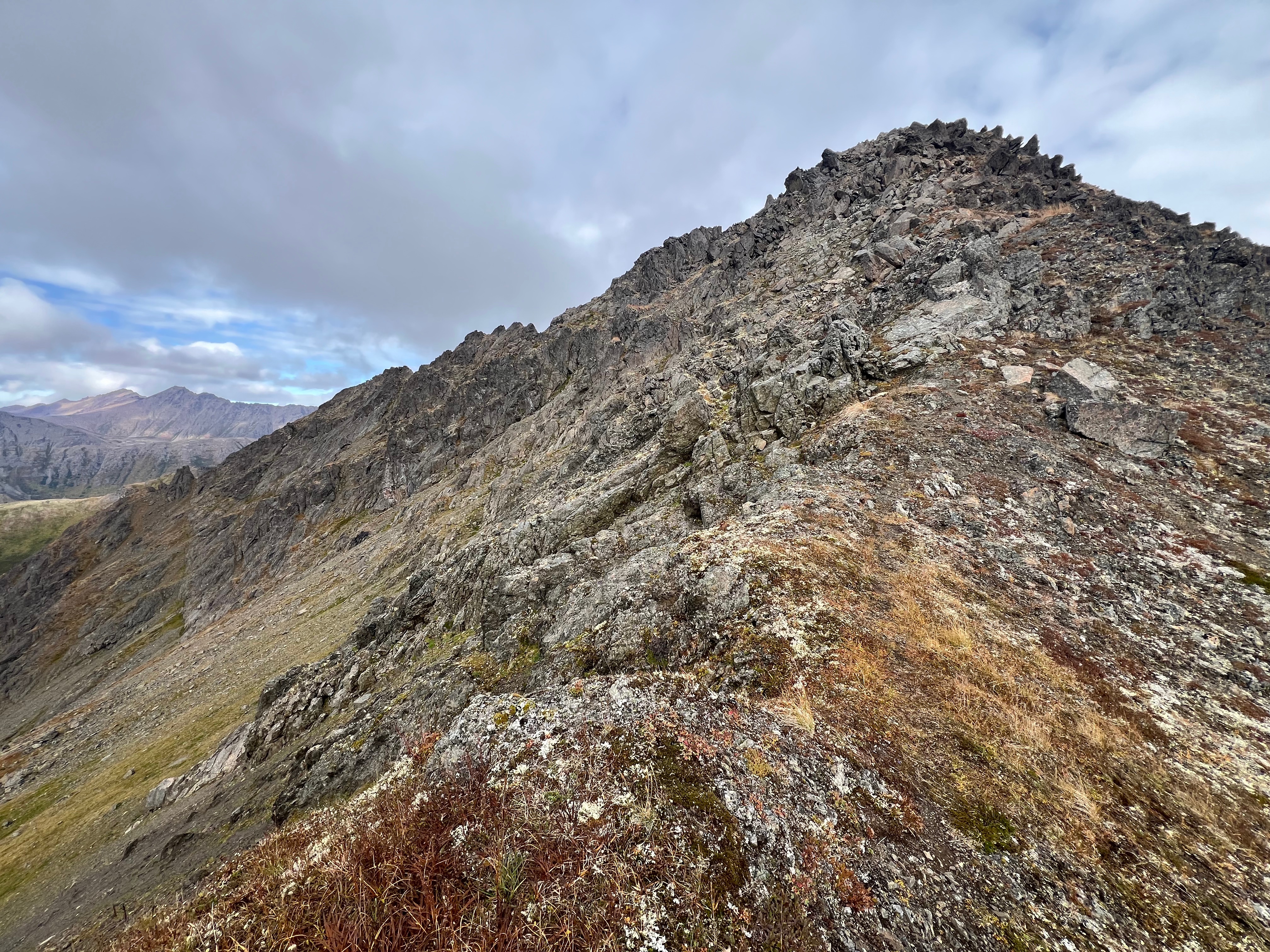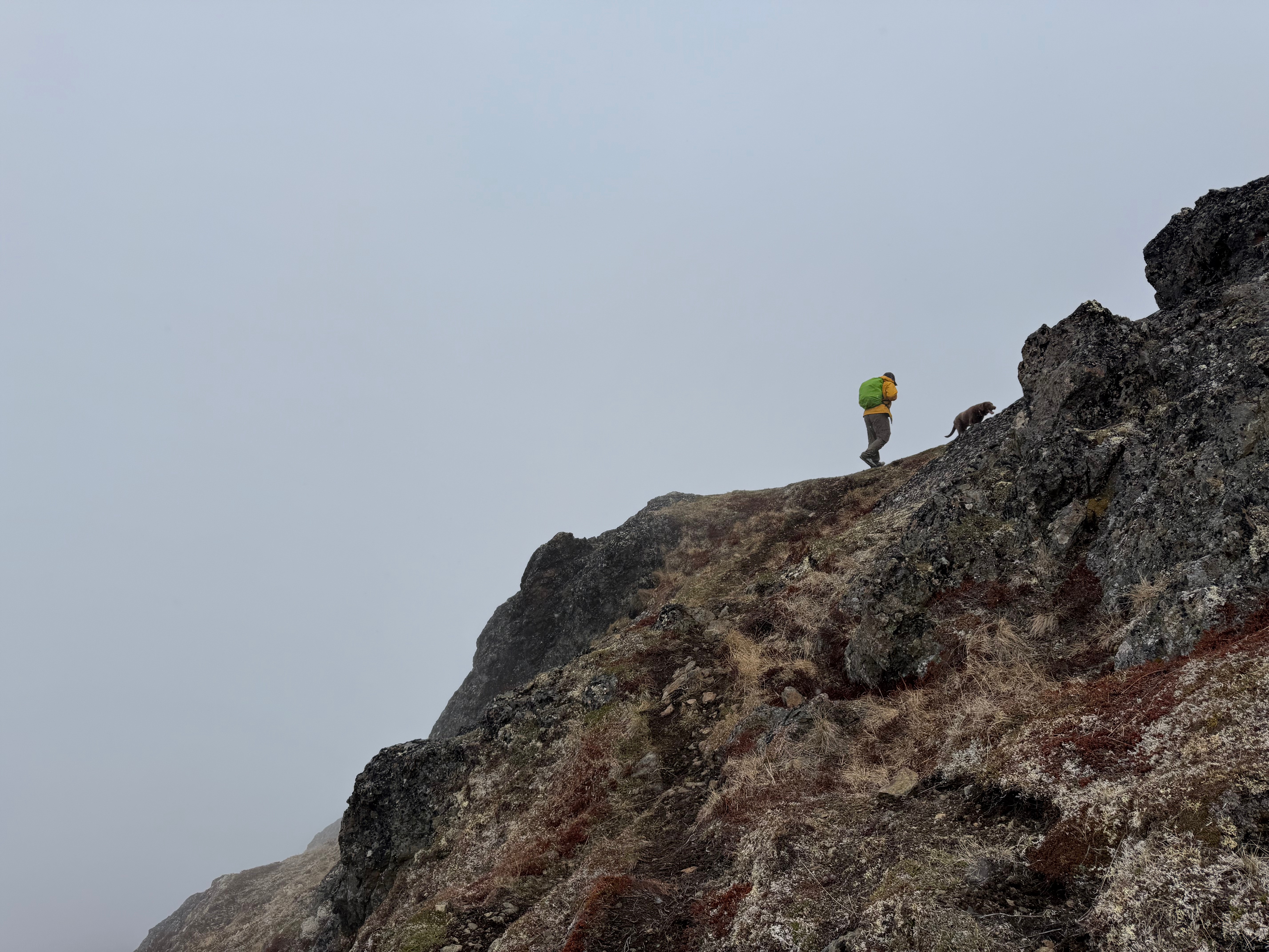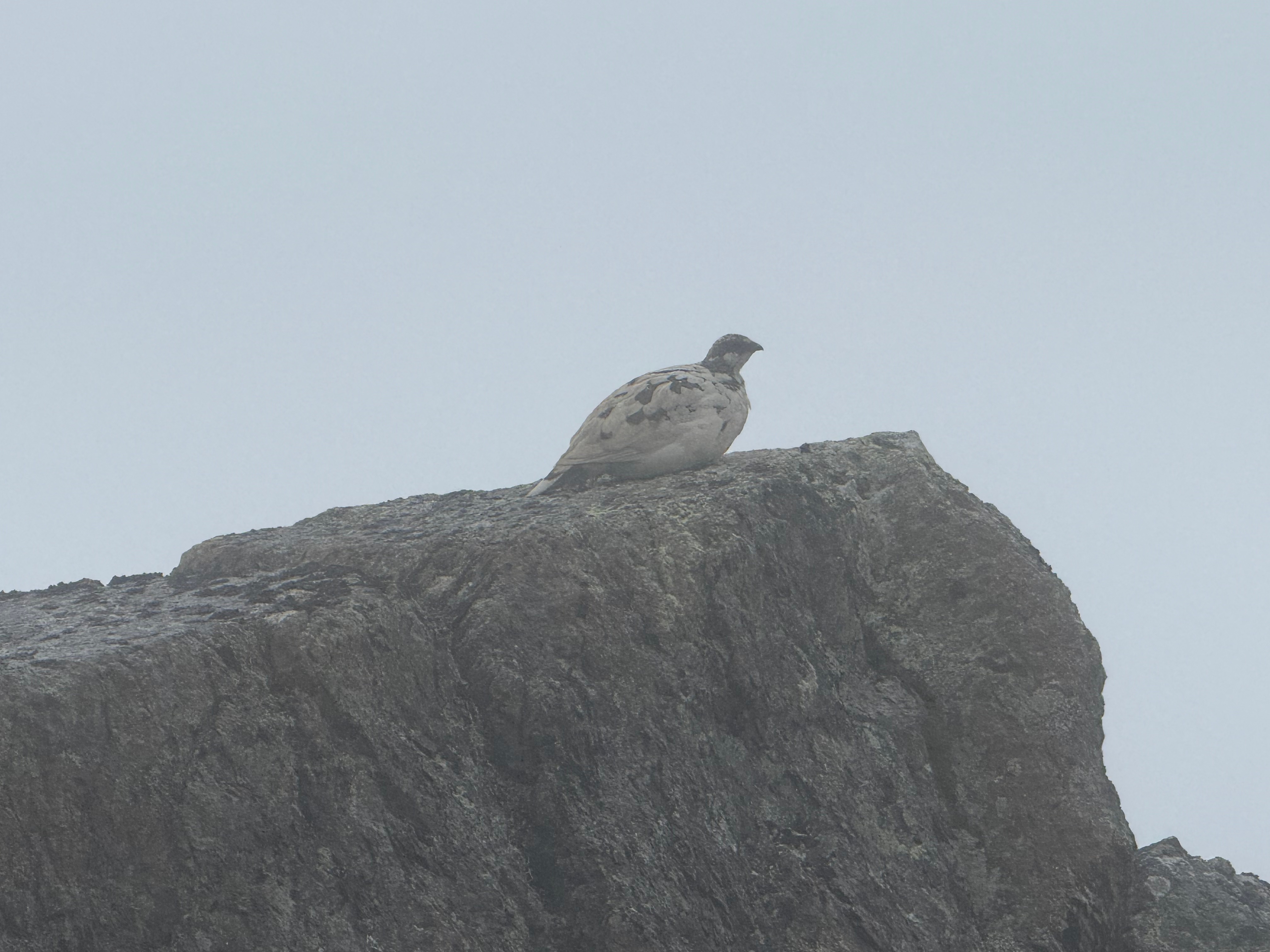 A solitary ptarmigan perched on a boulder welcomed us to the top of The Dome, where we paused for a quick bite before continuing up the ridge toward Knoya. The low ceiling of clouds persisted as we ascended the jagged ridge. From a distance, the ridgeline looks deceptively daunting, but once you’re on it, the walking is fairly straightforward with no scrambling required.
