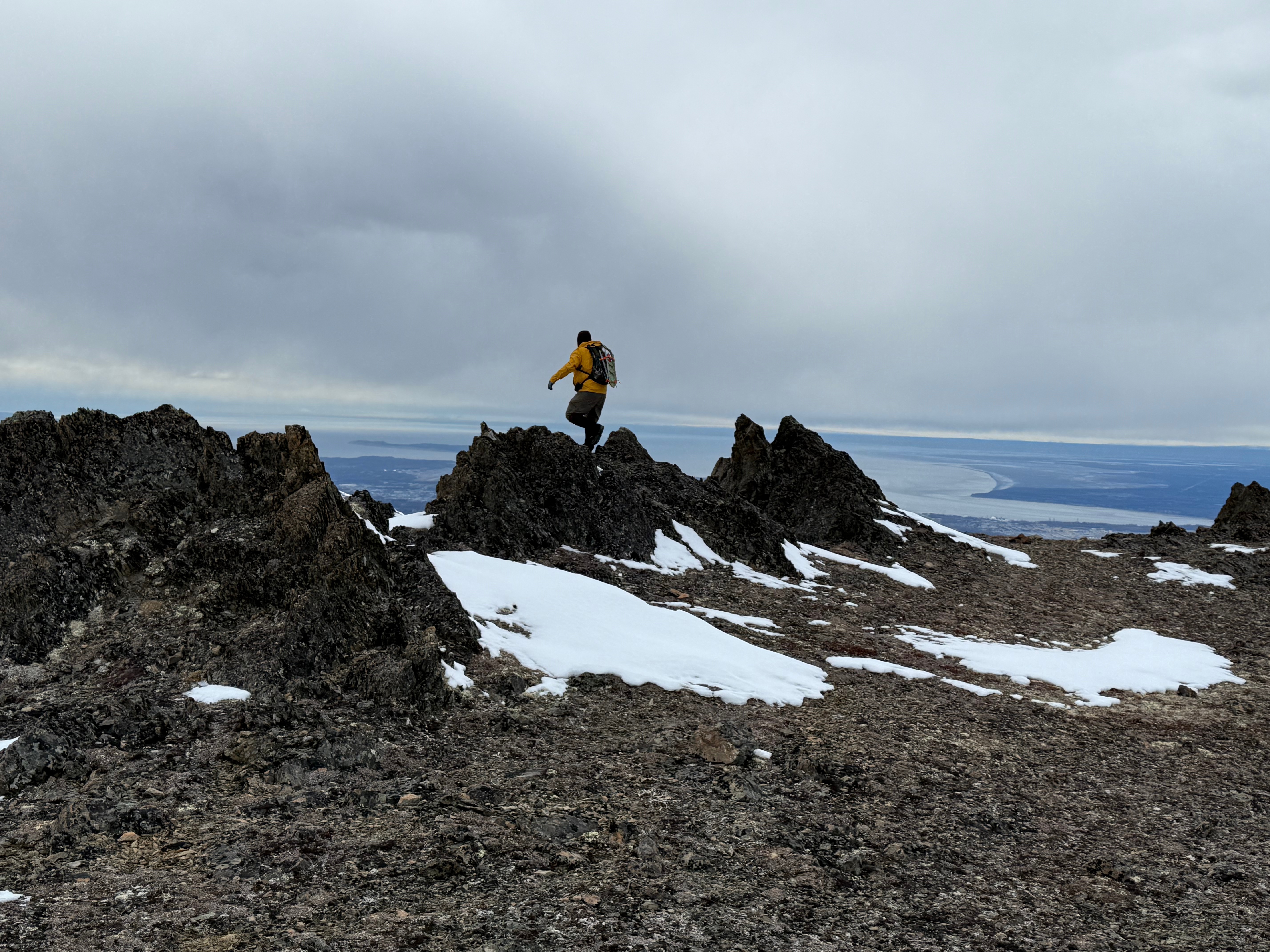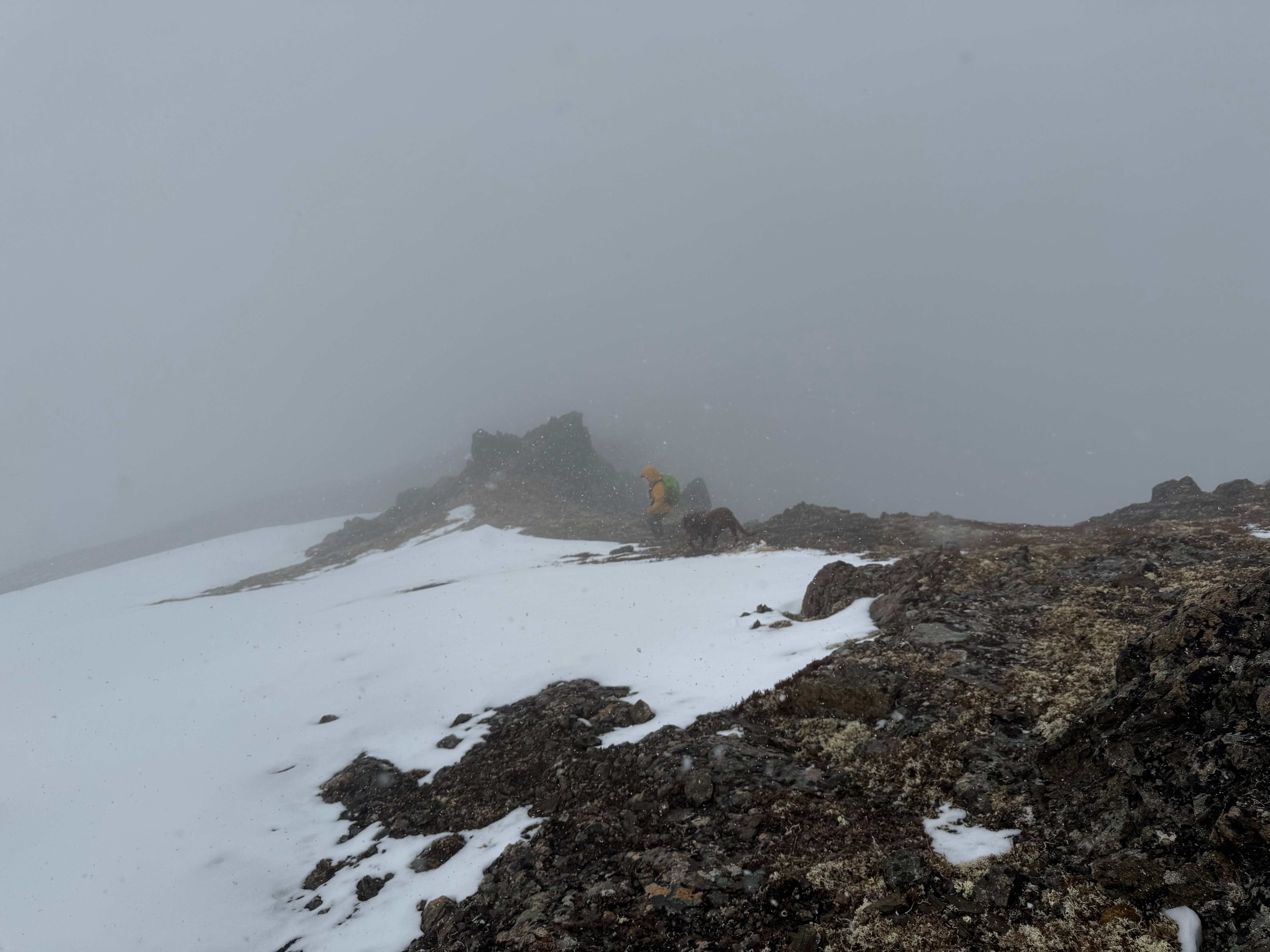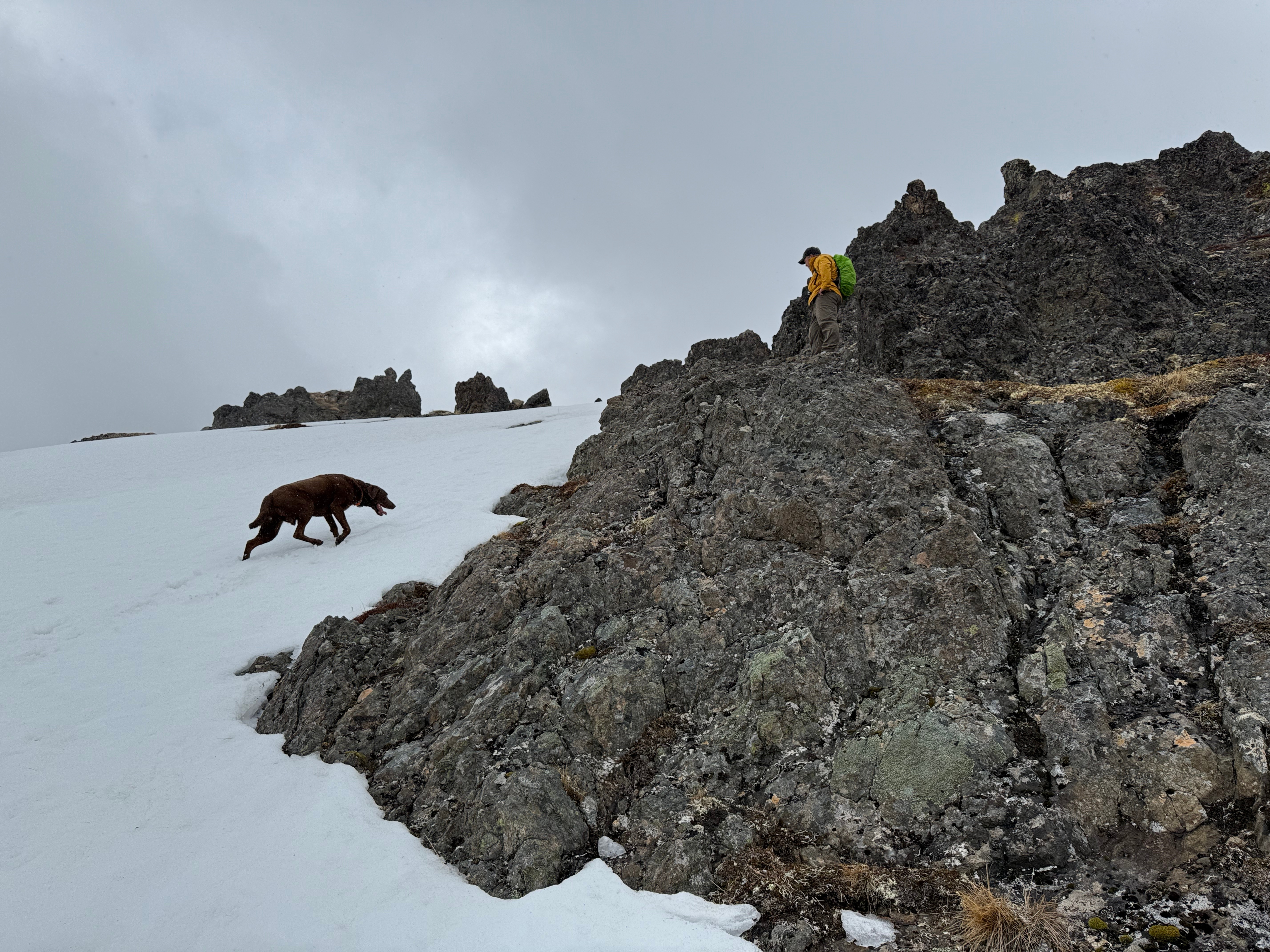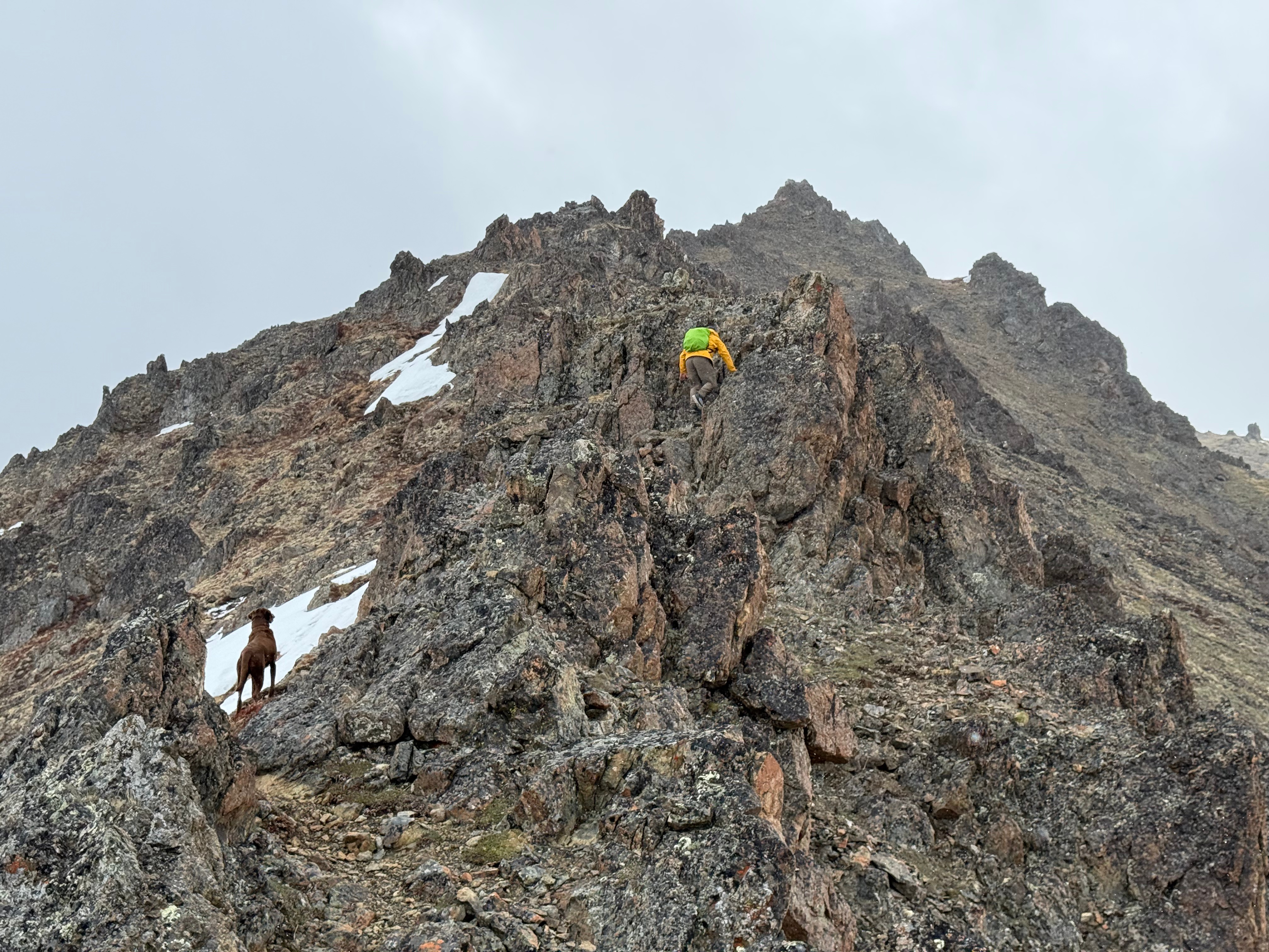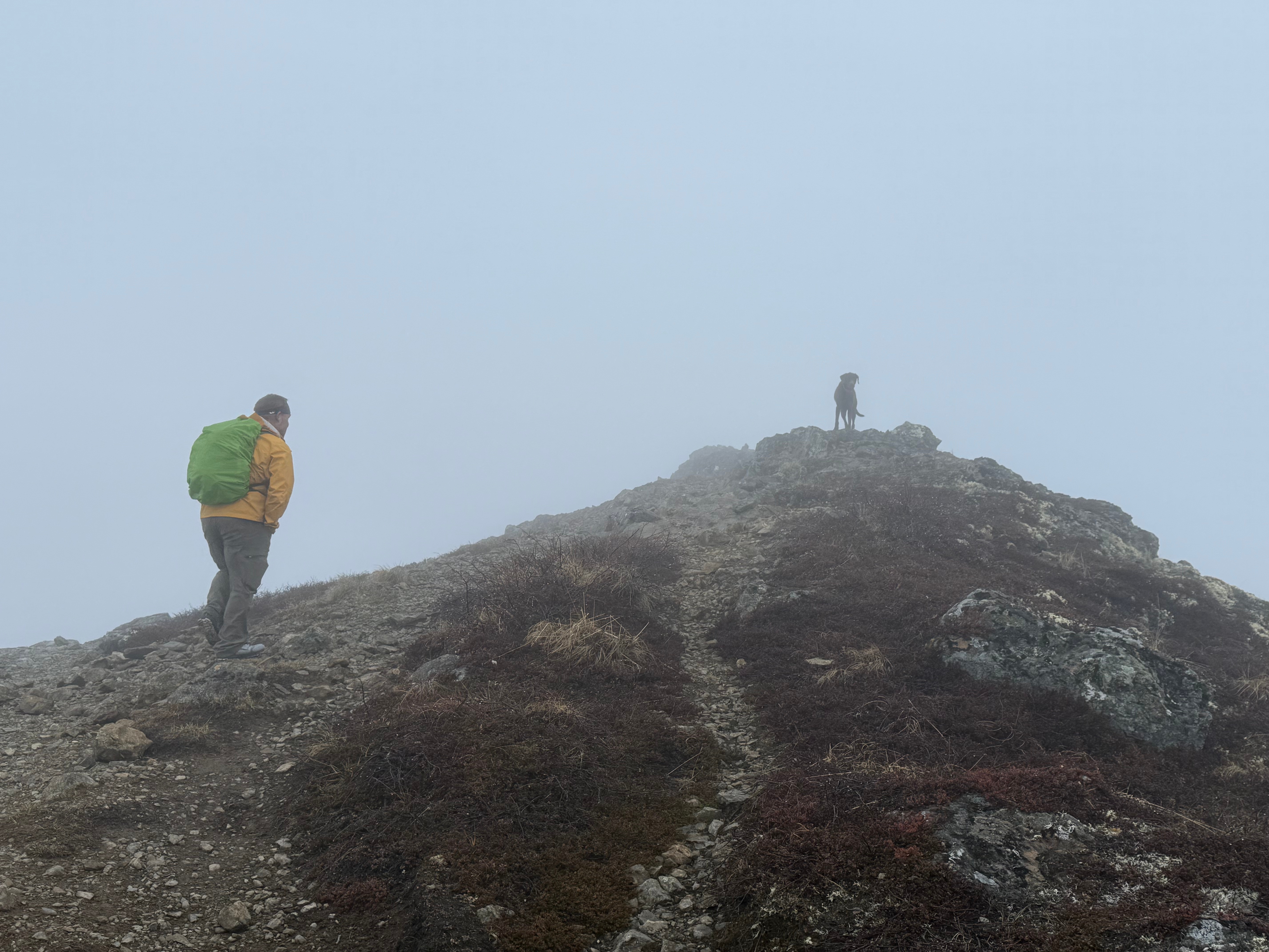 A solitary ptarmigan perched on a boulder welcomed us to the top of The Dome, where we paused for a quick bite before continuing up the ridge toward Knoya. The low ceiling of clouds persisted as we ascended the jagged ridge. From a distance, the ridgeline looks deceptively daunting, but once you’re on it, the walking is fairly straightforward with no scrambling required.