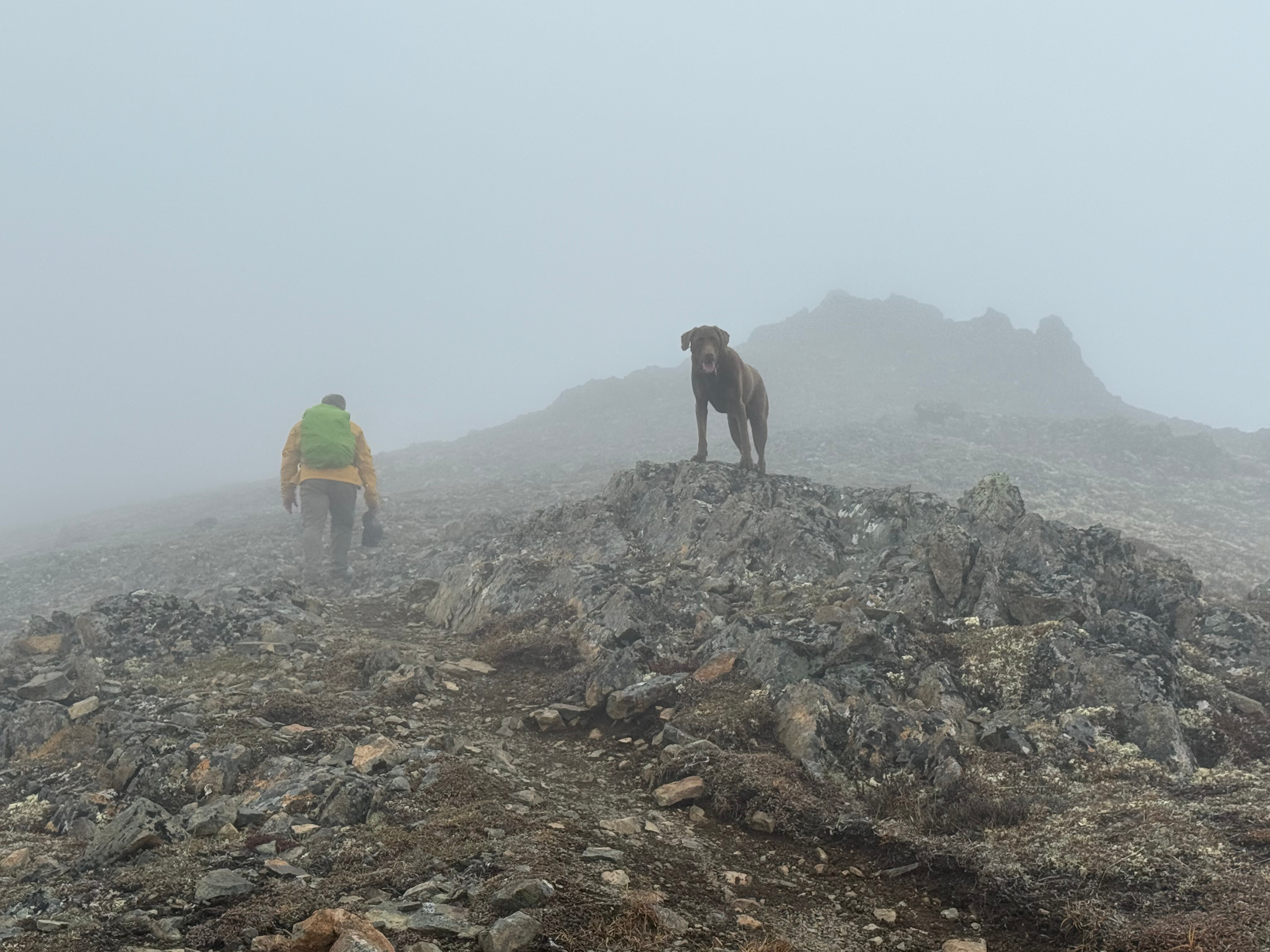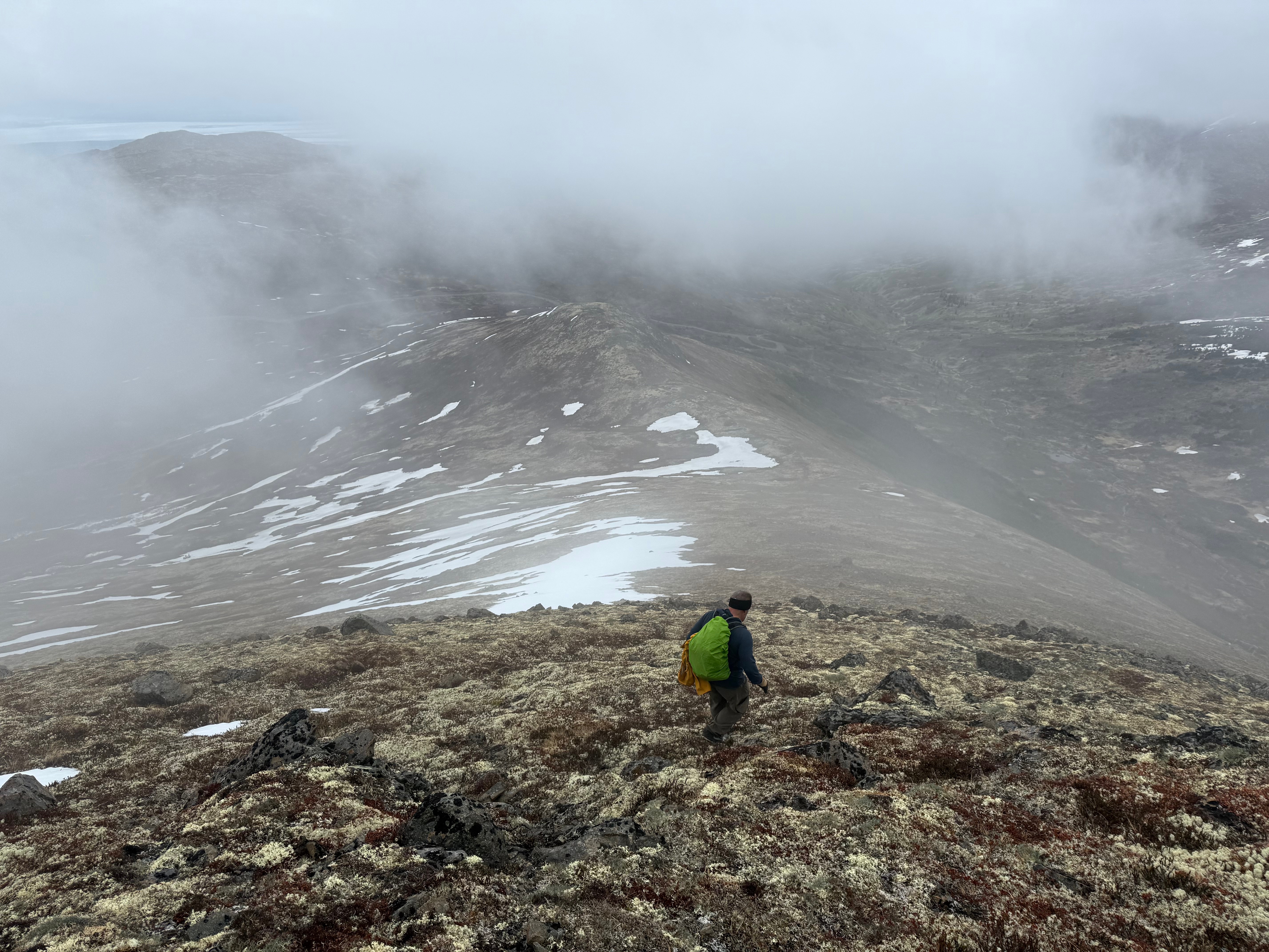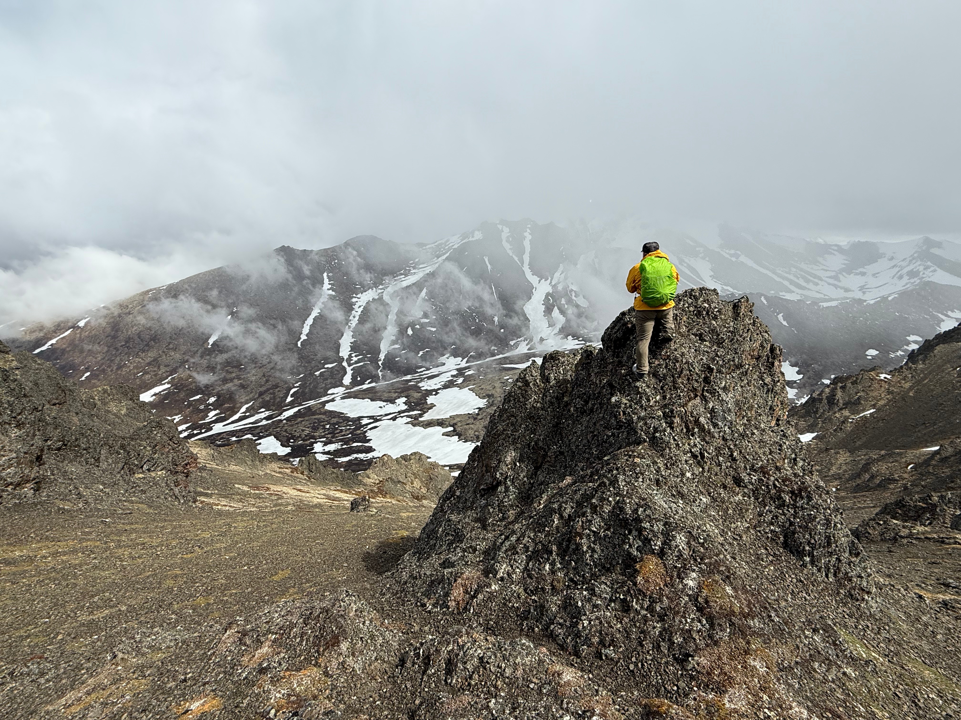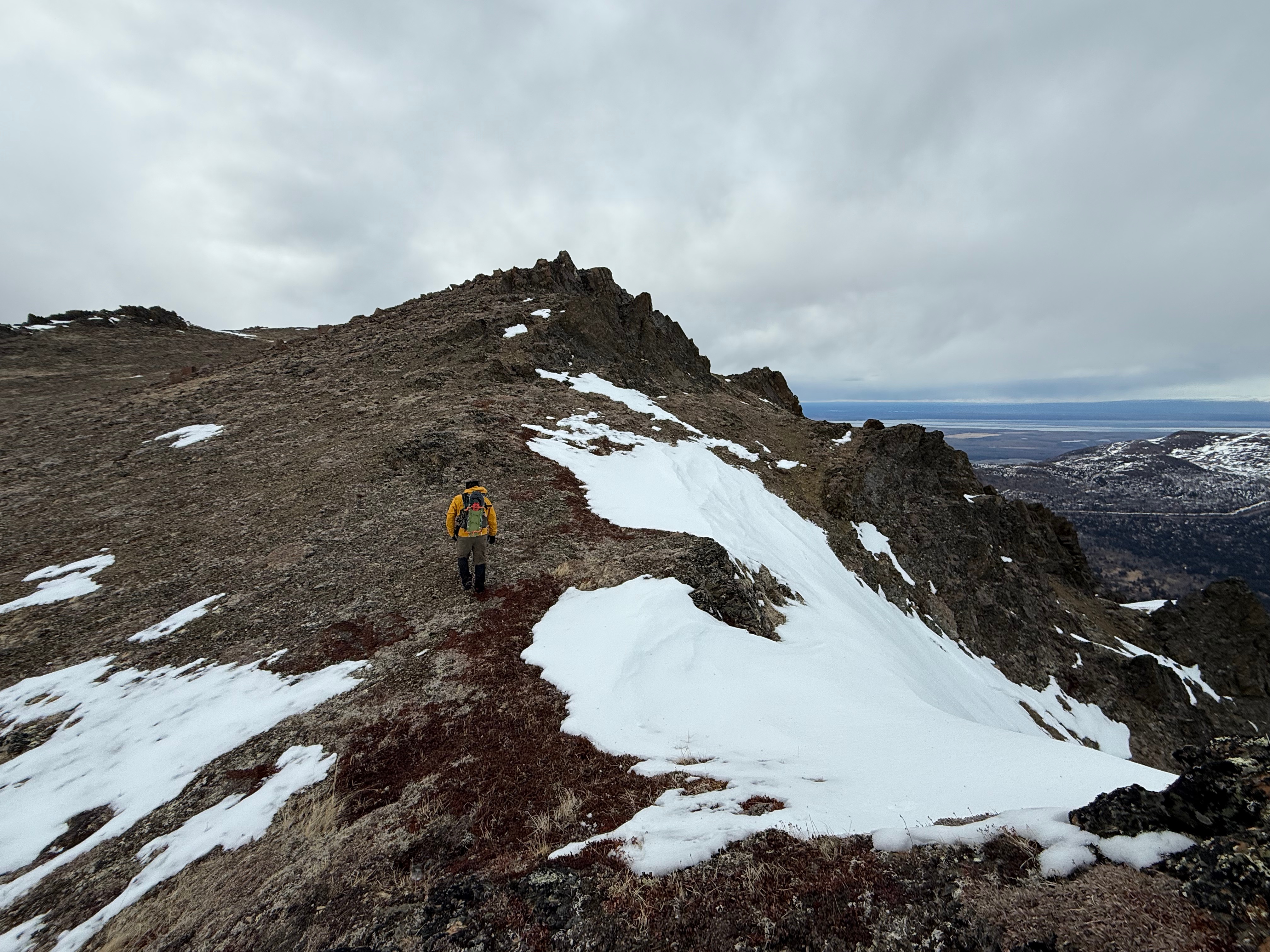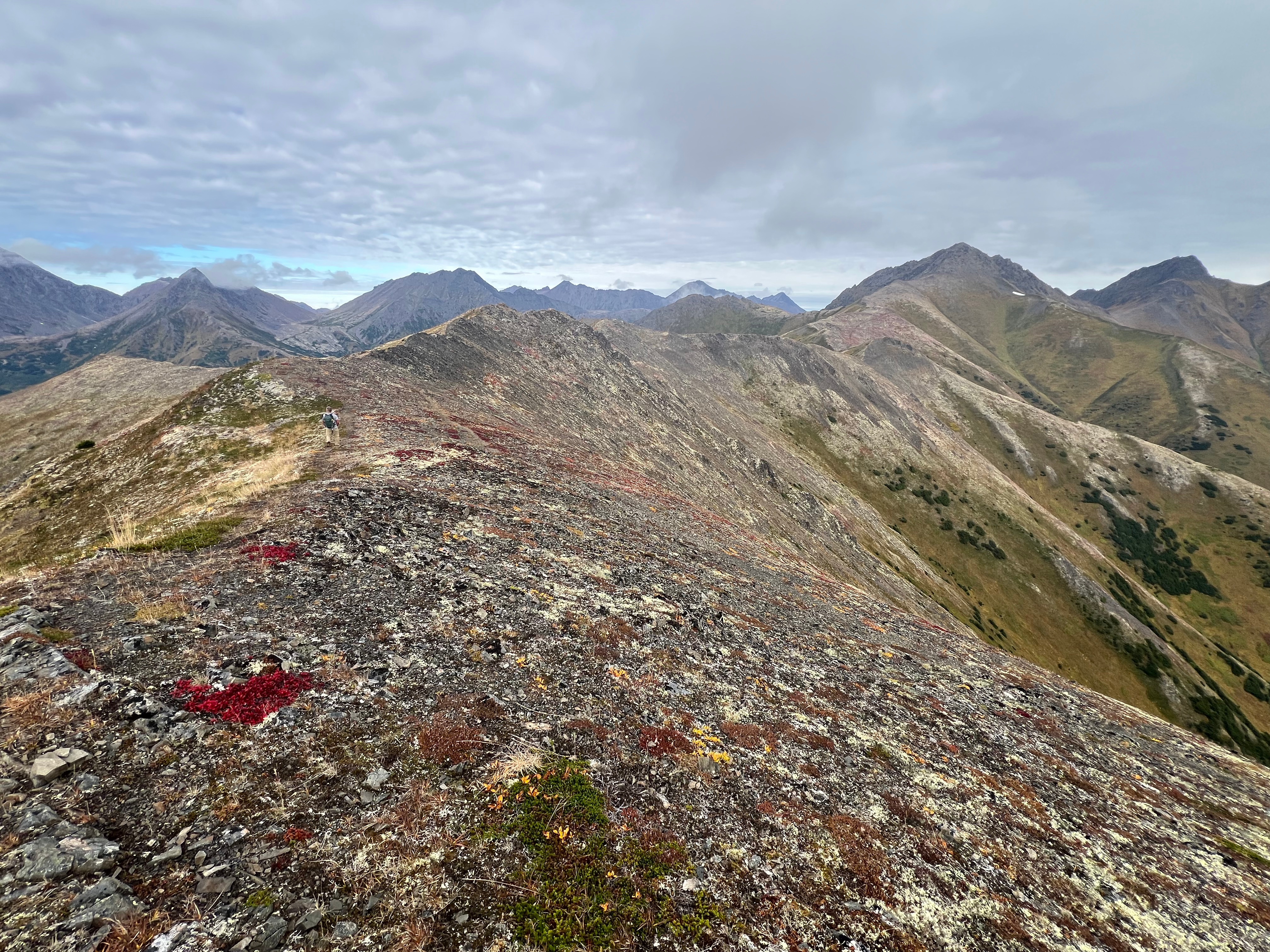 A solitary ptarmigan perched on a boulder welcomed us to the top of The Dome, where we paused for a quick bite before continuing up the ridge toward Knoya. The low ceiling of clouds persisted as we ascended the jagged ridge. From a distance, the ridgeline looks deceptively daunting, but once you’re on it, the walking is fairly straightforward with no scrambling required.