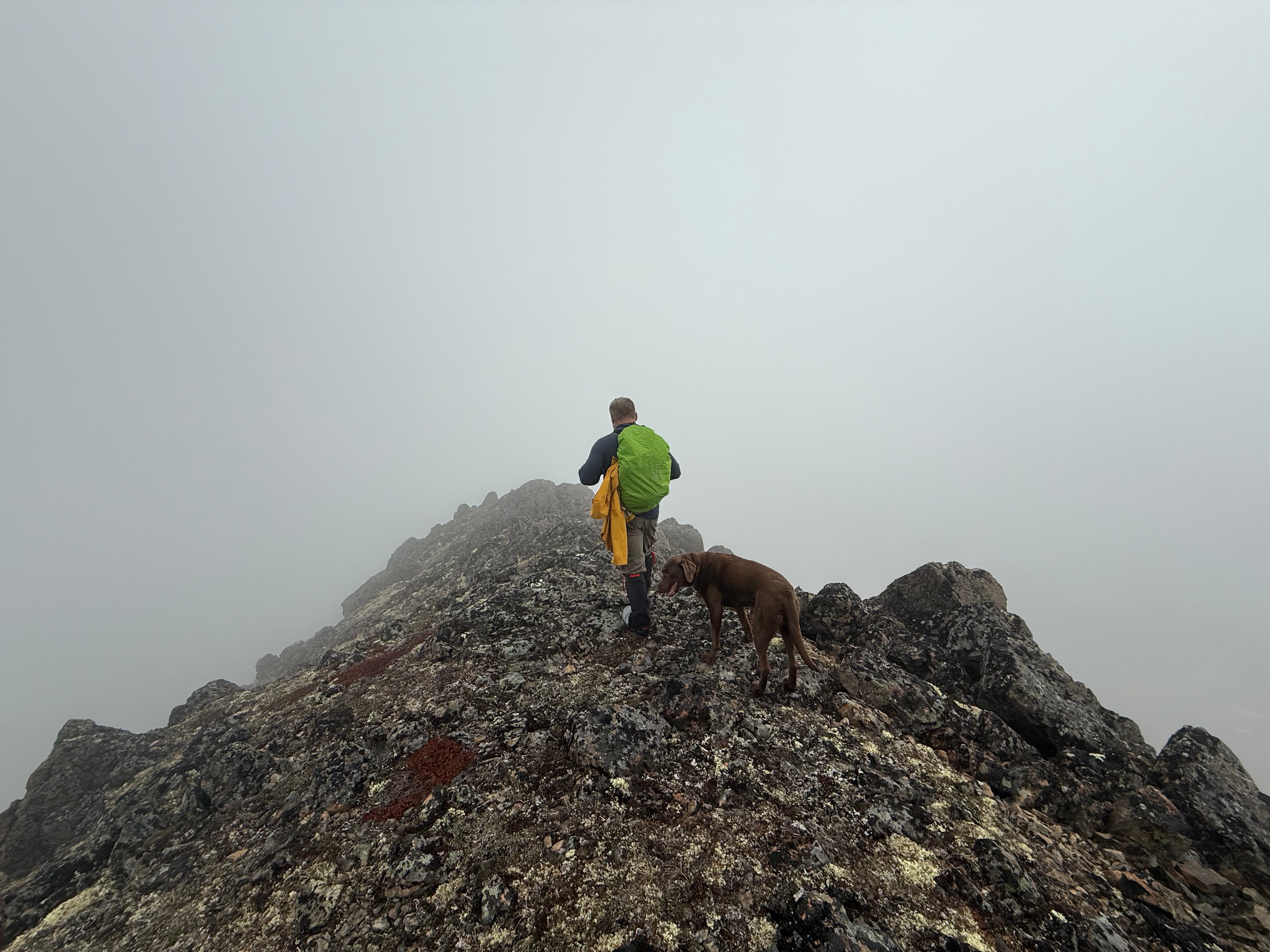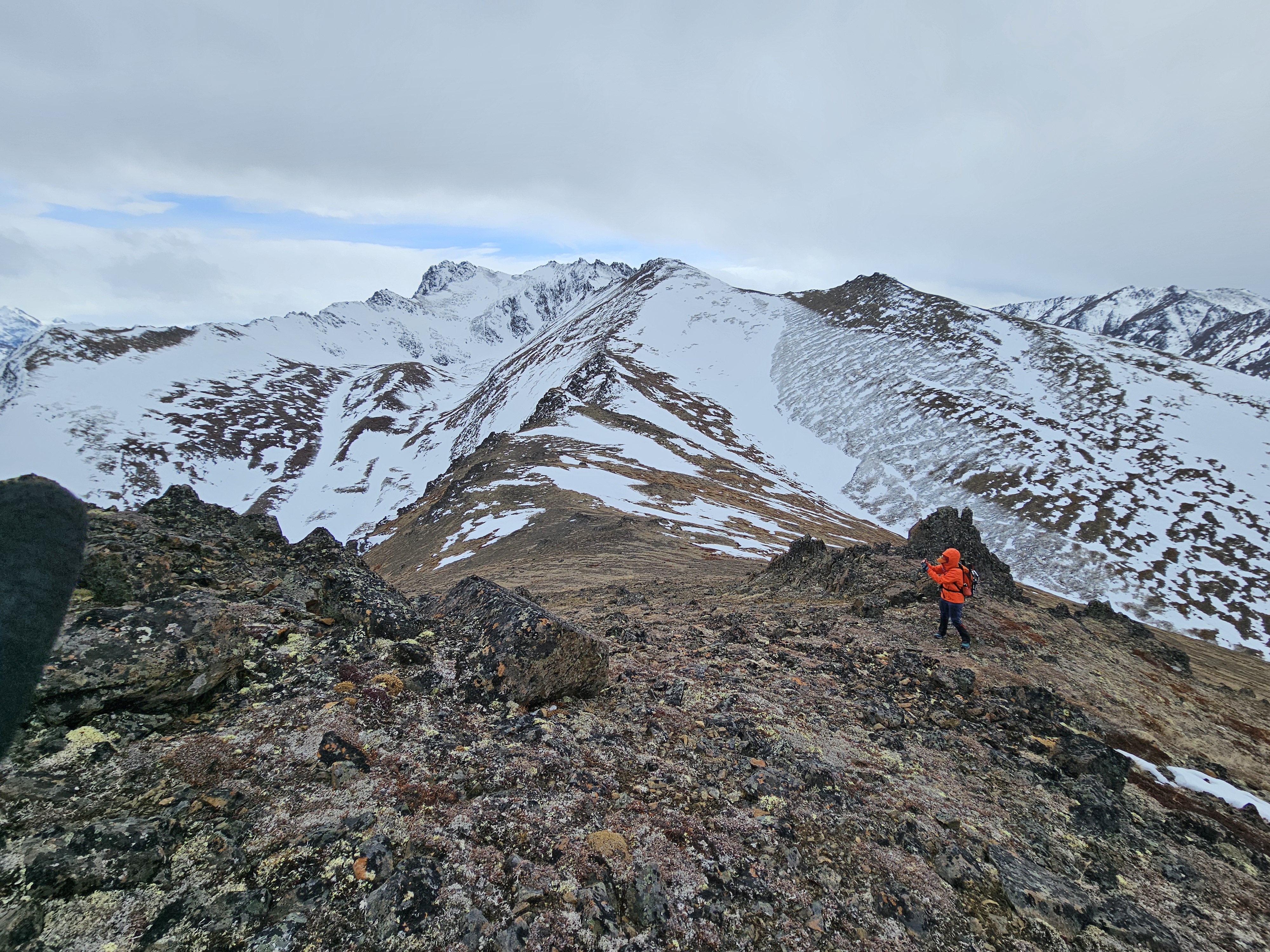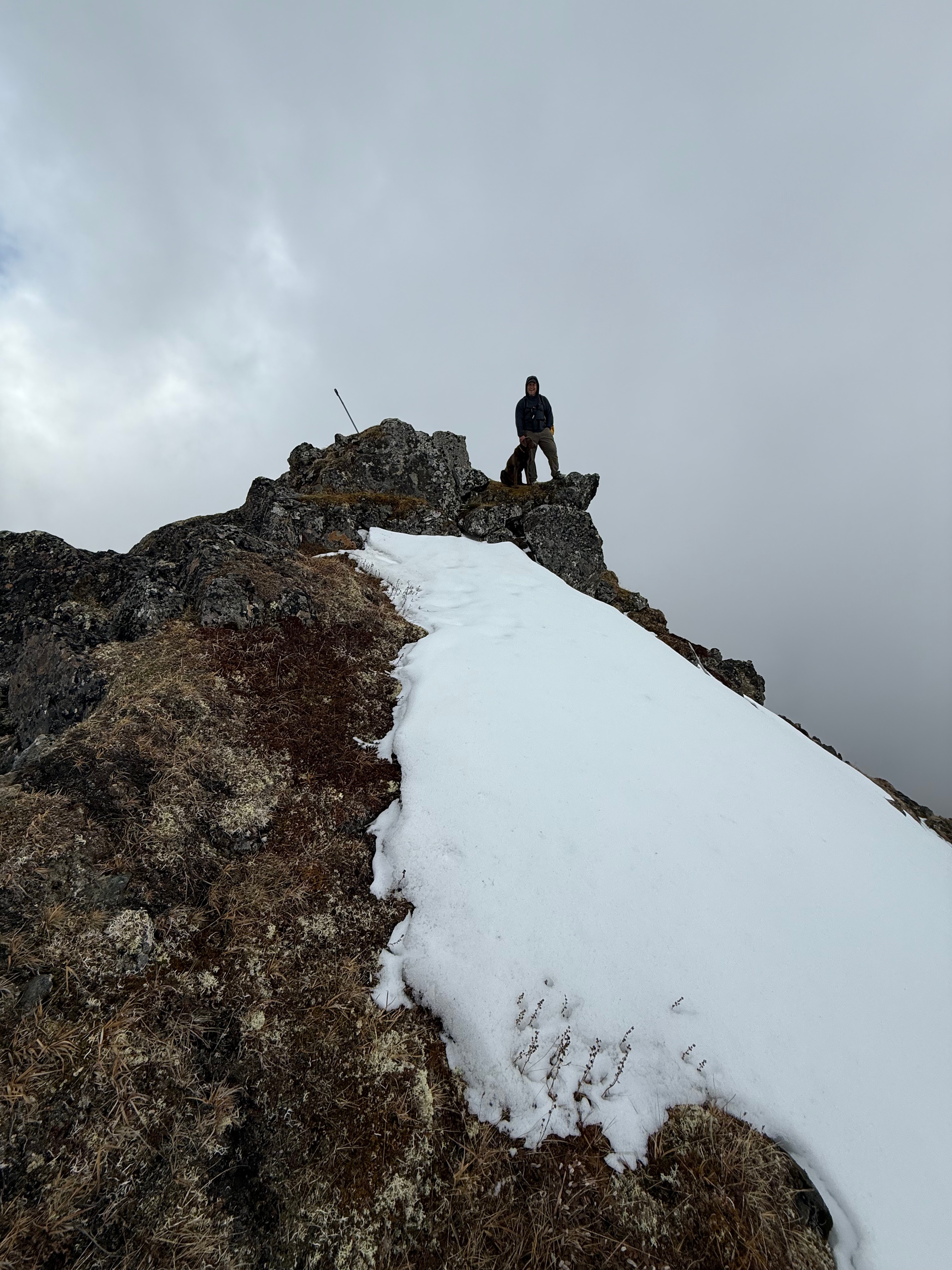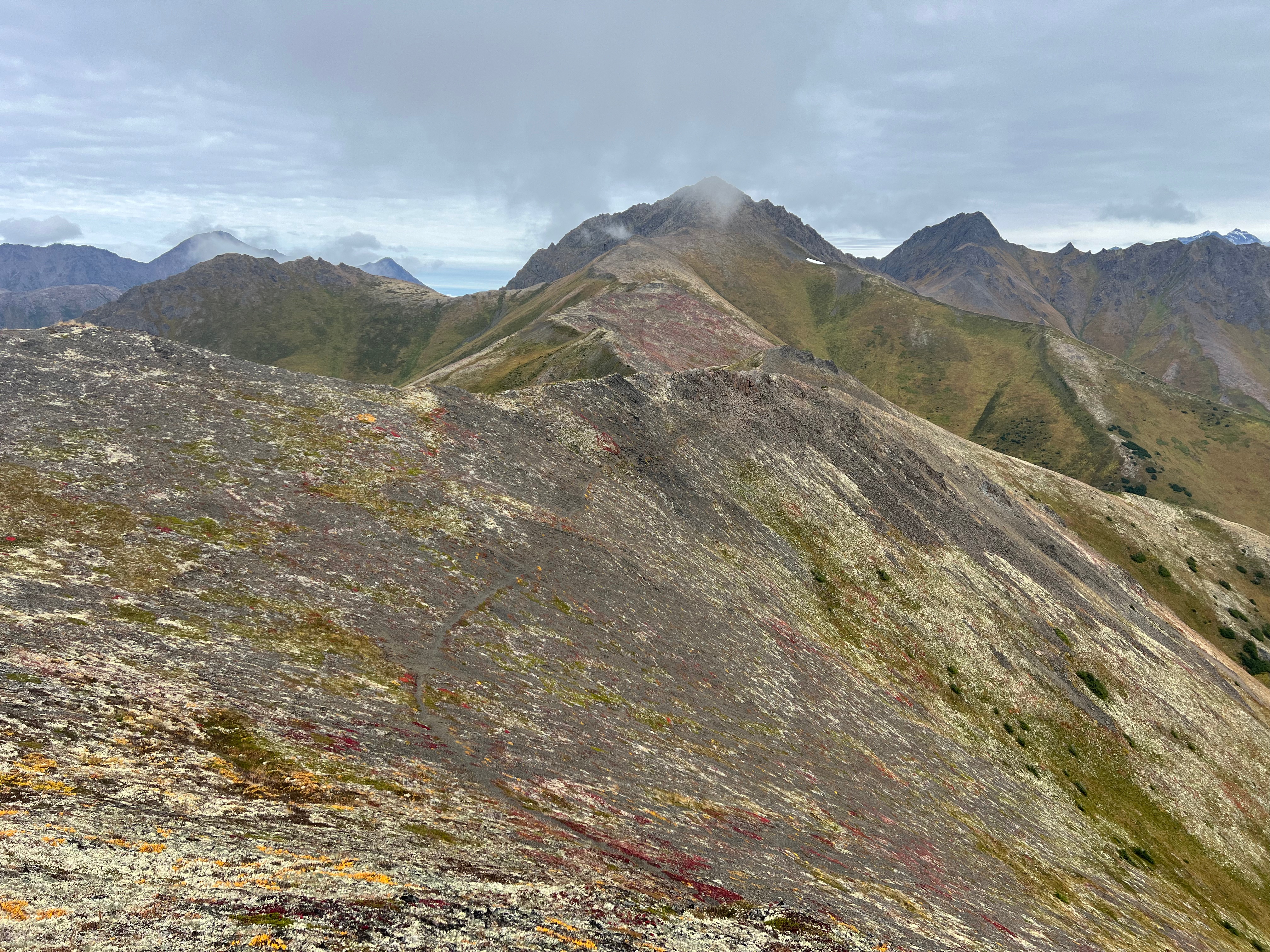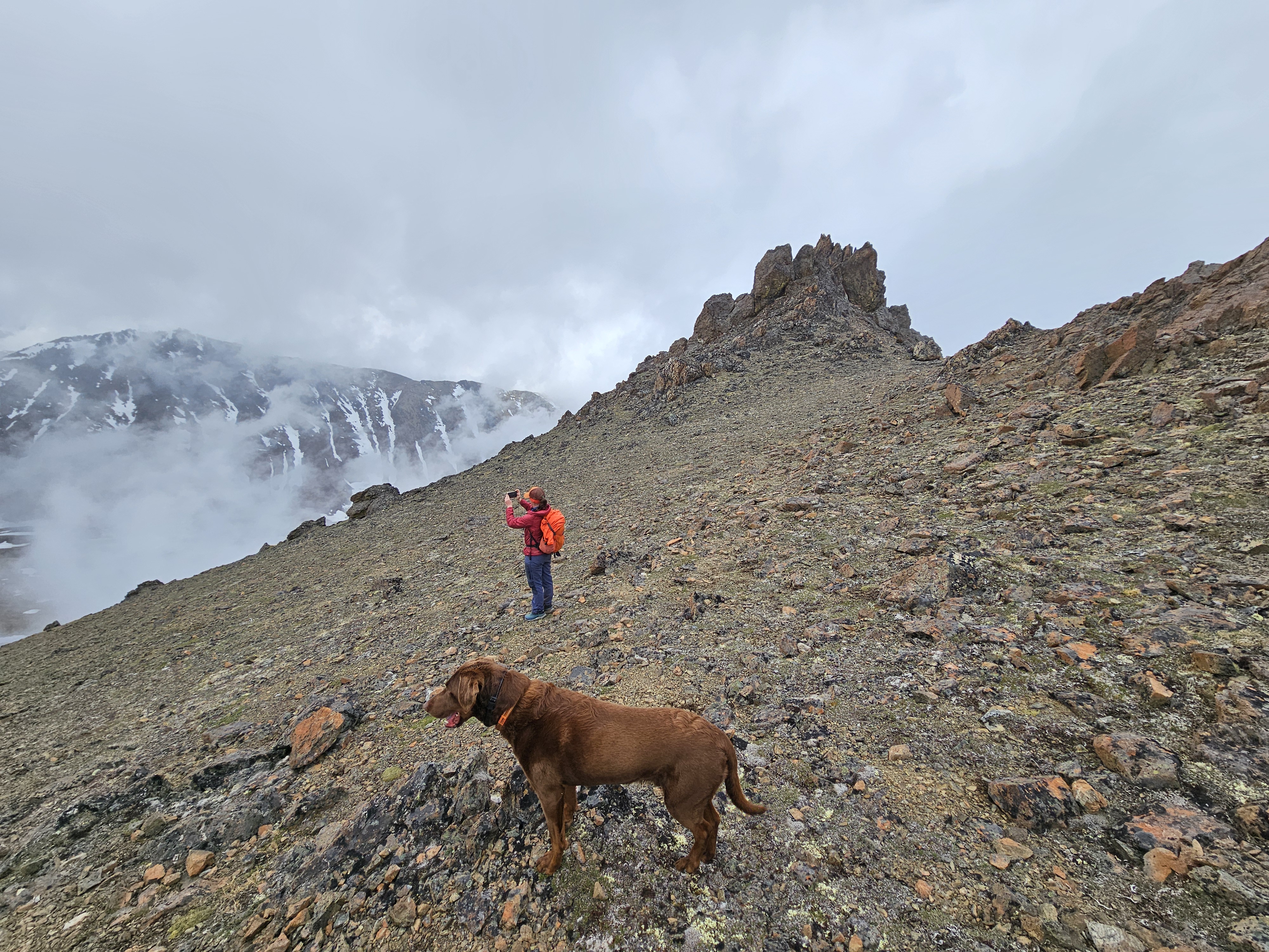 A solitary ptarmigan perched on a boulder welcomed us to the top of The Dome, where we paused for a quick bite before continuing up the ridge toward Knoya. The low ceiling of clouds persisted as we ascended the jagged ridge. From a distance, the ridgeline looks deceptively daunting, but once you’re on it, the walking is fairly straightforward with no scrambling required.