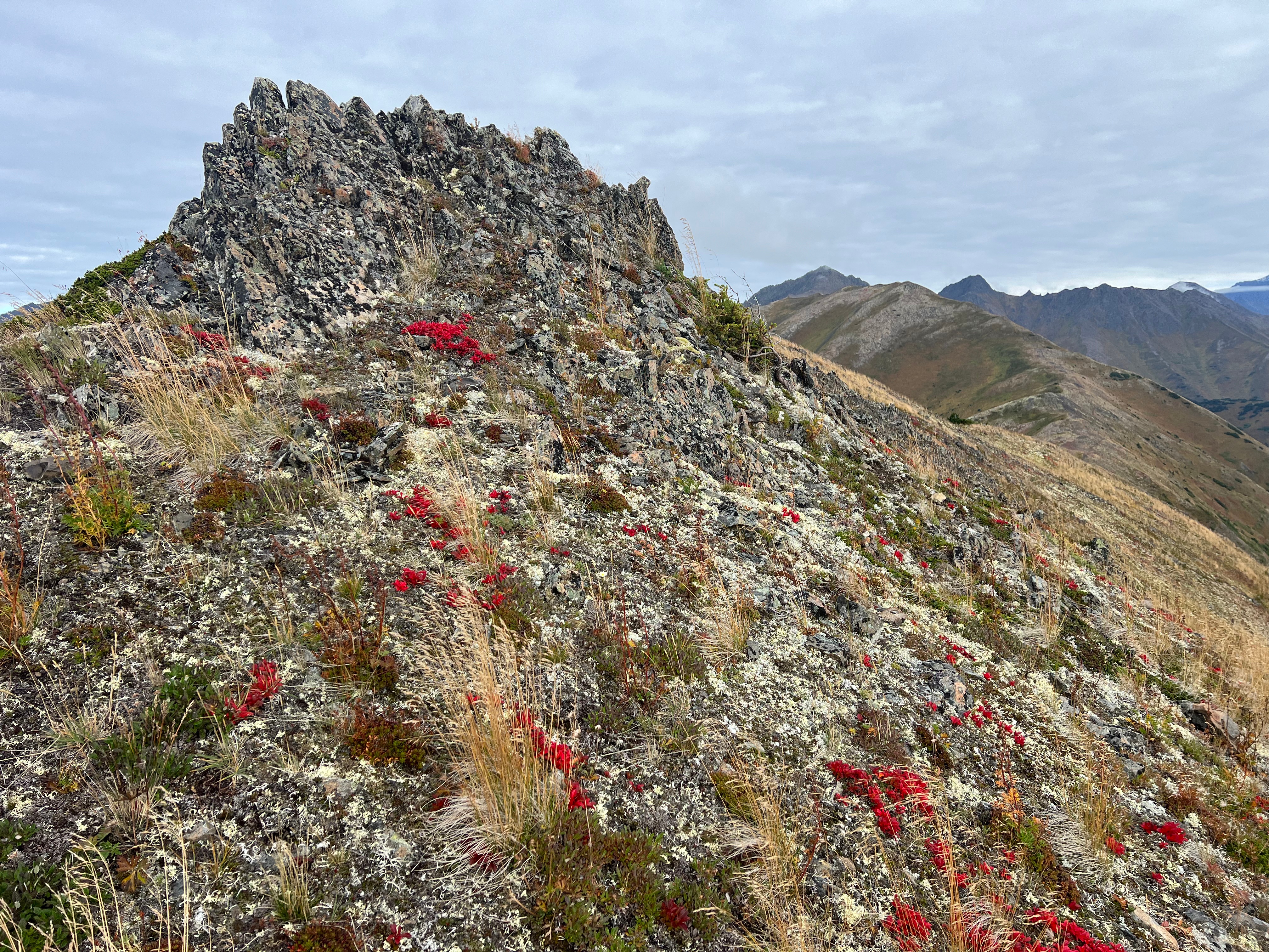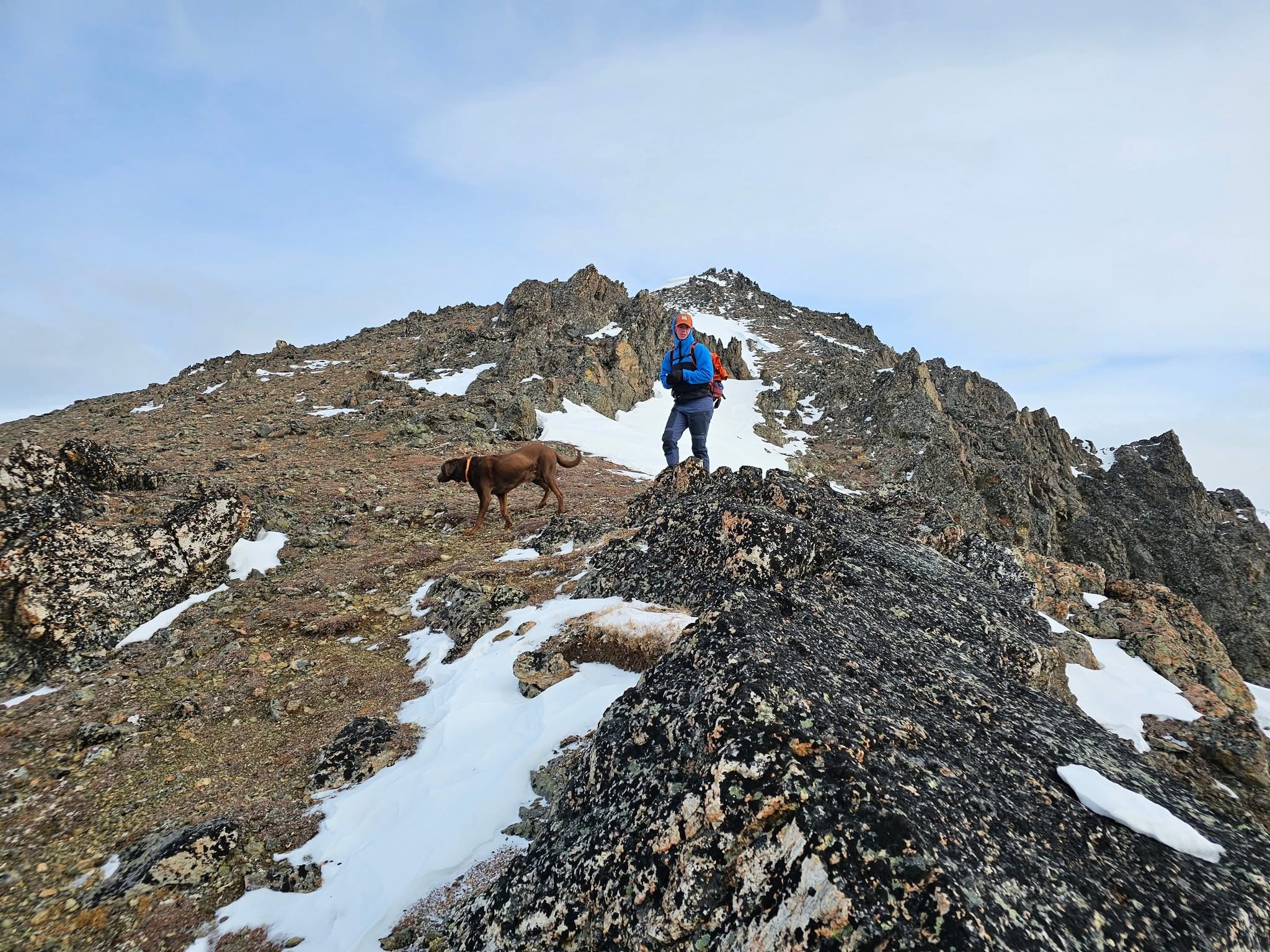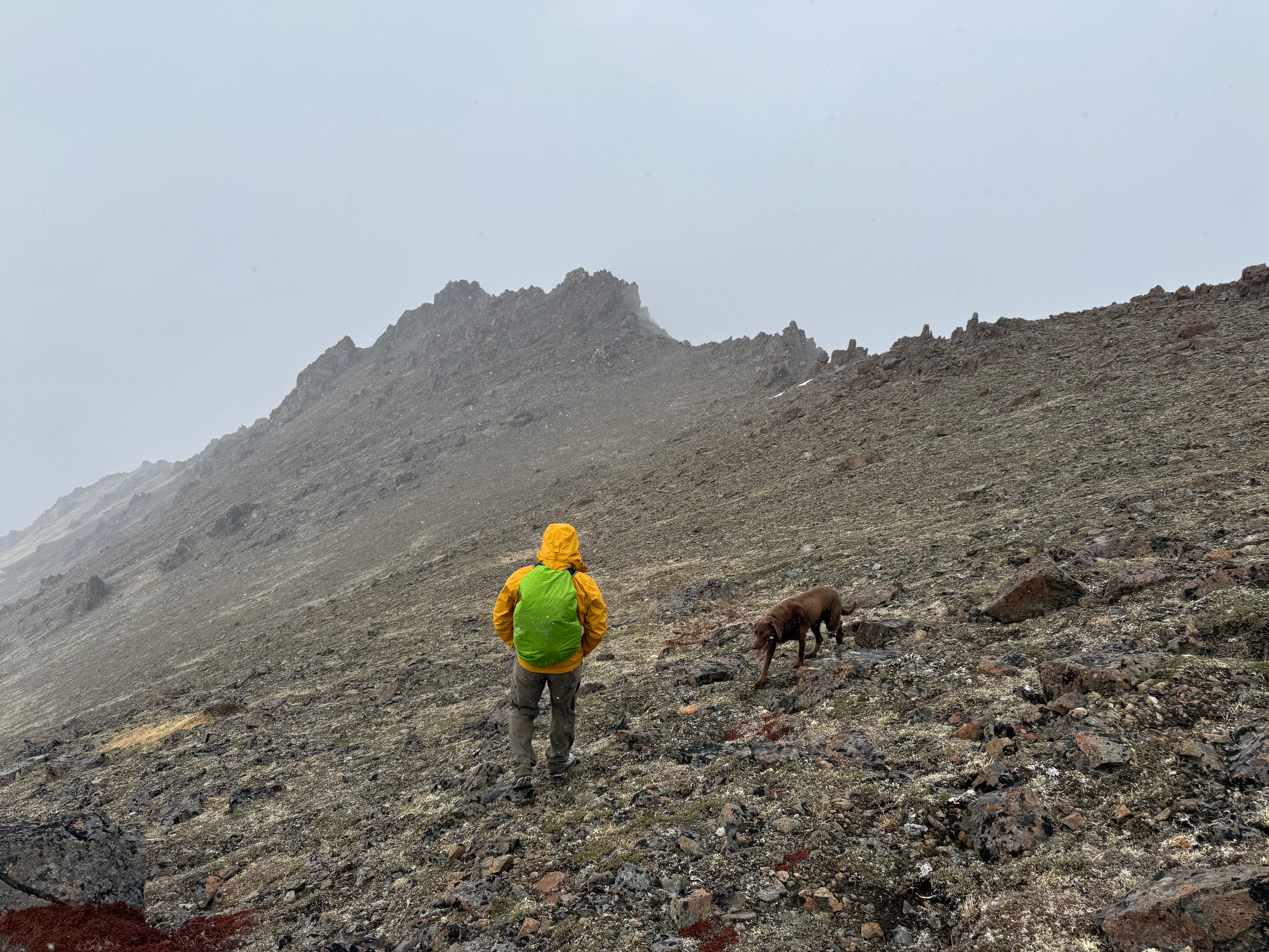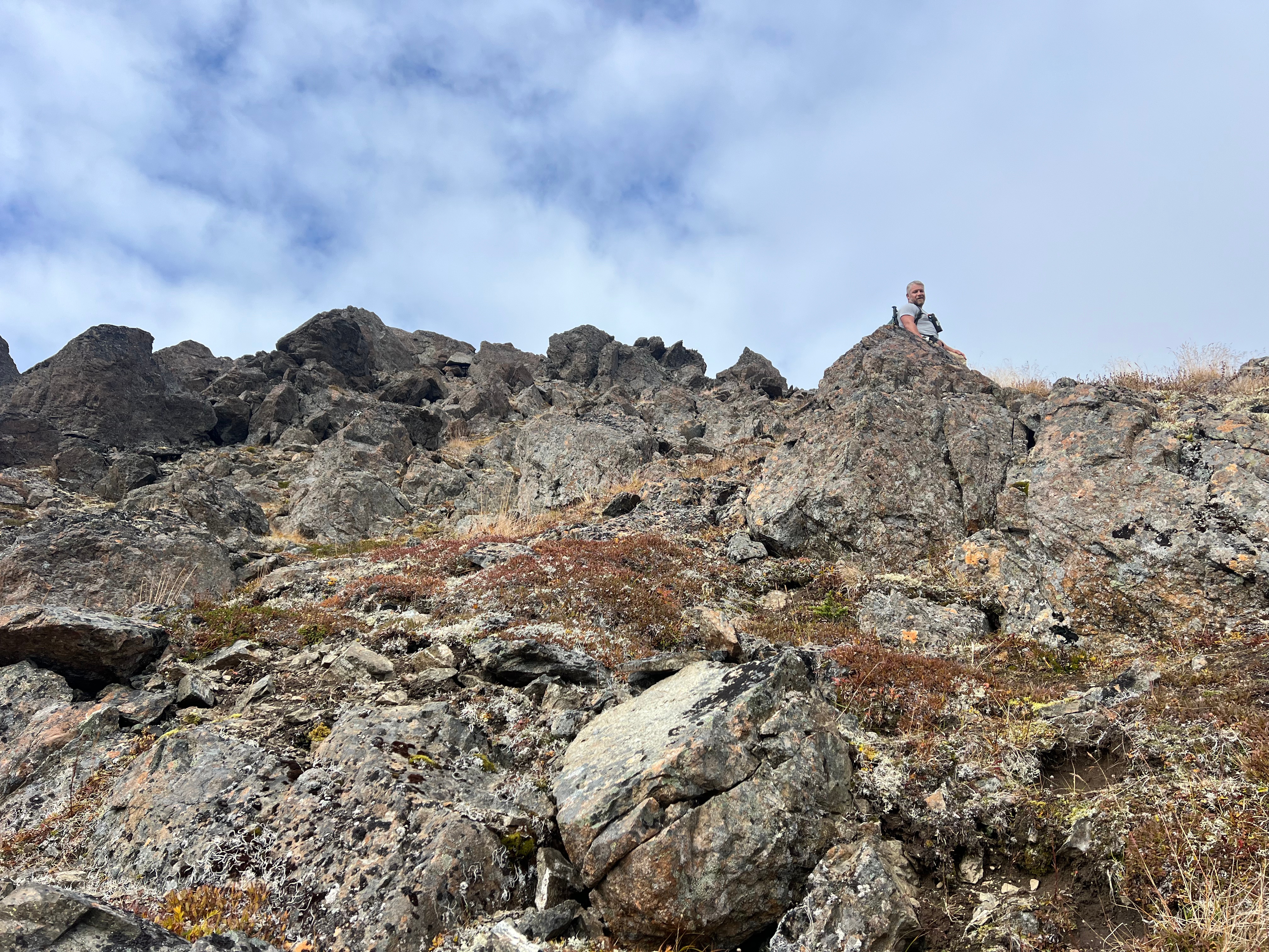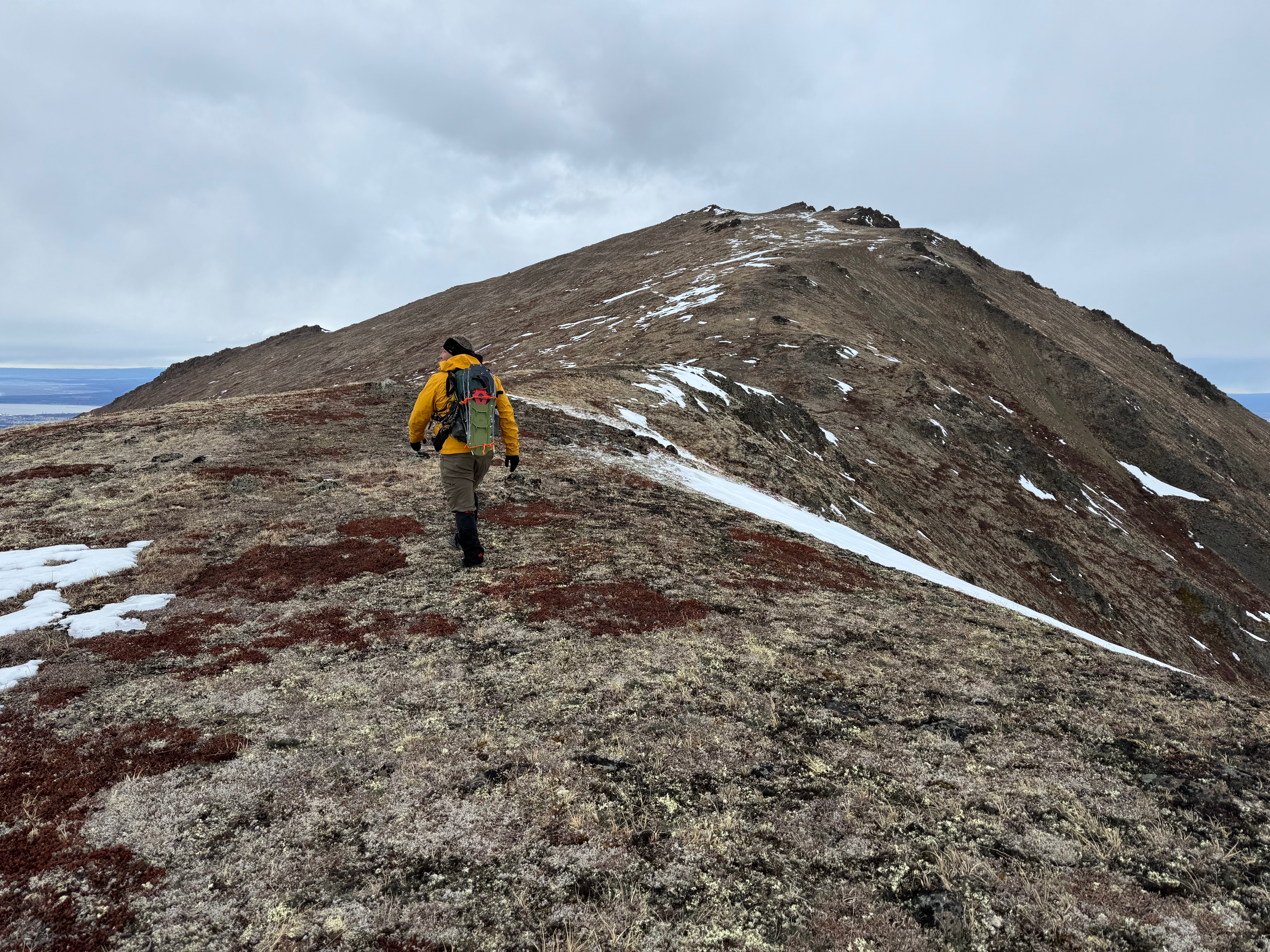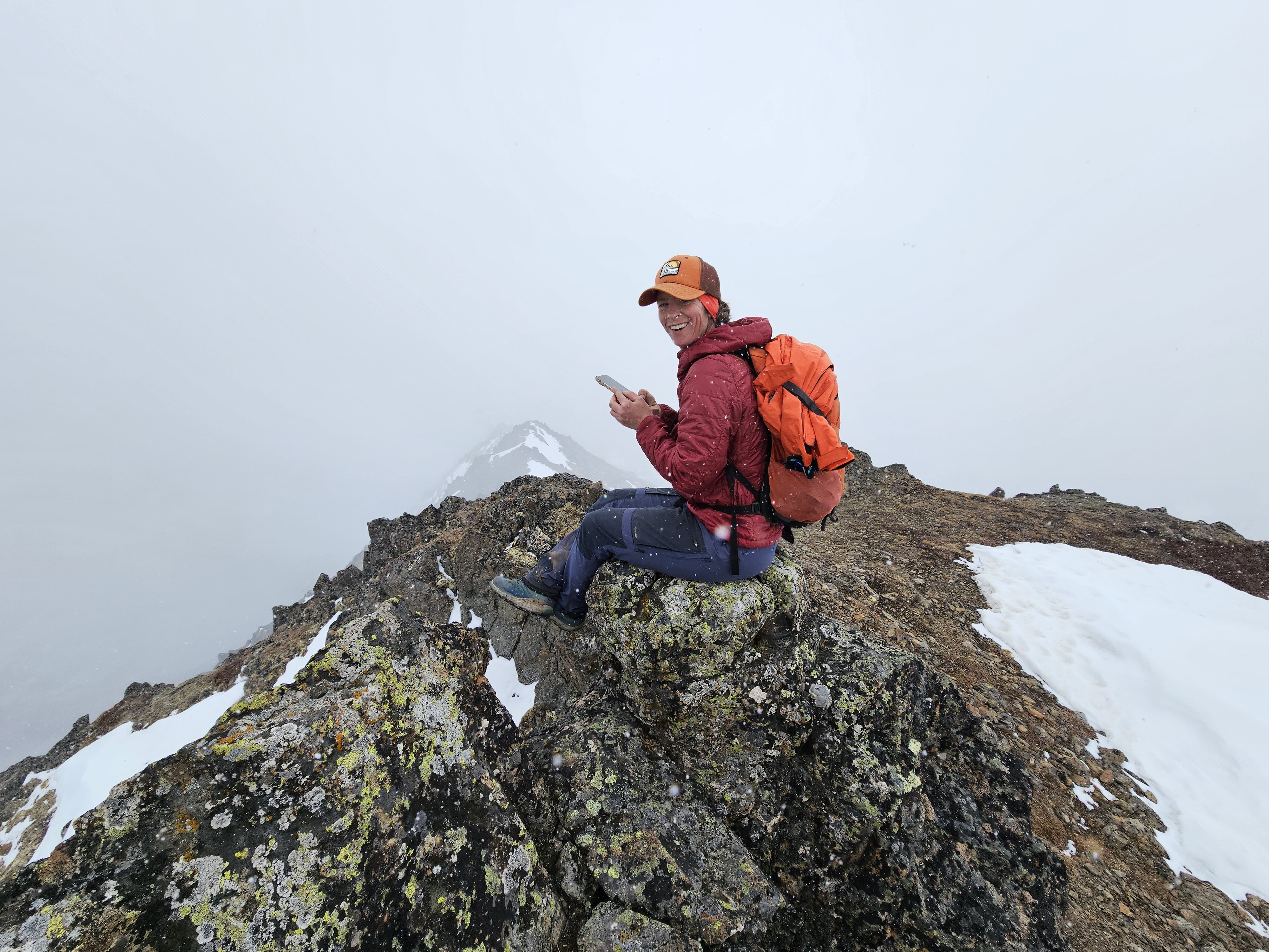 A solitary ptarmigan perched on a boulder welcomed us to the top of The Dome, where we paused for a quick bite before continuing up the ridge toward Knoya. The low ceiling of clouds persisted as we ascended the jagged ridge. From a distance, the ridgeline looks deceptively daunting, but once you’re on it, the walking is fairly straightforward with no scrambling required.