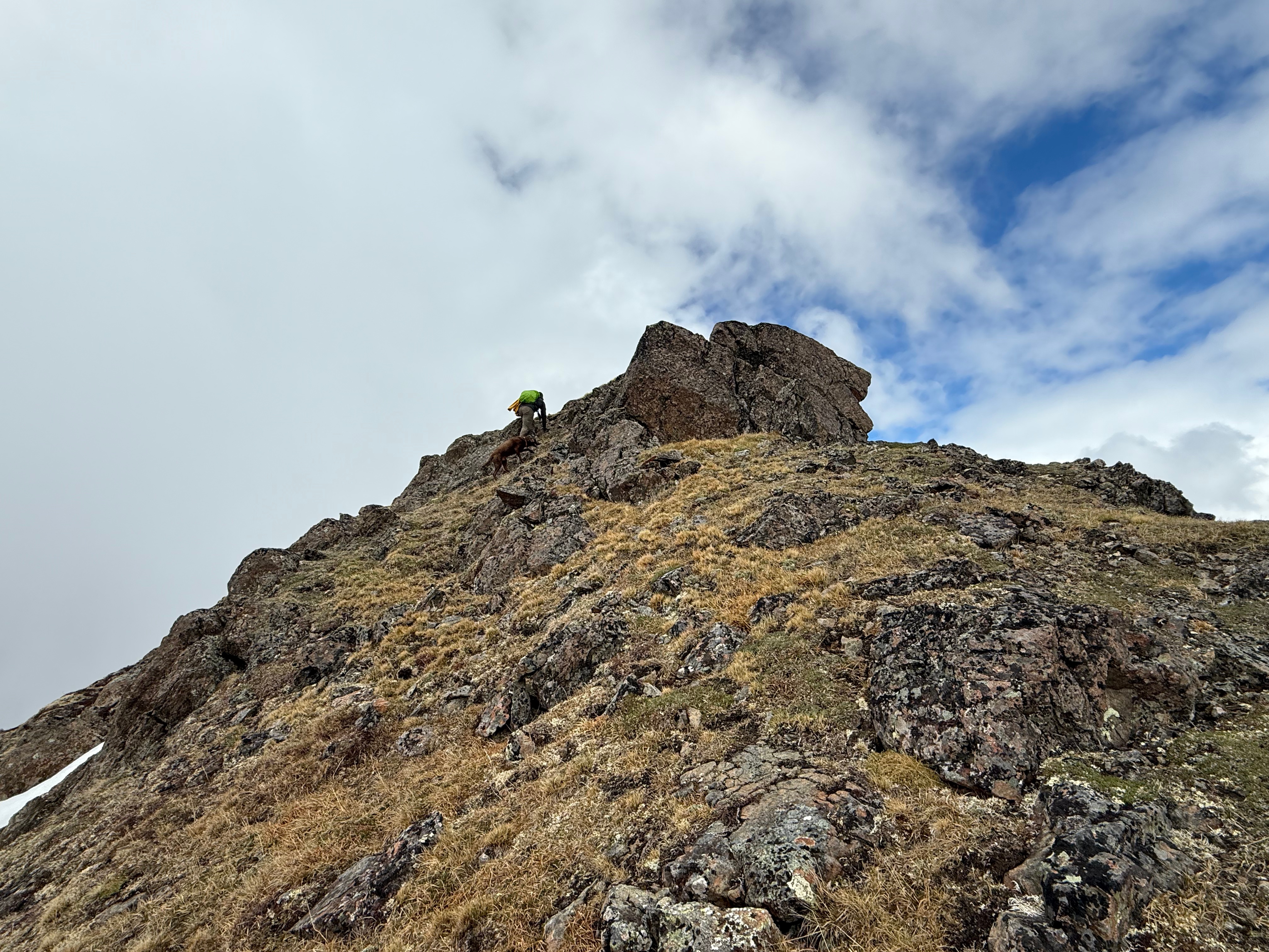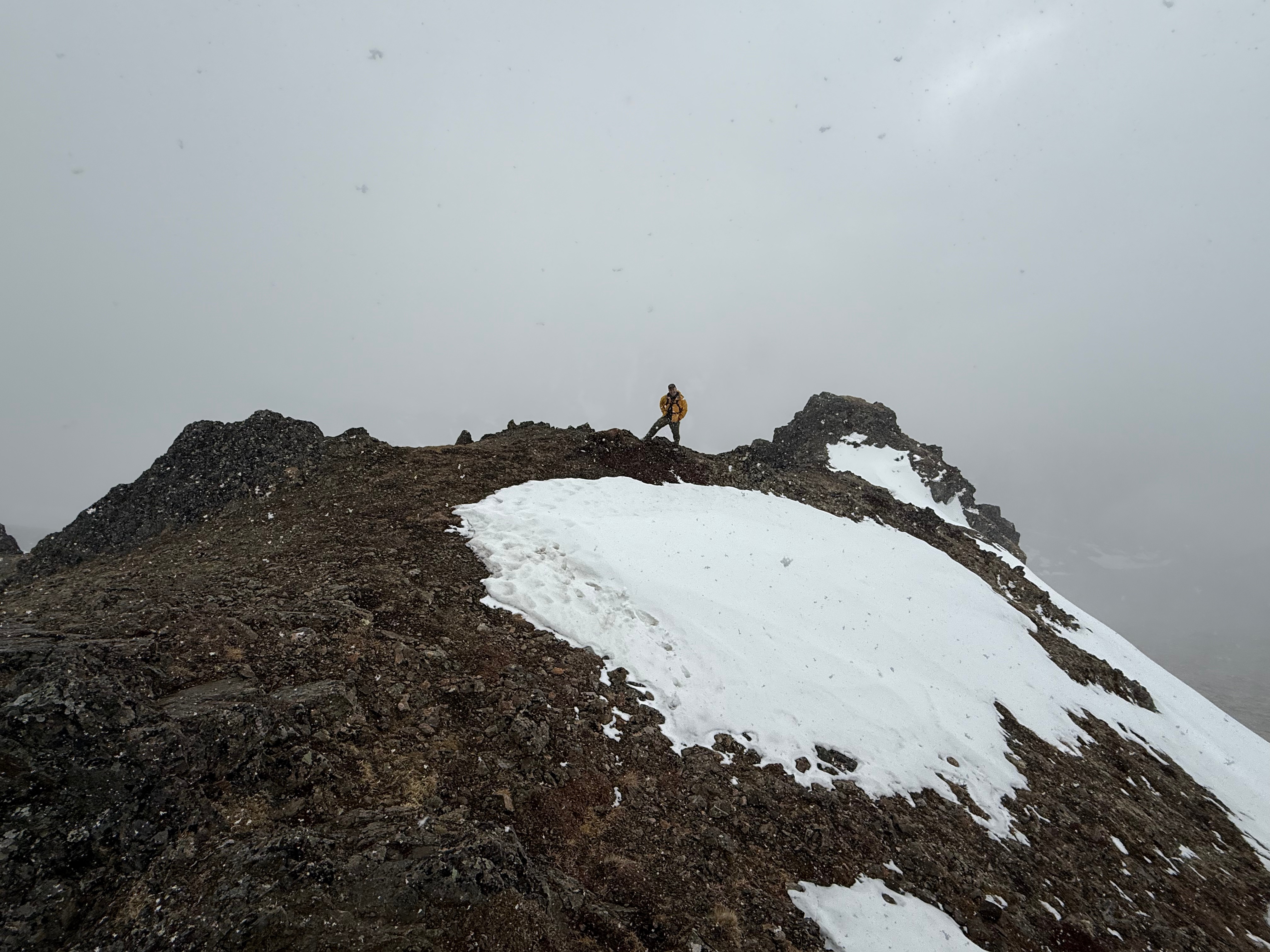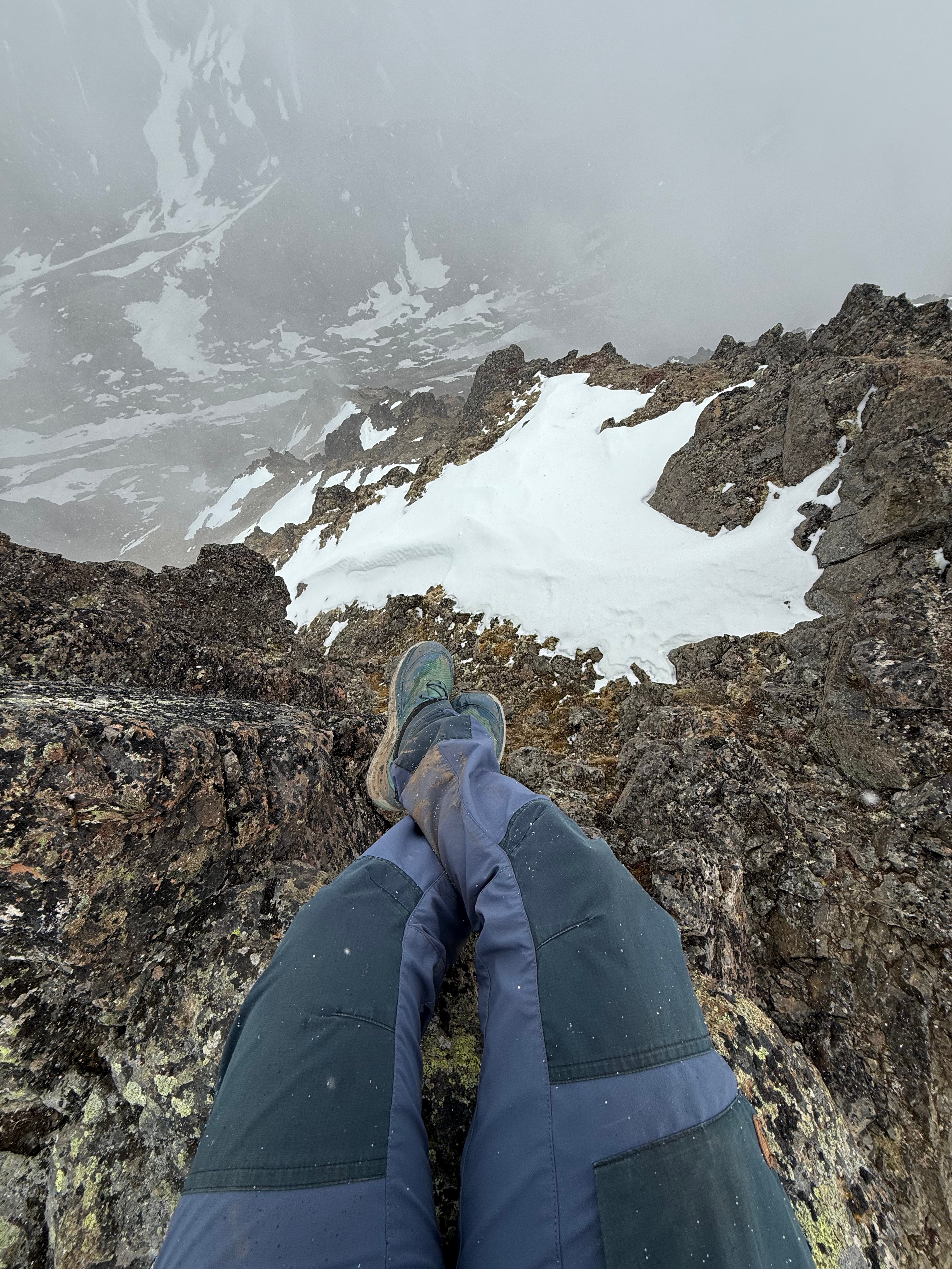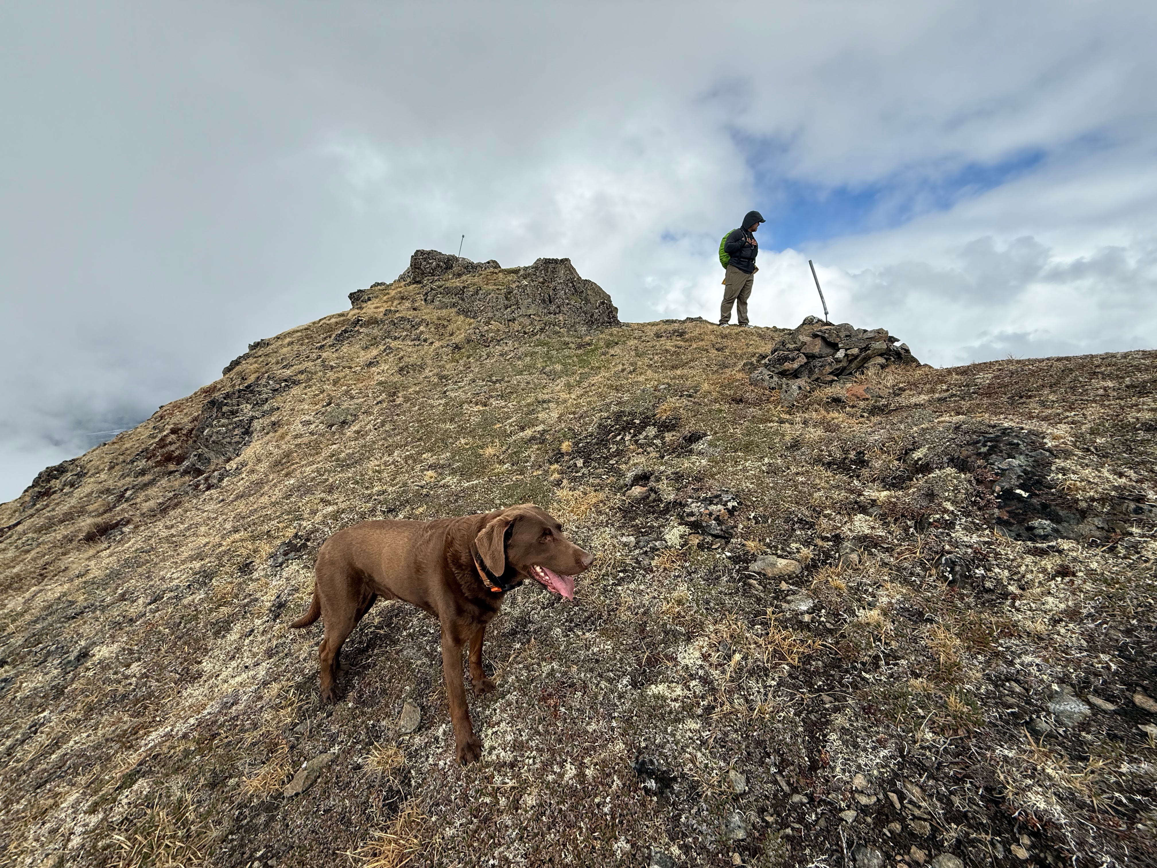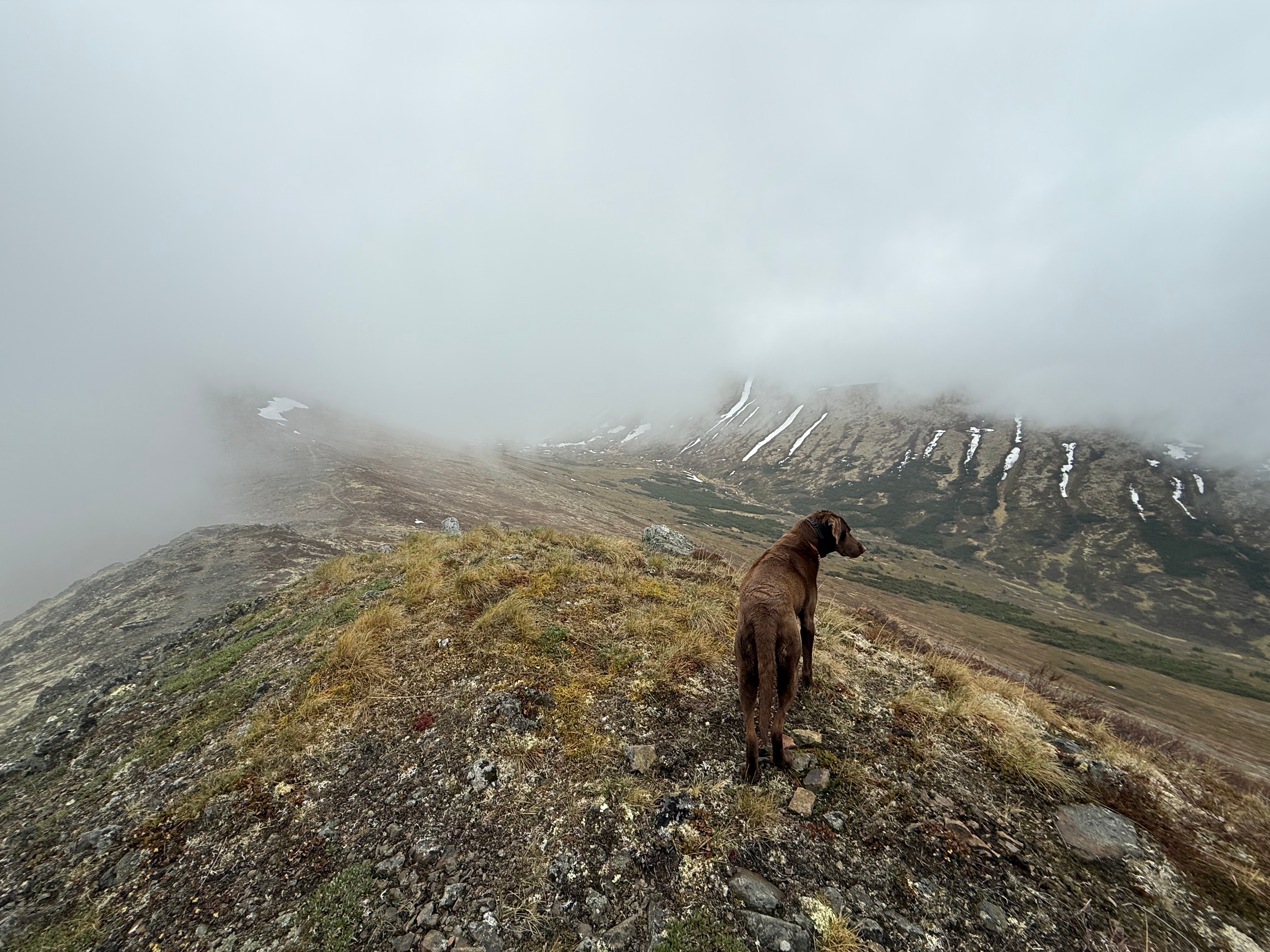 A solitary ptarmigan perched on a boulder welcomed us to the top of The Dome, where we paused for a quick bite before continuing up the ridge toward Knoya. The low ceiling of clouds persisted as we ascended the jagged ridge. From a distance, the ridgeline looks deceptively daunting, but once you’re on it, the walking is fairly straightforward with no scrambling required.