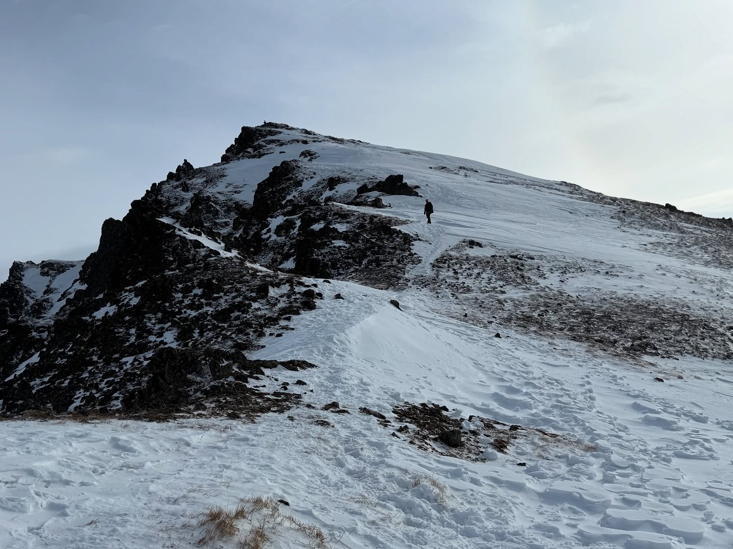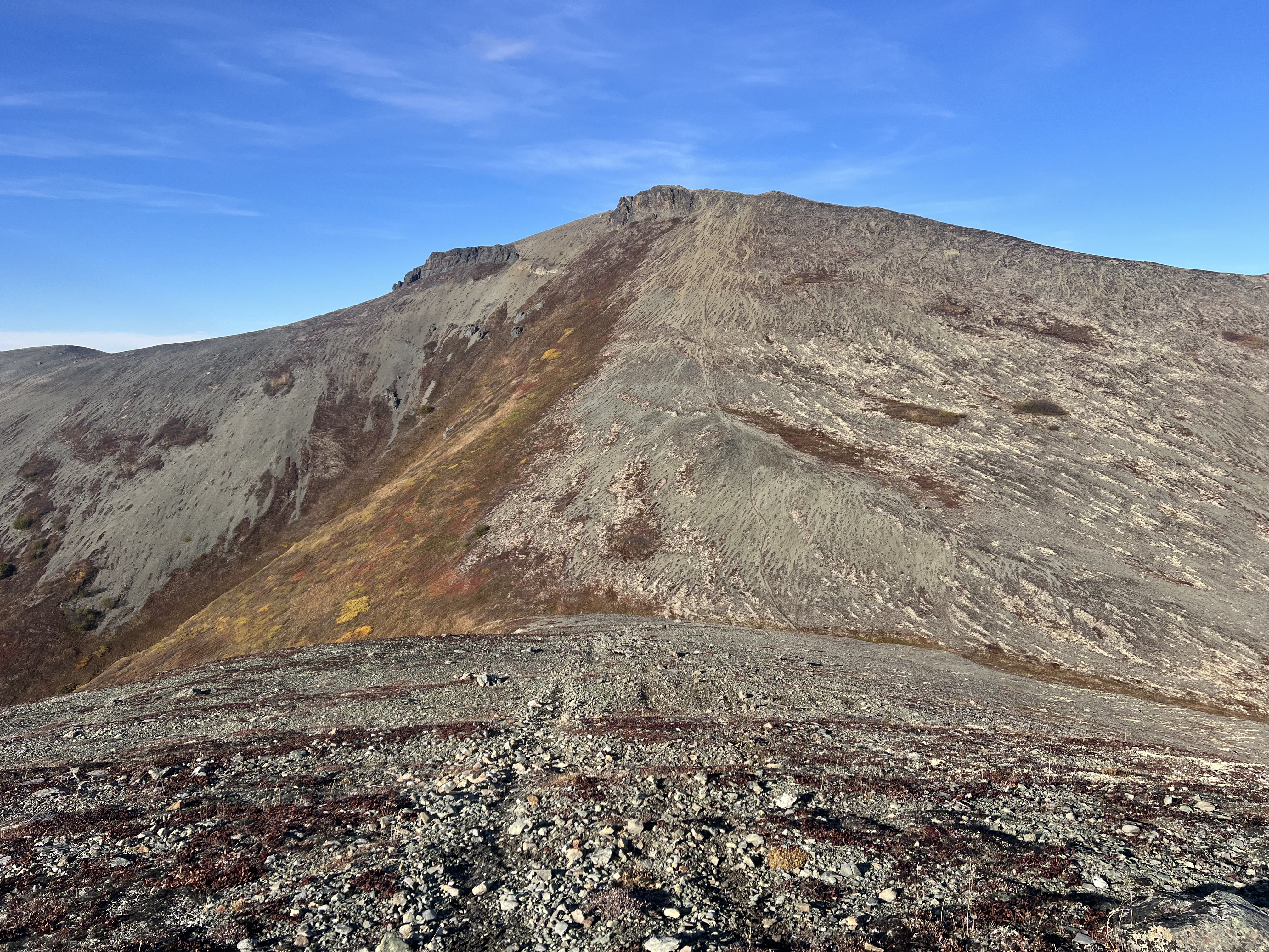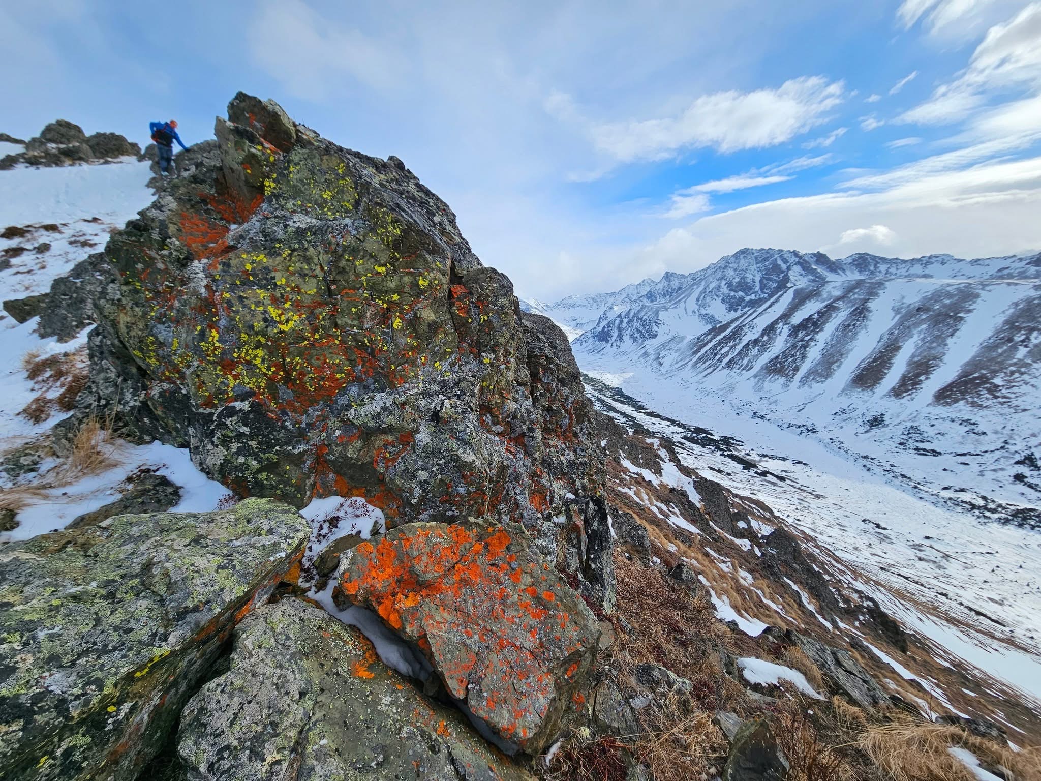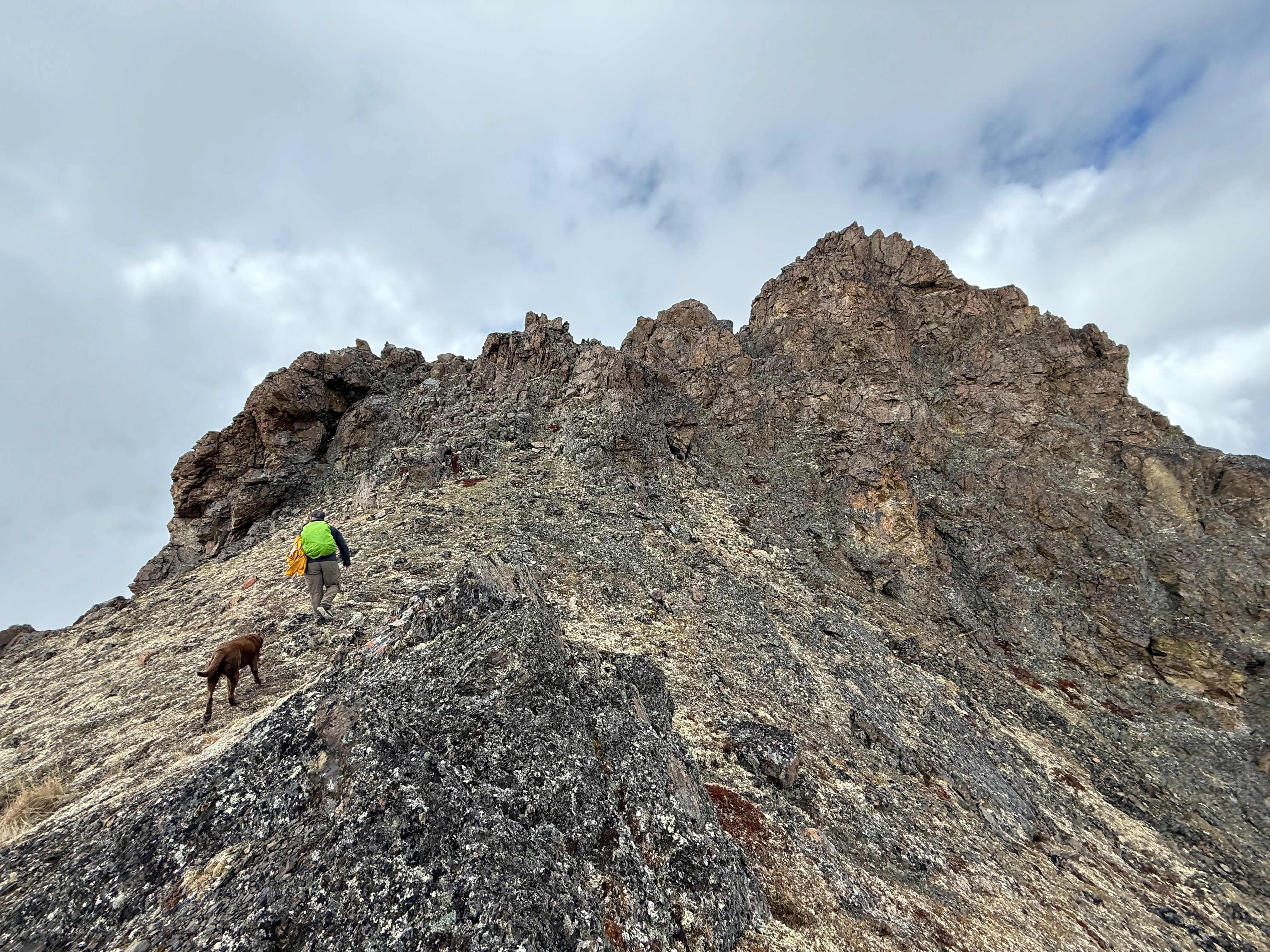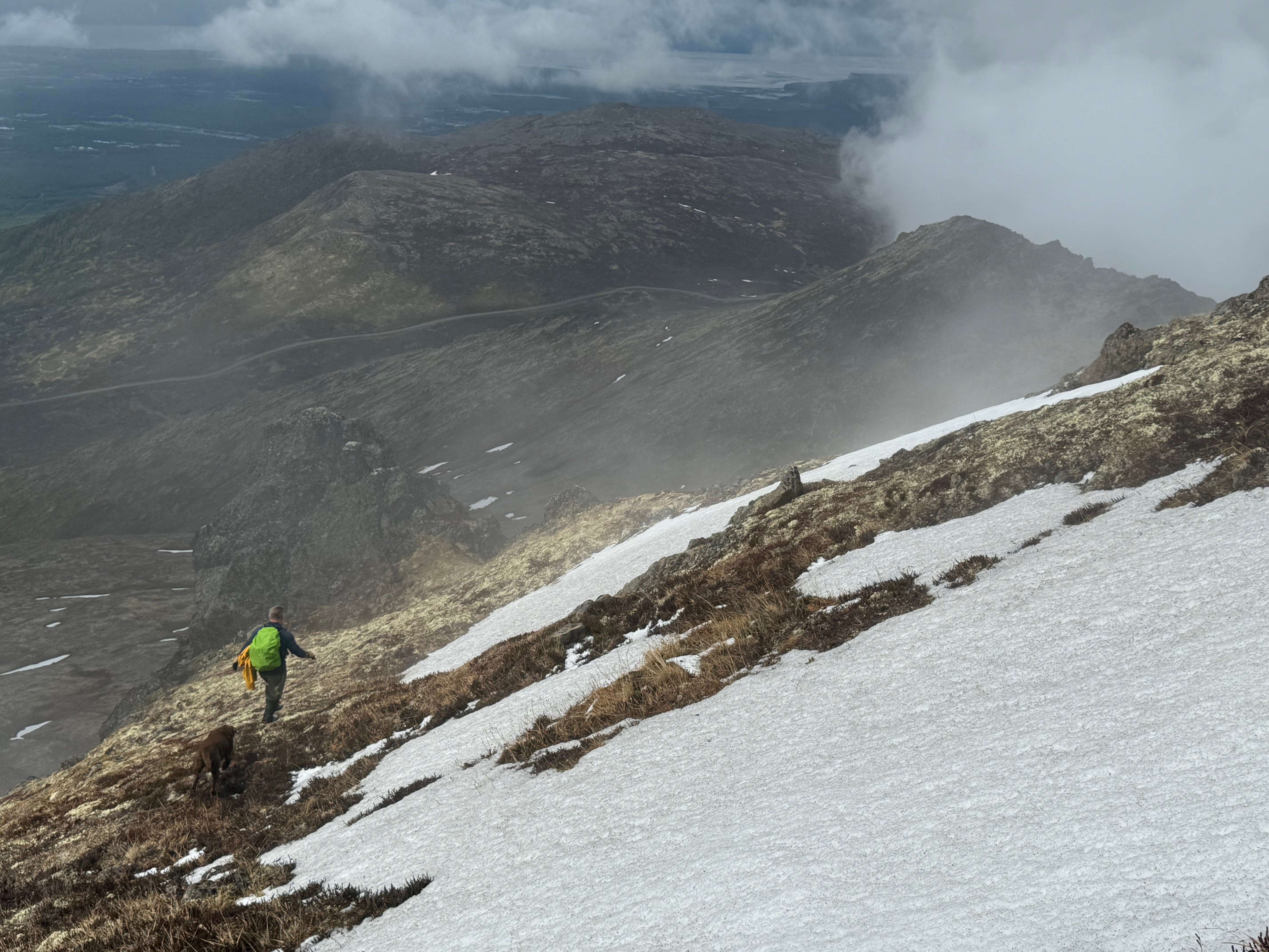 A solitary ptarmigan perched on a boulder welcomed us to the top of The Dome, where we paused for a quick bite before continuing up the ridge toward Knoya. The low ceiling of clouds persisted as we ascended the jagged ridge. From a distance, the ridgeline looks deceptively daunting, but once you’re on it, the walking is fairly straightforward with no scrambling required.