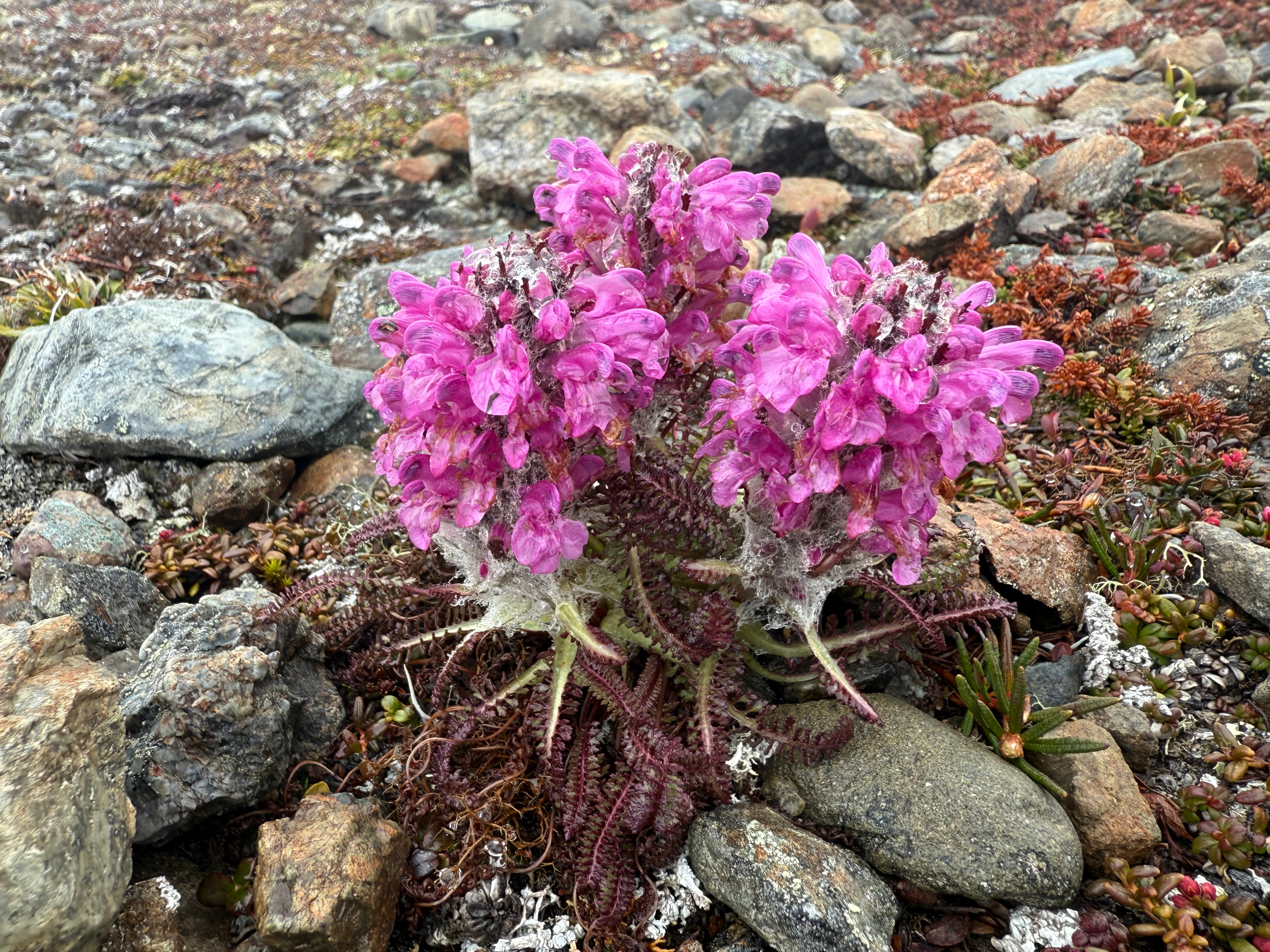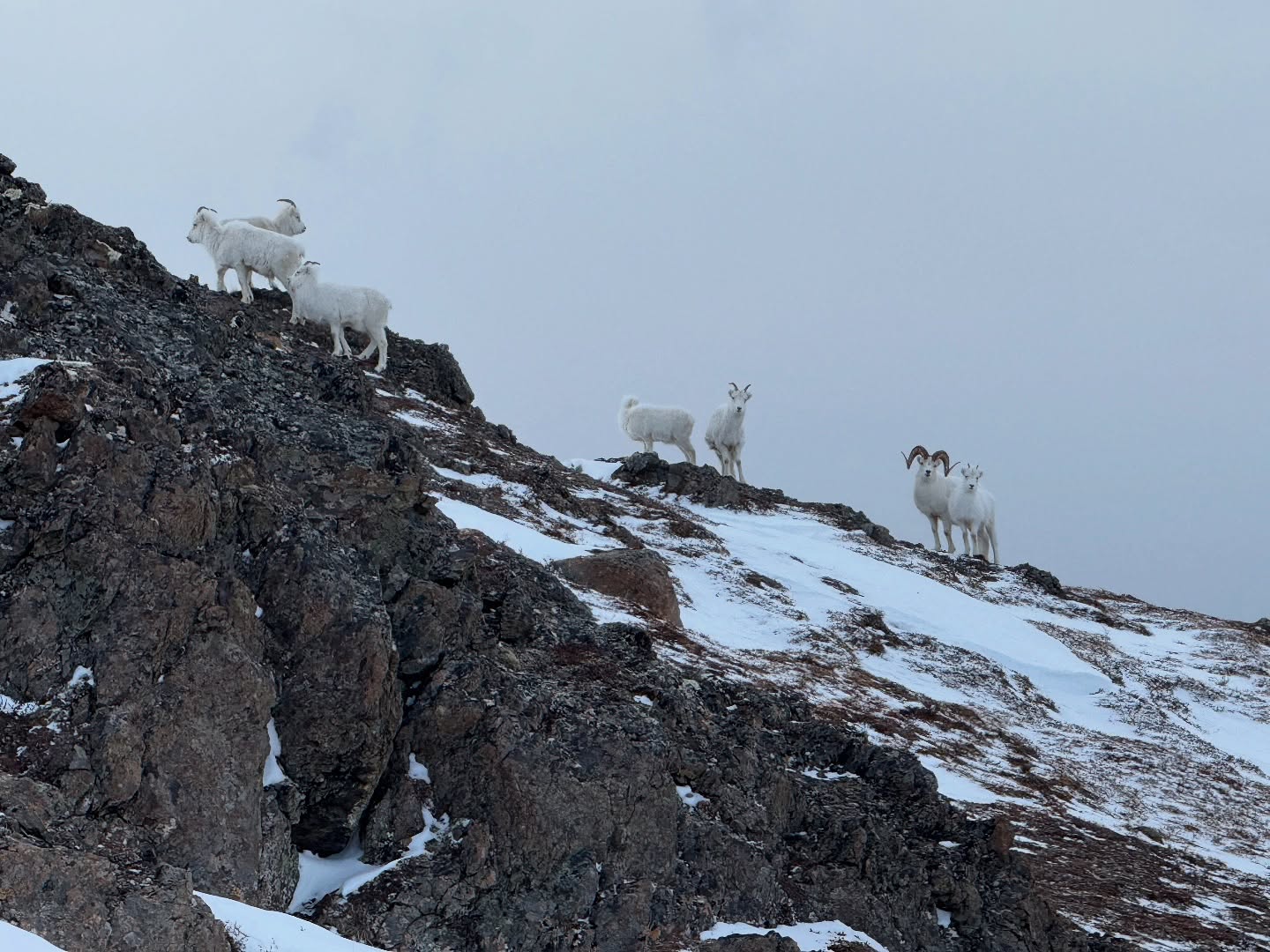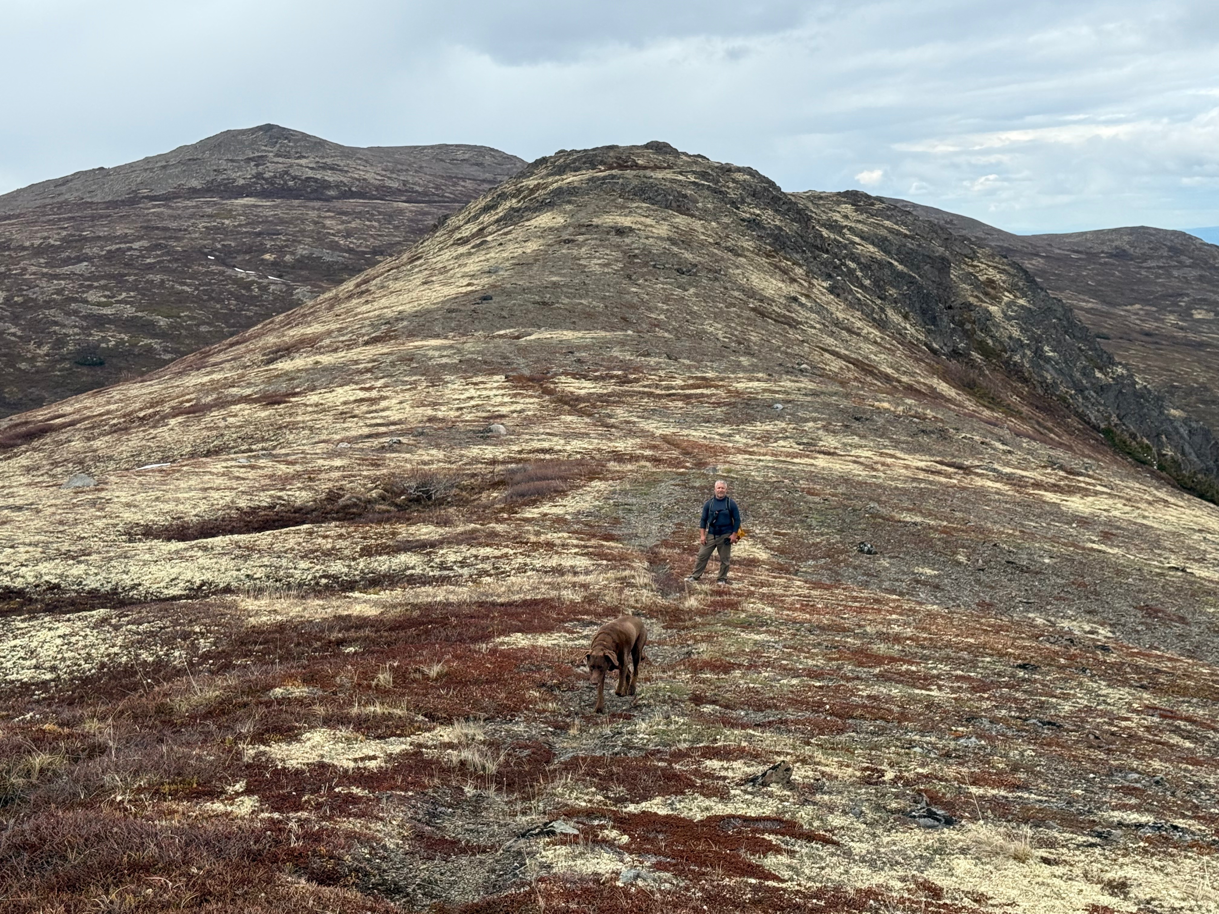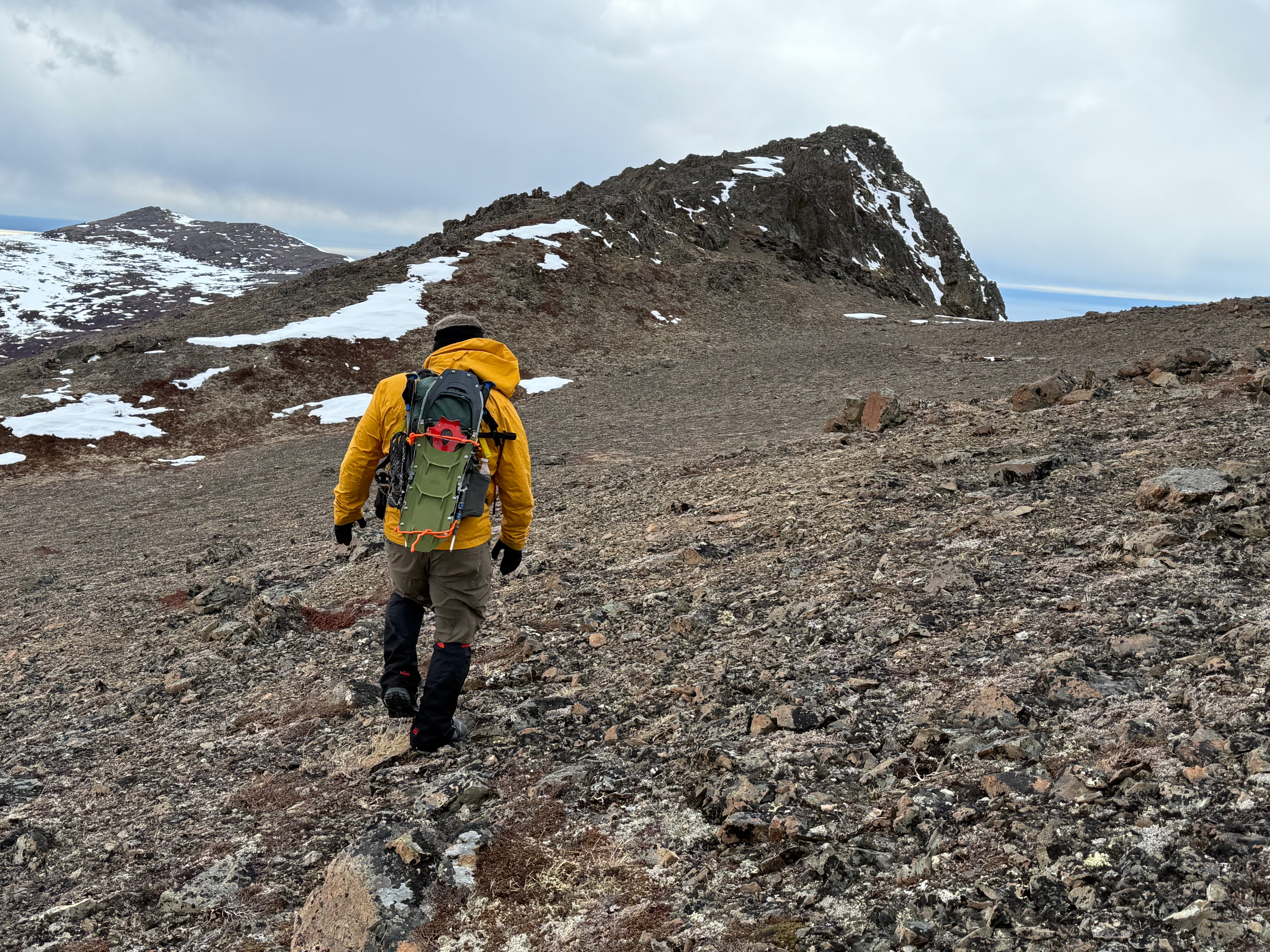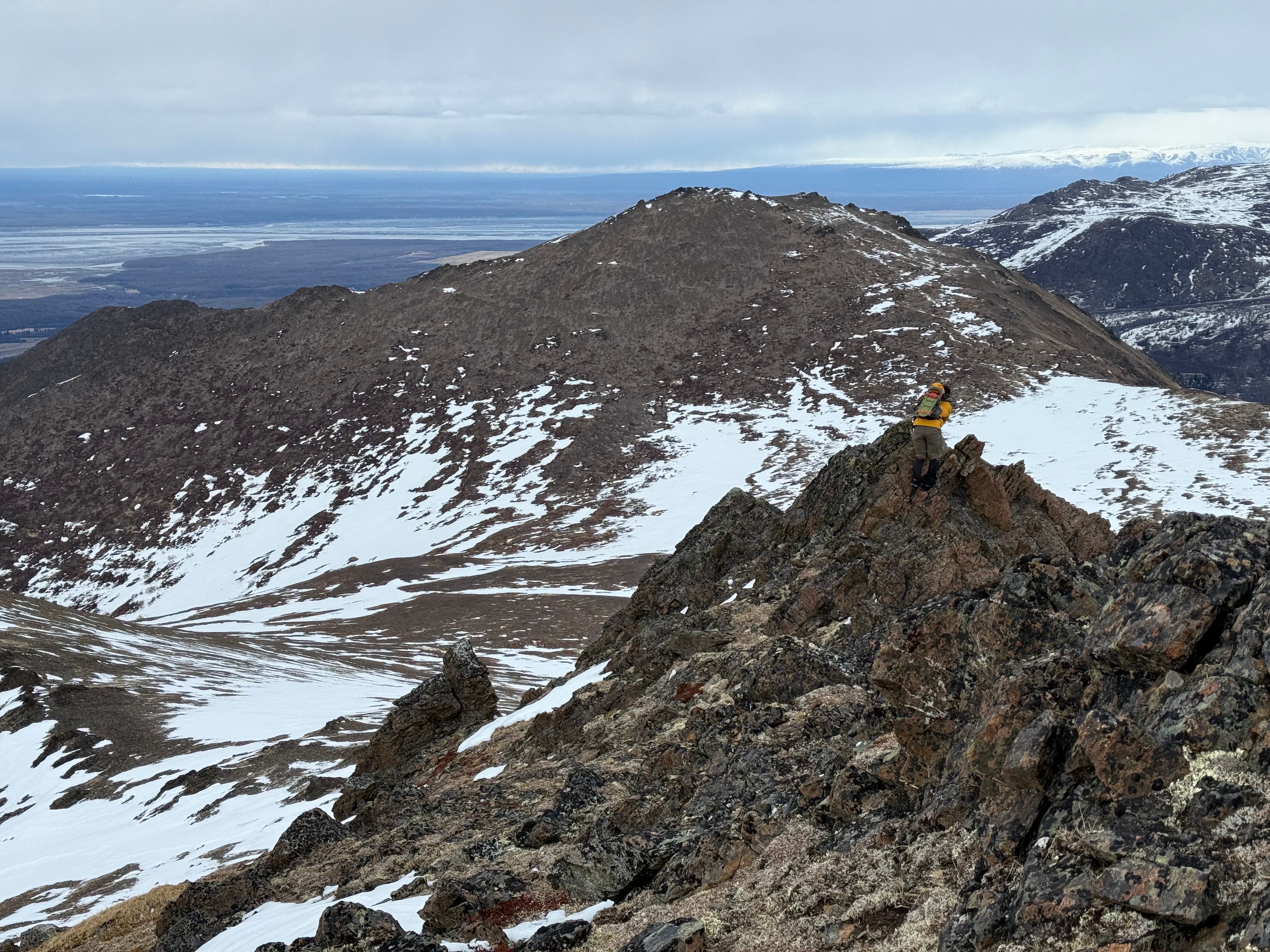 A solitary ptarmigan perched on a boulder welcomed us to the top of The Dome, where we paused for a quick bite before continuing up the ridge toward Knoya. The low ceiling of clouds persisted as we ascended the jagged ridge. From a distance, the ridgeline looks deceptively daunting, but once you’re on it, the walking is fairly straightforward with no scrambling required.