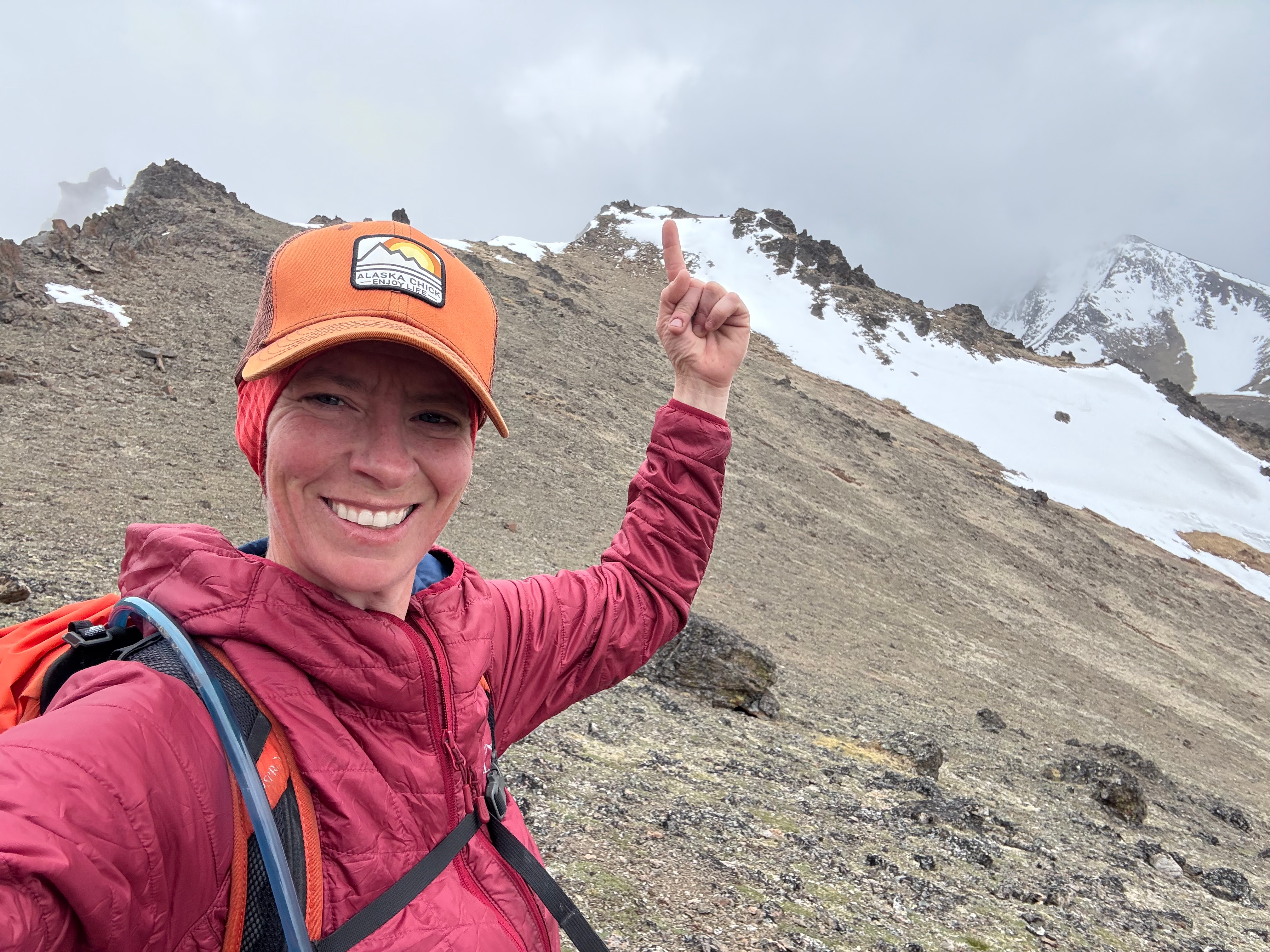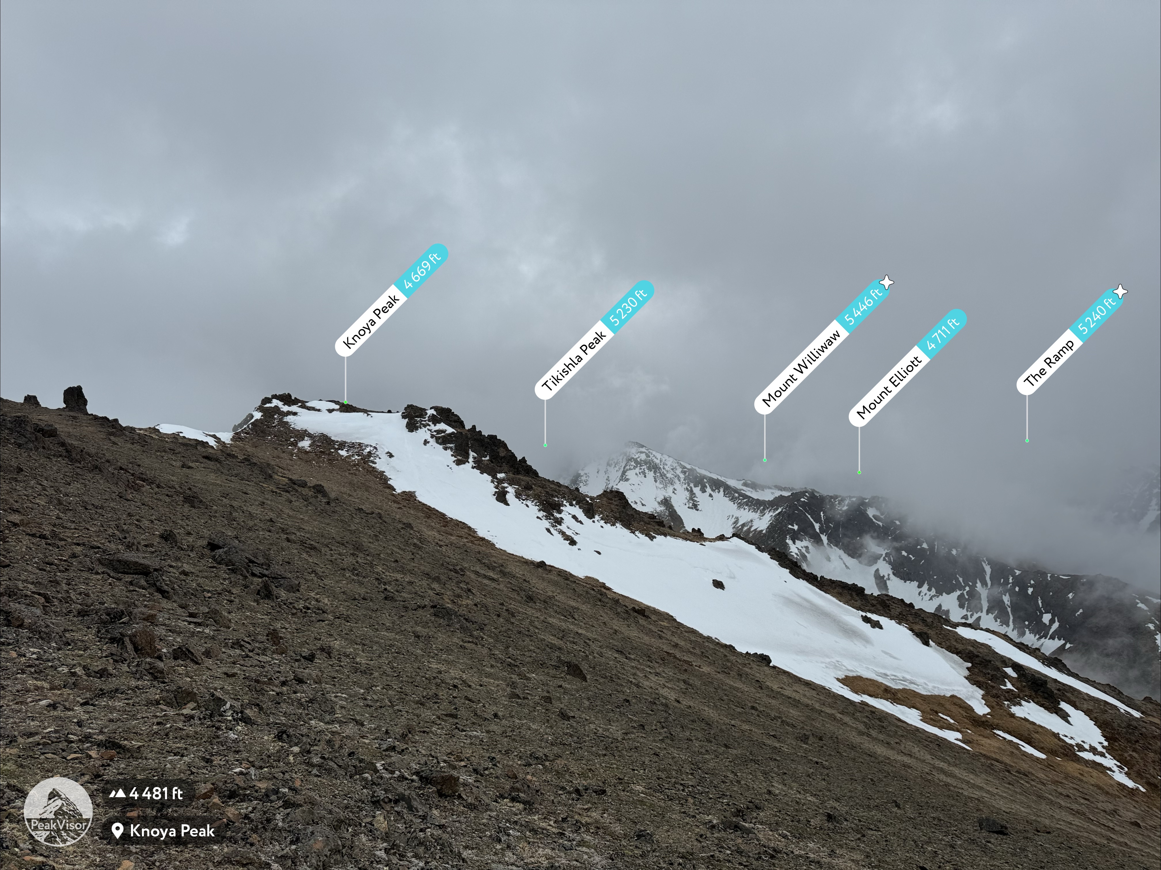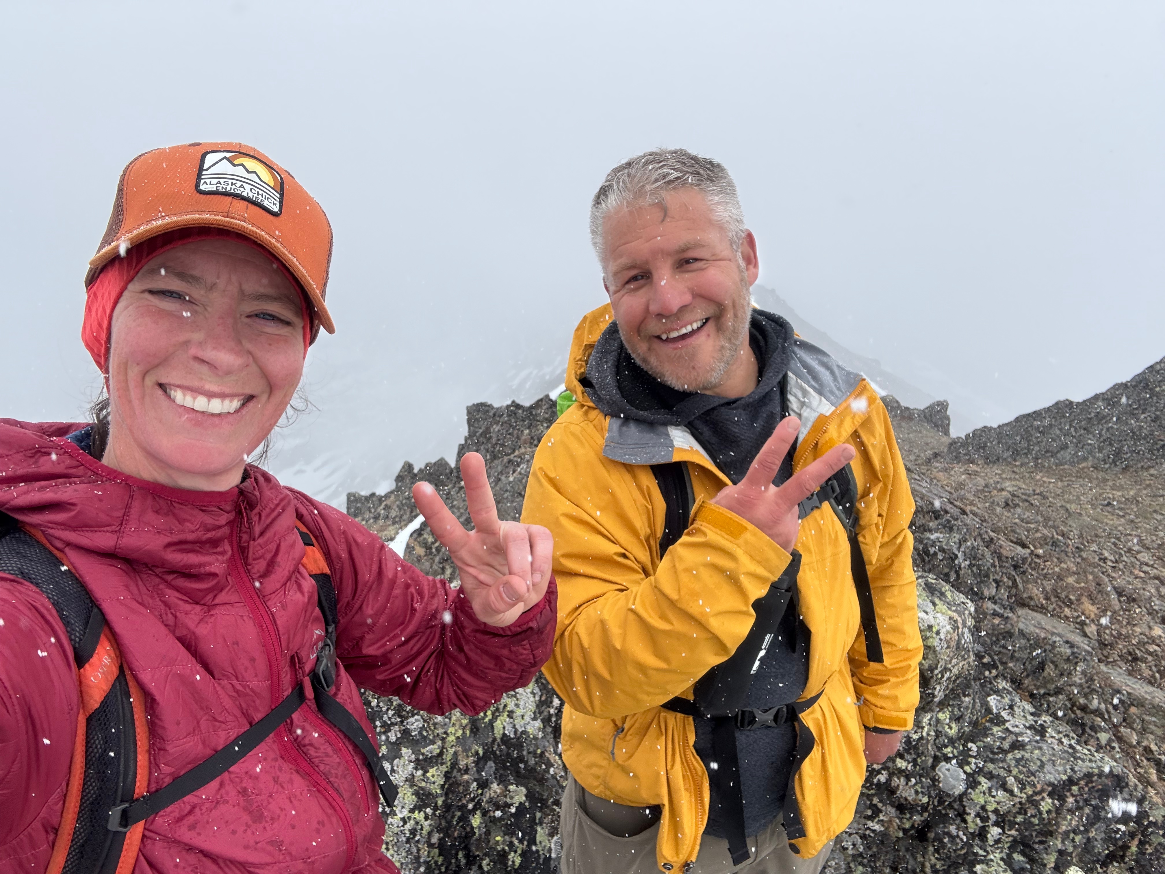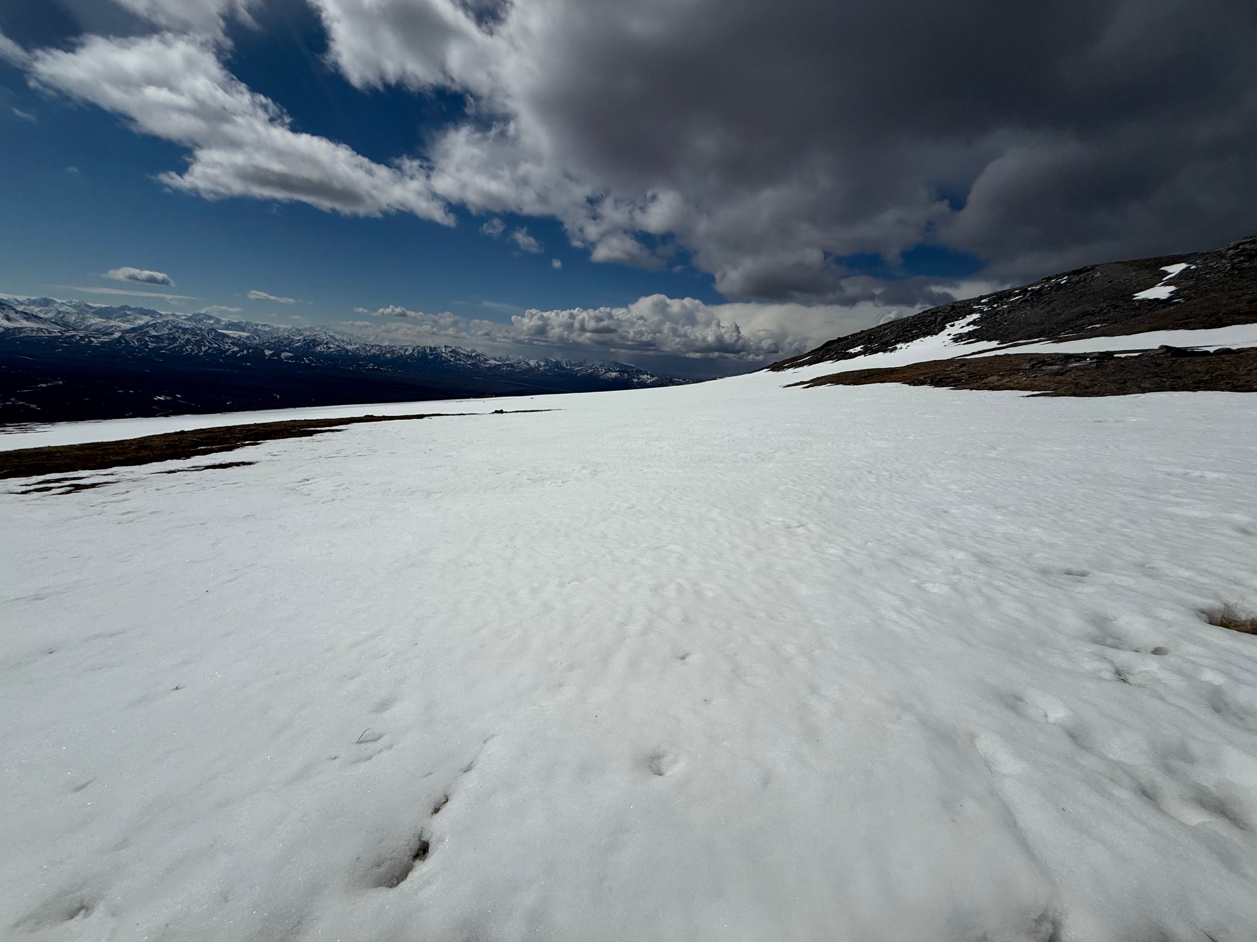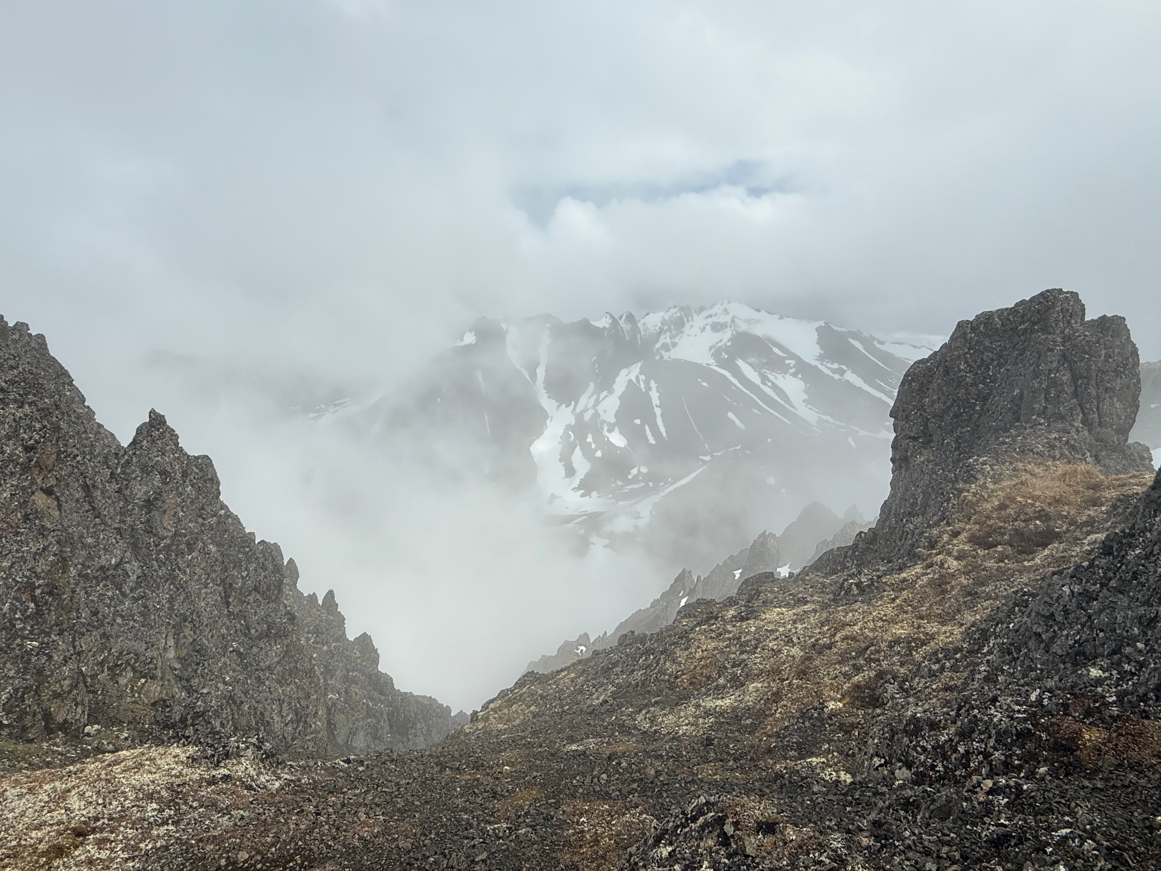 Knoya’s actual summit came into view less than a quarter mile to the east, at the far end of the south-facing slope. Tikishla and the surrounding peaks were still hidden in clouds, and as we stepped onto the summit, it began to snow—typical for late May or early June, and far more tolerable than the rain we’d started in.
