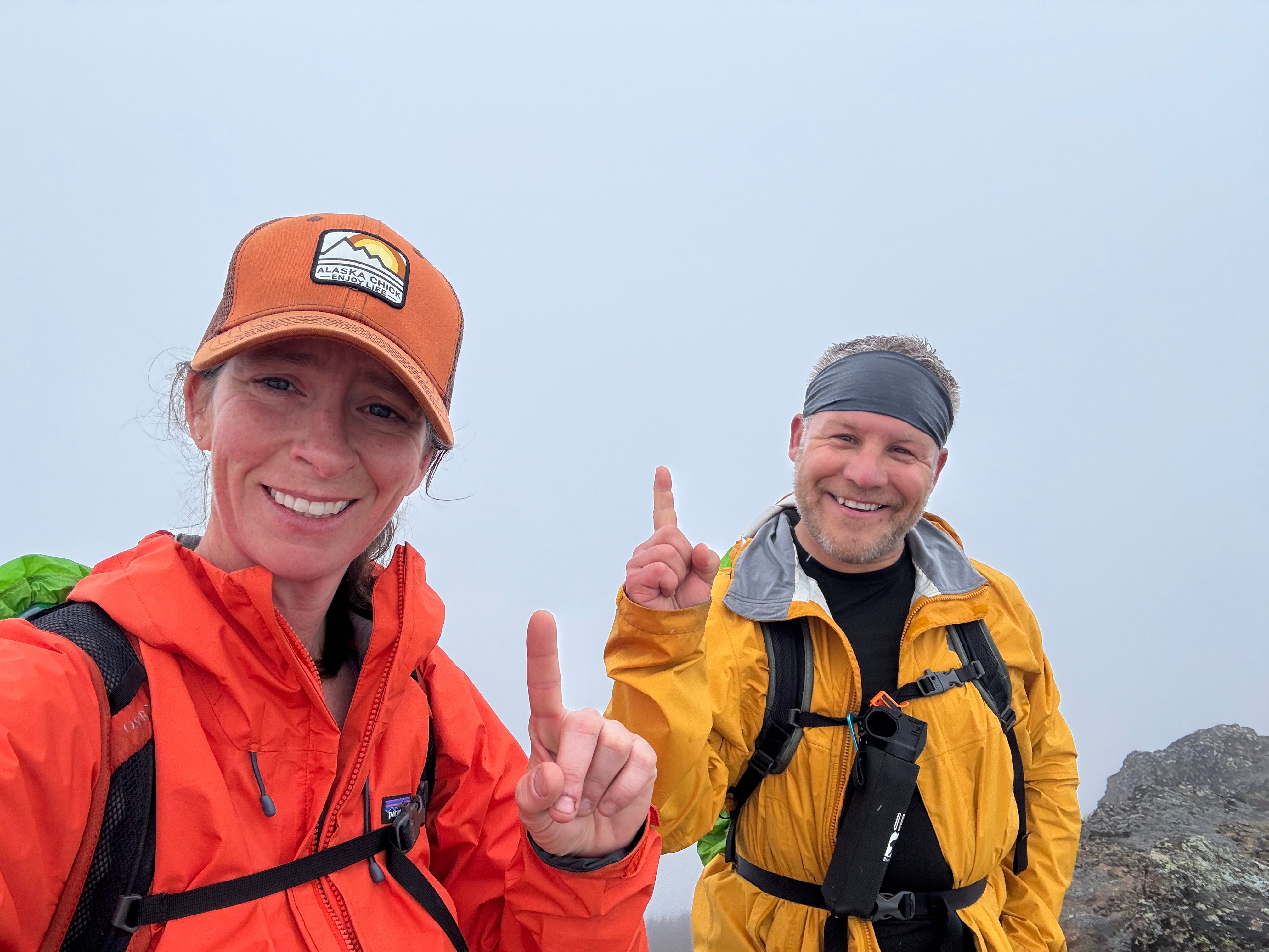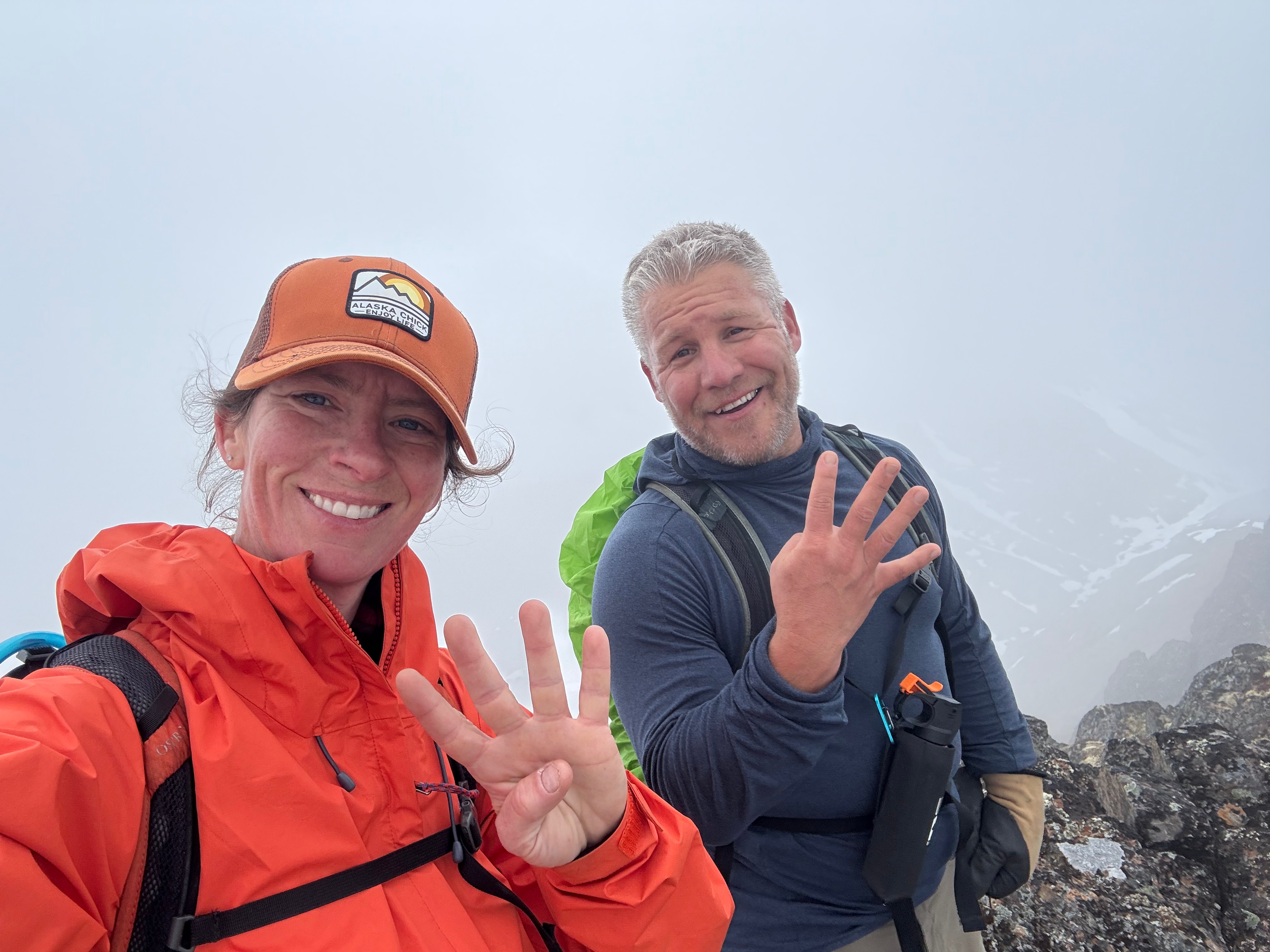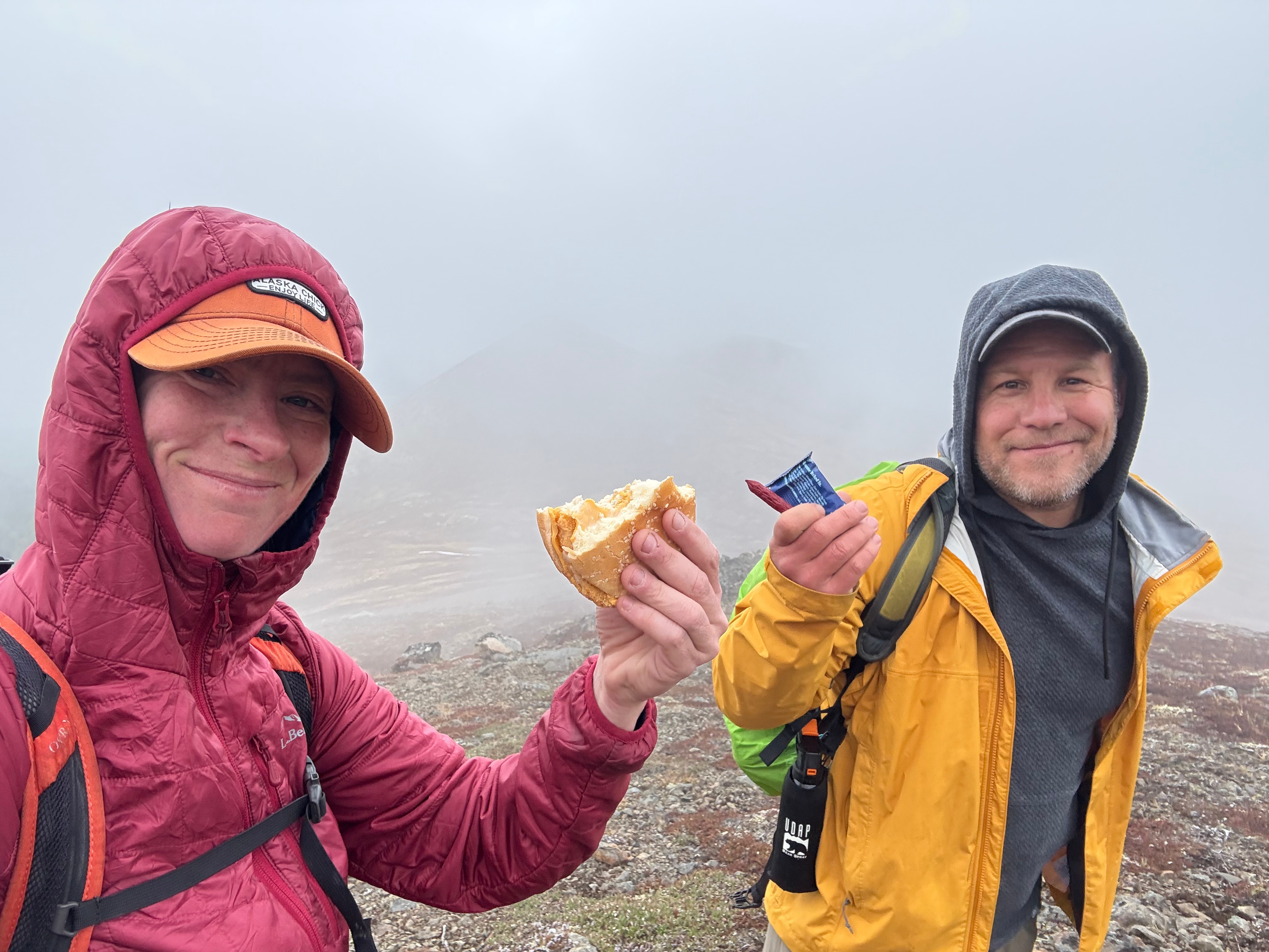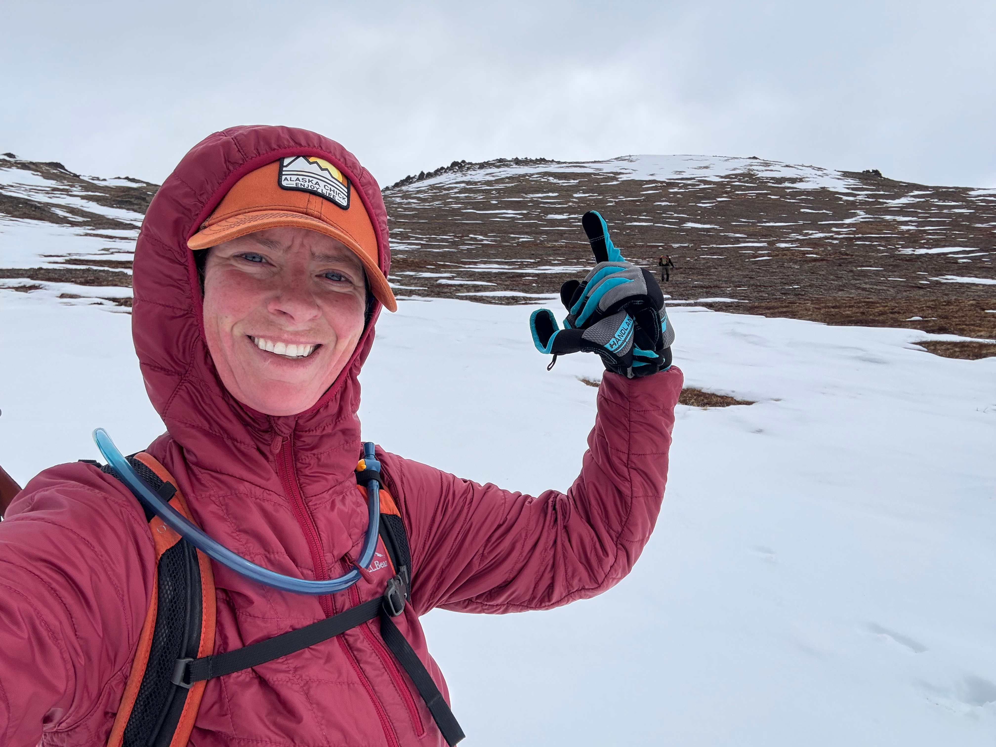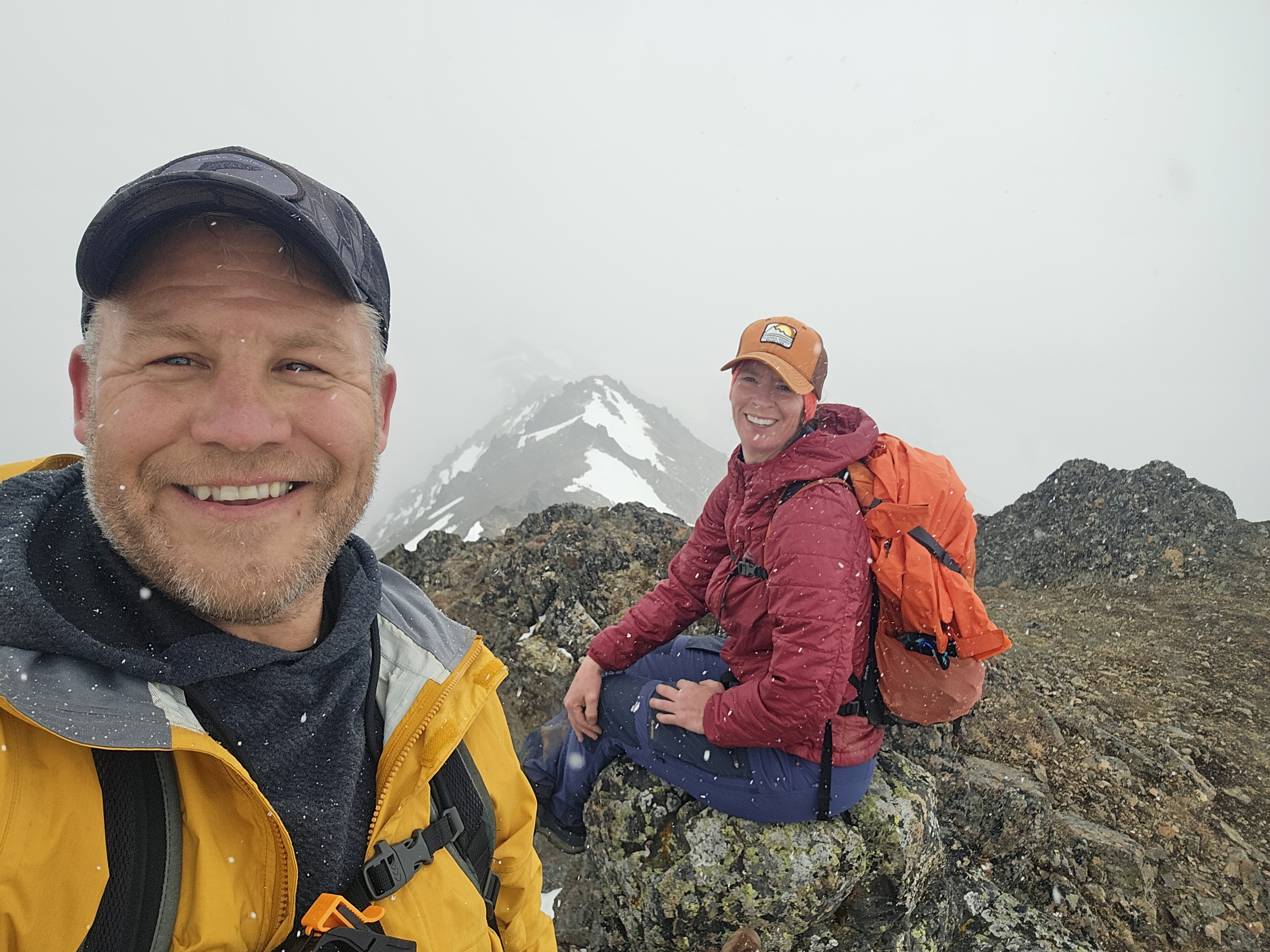 Knoya’s actual summit came into view less than a quarter mile to the east, at the far end of the south-facing slope. Tikishla and the surrounding peaks were still hidden in clouds, and as we stepped onto the summit, it began to snow—typical for late May or early June, and far more tolerable than the rain we’d started in.