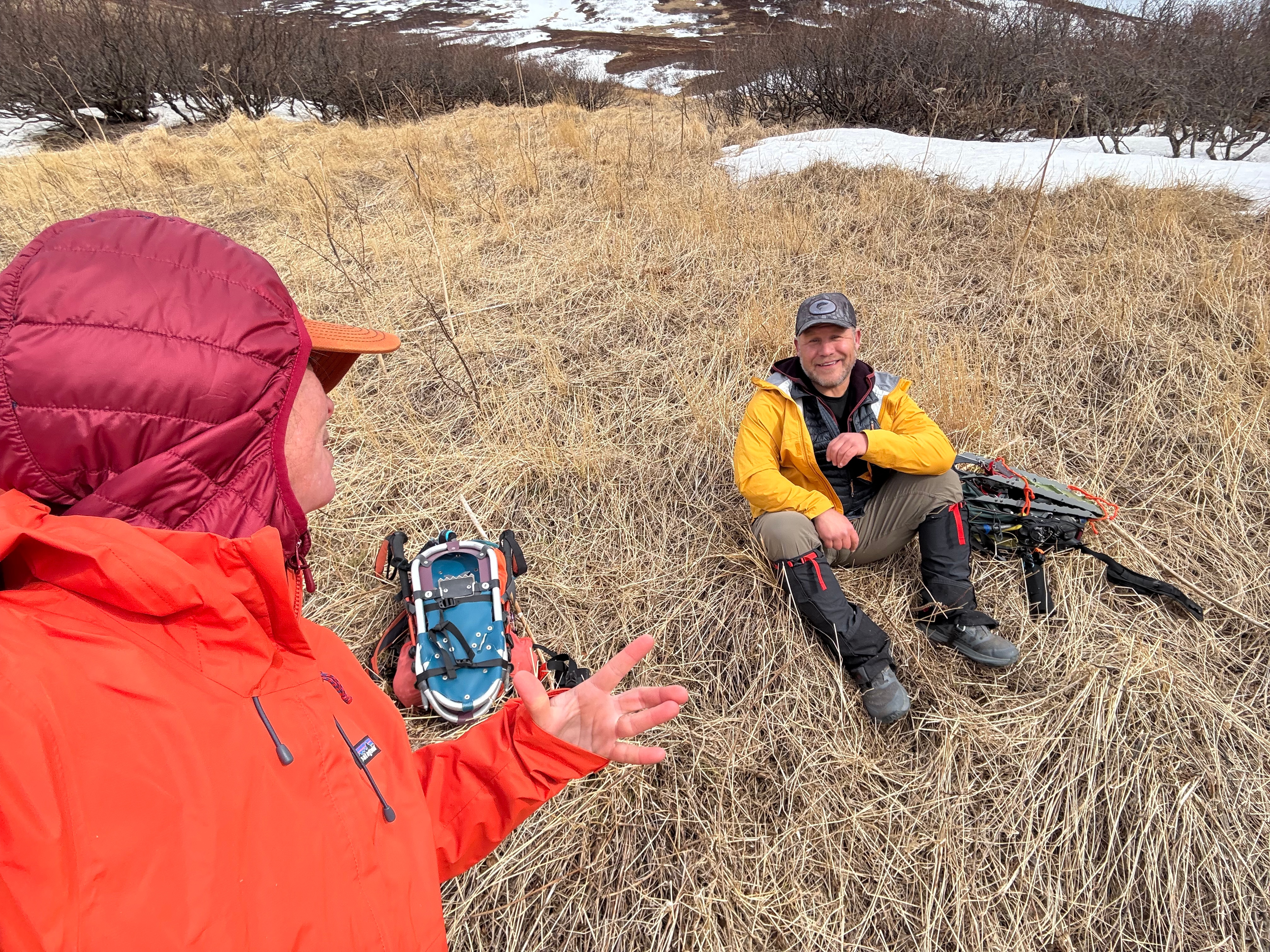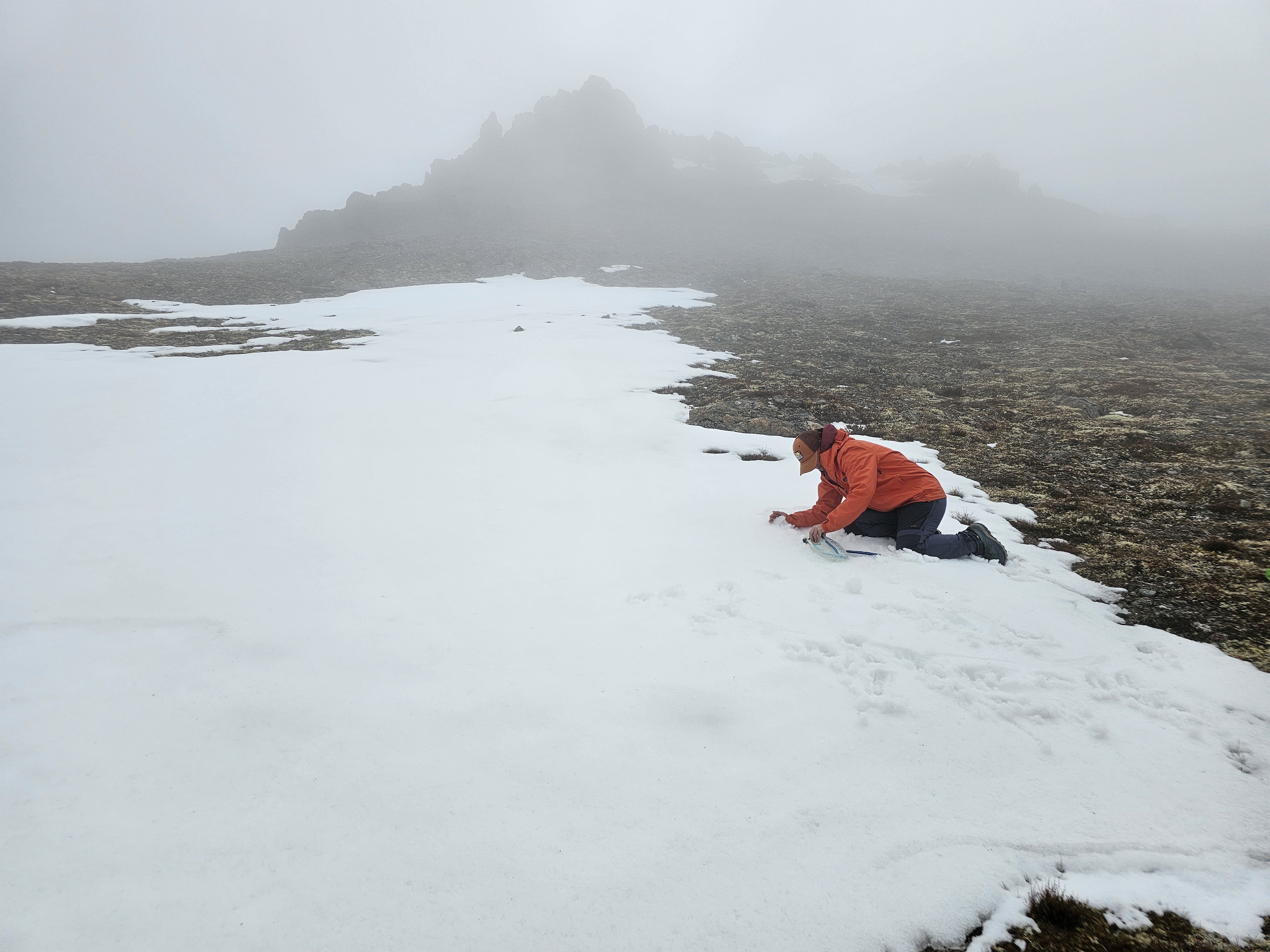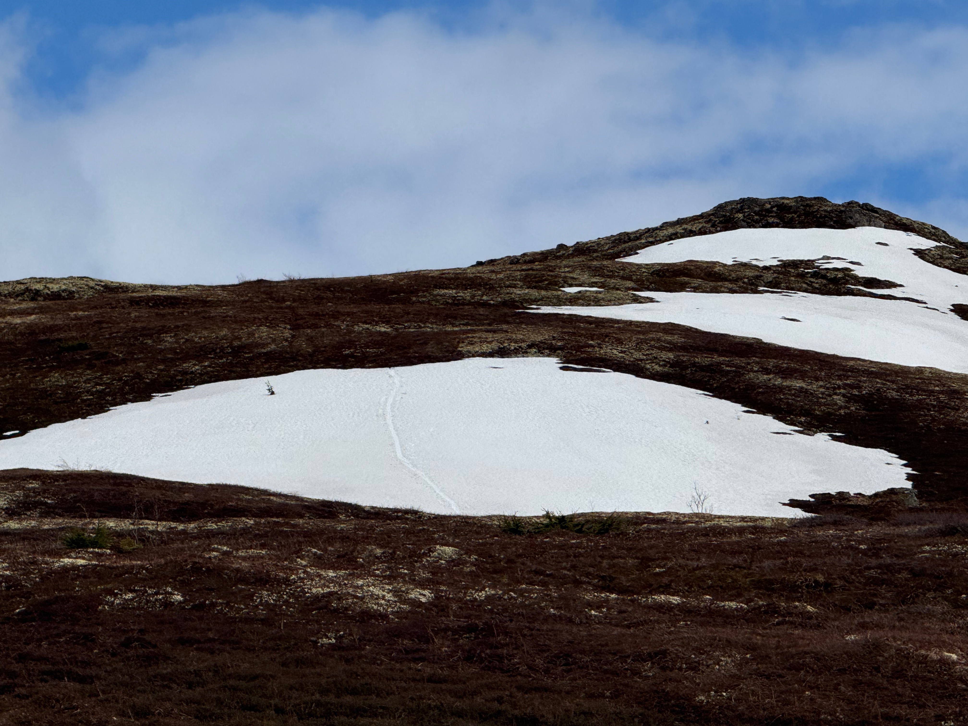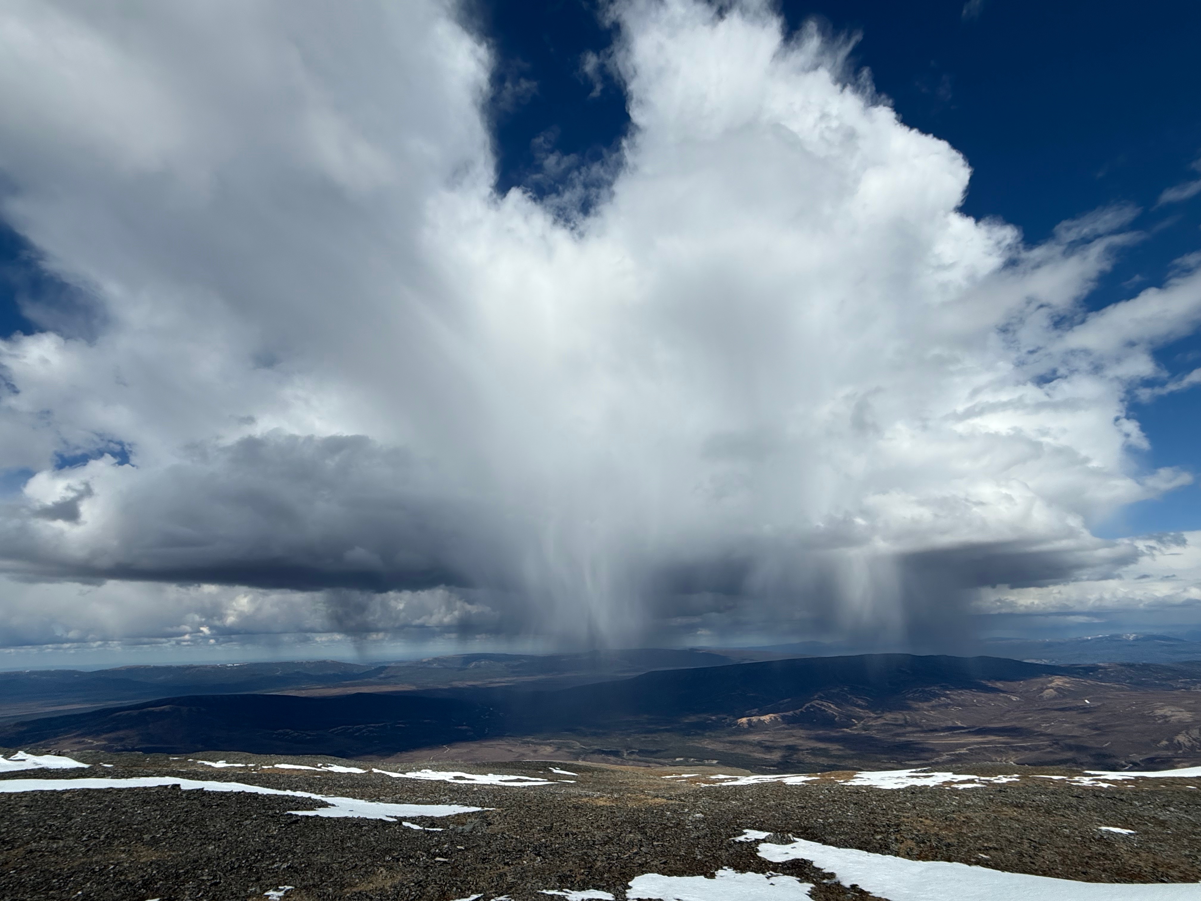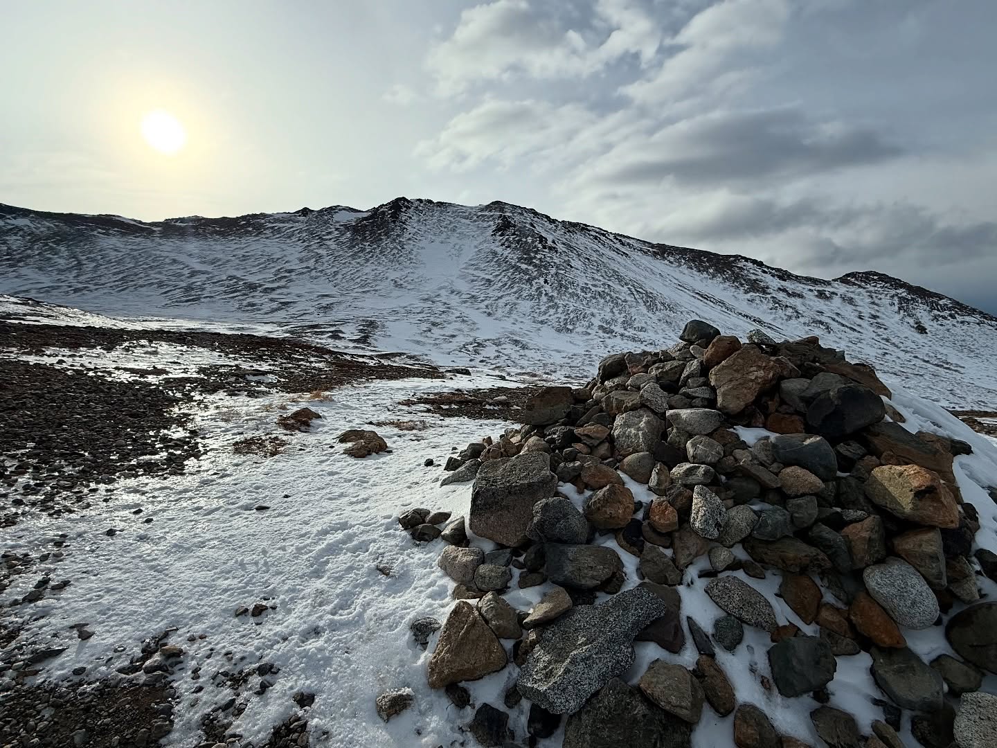 Knoya’s actual summit came into view less than a quarter mile to the east, at the far end of the south-facing slope. Tikishla and the surrounding peaks were still hidden in clouds, and as we stepped onto the summit, it began to snow—typical for late May or early June, and far more tolerable than the rain we’d started in.