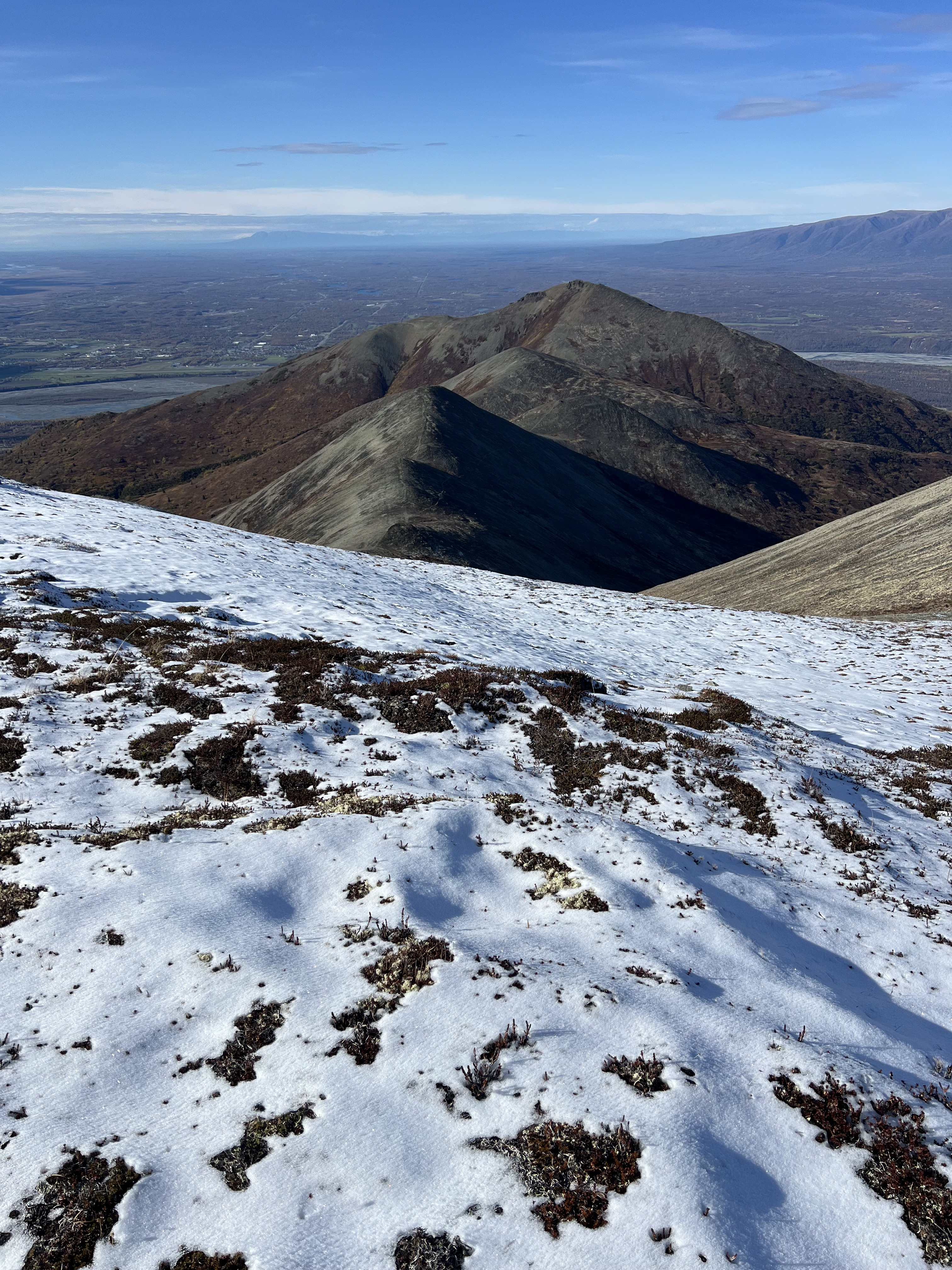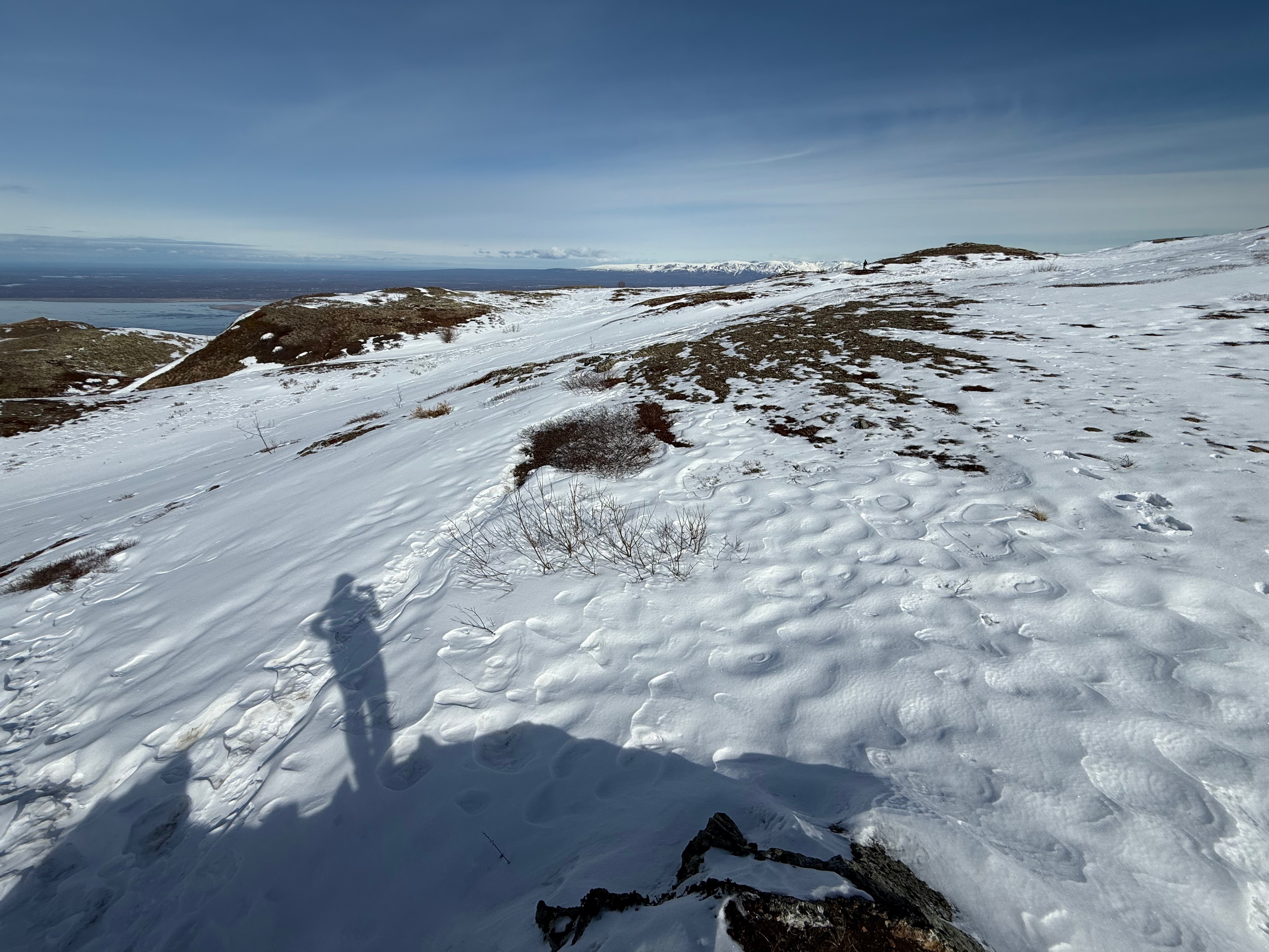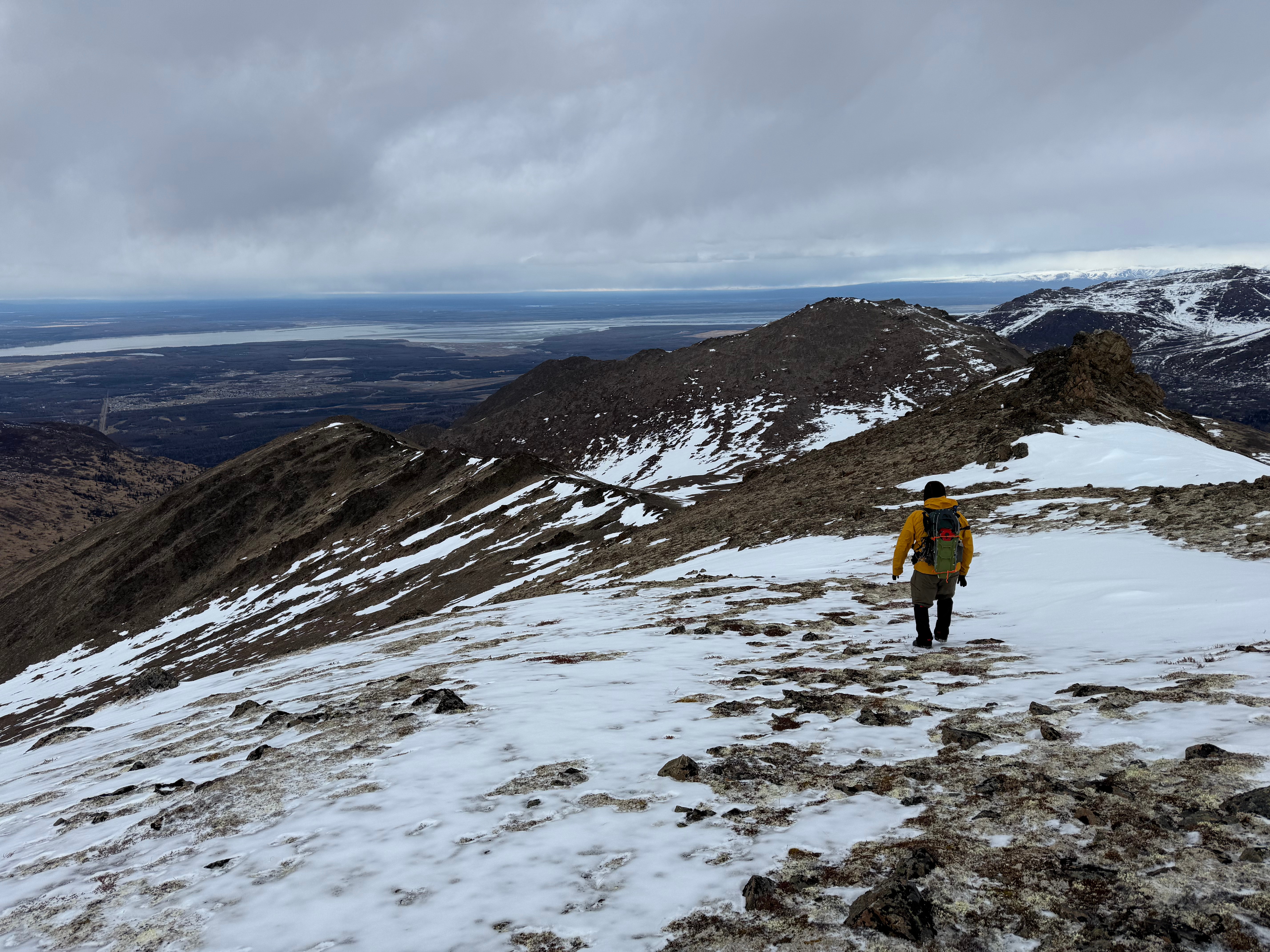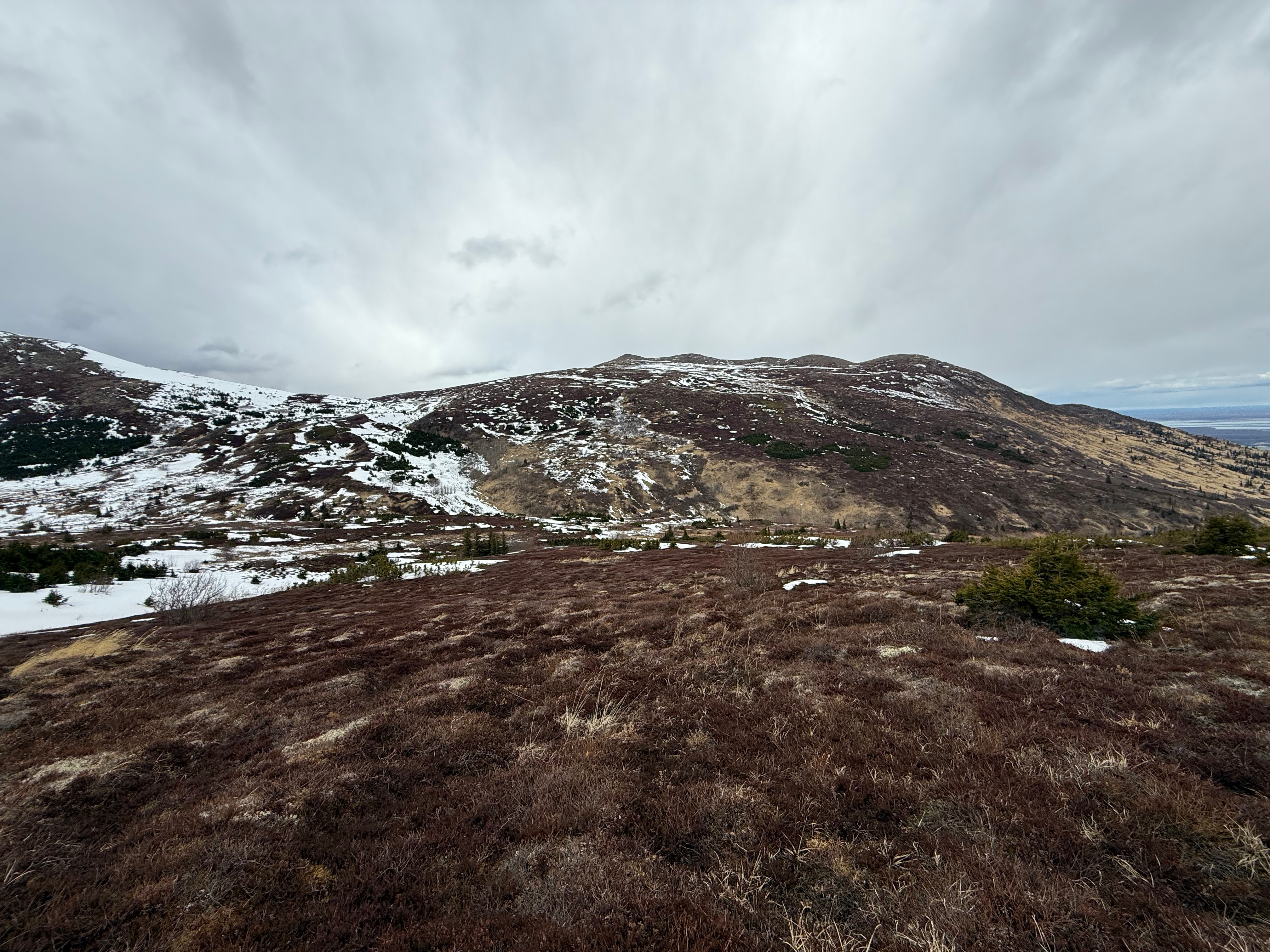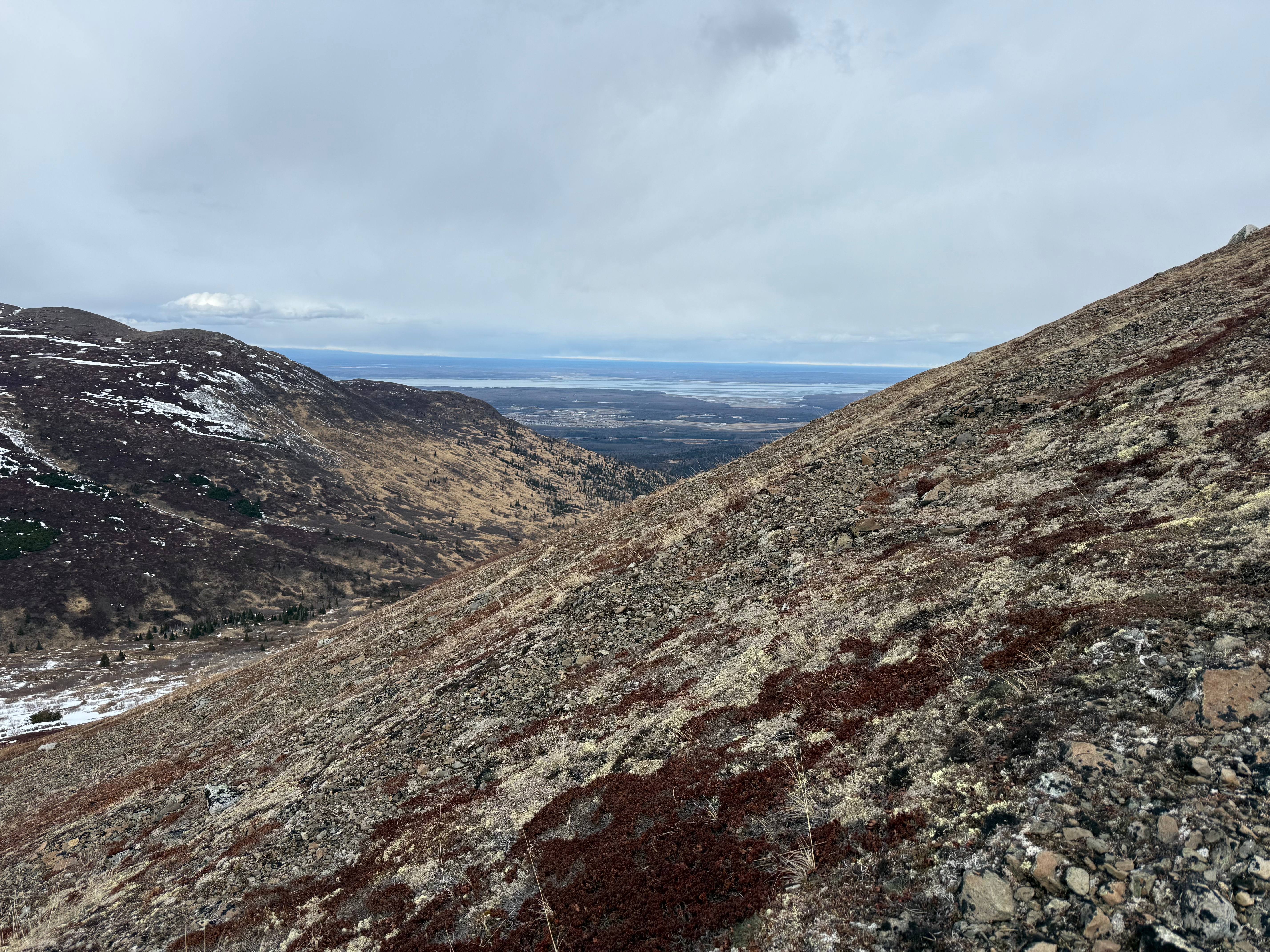 The sky continued to open up, and the little blue patch grew. We spotted a small cabin down in Snow Hawk Valley. I’ve heard of people using it, but since it’s on JBER land where overnight stays aren’t permitted, I haven’t found any official resources explaining how to legally use the shelter. I wouldn’t recommend attempting an overnight trip there without written permission from JBER officials—you don’t want to lose access to military land hikes.