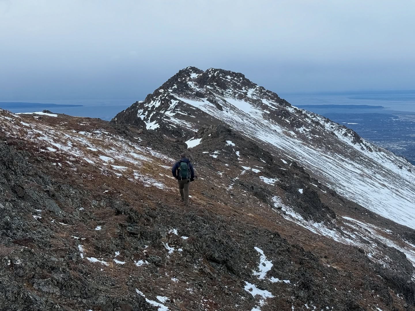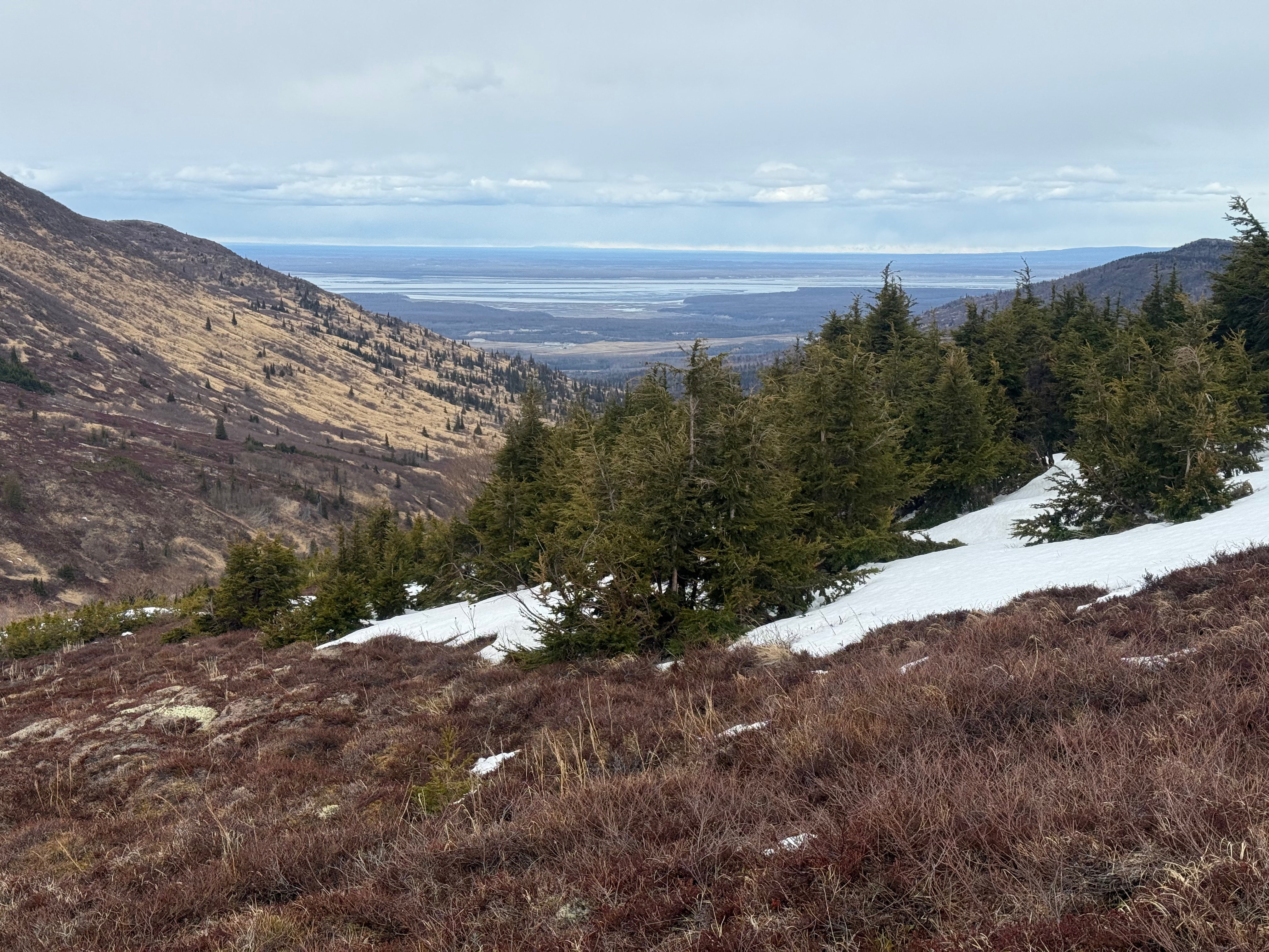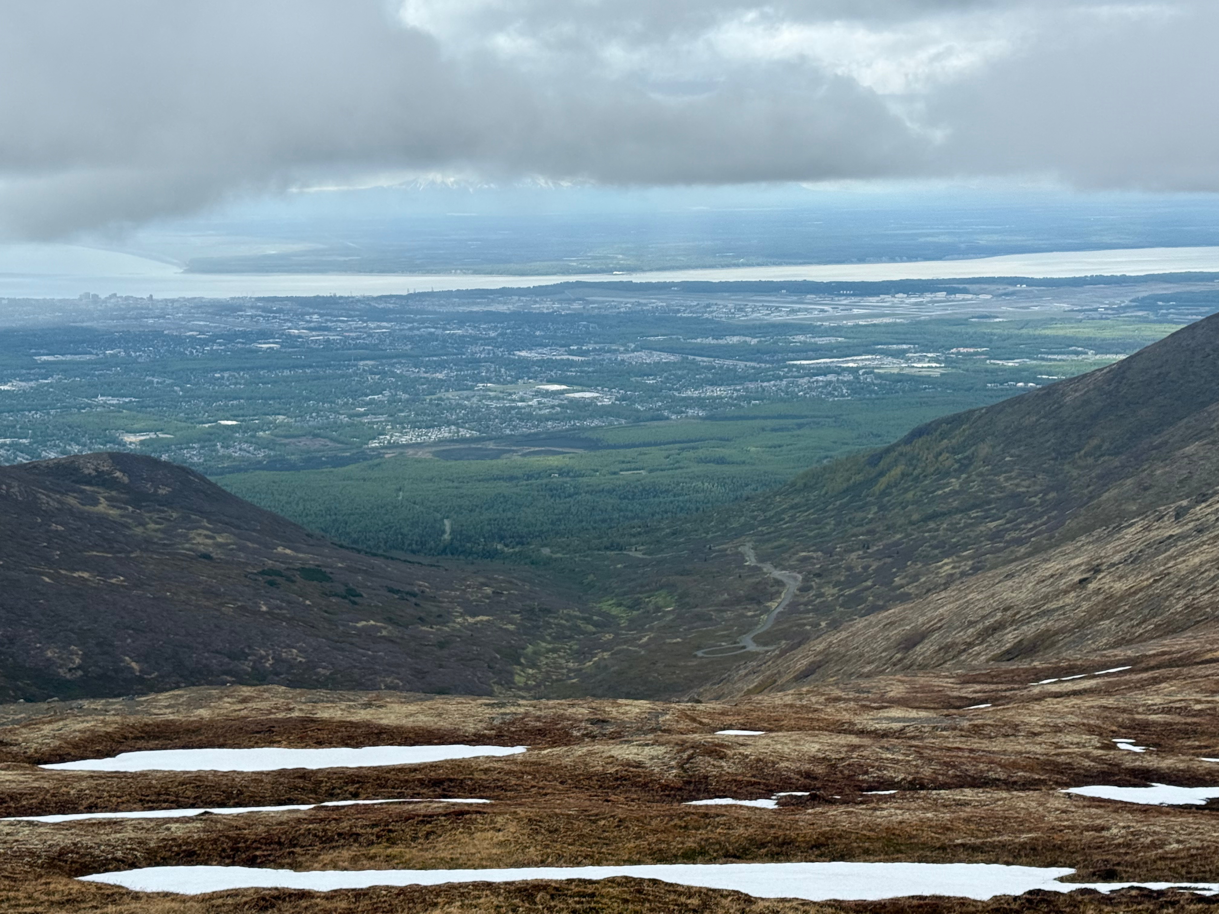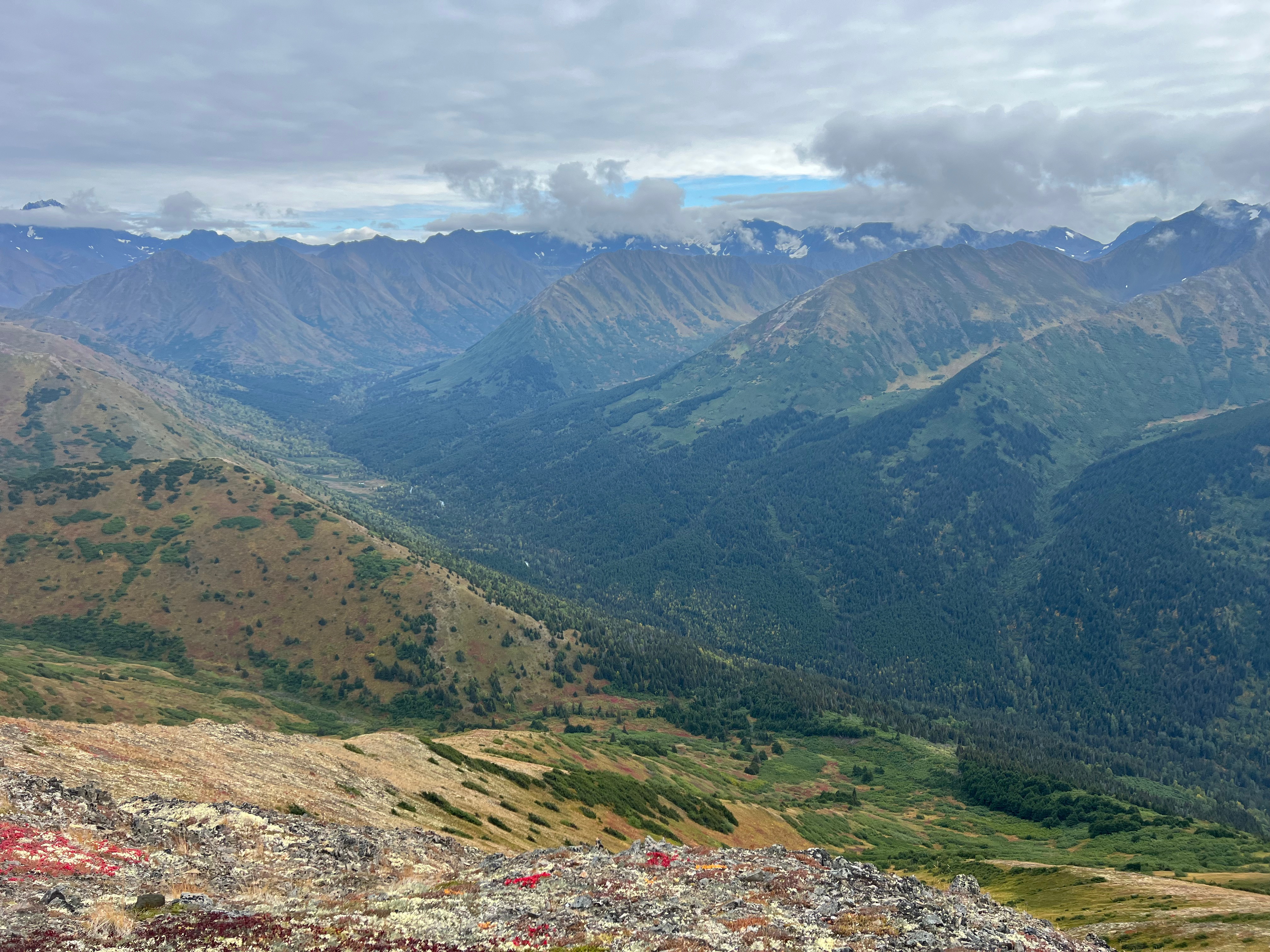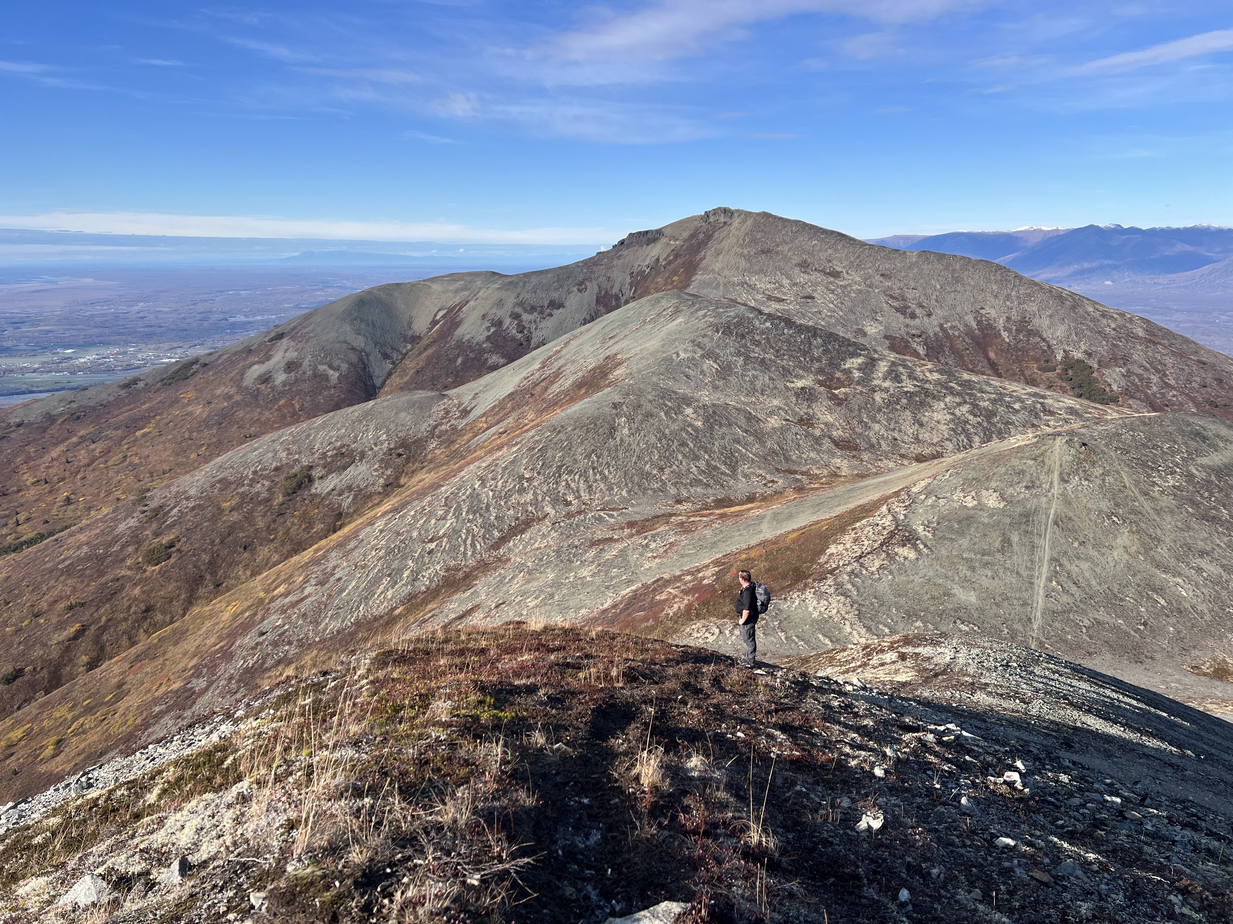 The sky continued to open up, and the little blue patch grew. We spotted a small cabin down in Snow Hawk Valley. I’ve heard of people using it, but since it’s on JBER land where overnight stays aren’t permitted, I haven’t found any official resources explaining how to legally use the shelter. I wouldn’t recommend attempting an overnight trip there without written permission from JBER officials—you don’t want to lose access to military land hikes.