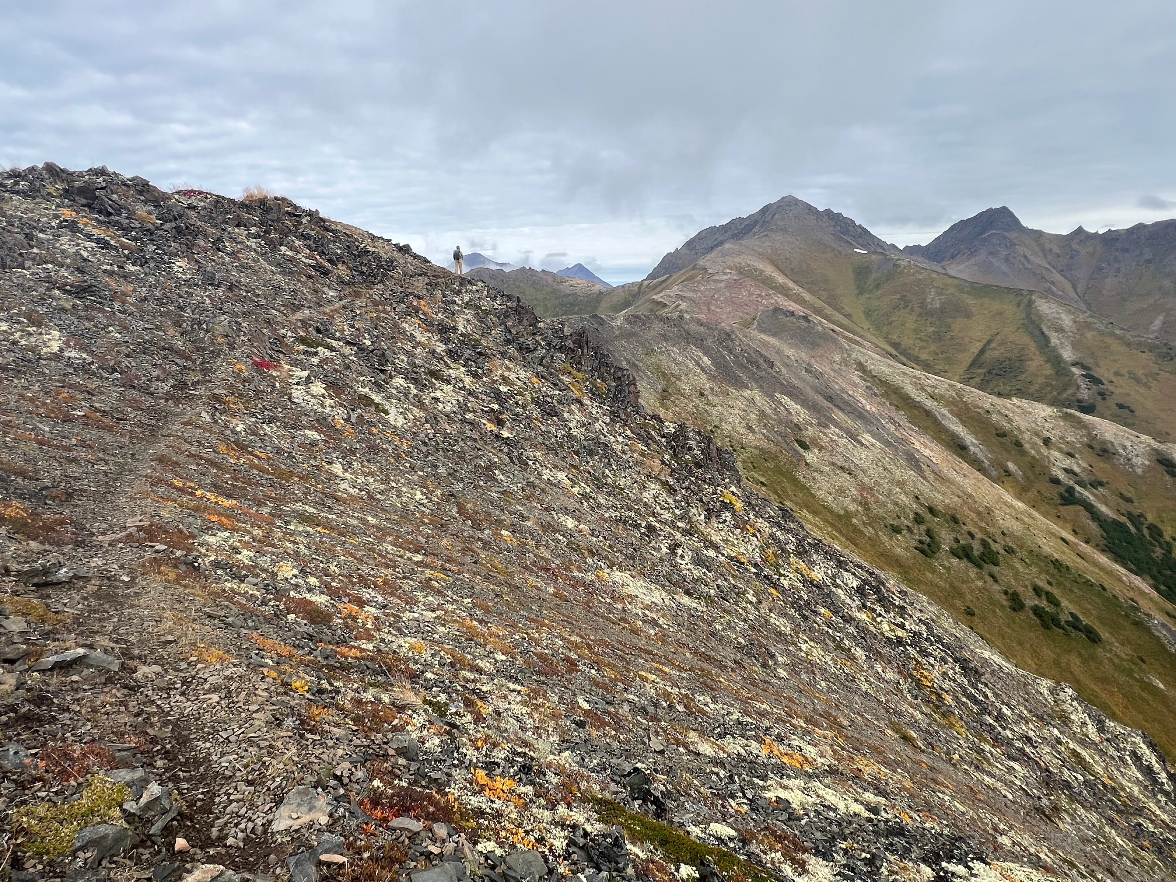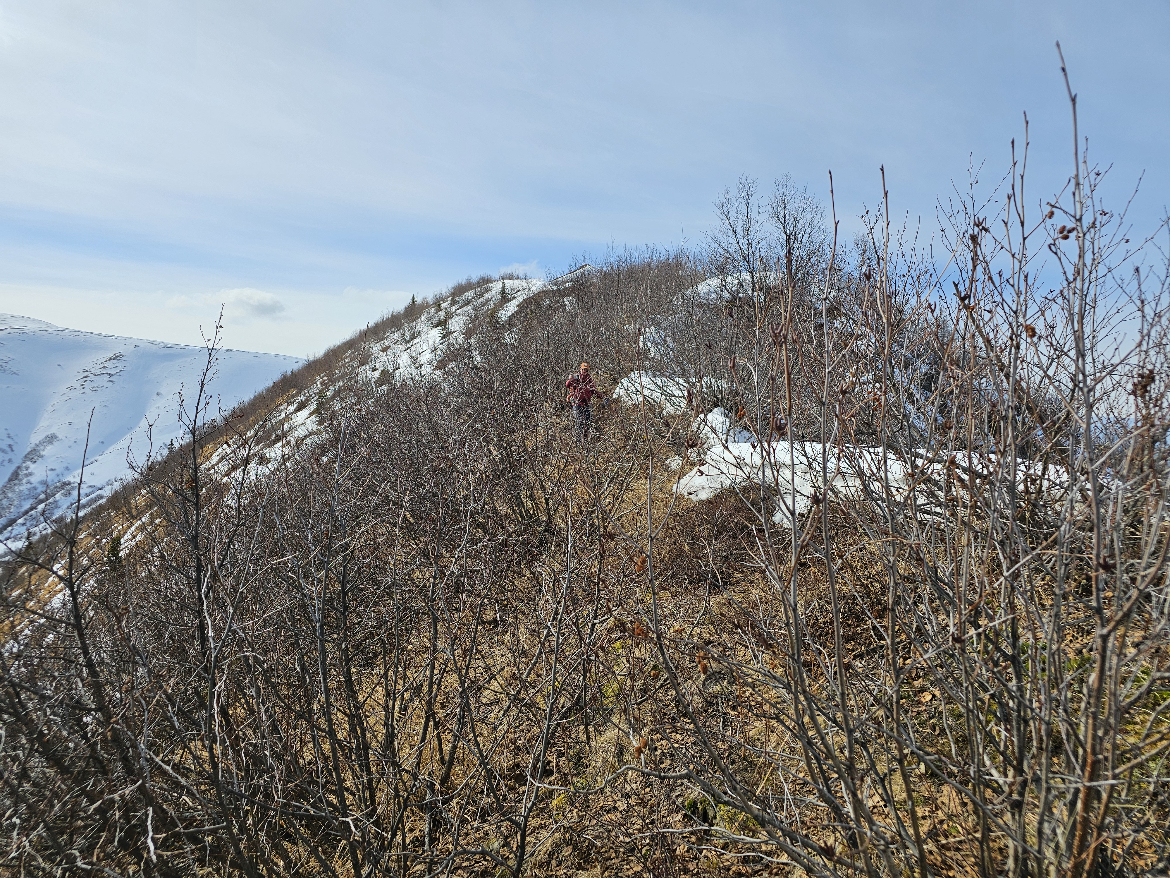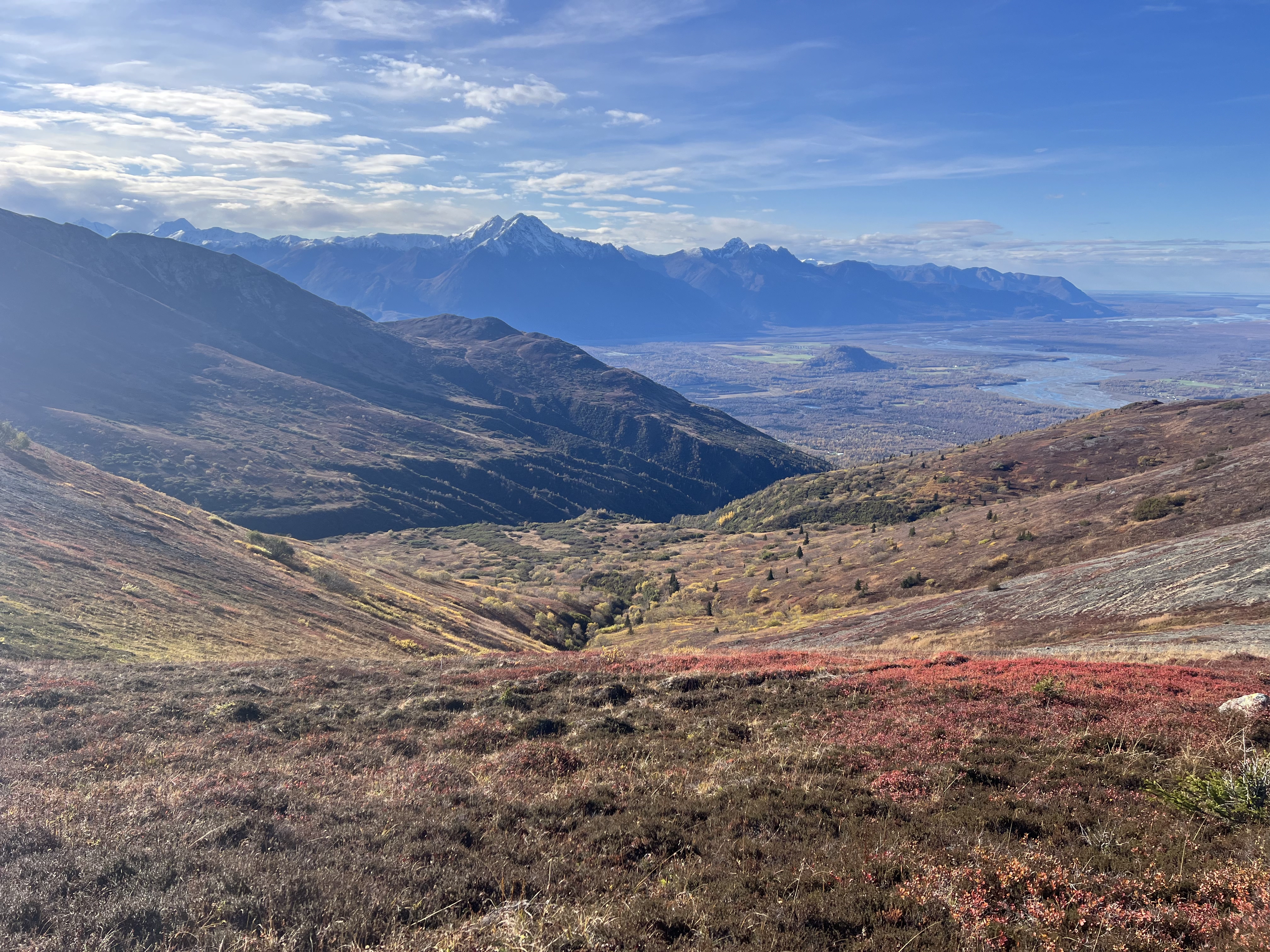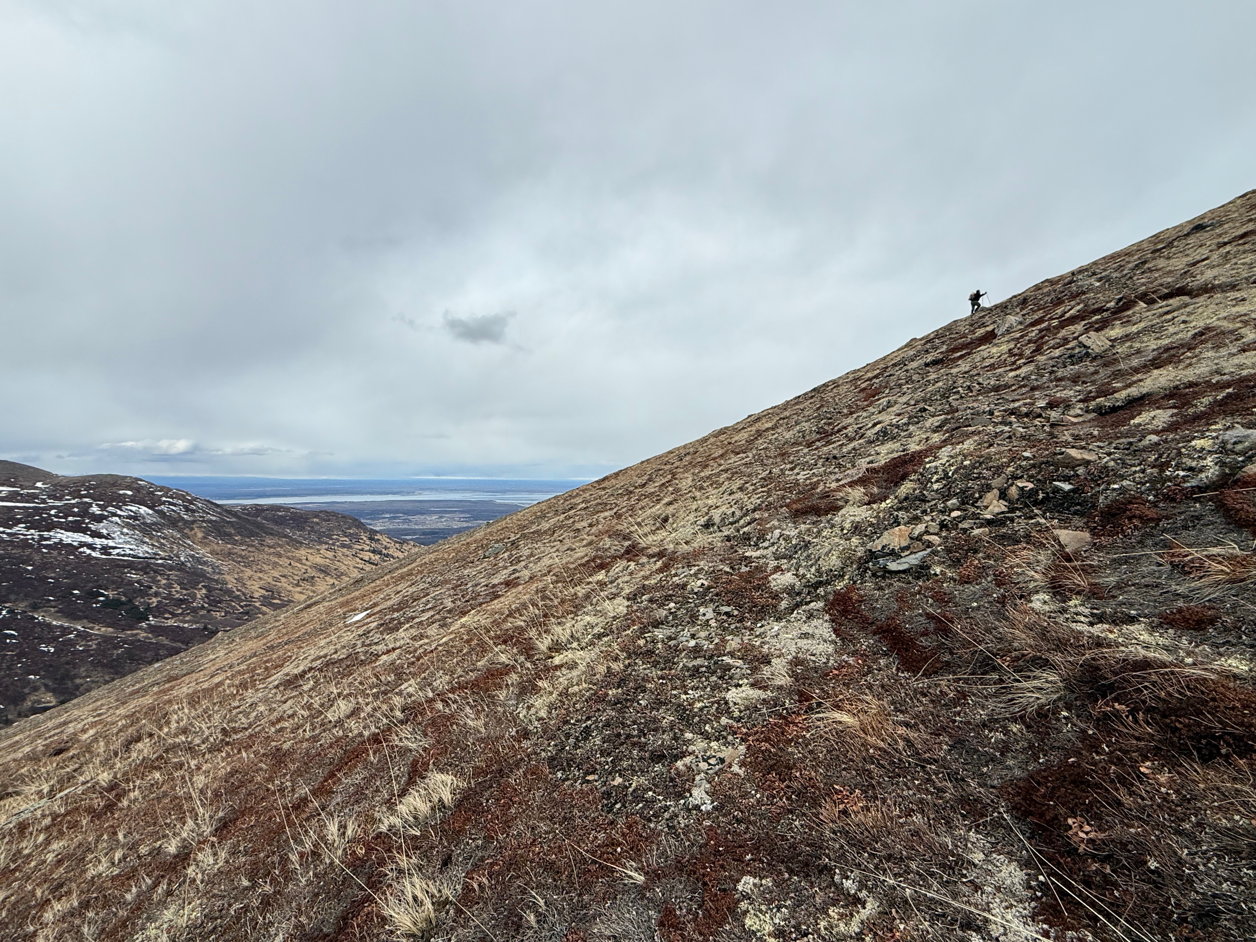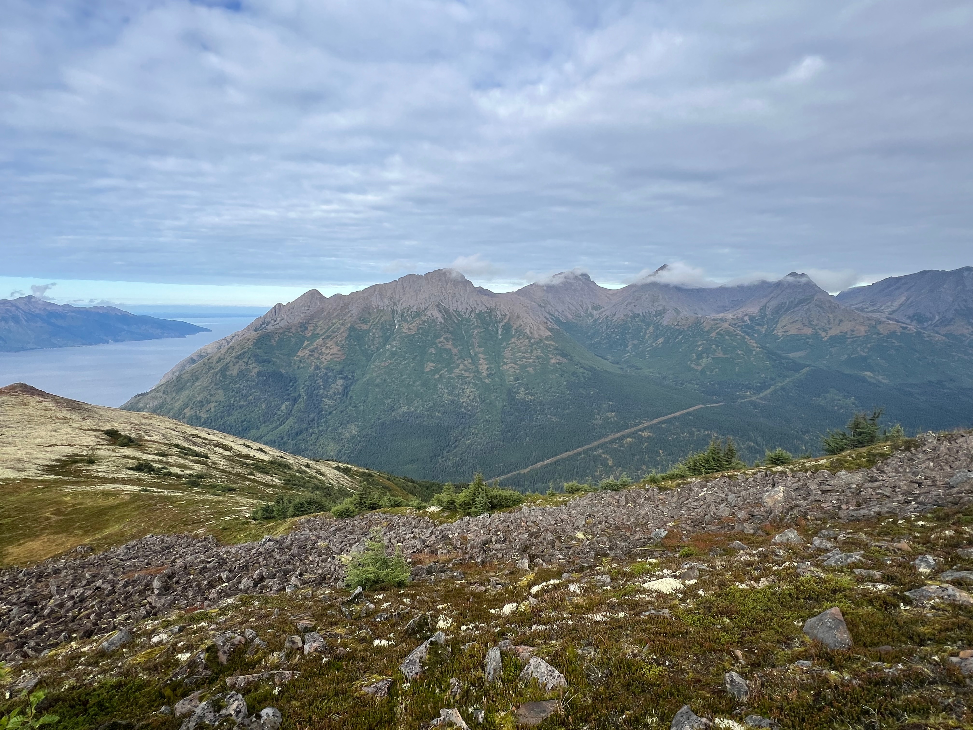 The sky continued to open up, and the little blue patch grew. We spotted a small cabin down in Snow Hawk Valley. I’ve heard of people using it, but since it’s on JBER land where overnight stays aren’t permitted, I haven’t found any official resources explaining how to legally use the shelter. I wouldn’t recommend attempting an overnight trip there without written permission from JBER officials—you don’t want to lose access to military land hikes.