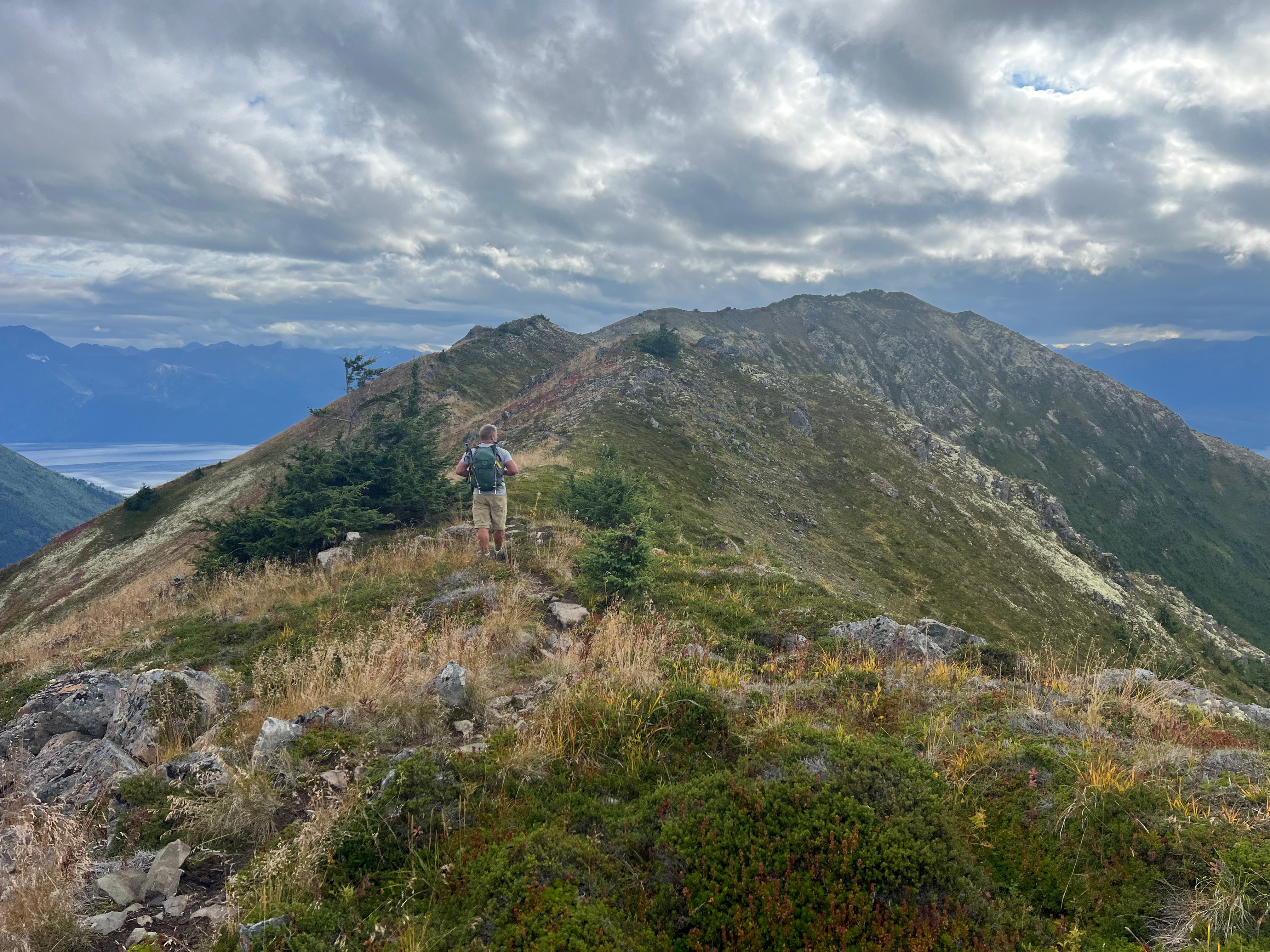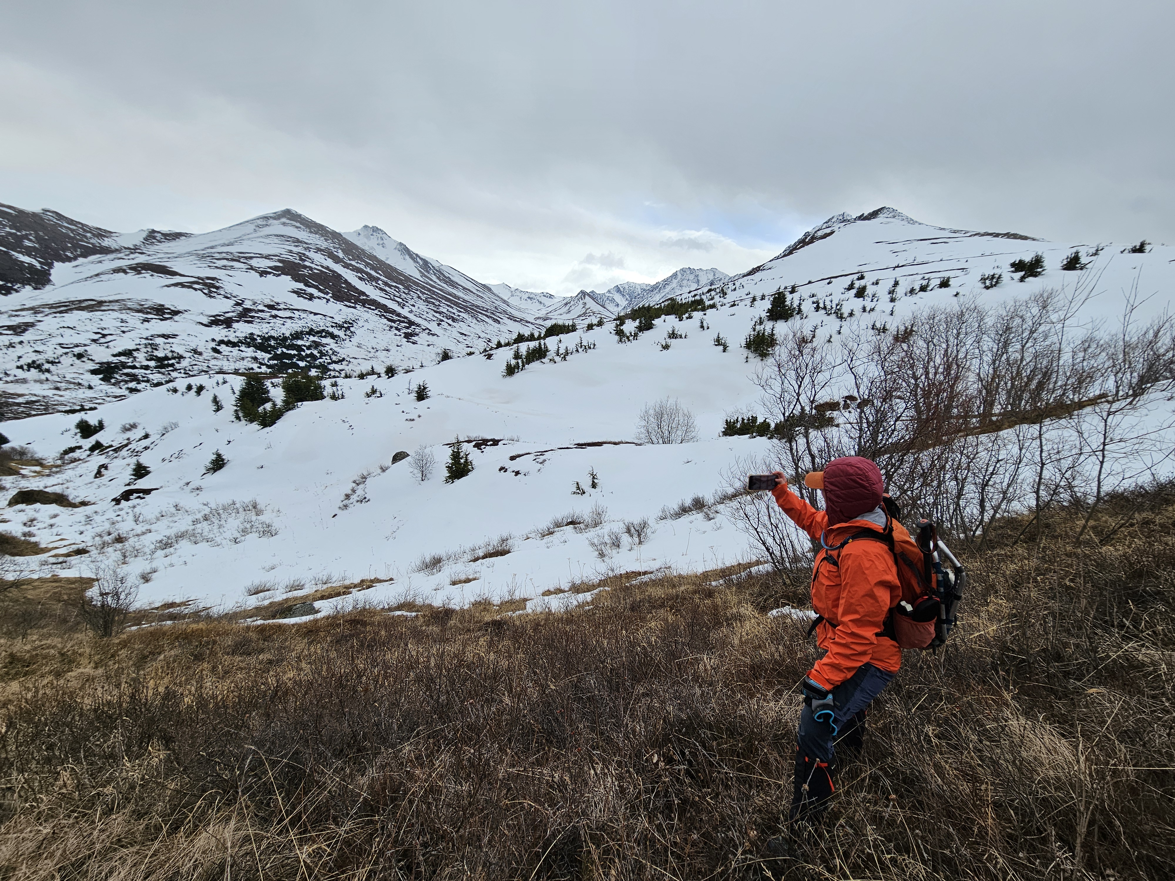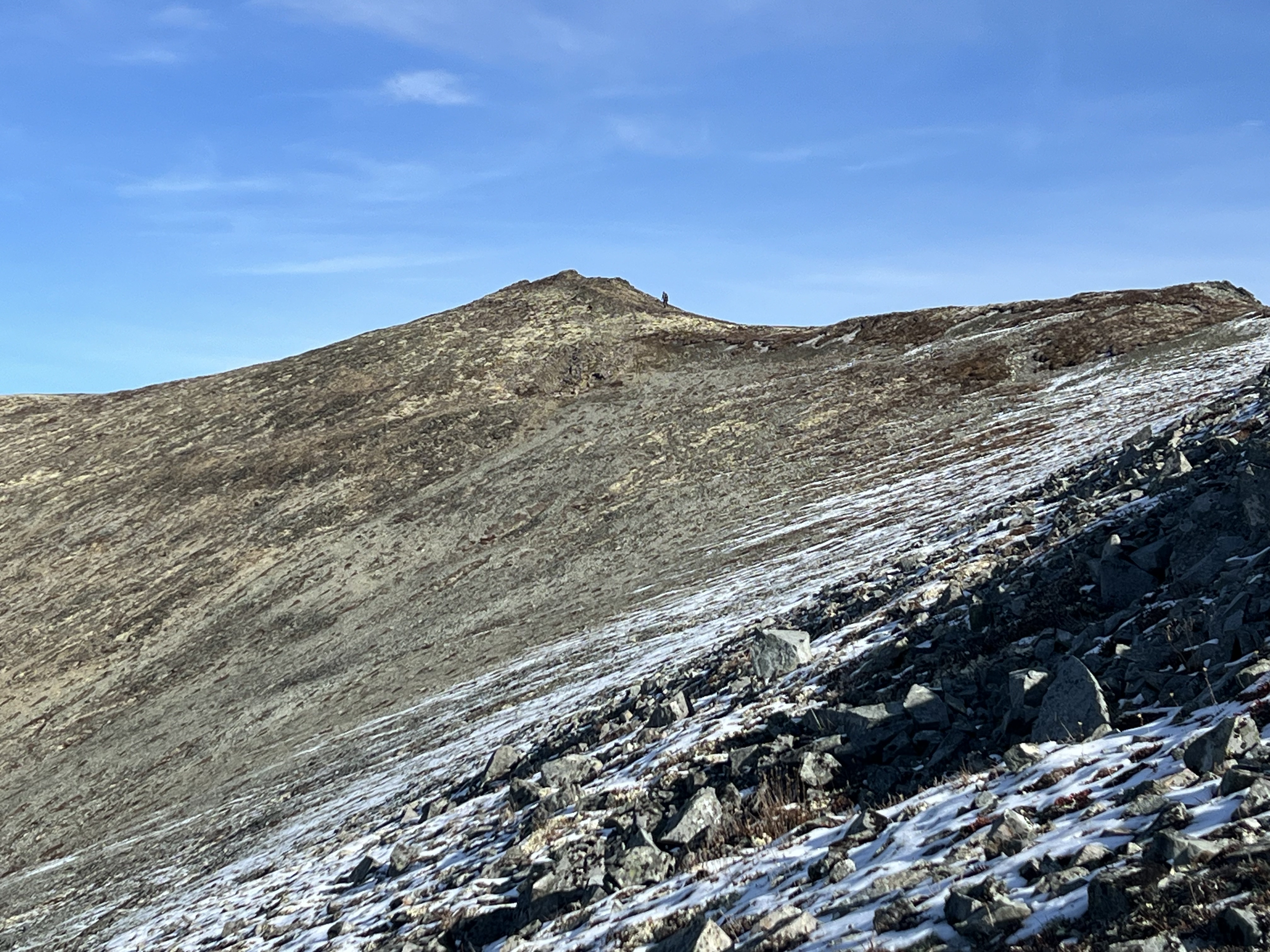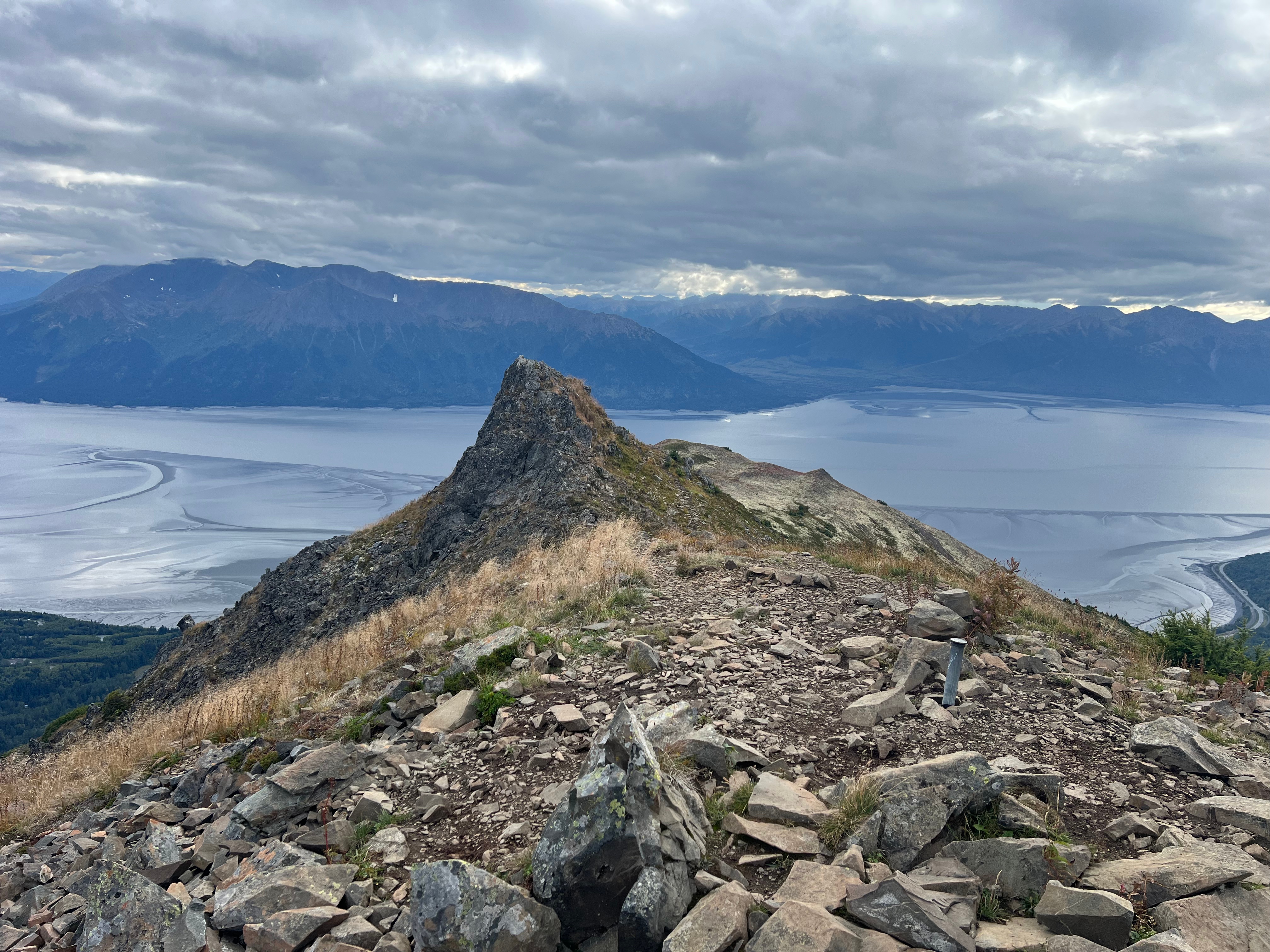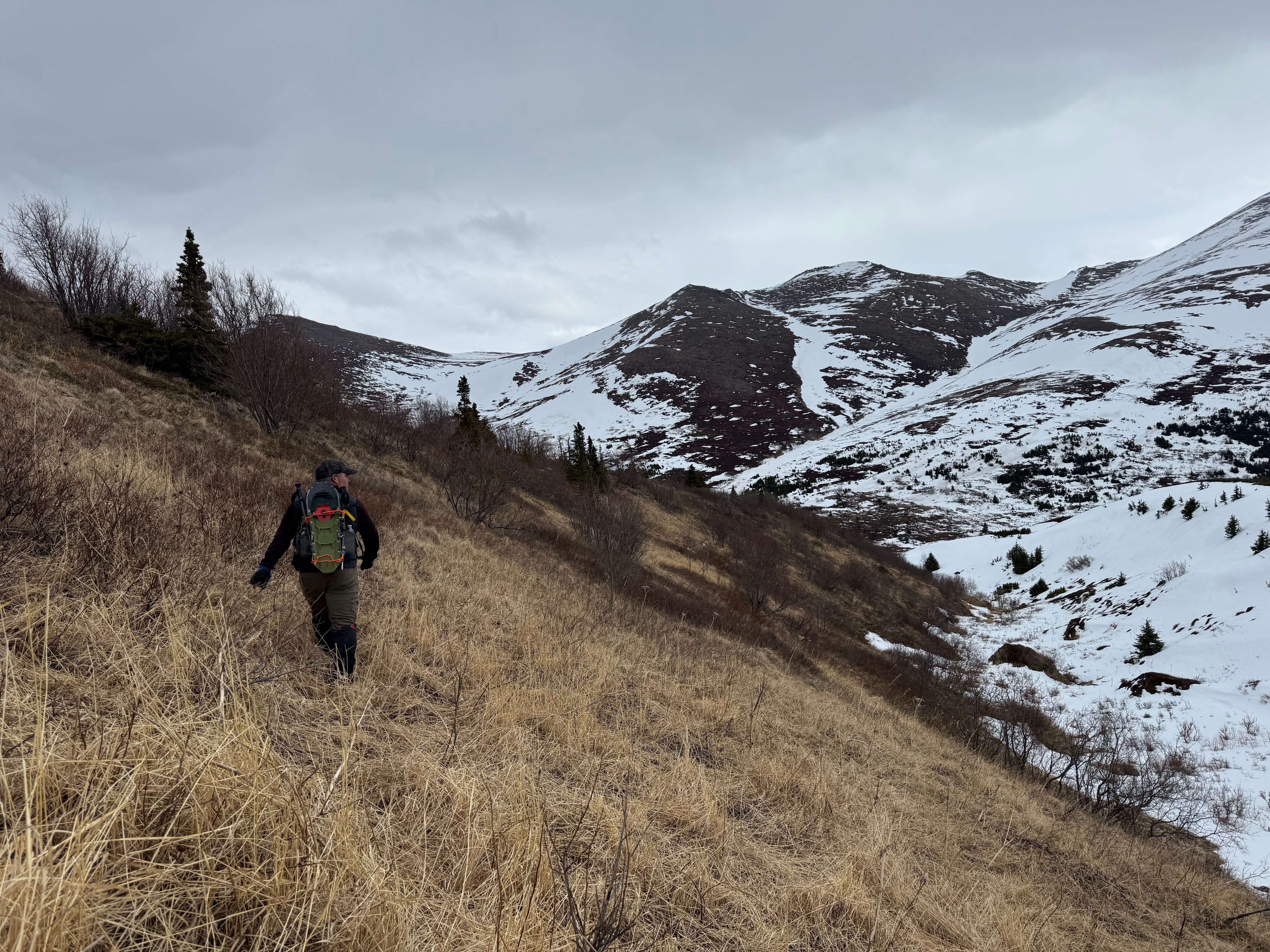 The sky continued to open up, and the little blue patch grew. We spotted a small cabin down in Snow Hawk Valley. I’ve heard of people using it, but since it’s on JBER land where overnight stays aren’t permitted, I haven’t found any official resources explaining how to legally use the shelter. I wouldn’t recommend attempting an overnight trip there without written permission from JBER officials—you don’t want to lose access to military land hikes.
