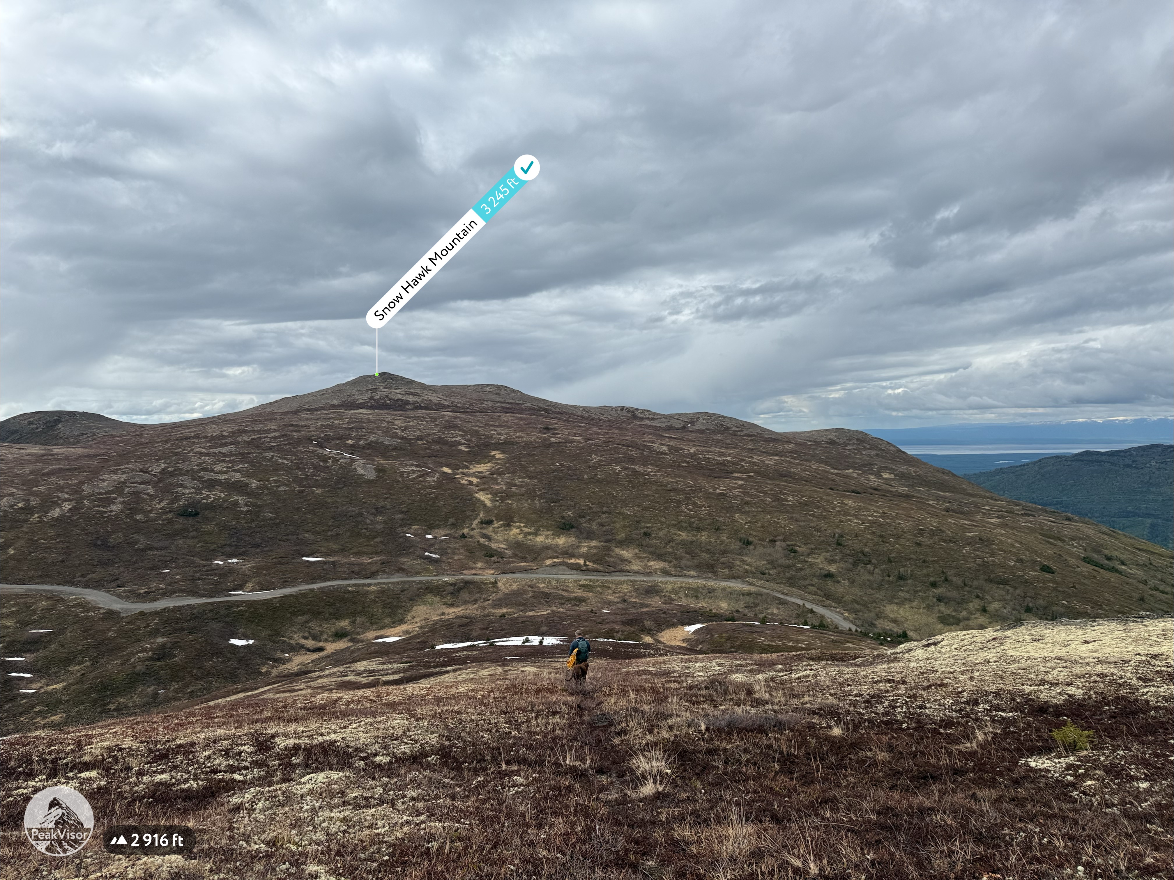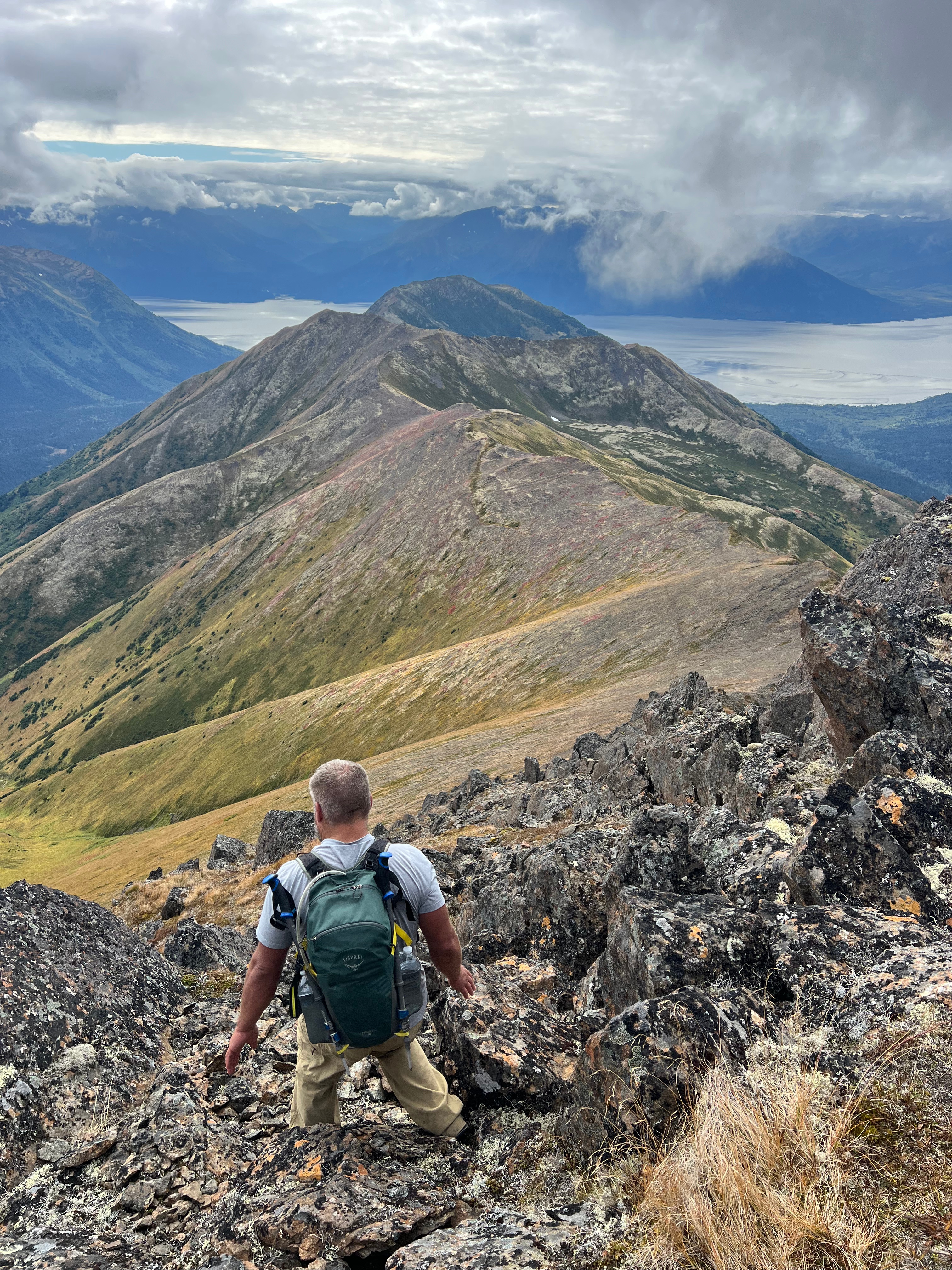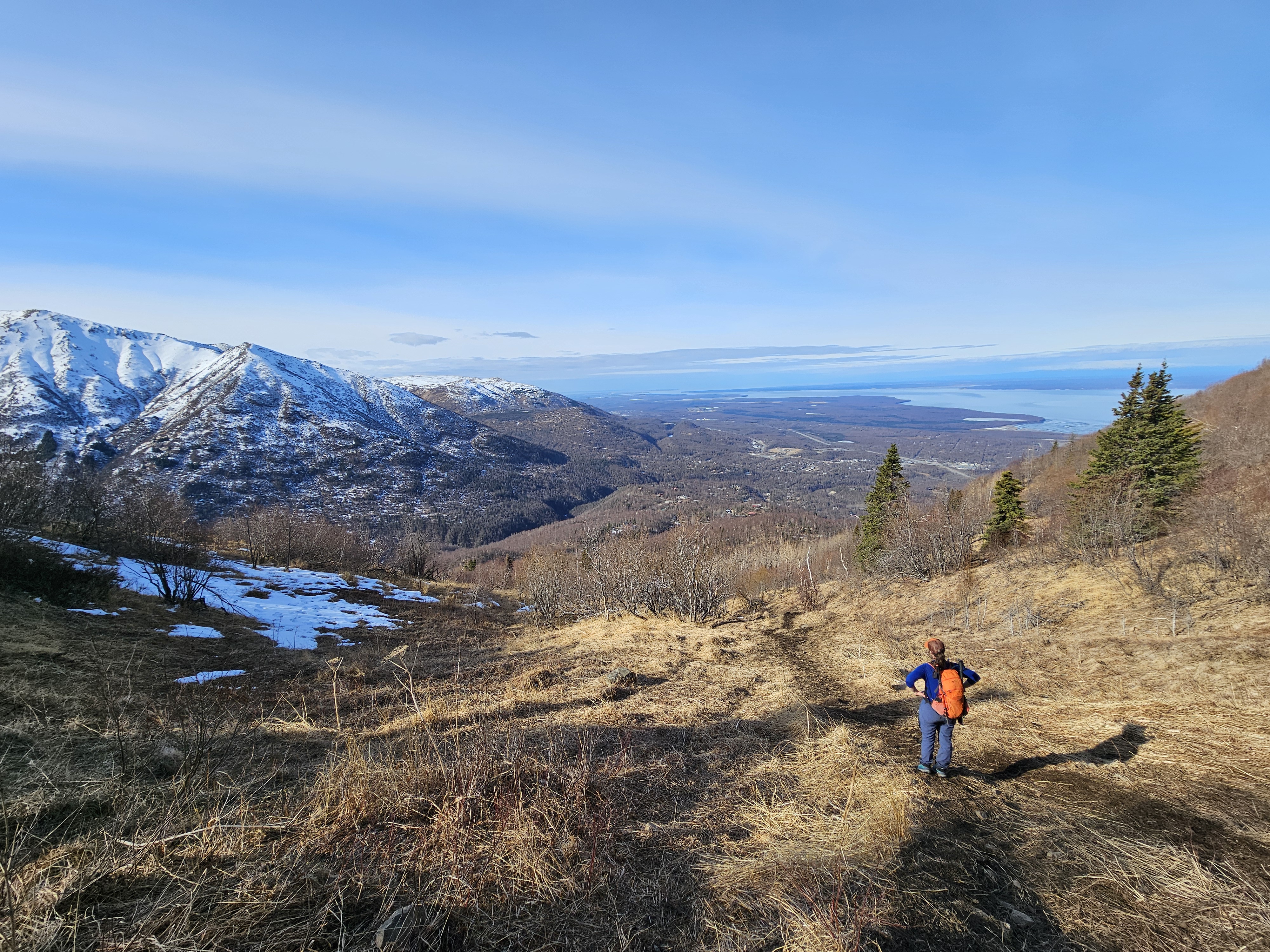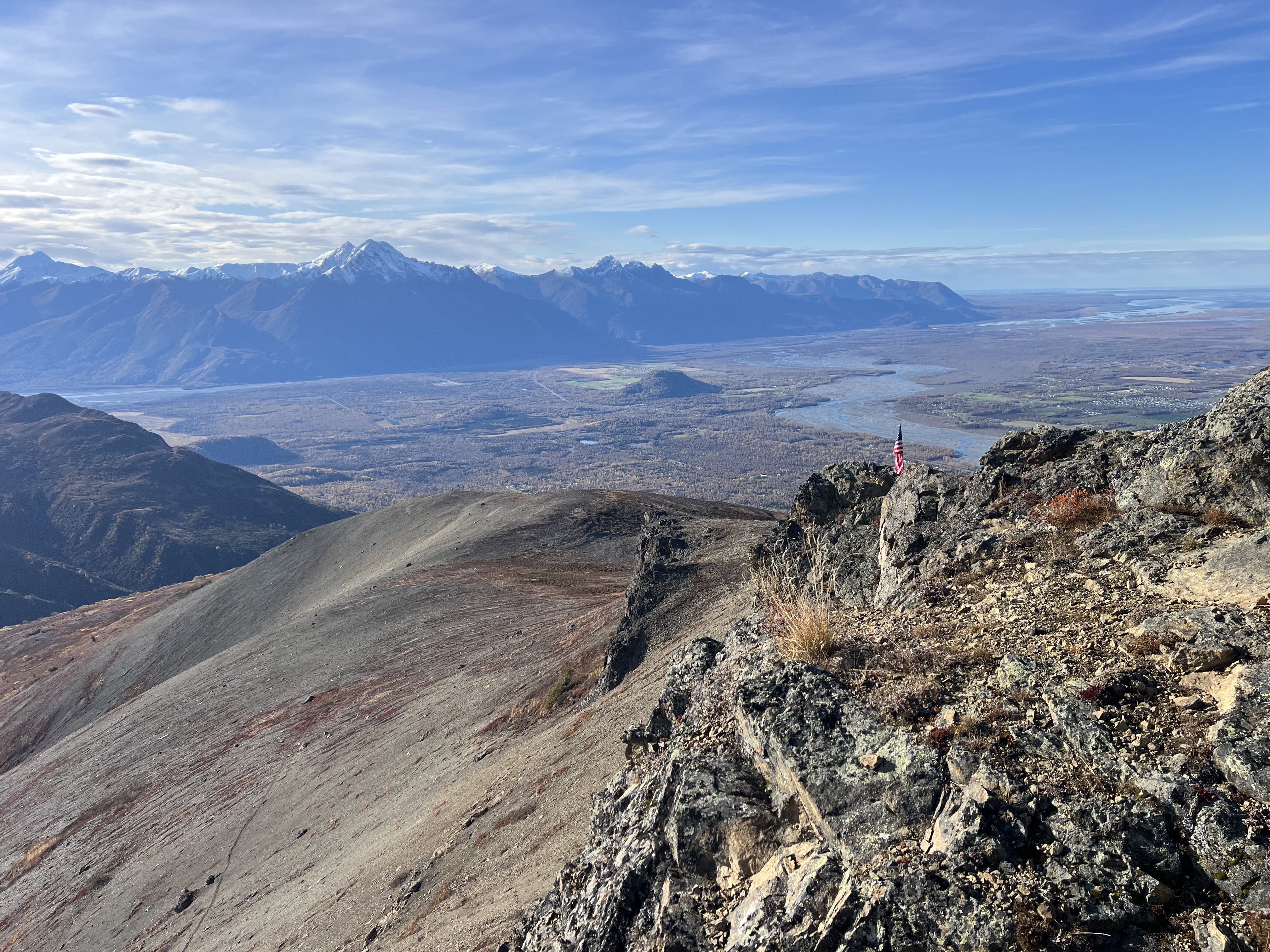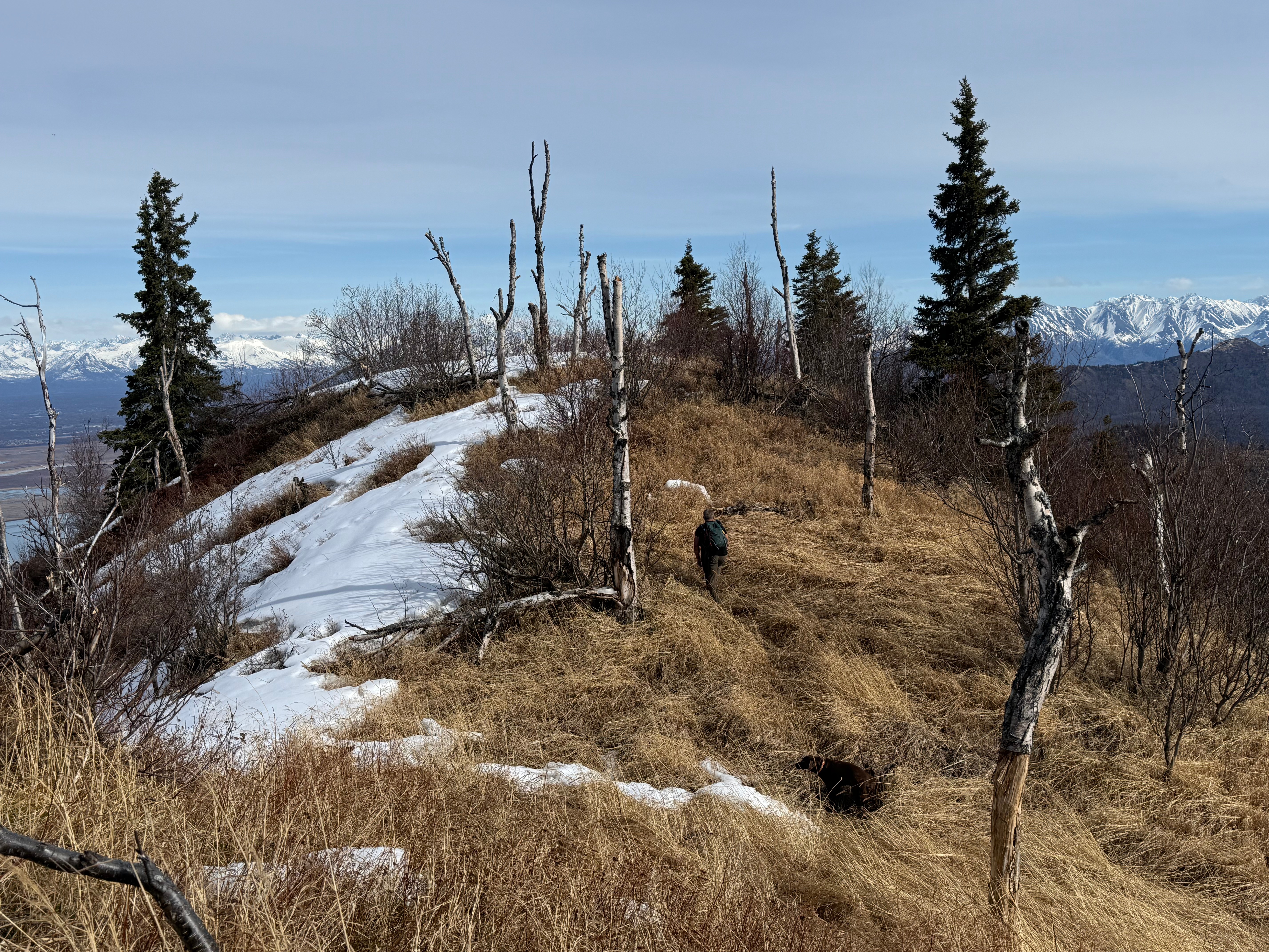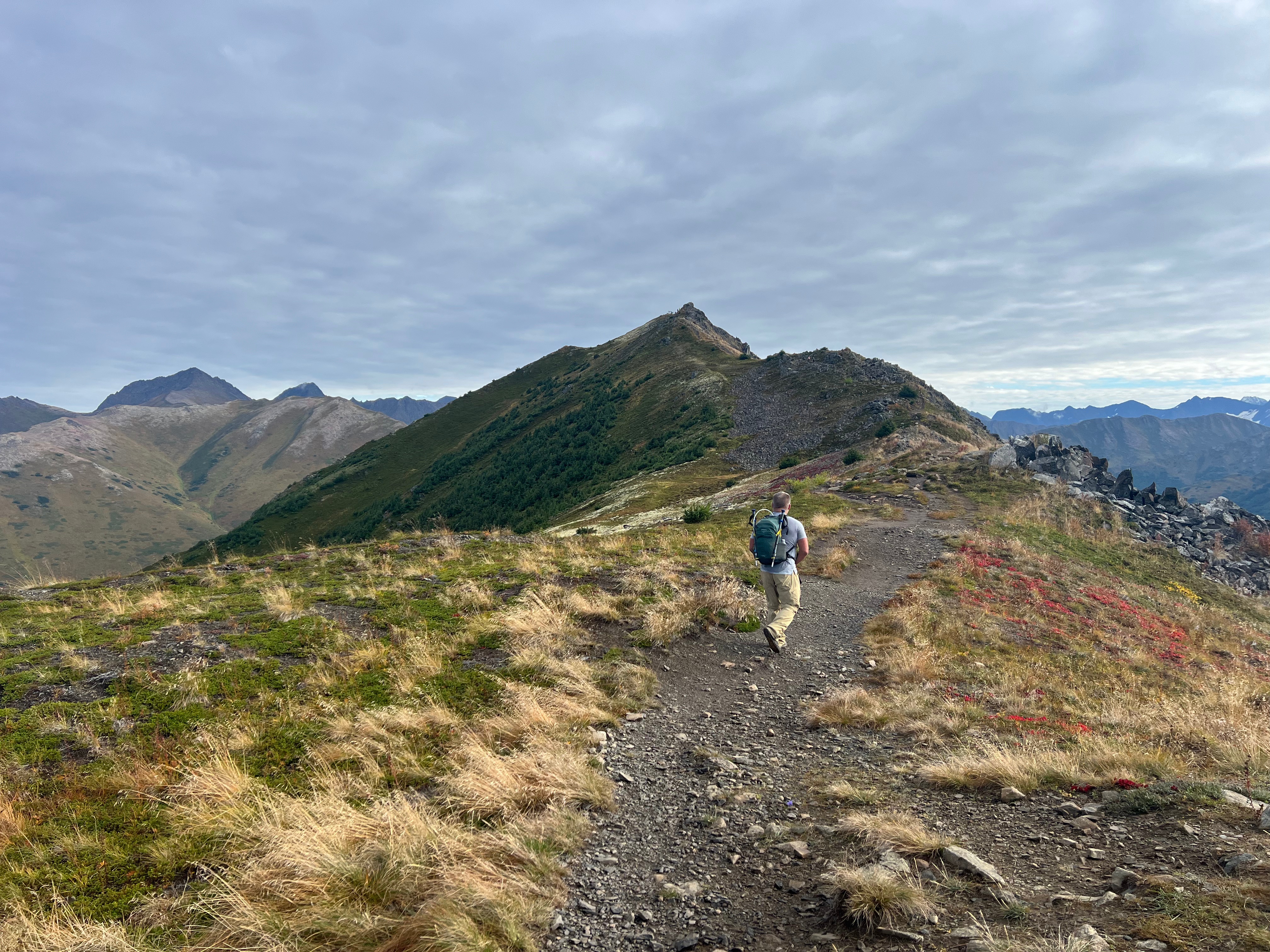 The sky continued to open up, and the little blue patch grew. We spotted a small cabin down in Snow Hawk Valley. I’ve heard of people using it, but since it’s on JBER land where overnight stays aren’t permitted, I haven’t found any official resources explaining how to legally use the shelter. I wouldn’t recommend attempting an overnight trip there without written permission from JBER officials—you don’t want to lose access to military land hikes.