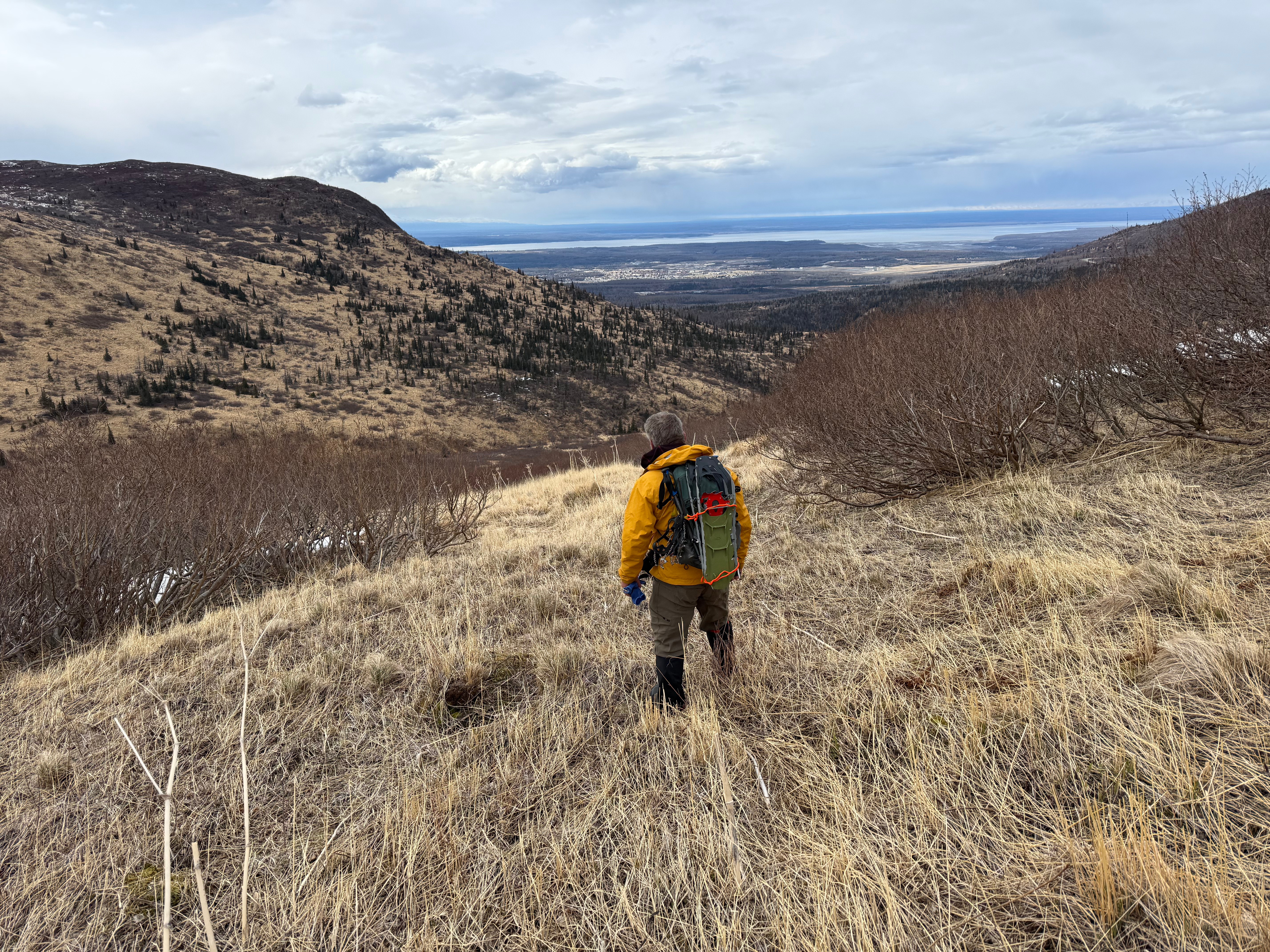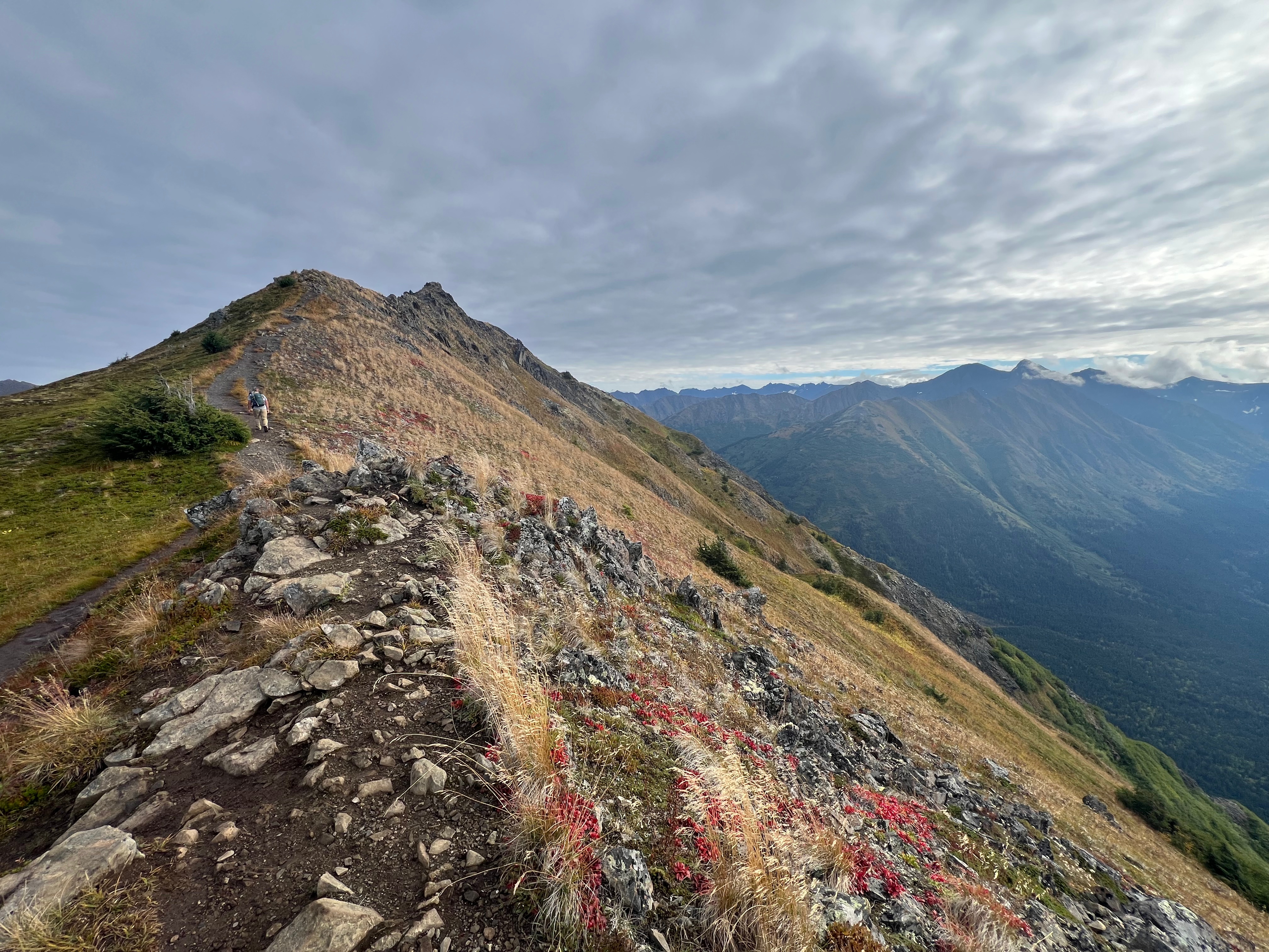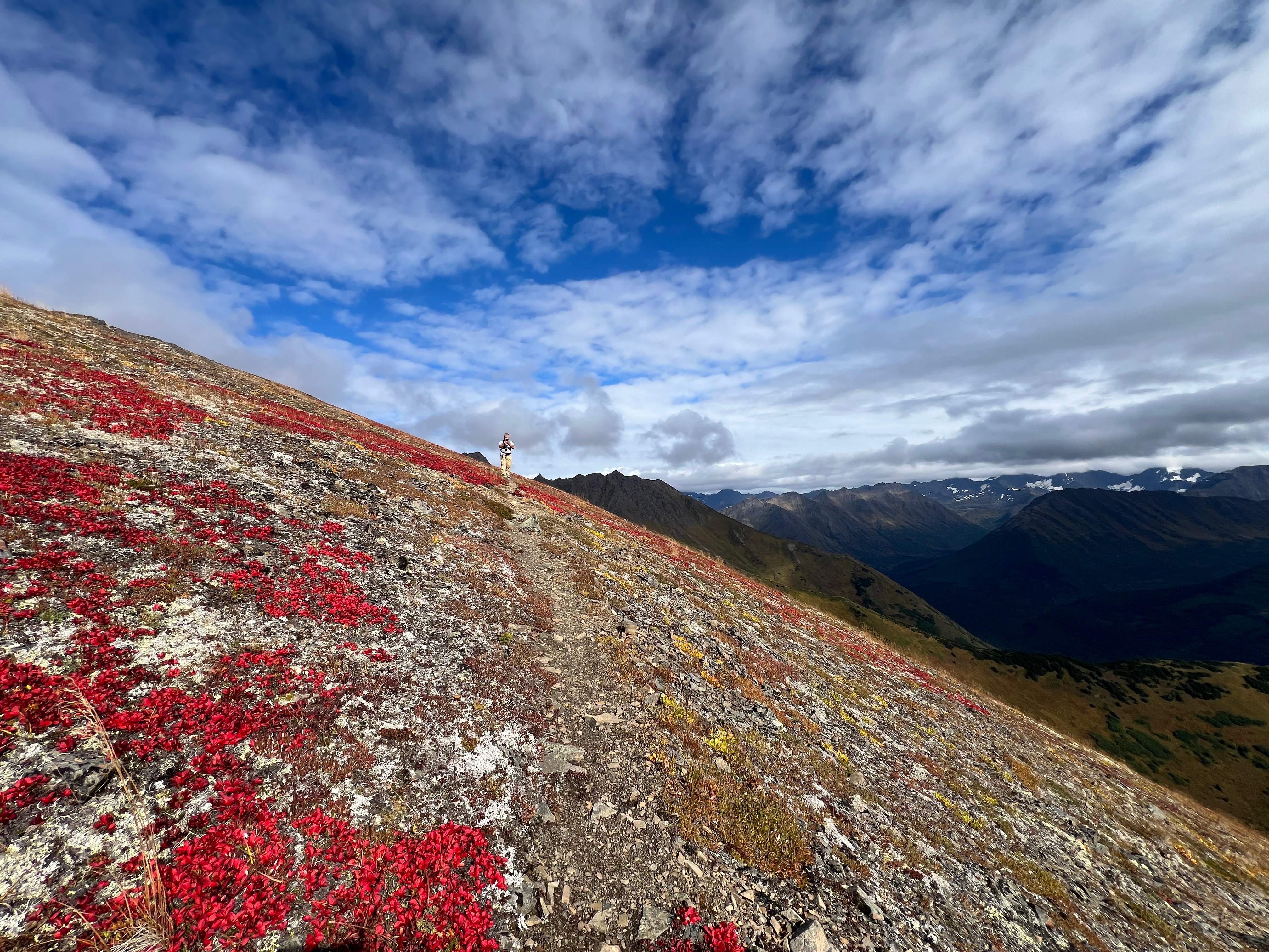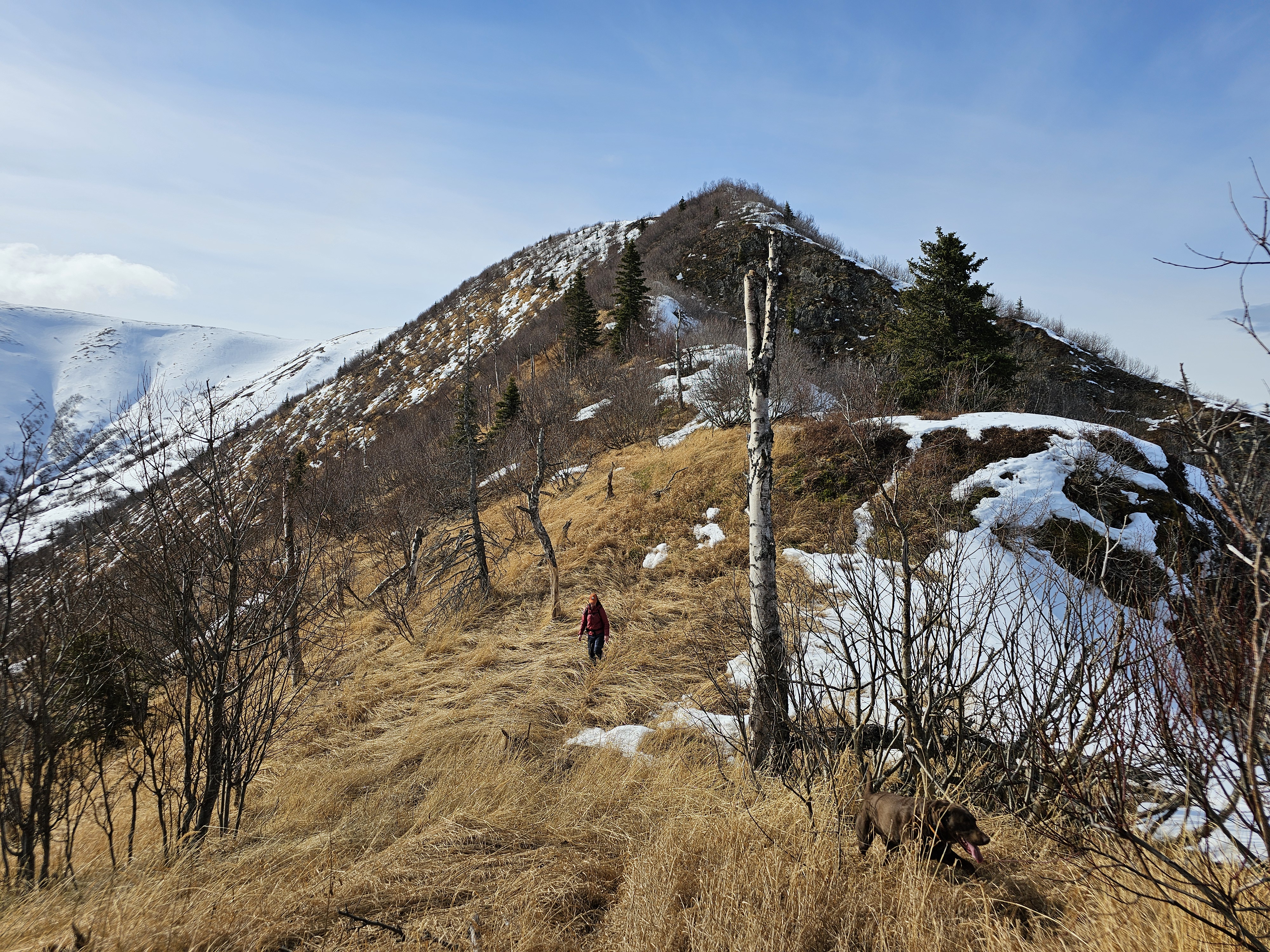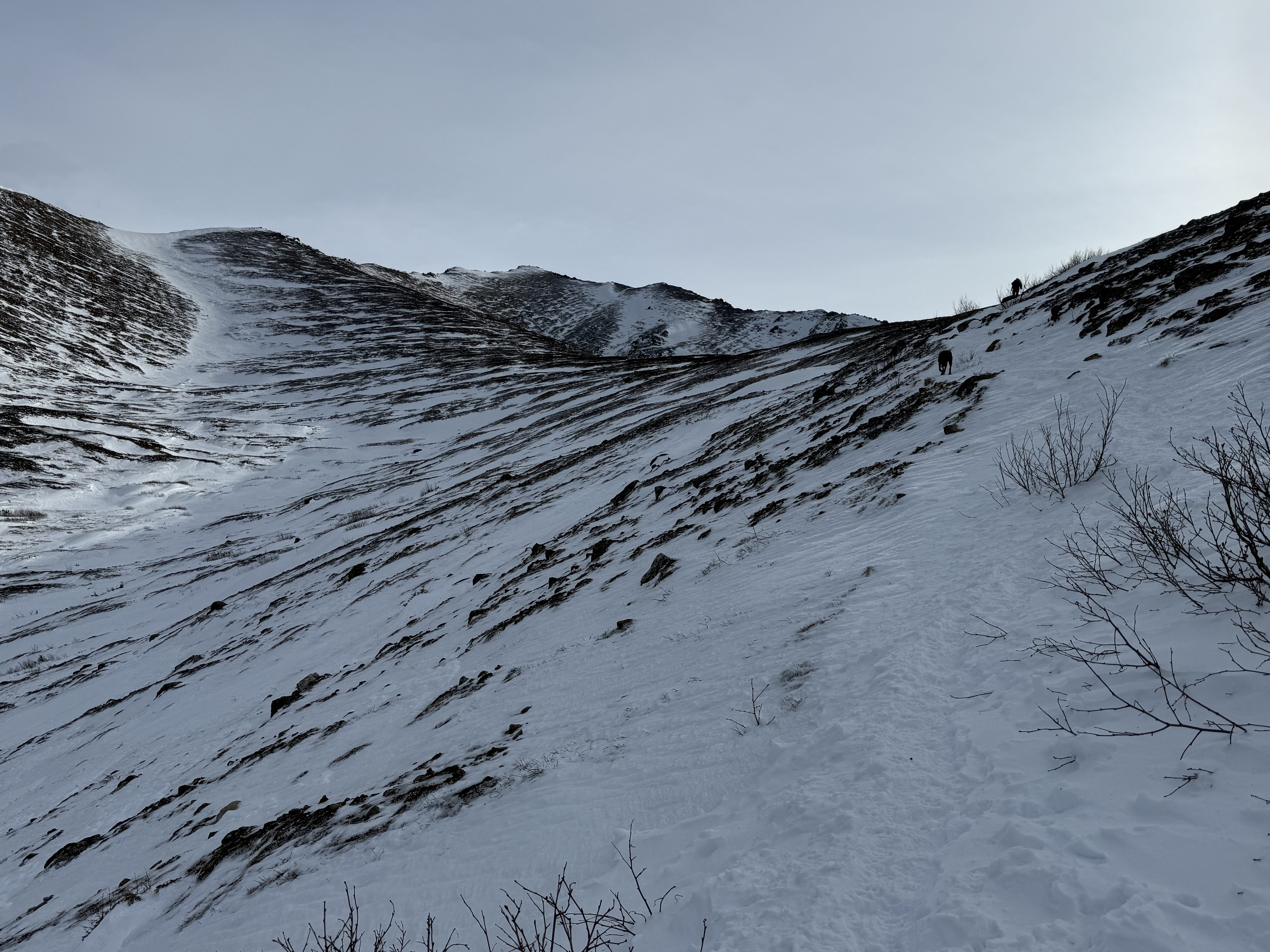 The sky continued to open up, and the little blue patch grew. We spotted a small cabin down in Snow Hawk Valley. I’ve heard of people using it, but since it’s on JBER land where overnight stays aren’t permitted, I haven’t found any official resources explaining how to legally use the shelter. I wouldn’t recommend attempting an overnight trip there without written permission from JBER officials—you don’t want to lose access to military land hikes.