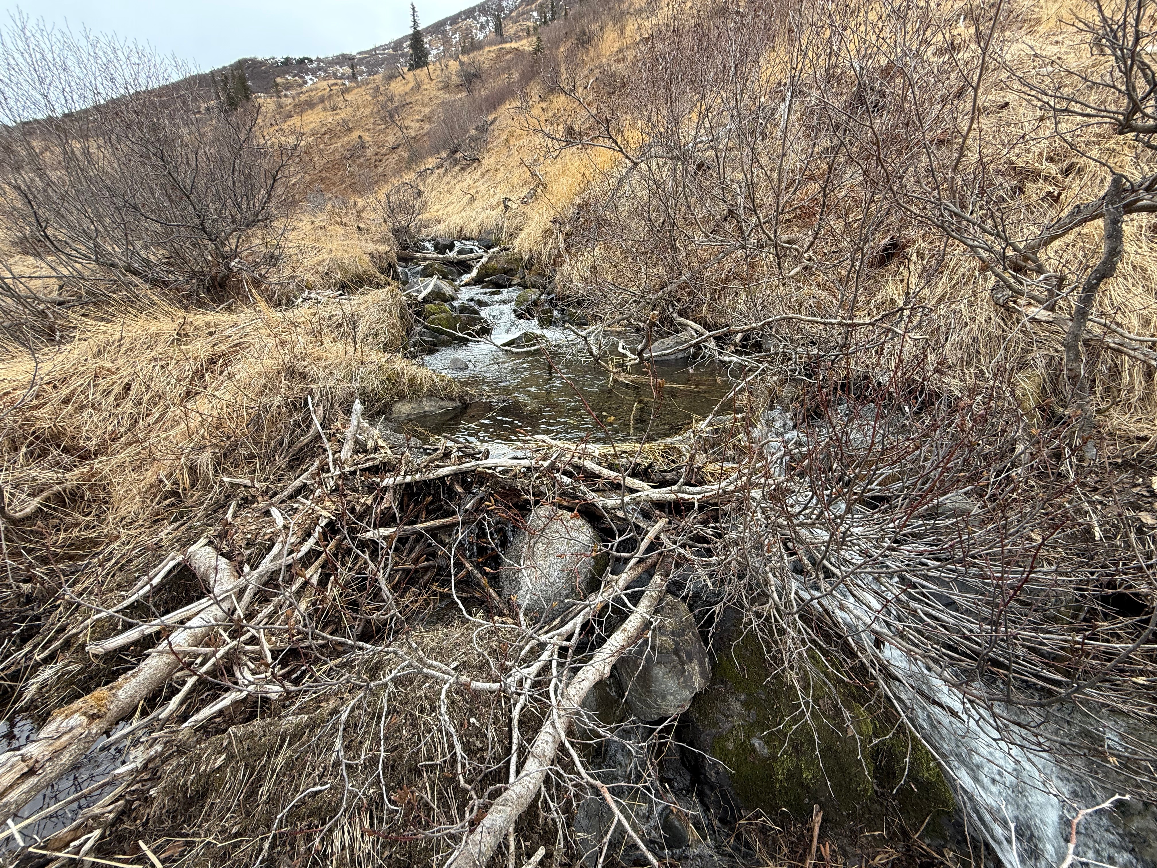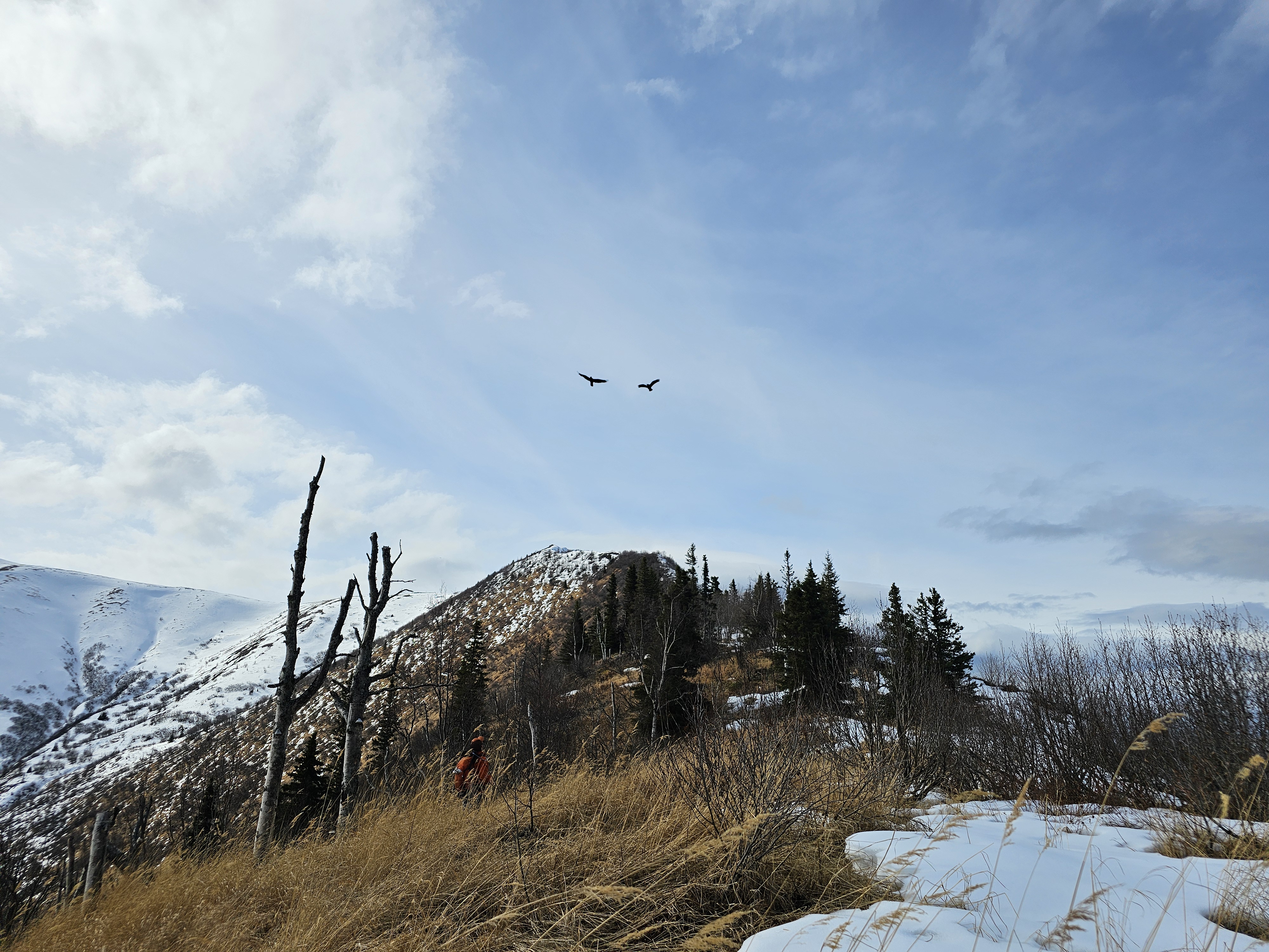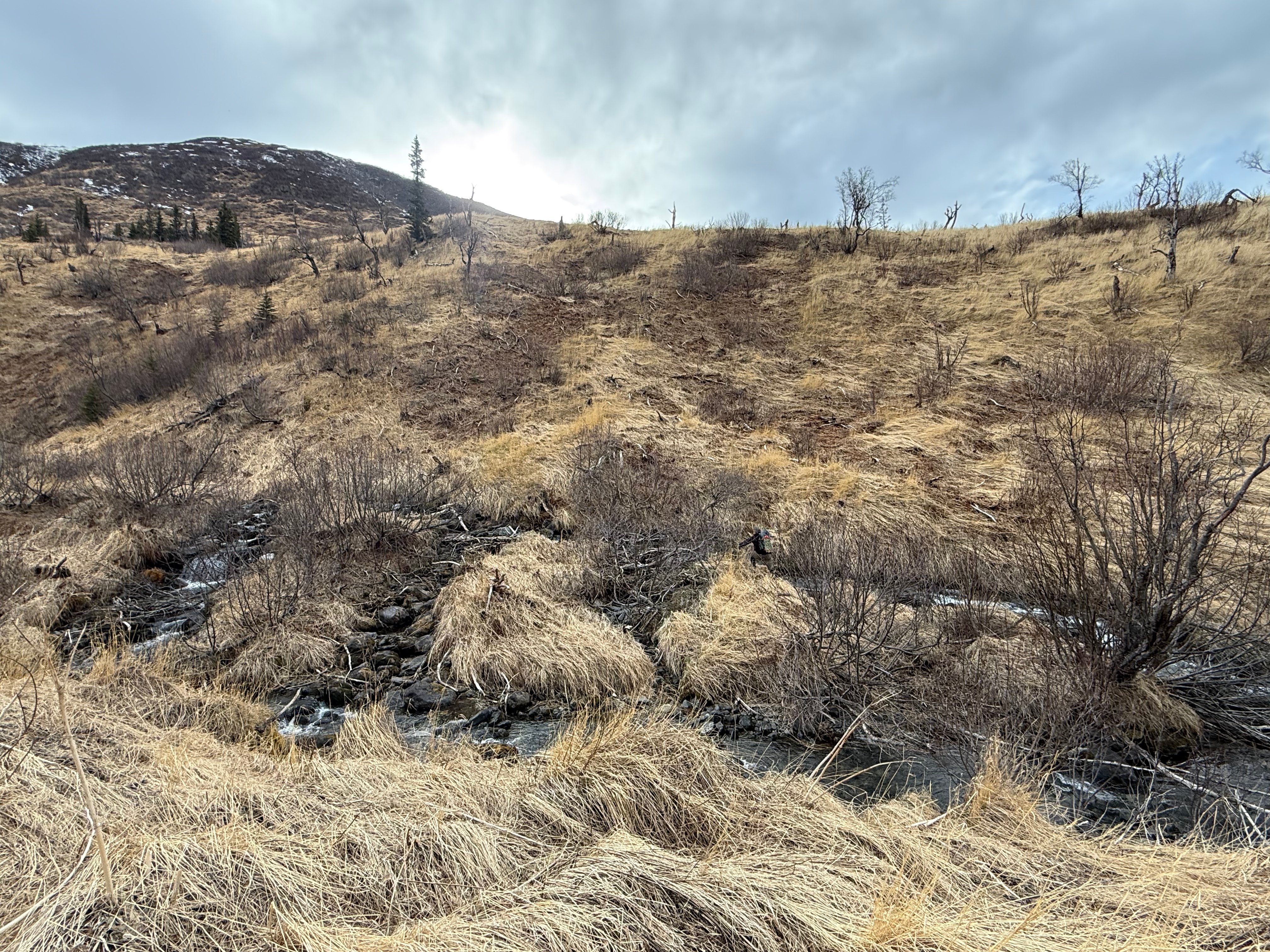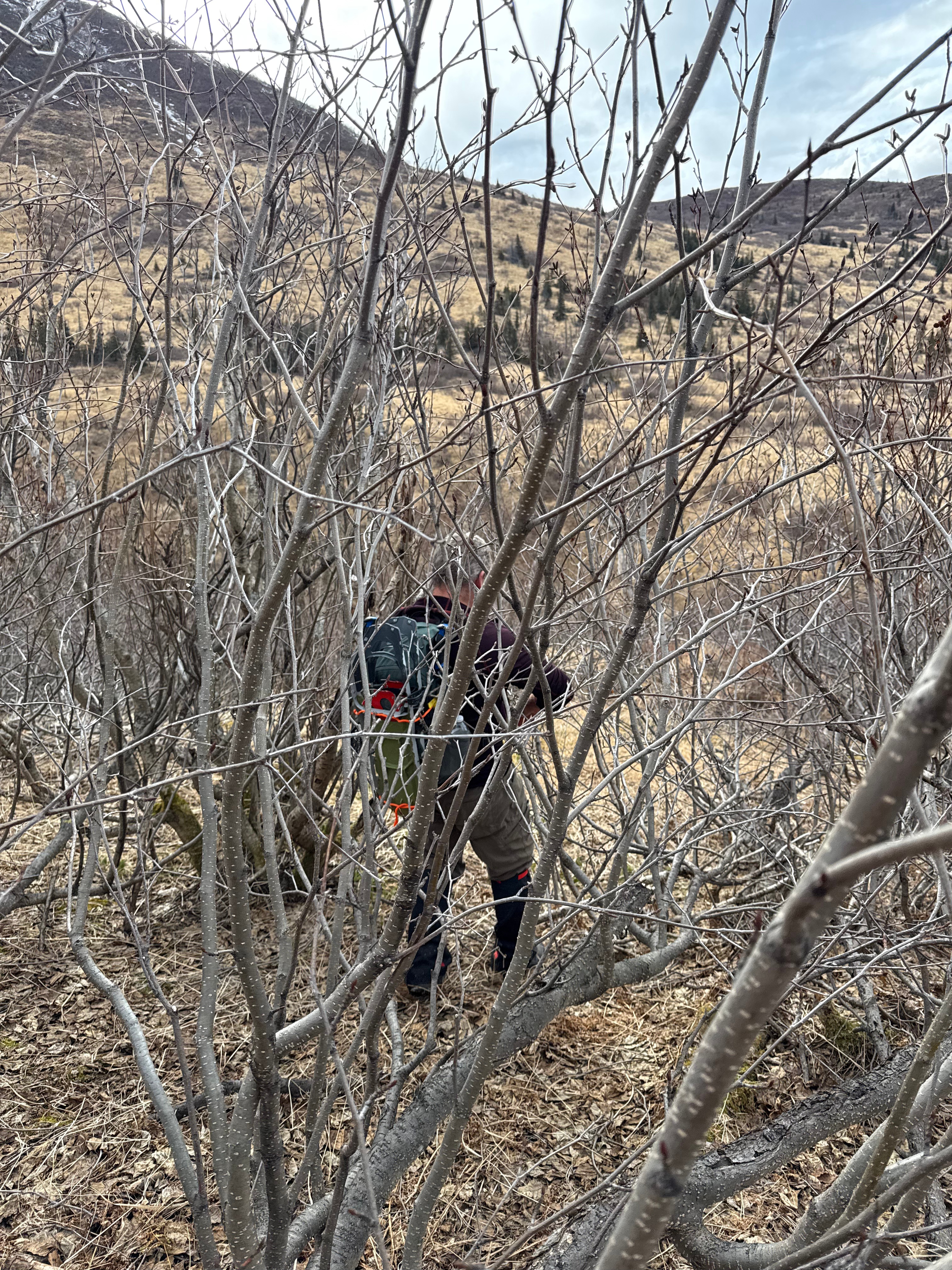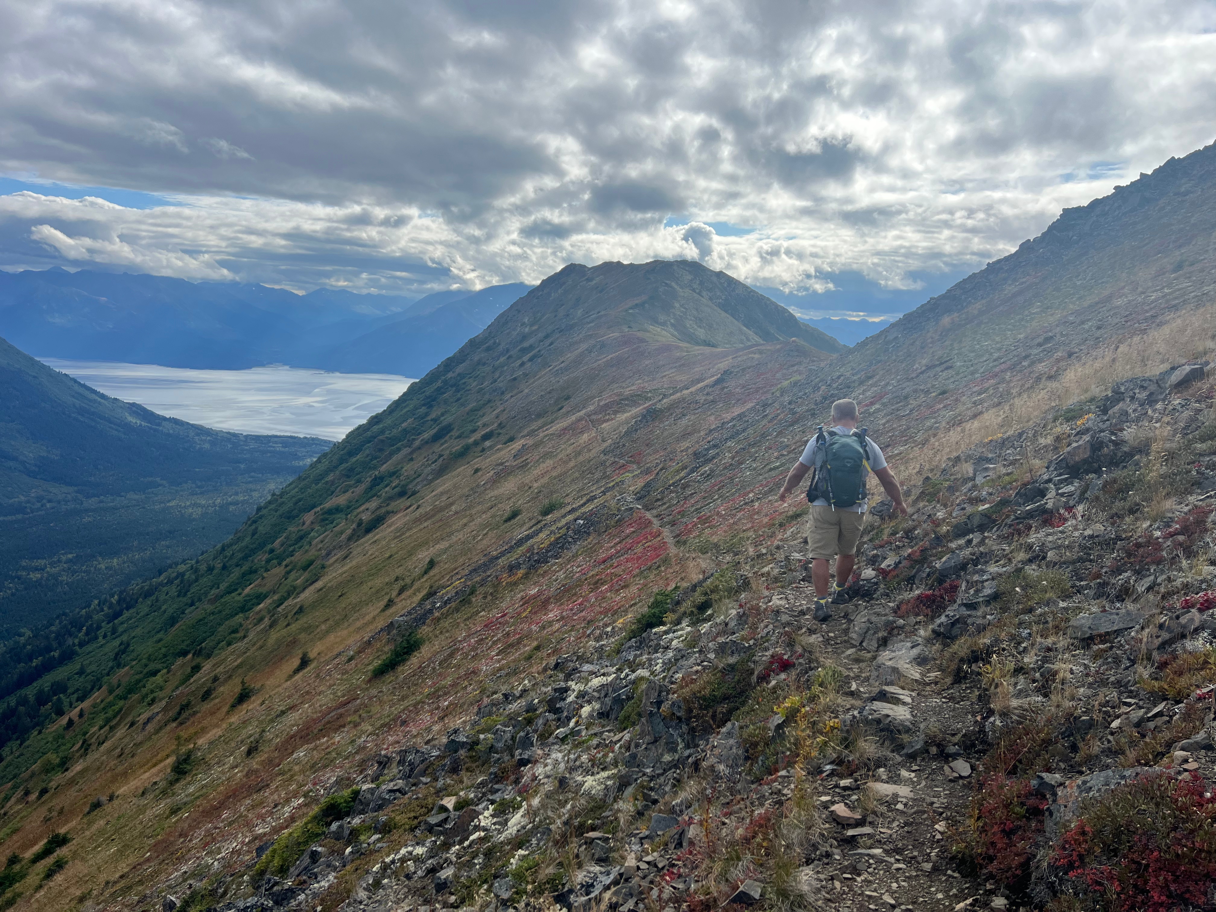 The sky continued to open up, and the little blue patch grew. We spotted a small cabin down in Snow Hawk Valley. I’ve heard of people using it, but since it’s on JBER land where overnight stays aren’t permitted, I haven’t found any official resources explaining how to legally use the shelter. I wouldn’t recommend attempting an overnight trip there without written permission from JBER officials—you don’t want to lose access to military land hikes.