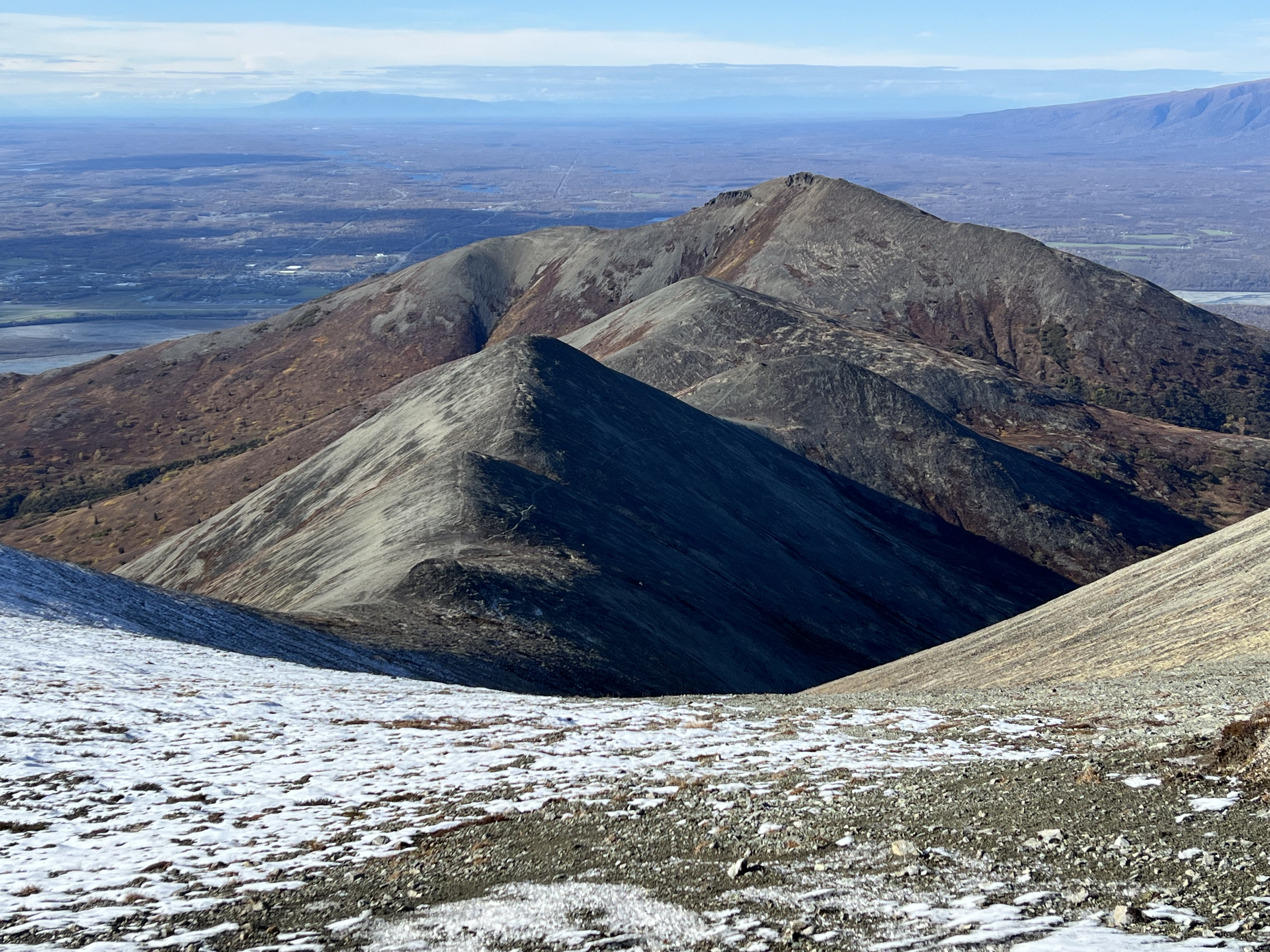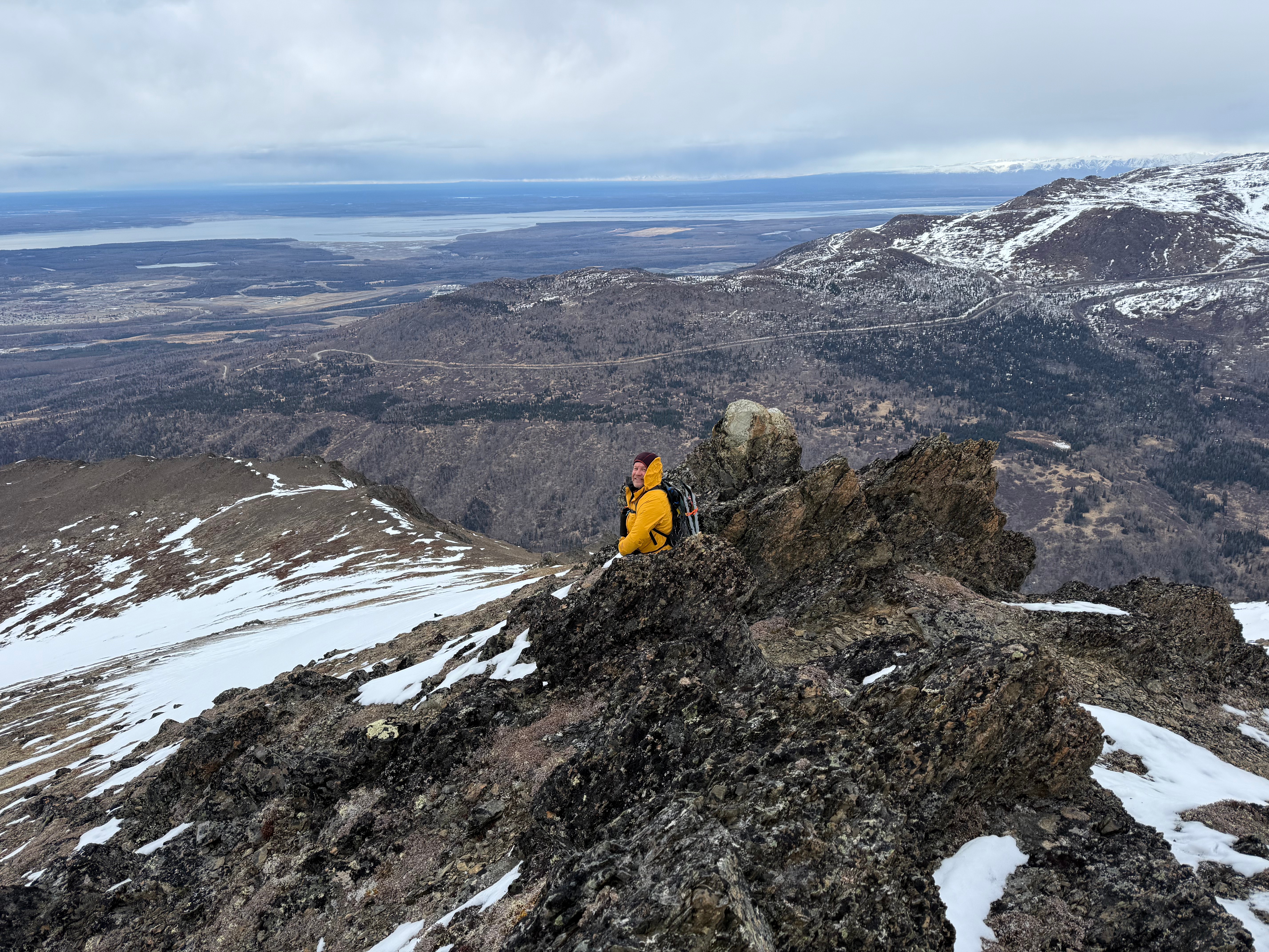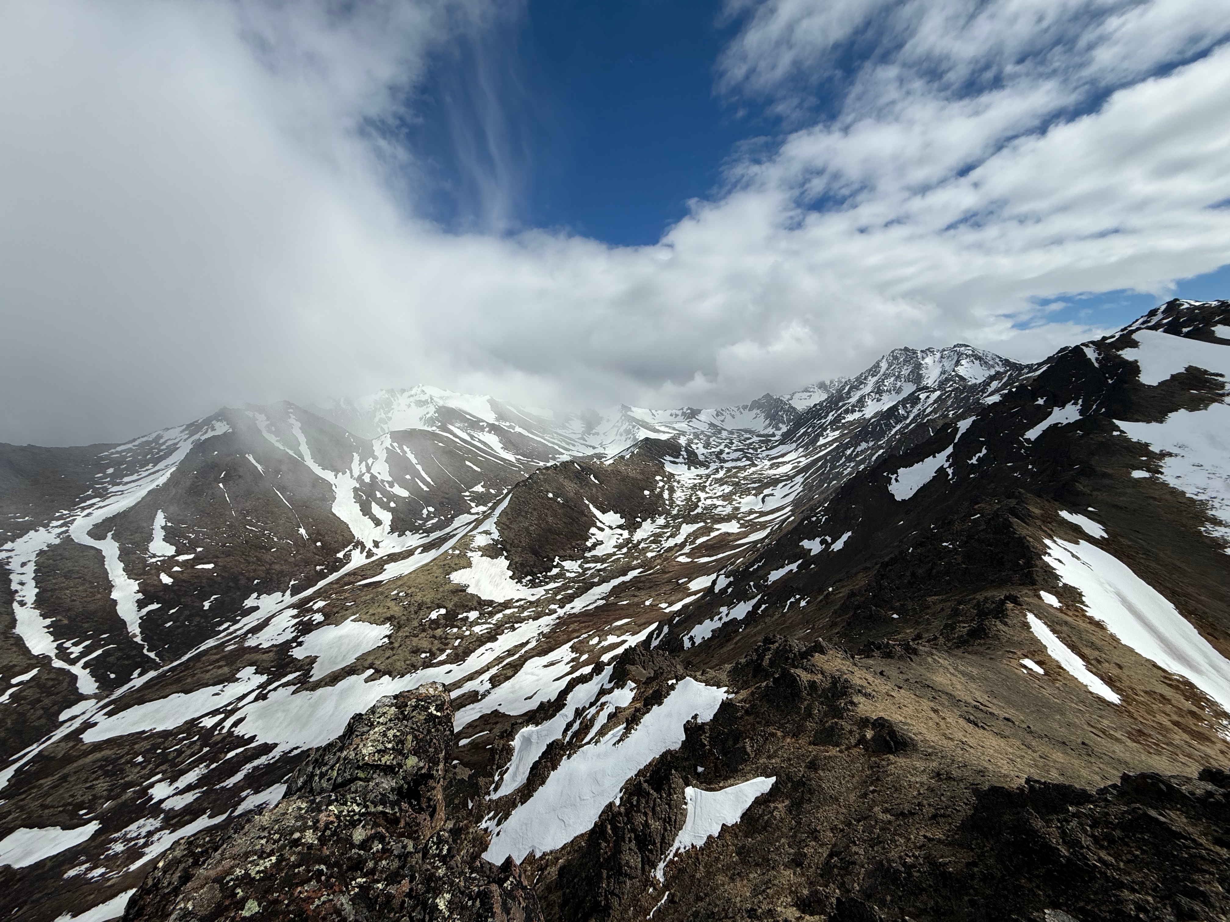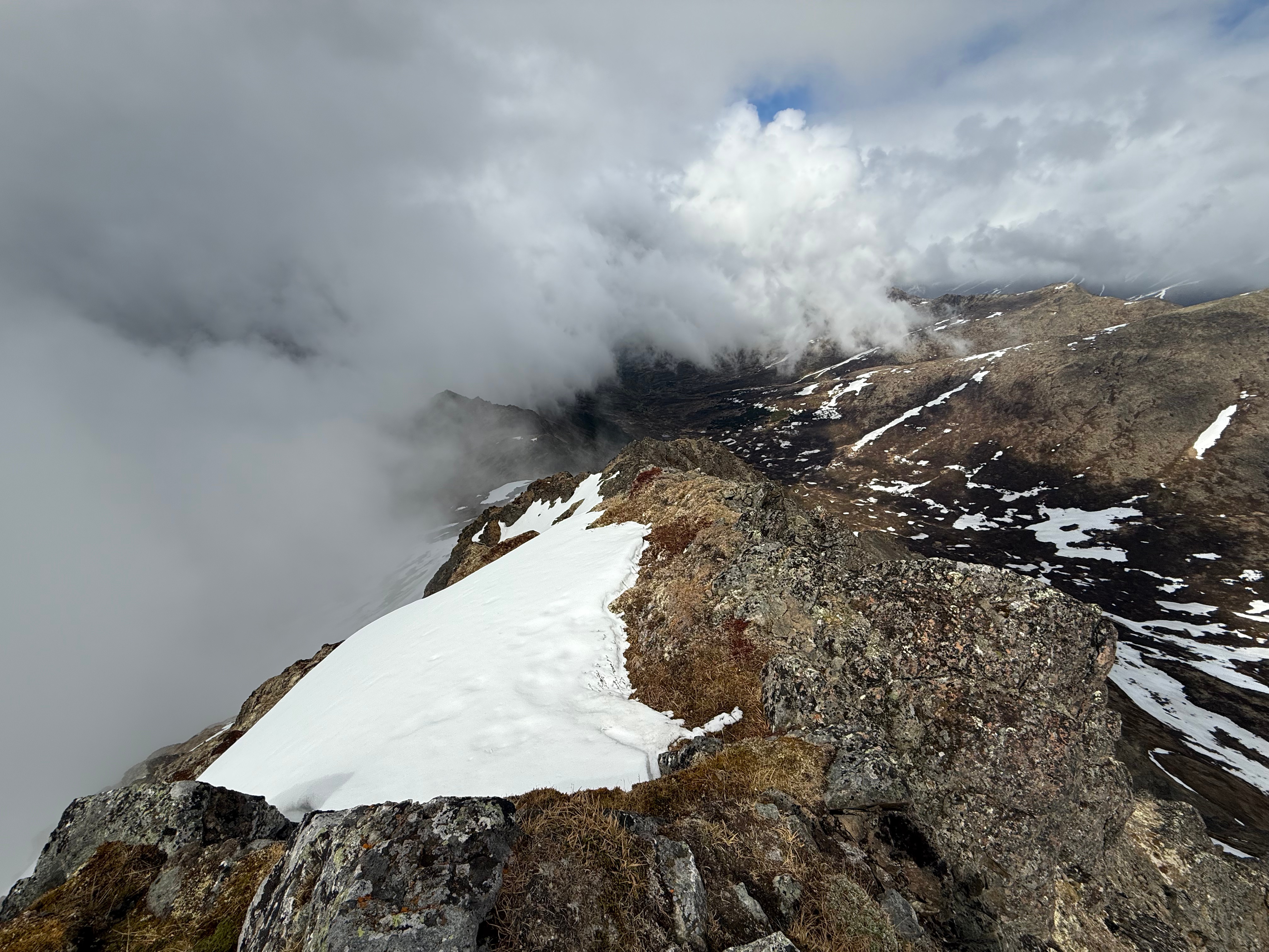 While walking the ridge toward Kanchee, I stopped to add snow to my water bladder—2 liters wouldn’t cut it for a 15-mile hike. I took a long swig of ice-cold water just as one final snow squall passed over us. We climbed over a small rock outcropping, and then the sky began to brighten. A patch of blue appeared, and the clouds below us rose, revealing all of Snow Hawk Valley. Peaks 1216 and Ship Creek Hill came into view, sparking fond memories of our recent hike there in gale-force winds.