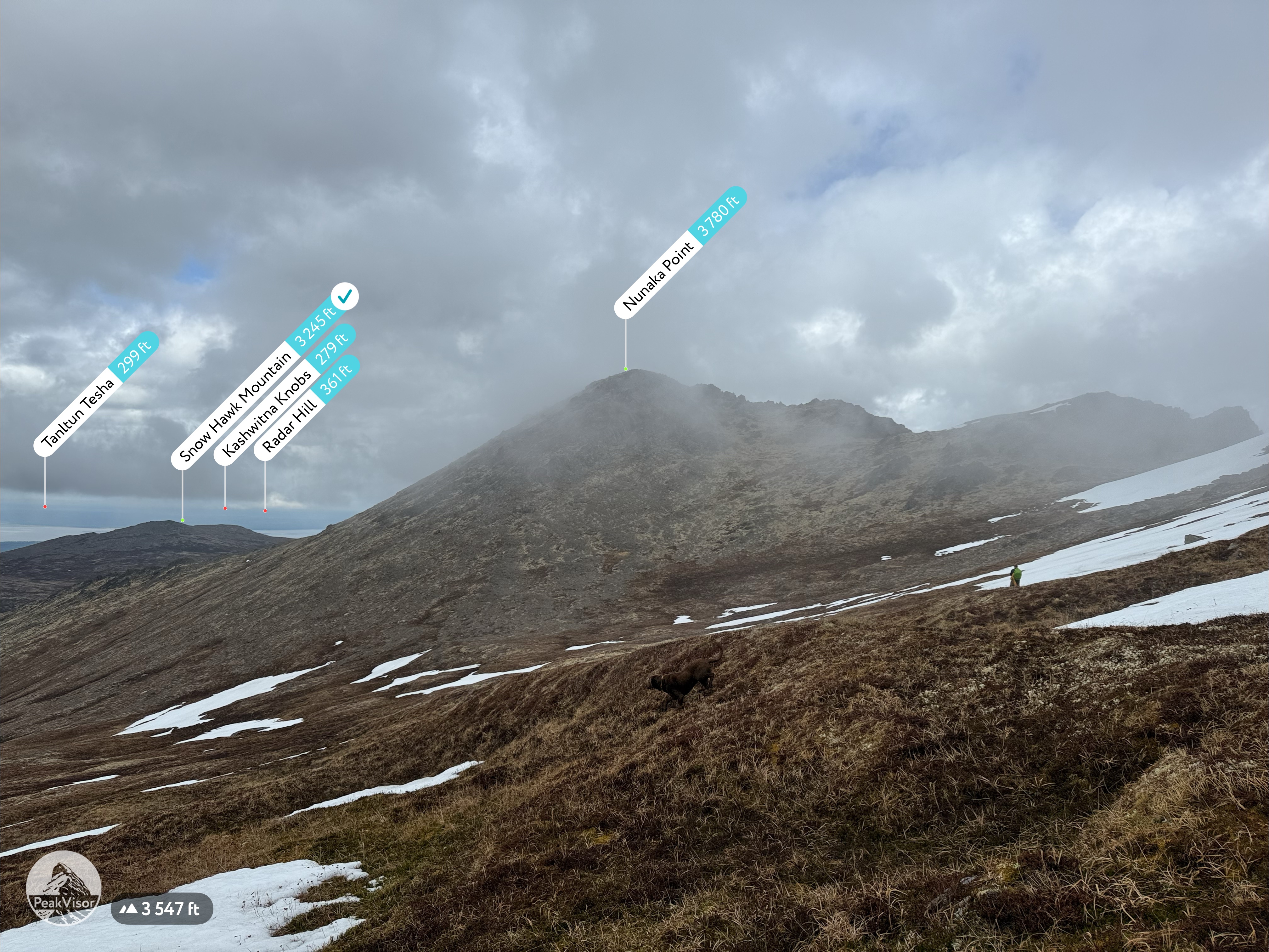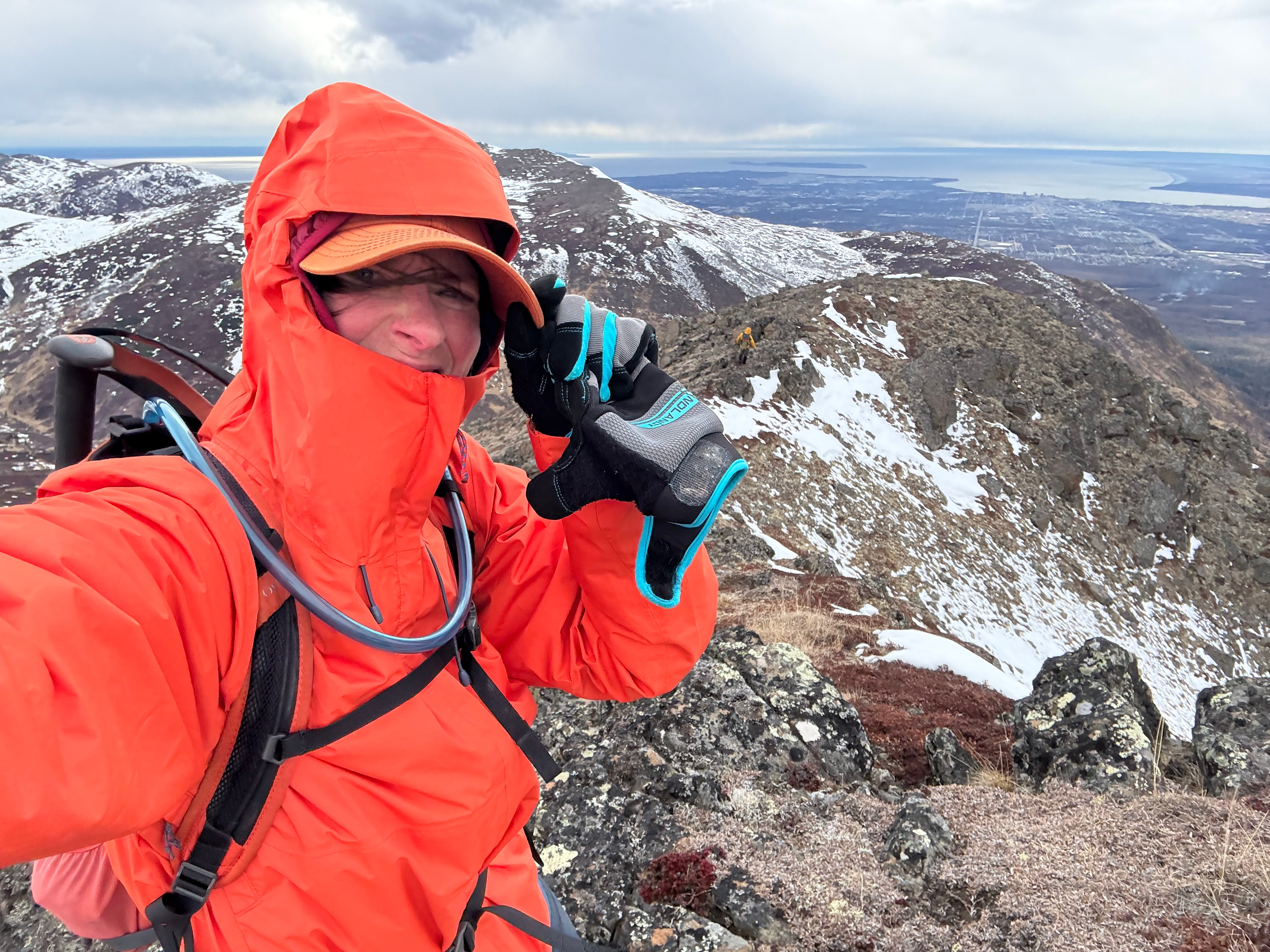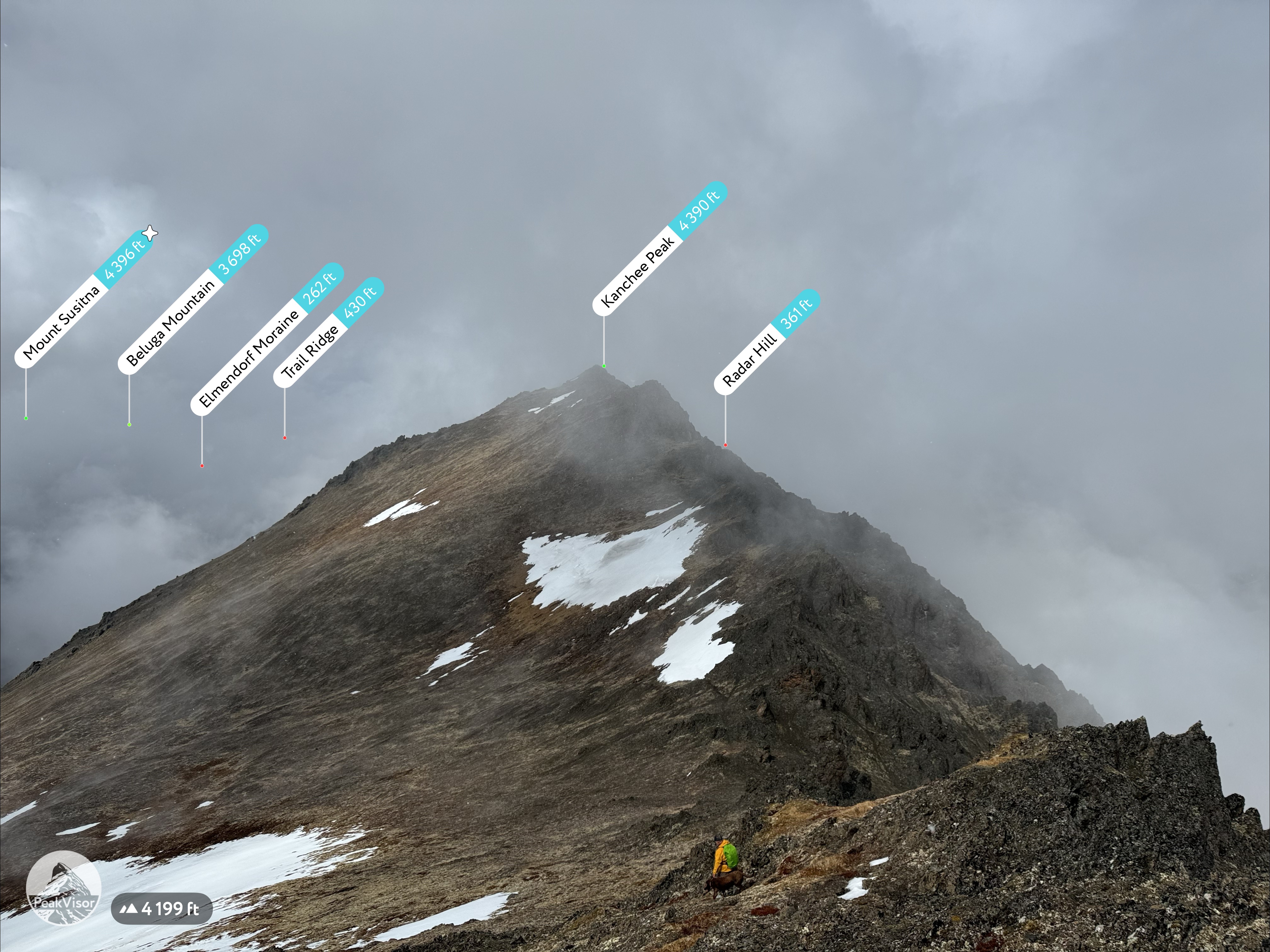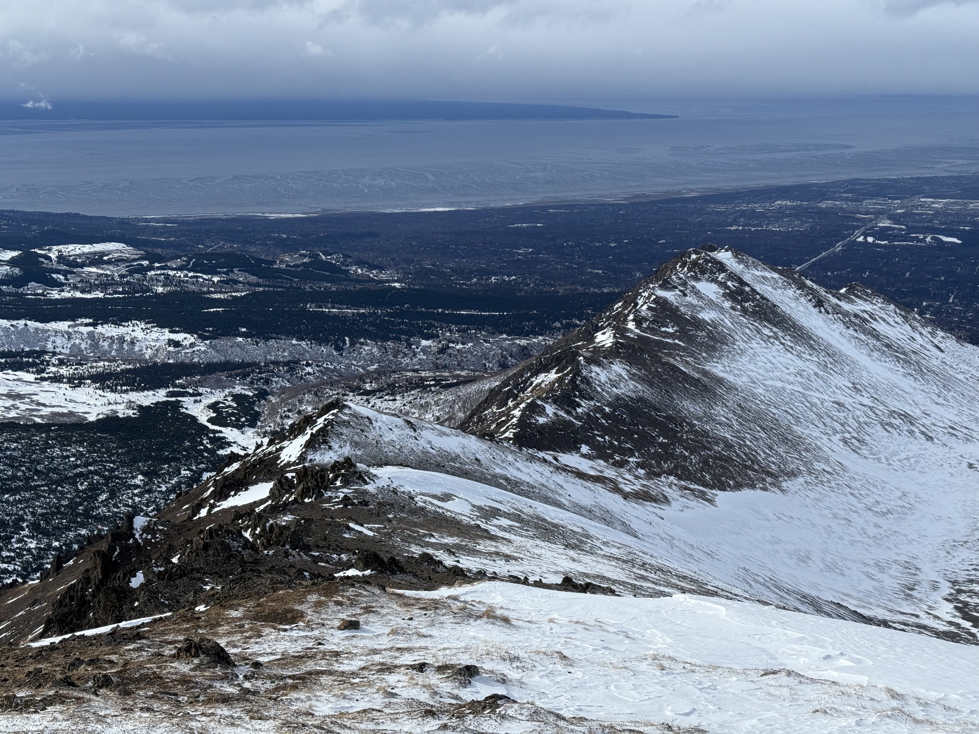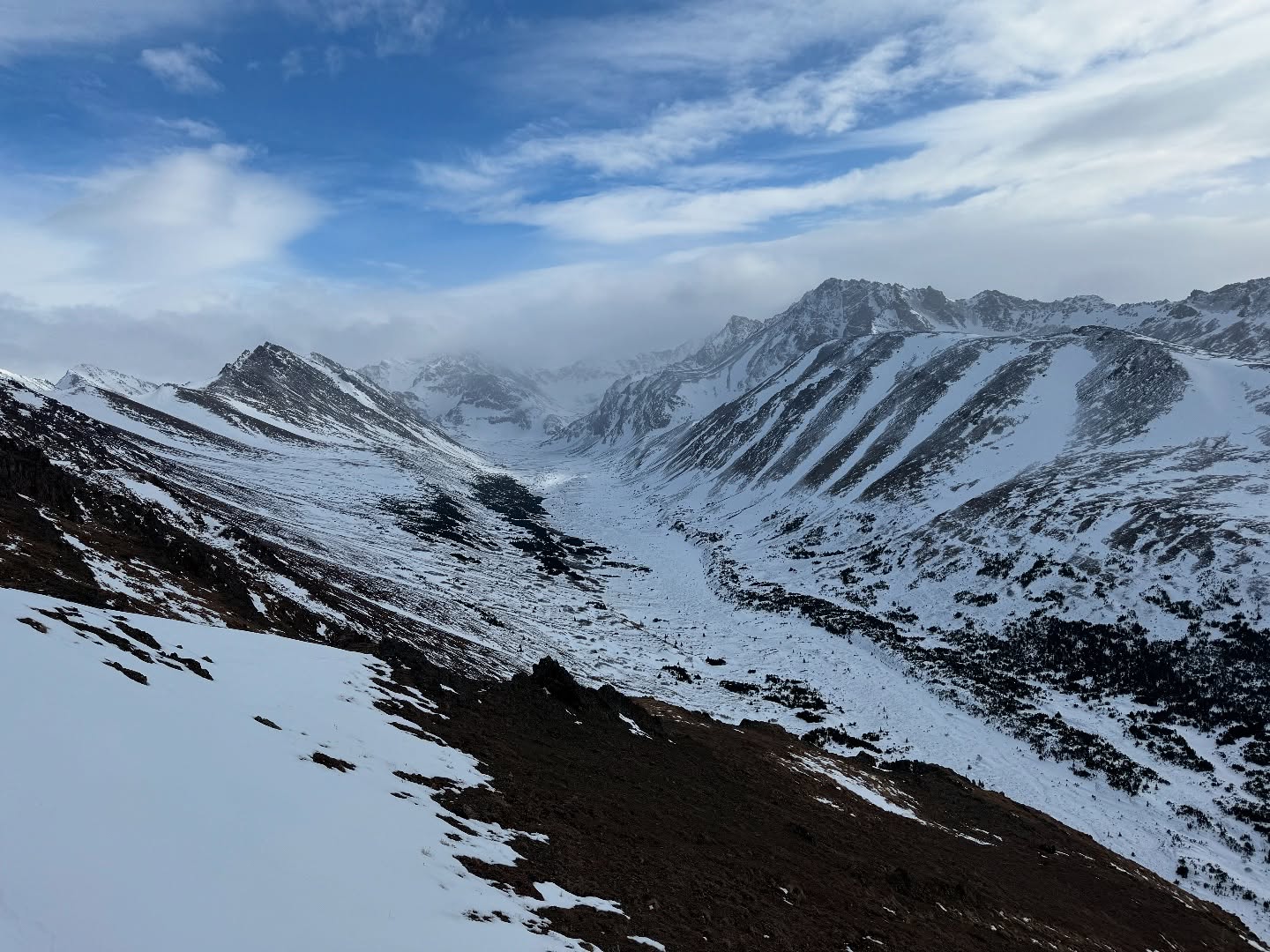 While walking the ridge toward Kanchee, I stopped to add snow to my water bladder—2 liters wouldn’t cut it for a 15-mile hike. I took a long swig of ice-cold water just as one final snow squall passed over us. We climbed over a small rock outcropping, and then the sky began to brighten. A patch of blue appeared, and the clouds below us rose, revealing all of Snow Hawk Valley. Peaks 1216 and Ship Creek Hill came into view, sparking fond memories of our recent hike there in gale-force winds.