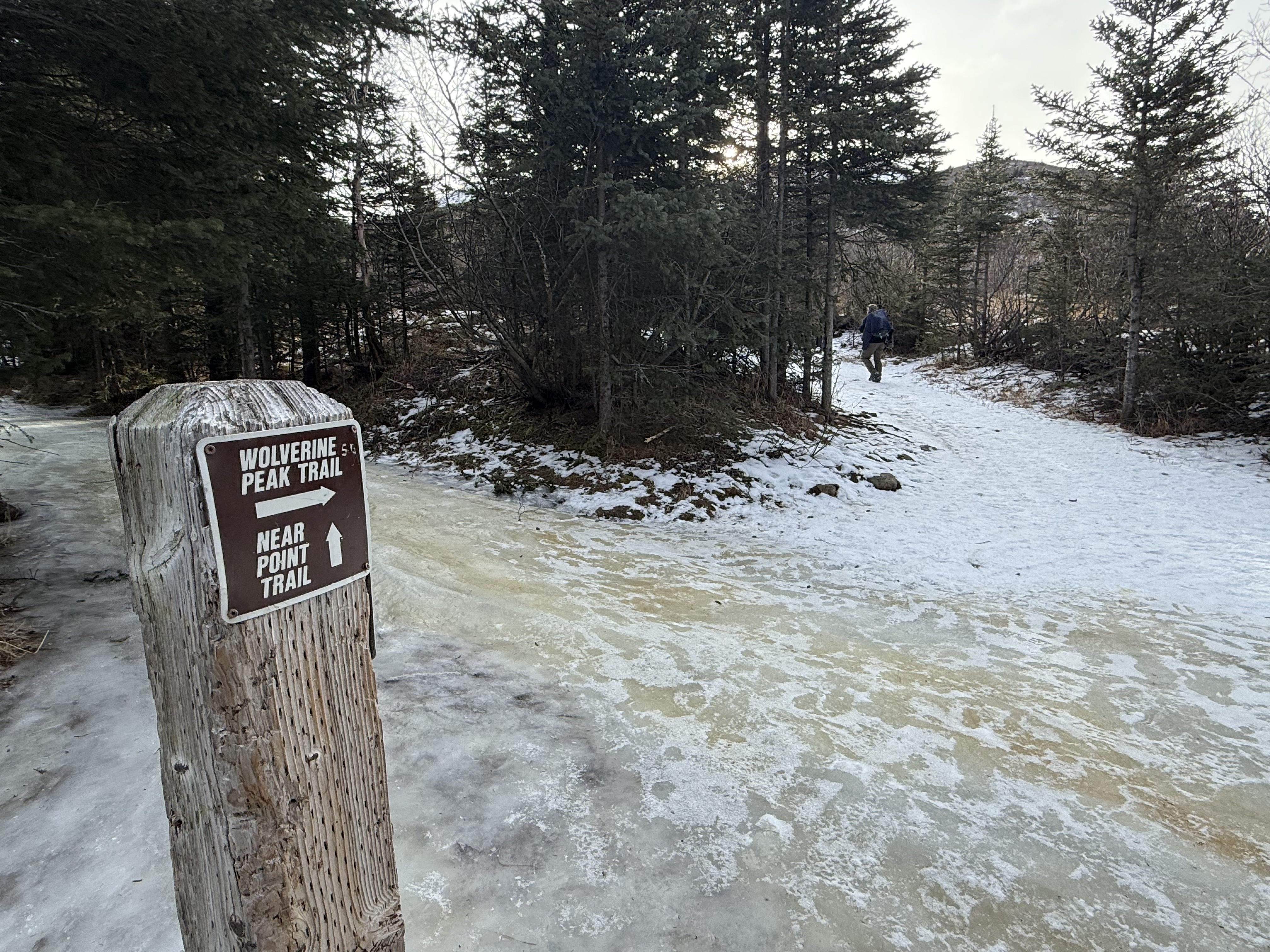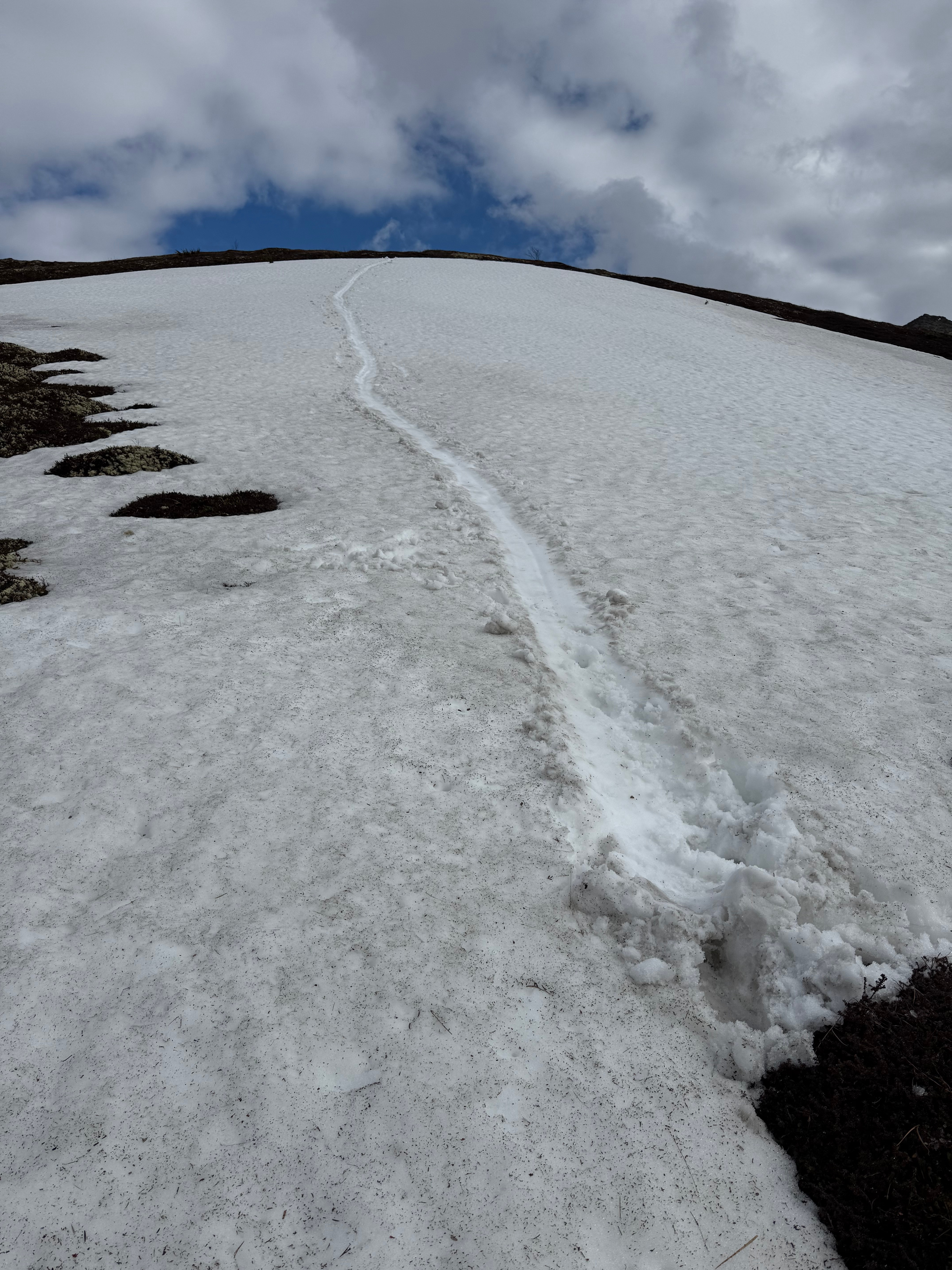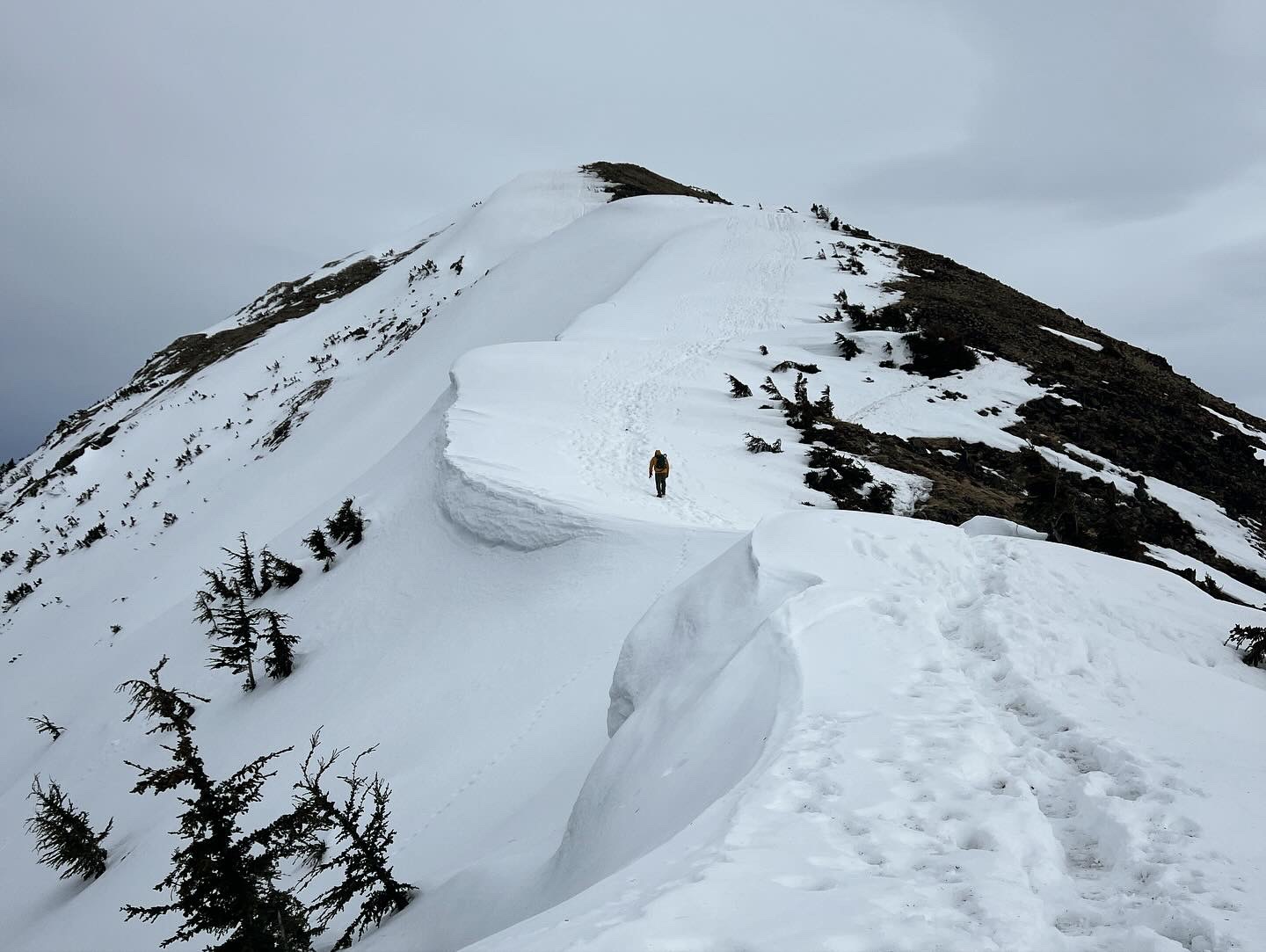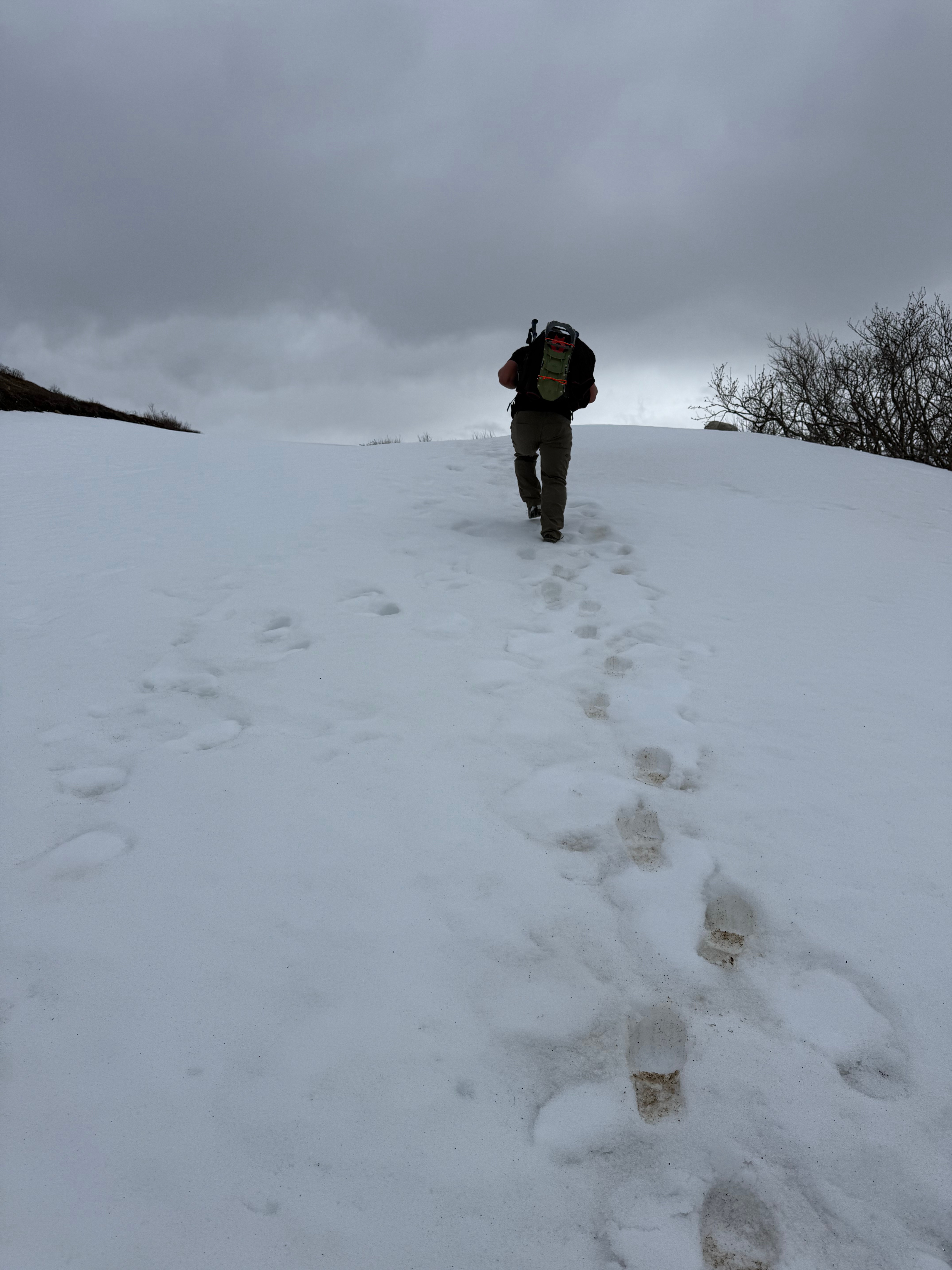 One last summit selfie, and then we descended the ridge toward Snow Hawk Road. It was an uneventful descent—except for Jason finding a nice pocketknife and me discovering a great snow slide.