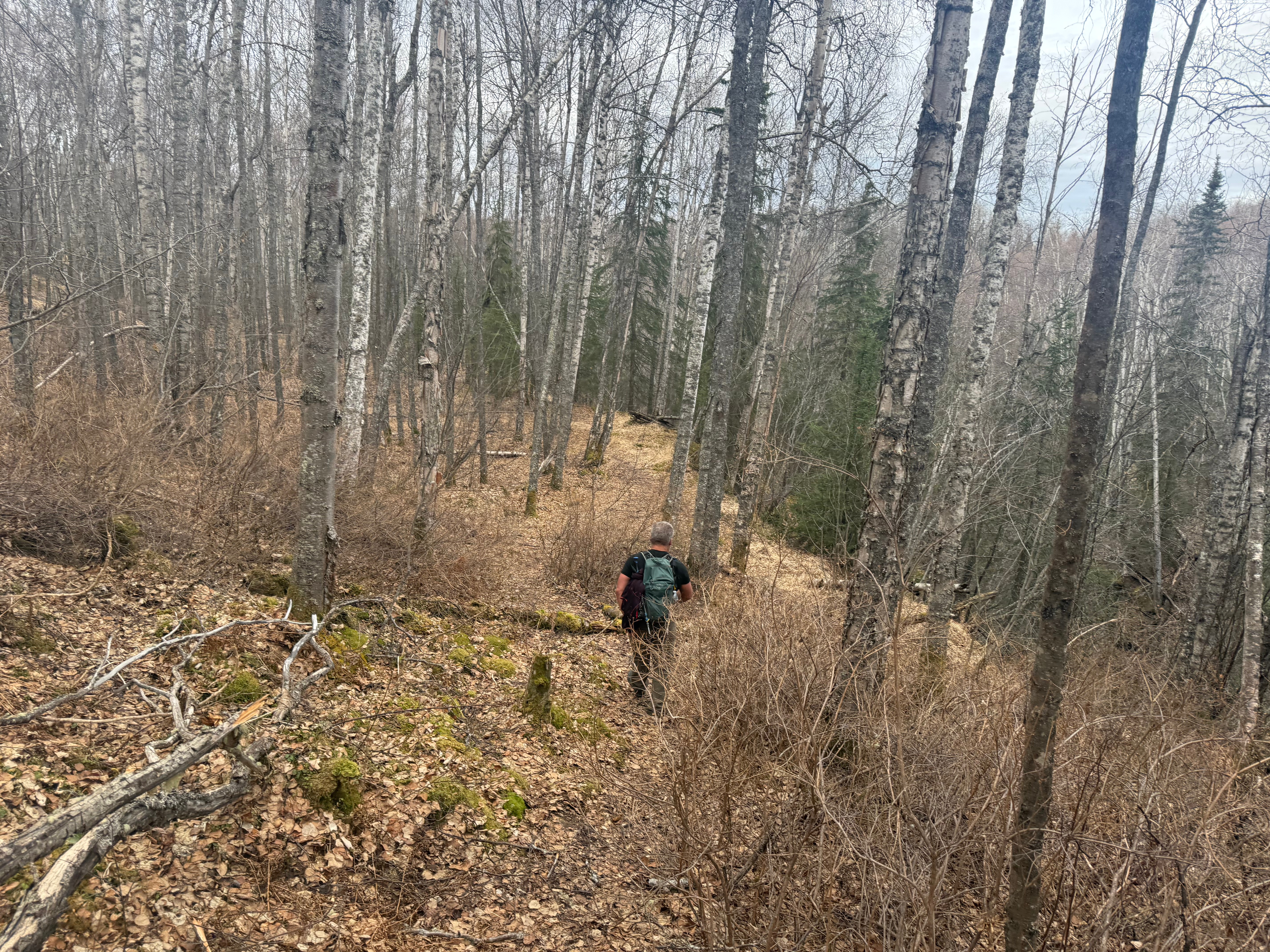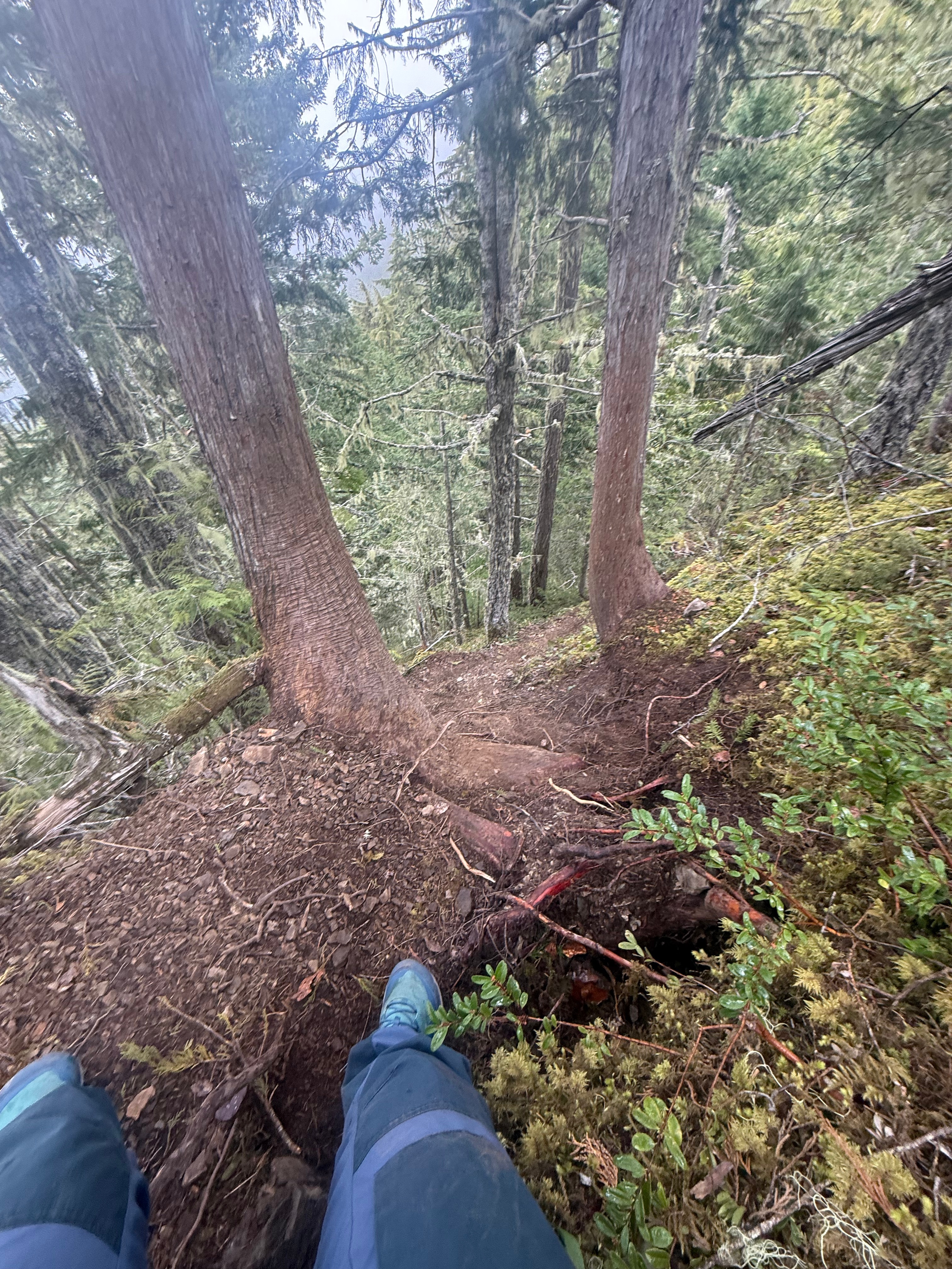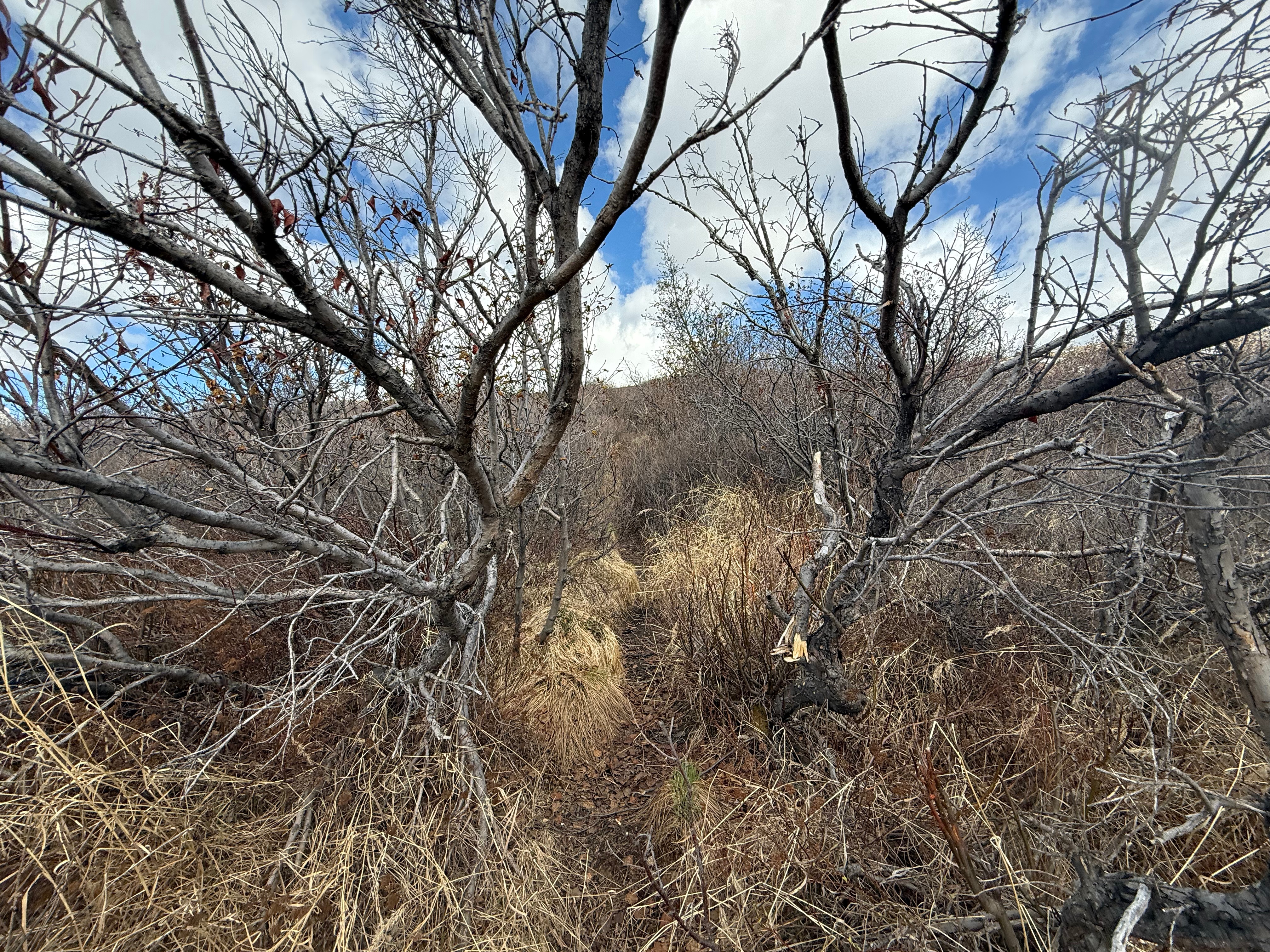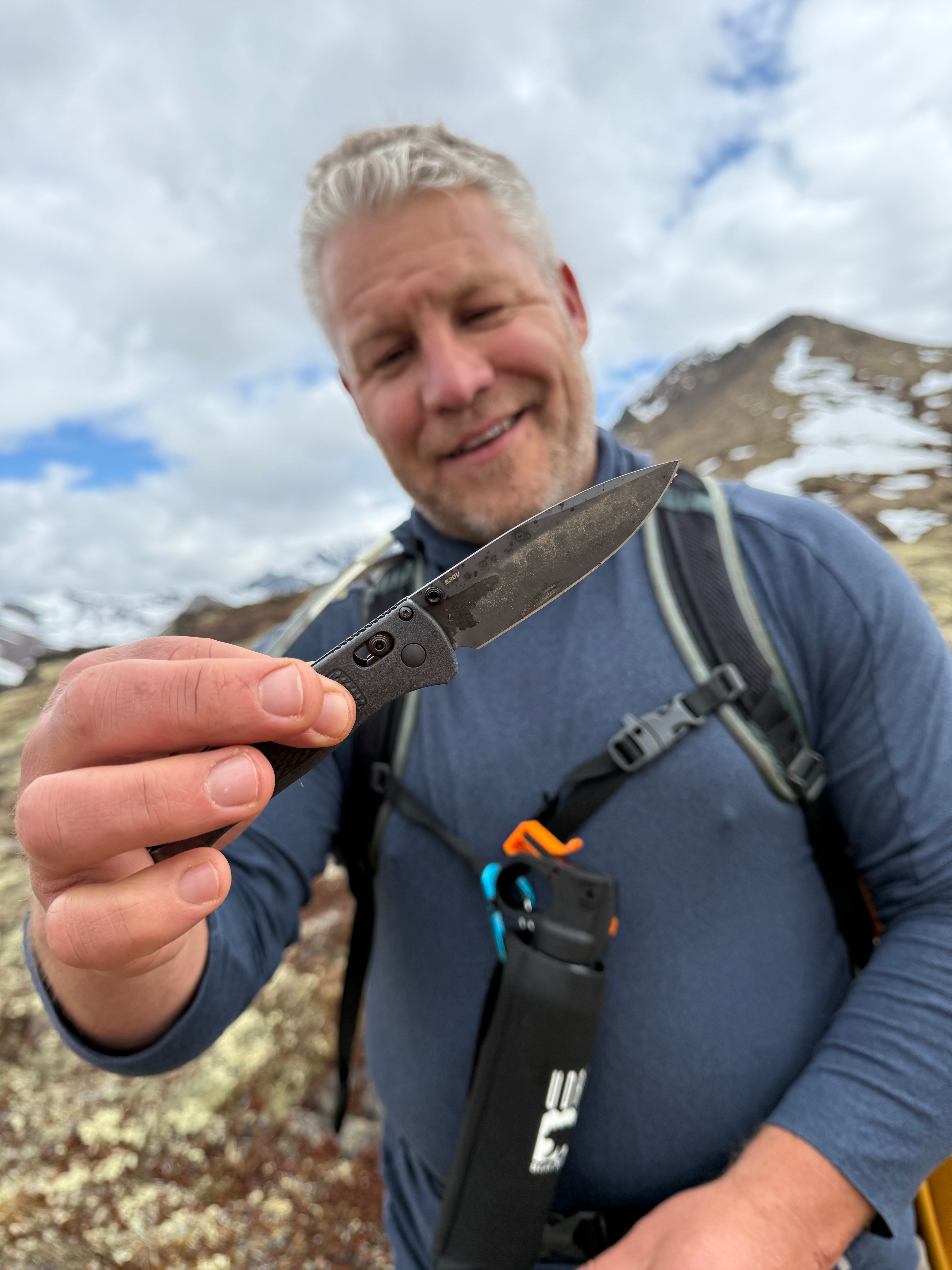 One last summit selfie, and then we descended the ridge toward Snow Hawk Road. It was an uneventful descent—except for Jason finding a nice pocketknife and me discovering a great snow slide.