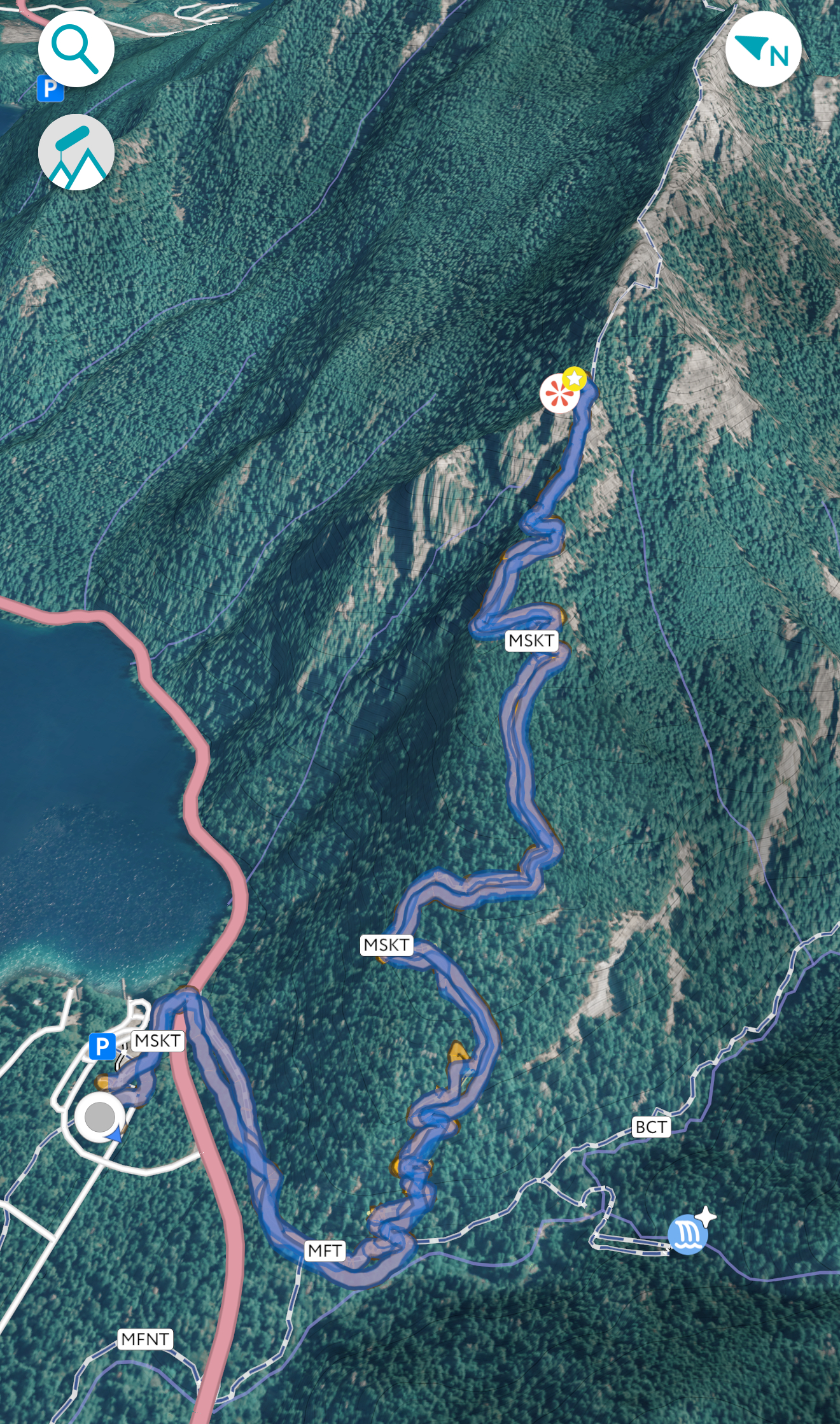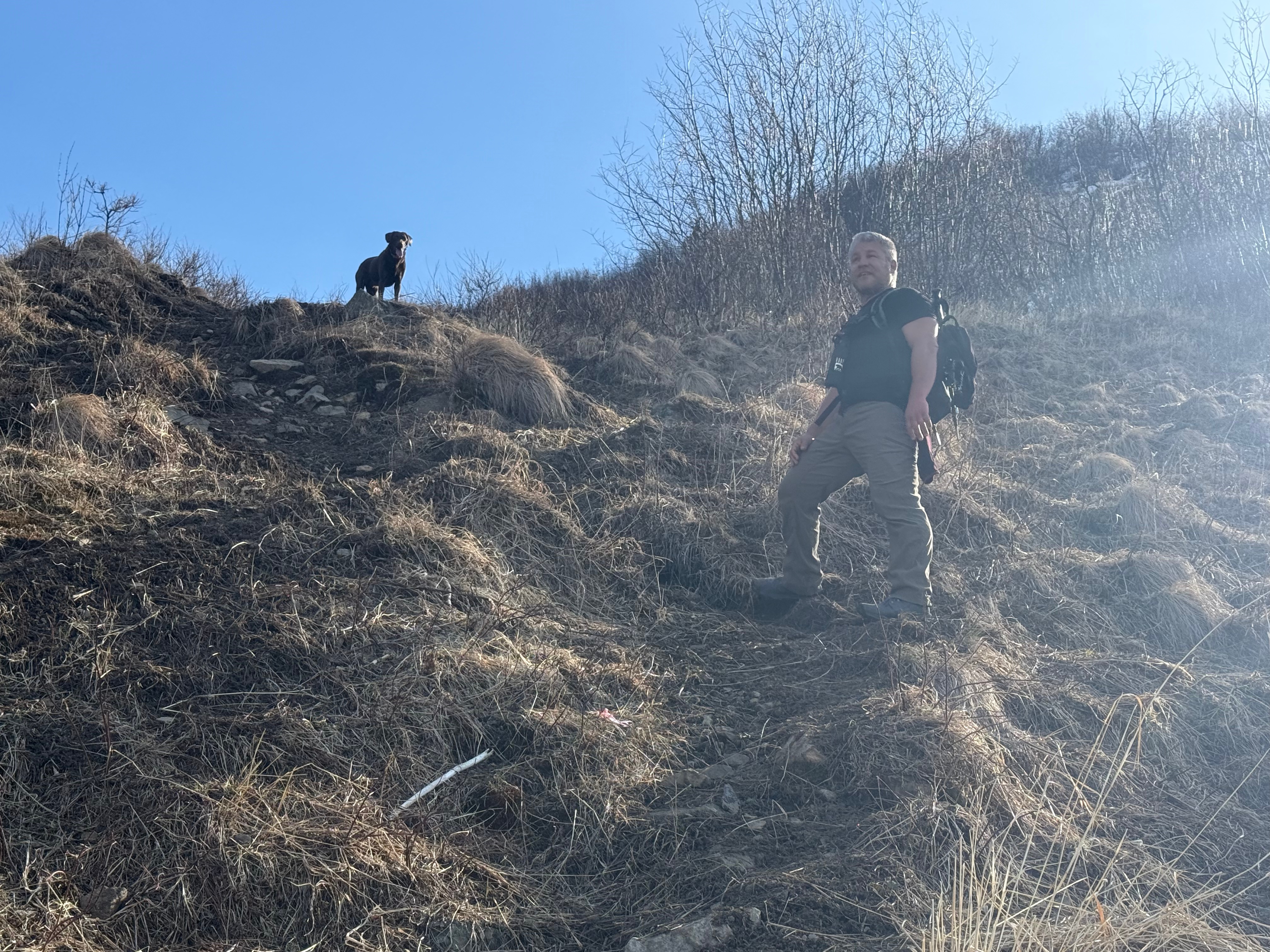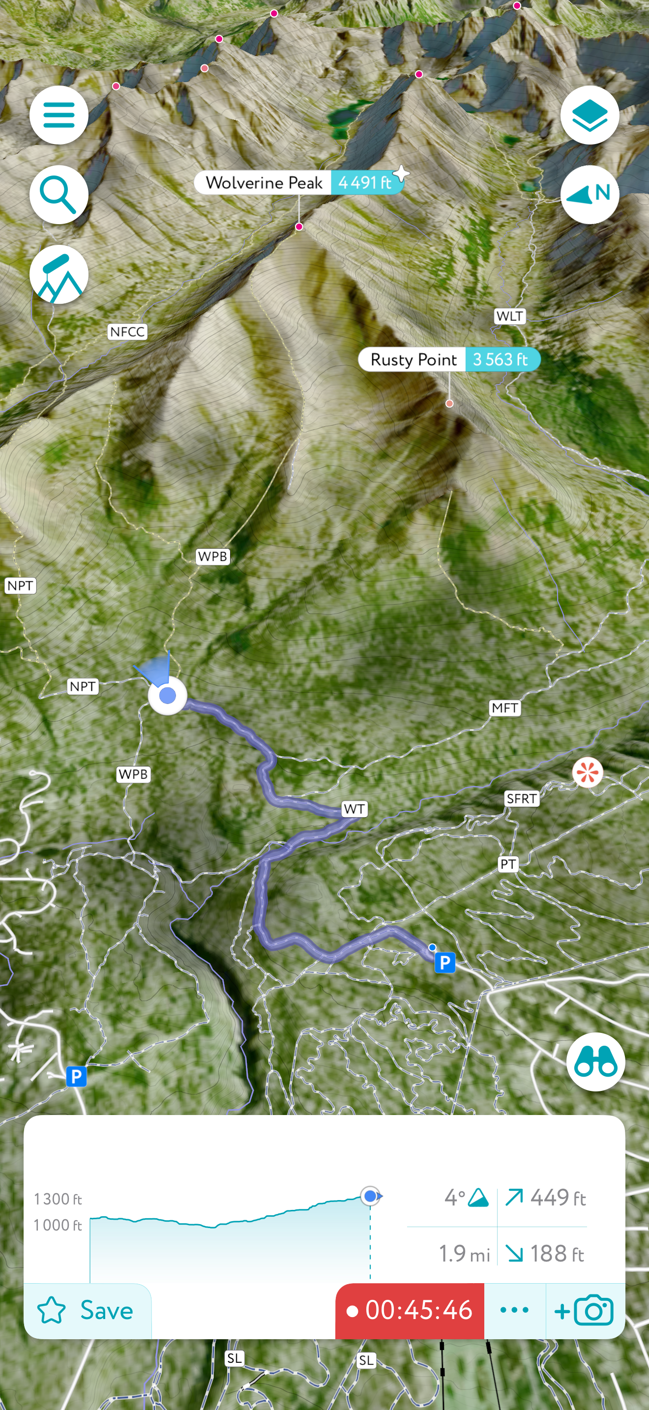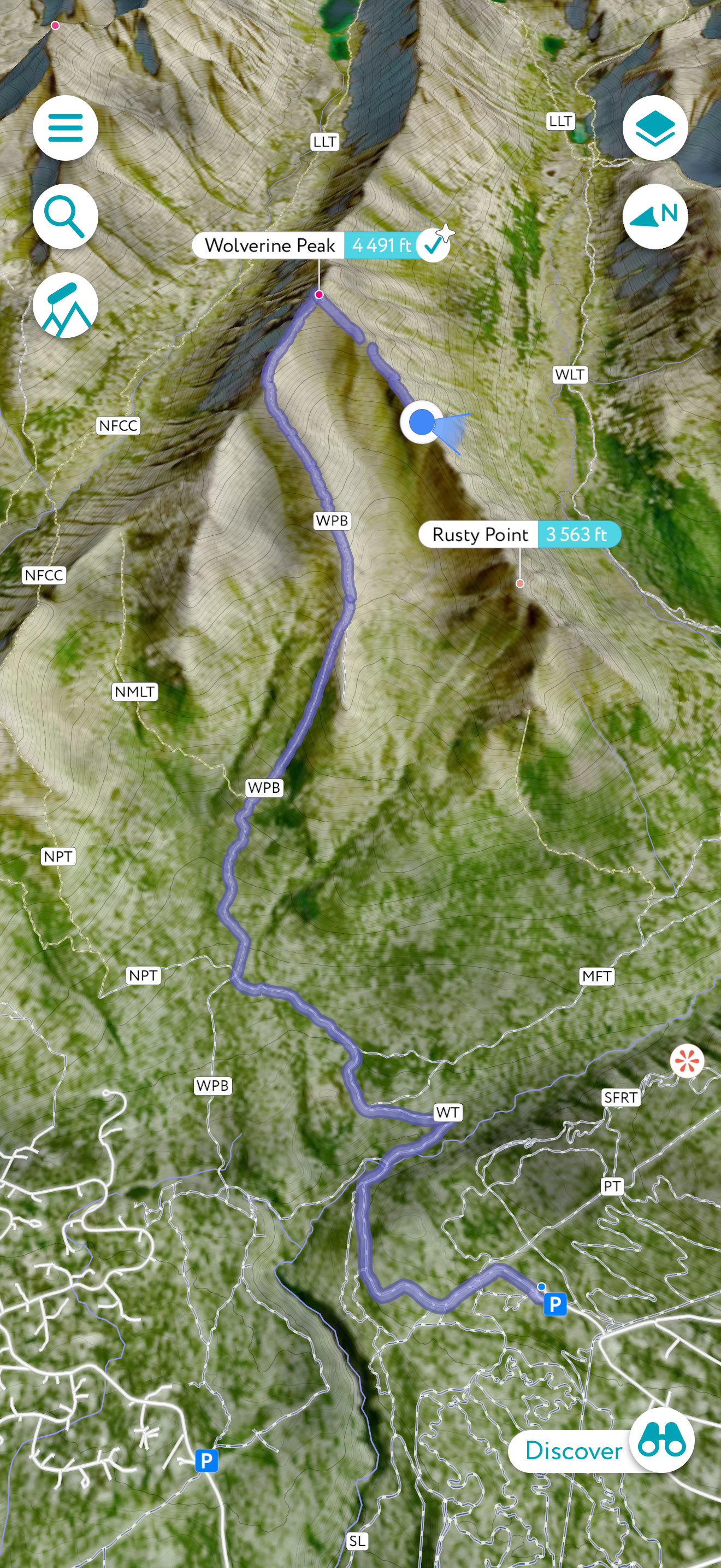 One last summit selfie, and then we descended the ridge toward Snow Hawk Road. It was an uneventful descent—except for Jason finding a nice pocketknife and me discovering a great snow slide.