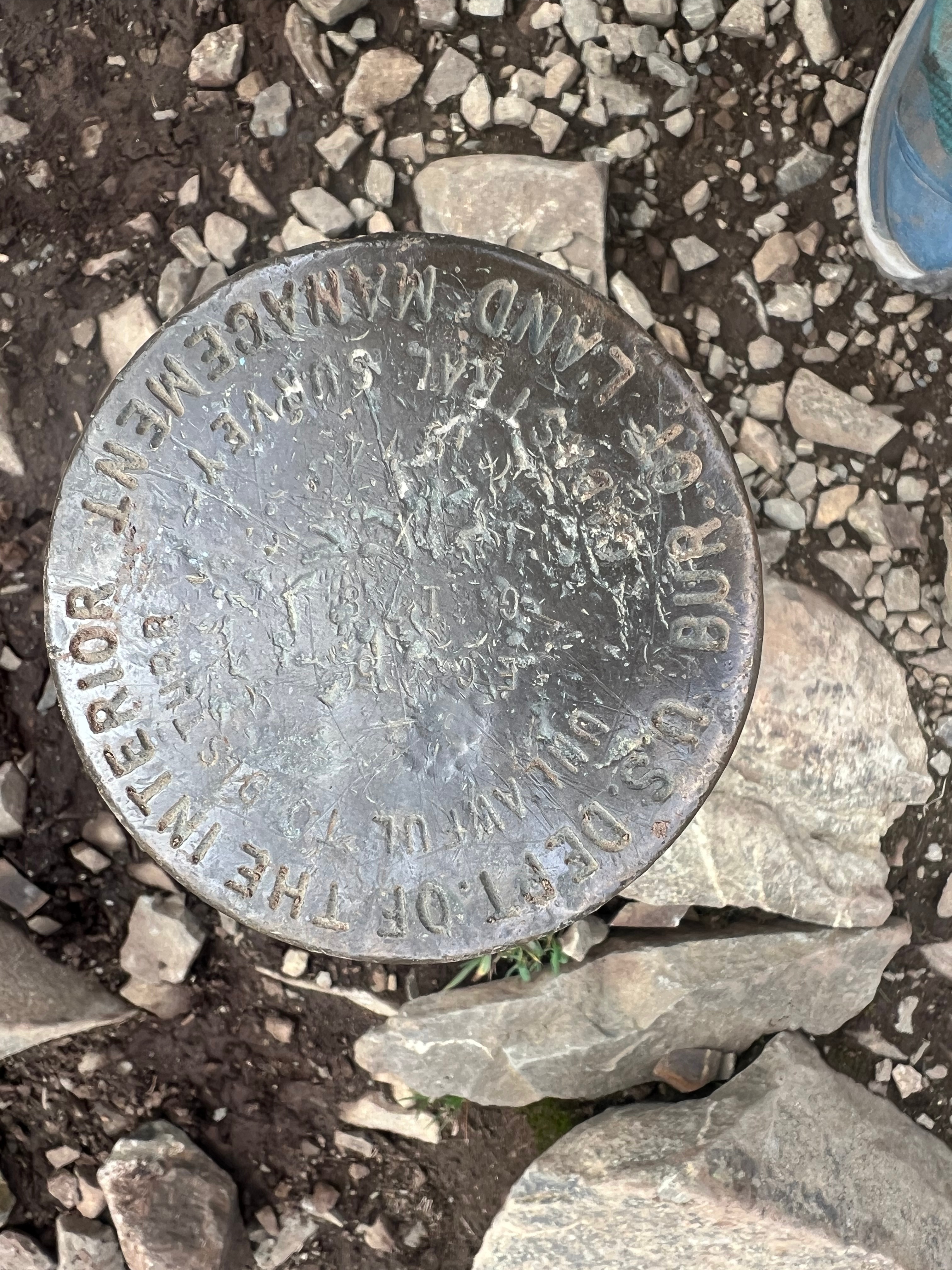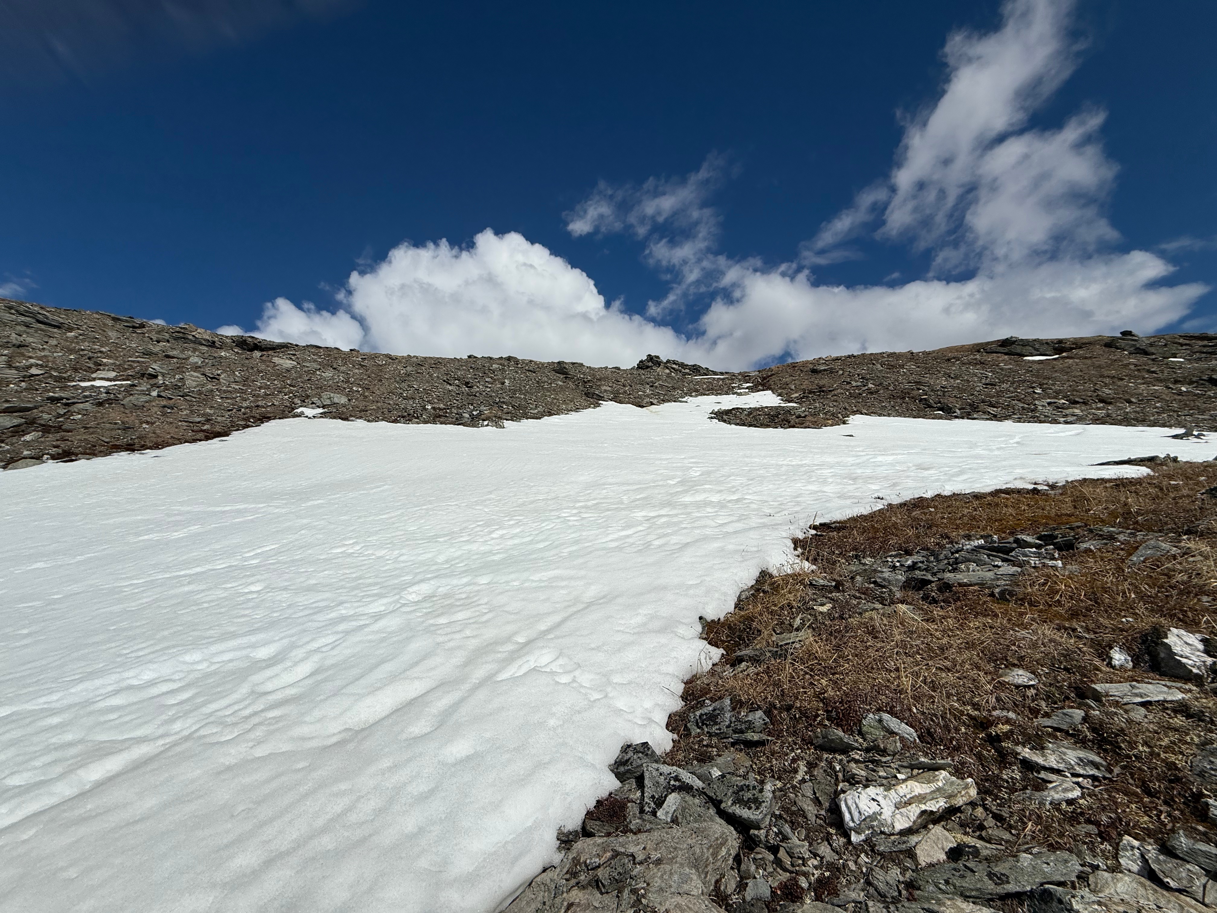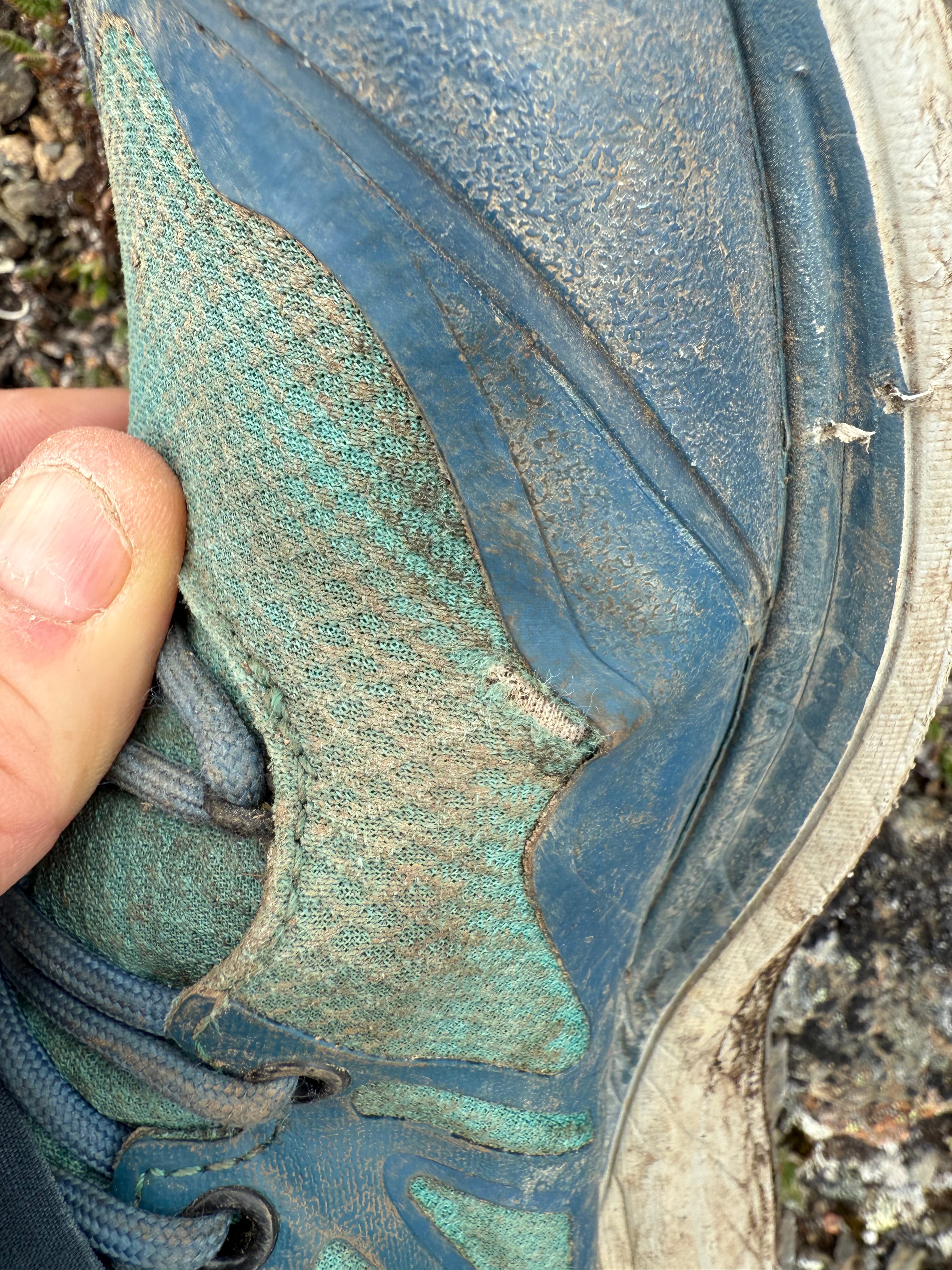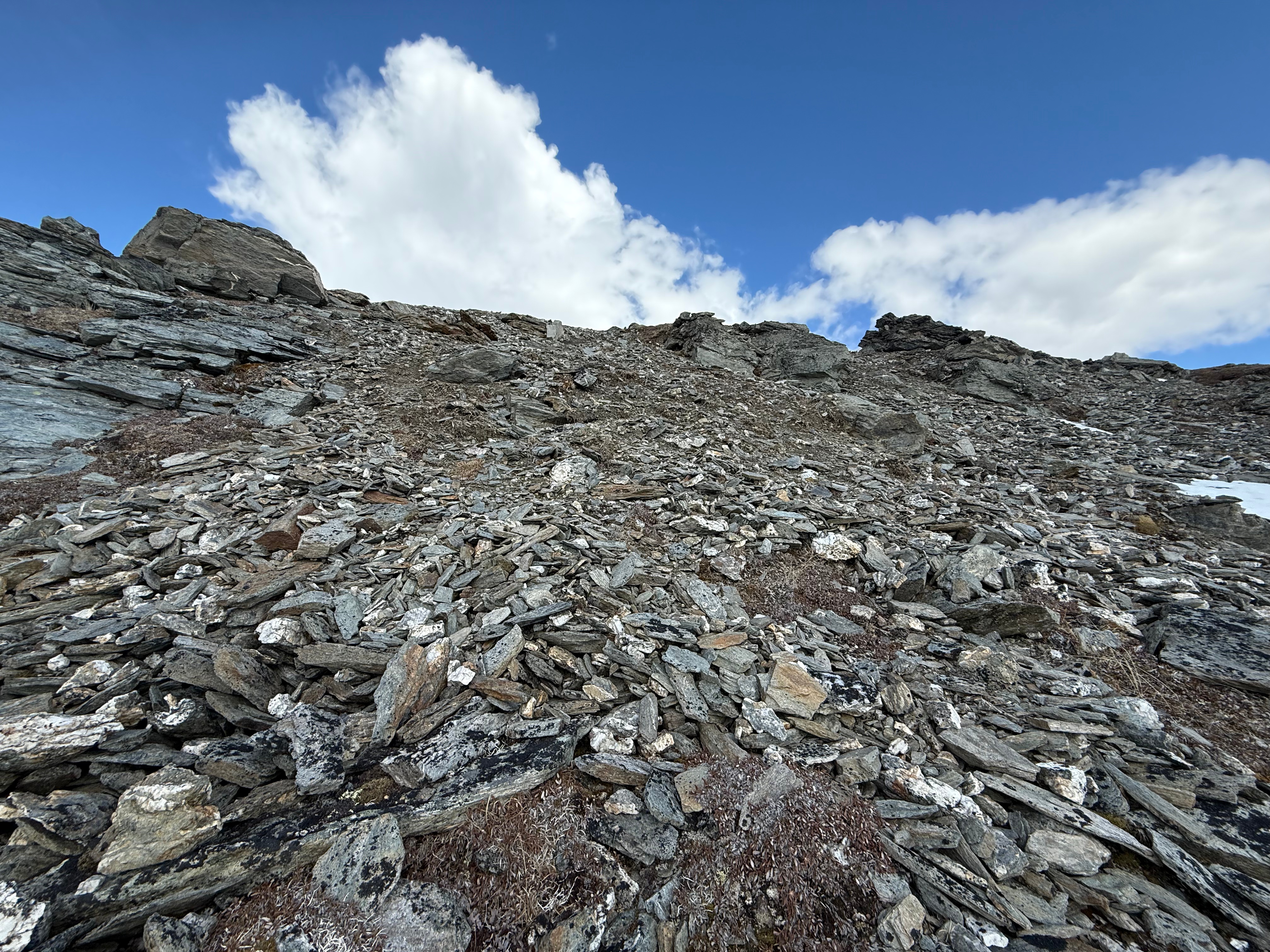 The true summit of Knoya is tucked away from the main ridgeline, so as we approached what seemed to be the peak at around mile 4.8, we veered just south of the intersection of the ridges leading to The Dome and Kanchee, traversing the south-facing slopes. There’s little risk here, aside from the jagged rocks—one of which managed to slice through my shoe when I misstepped. Thankfully, my Topos took the damage and my foot was fine.