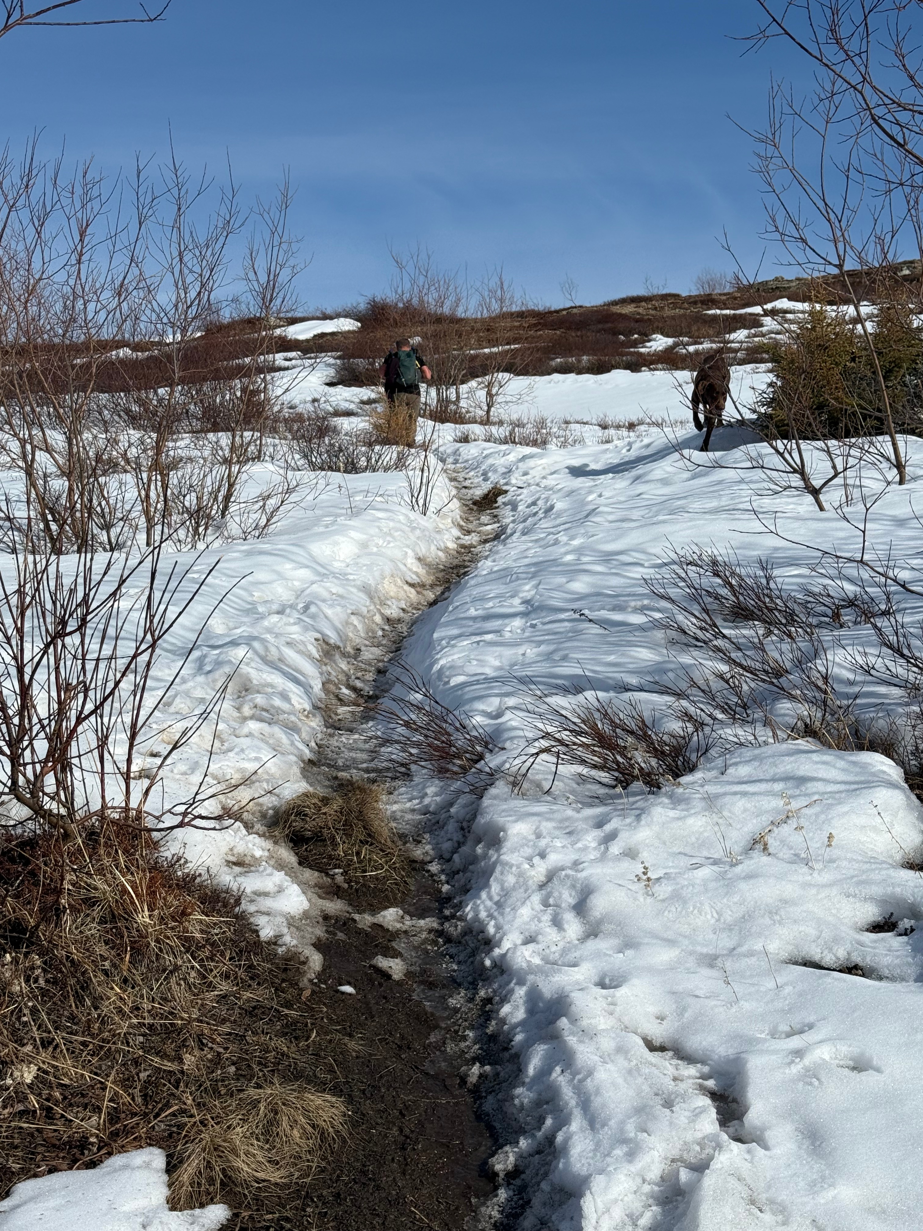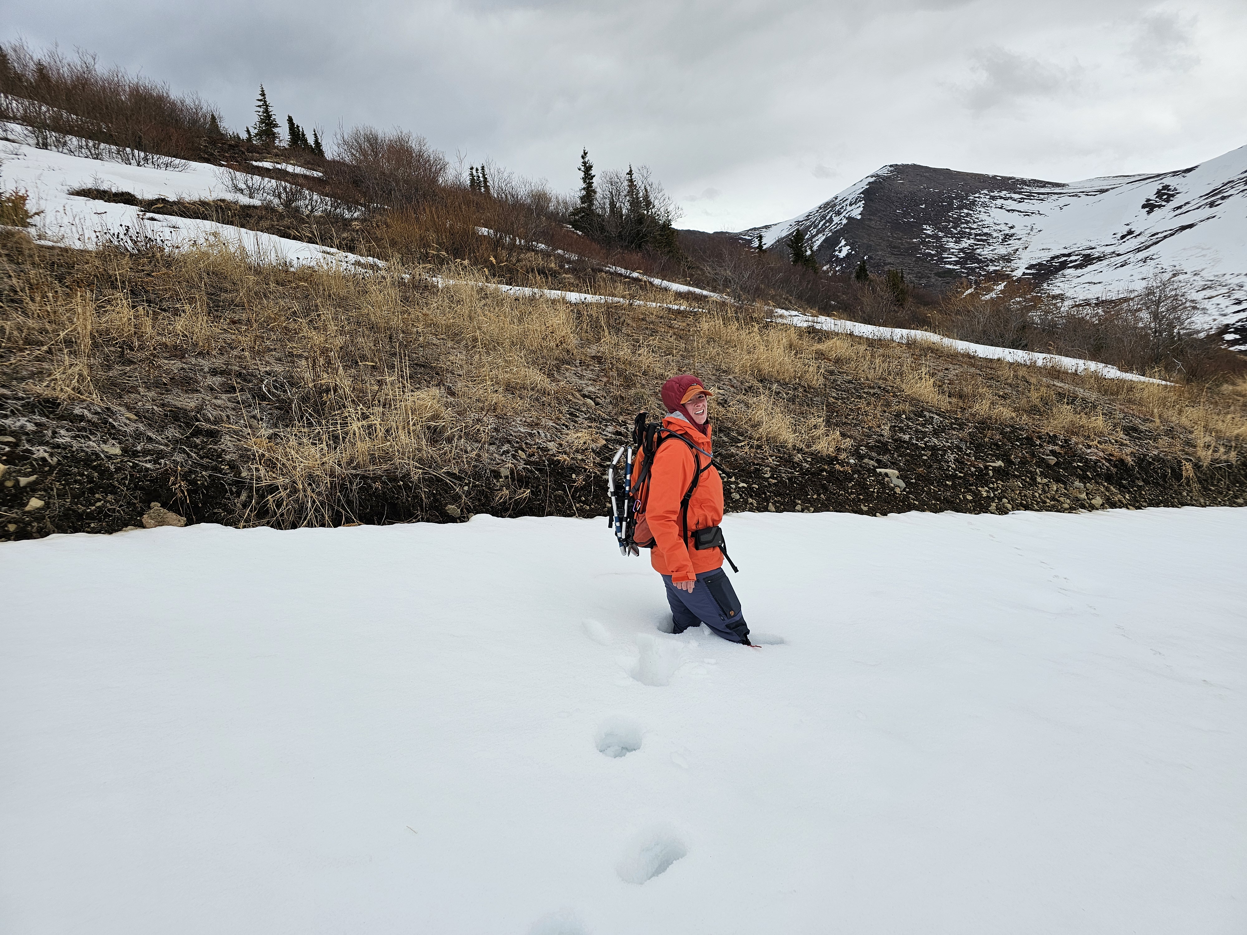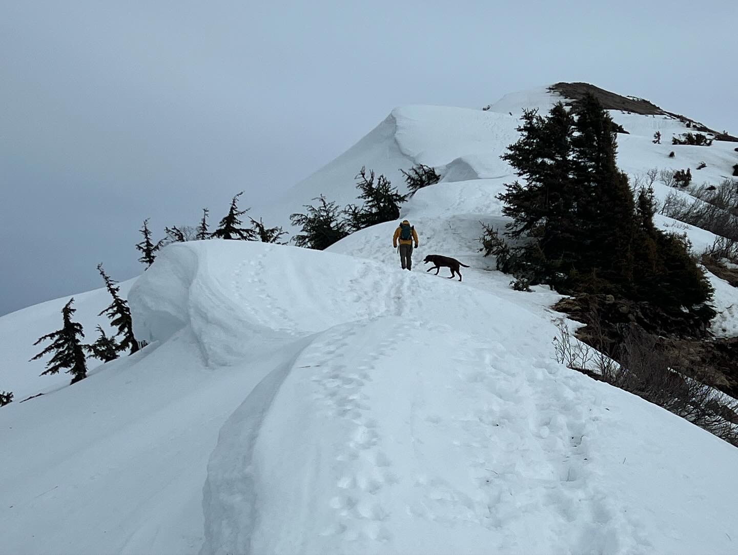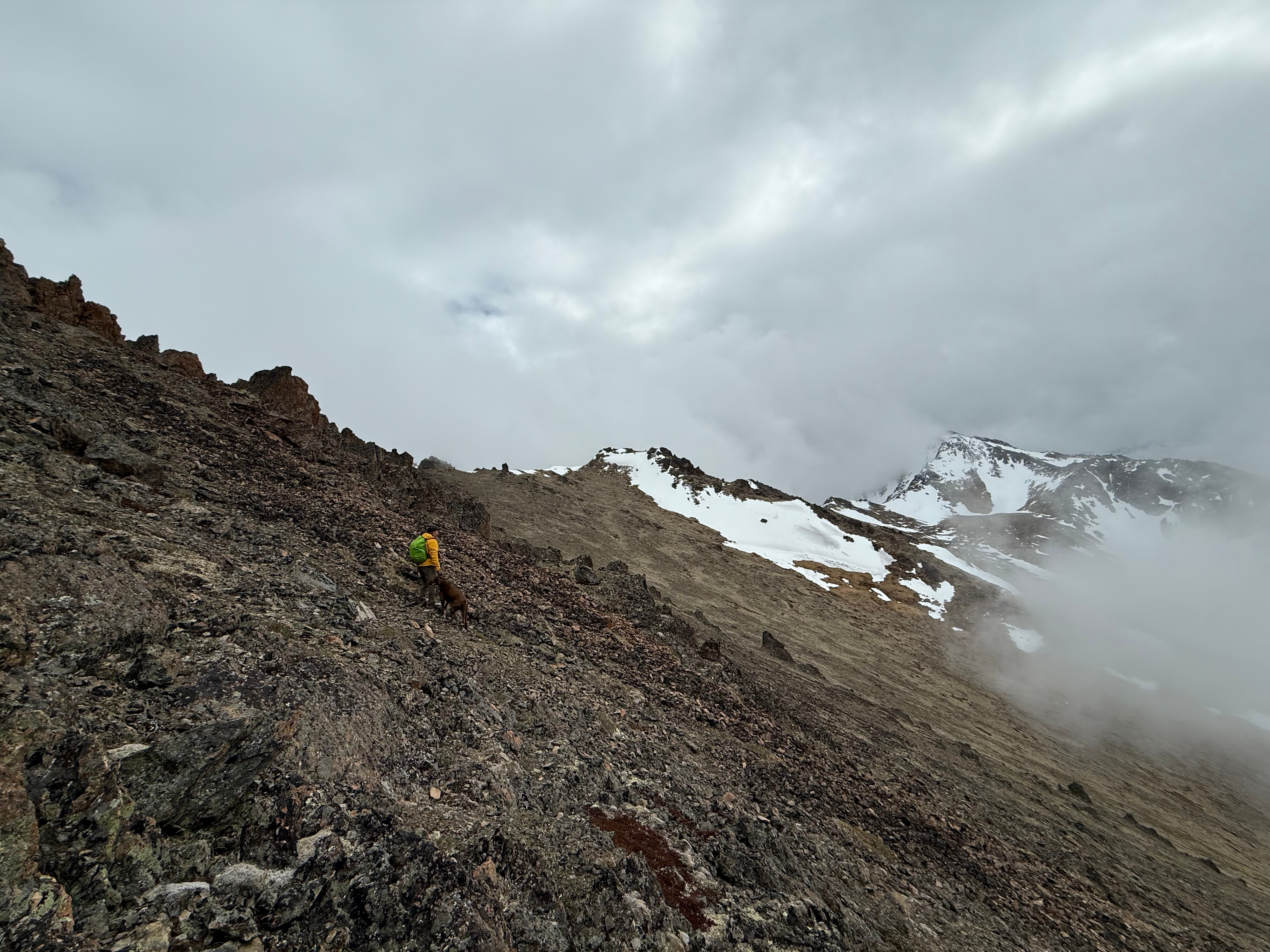 Now six miles in, with three summits and over 4,000 feet of gain behind us, we paused to put on our tall gaiters. Deep snow clung to the ridgeline and northwest face of Kanchee. I voiced concern about the ridge route due to unconsolidated snow and a sheer drop-off to the east (I’m always irrationally paranoid that my dog might leap off a cliff), so we descended via Kanchee’s west ridge to a point where crossing the snowfield felt safer.