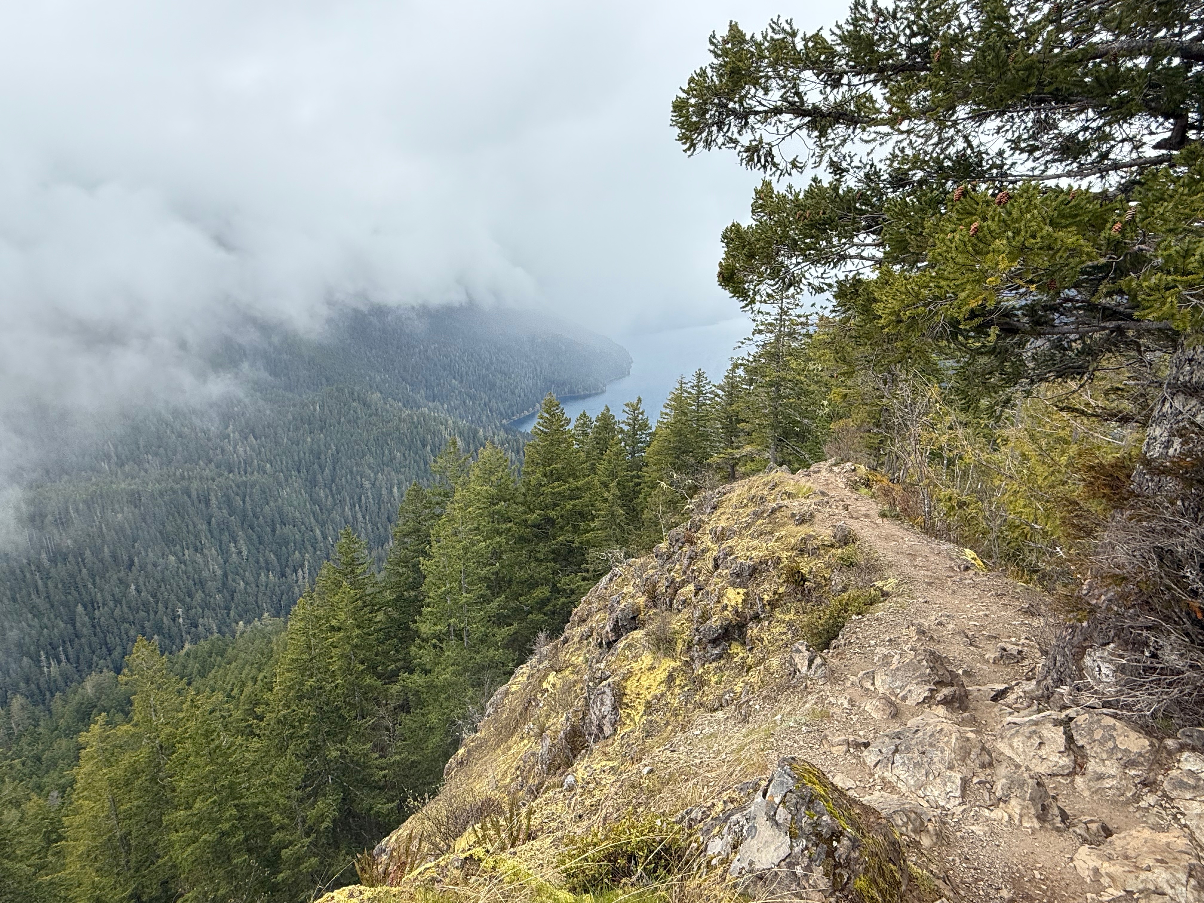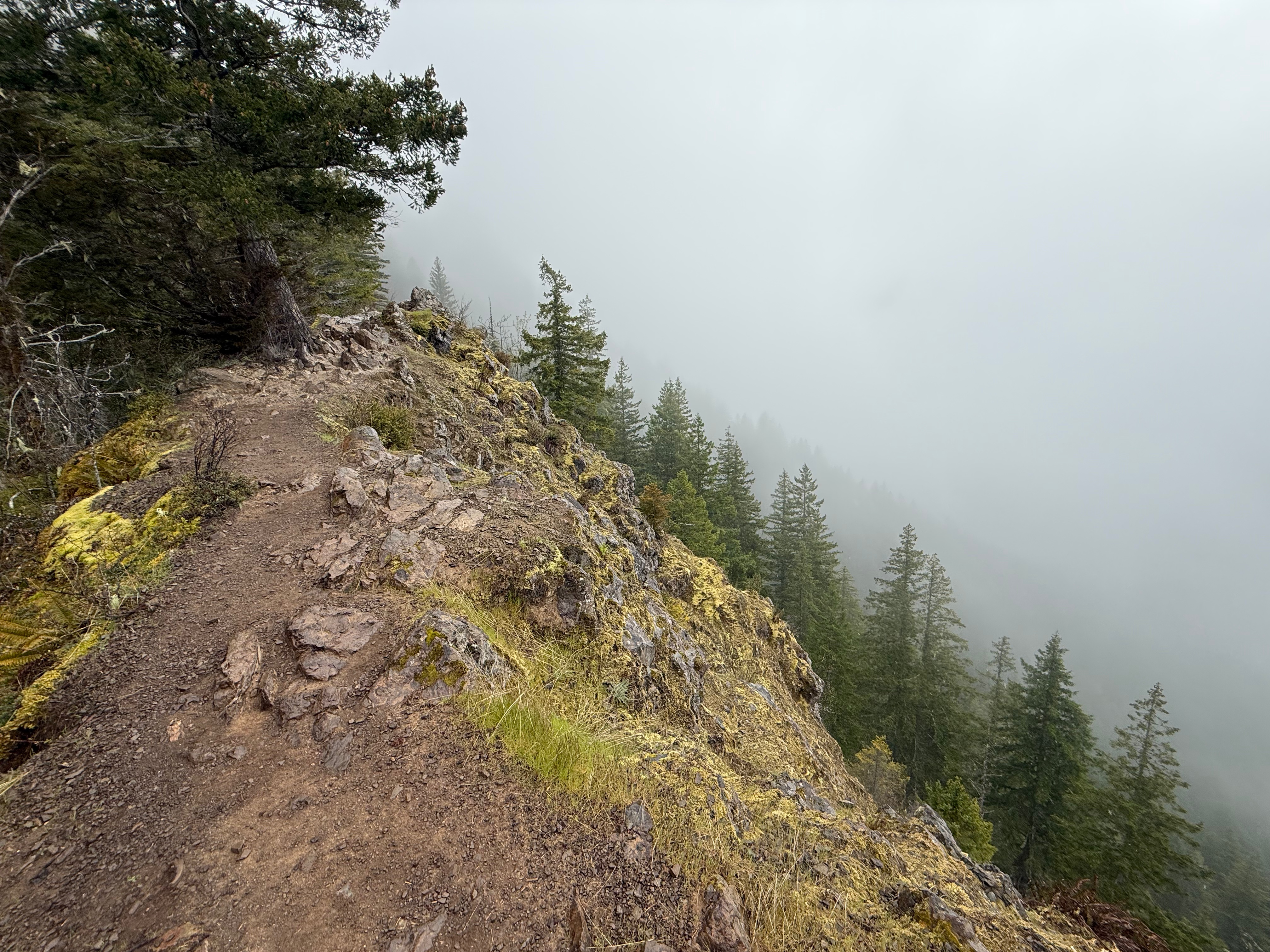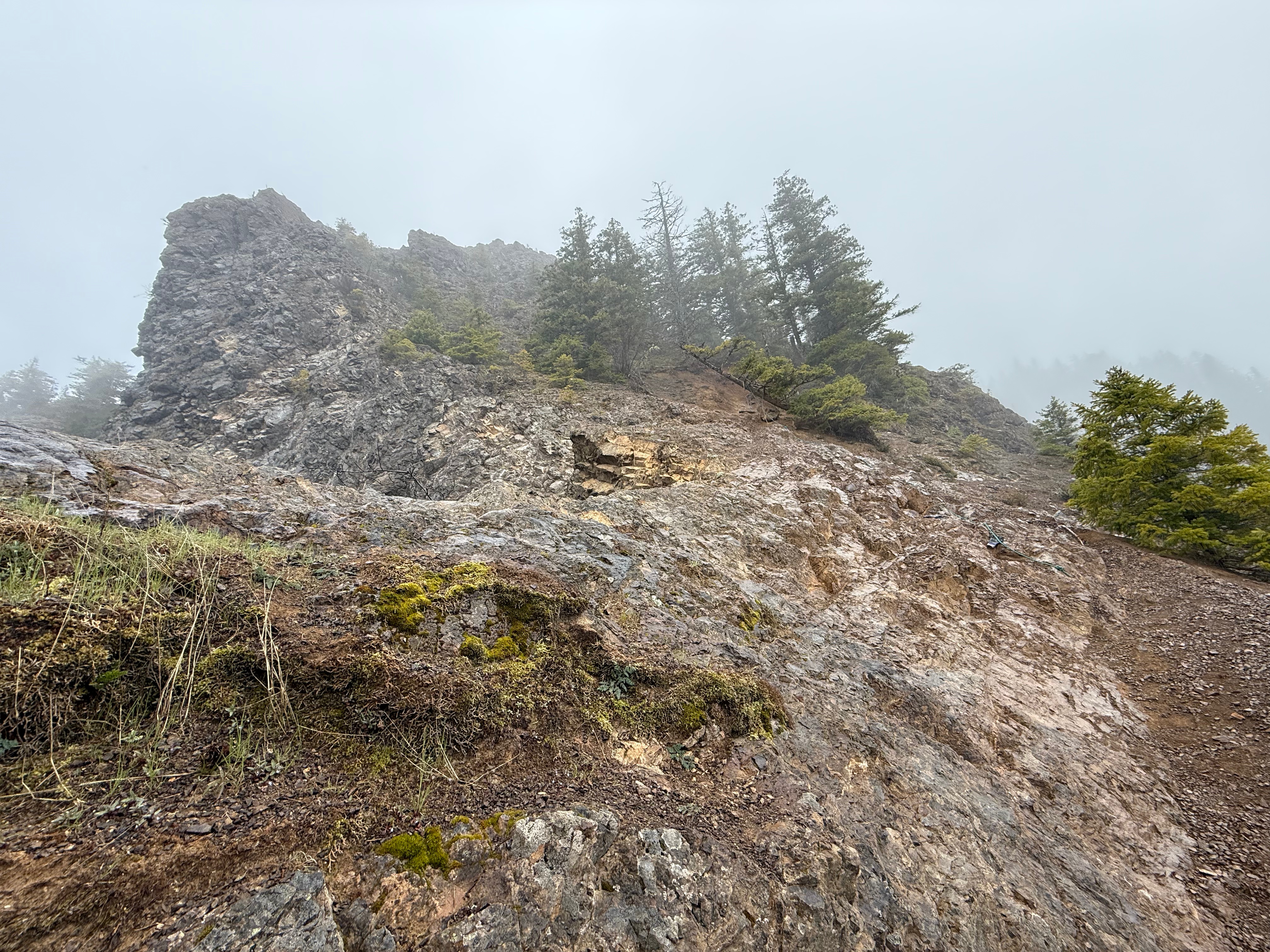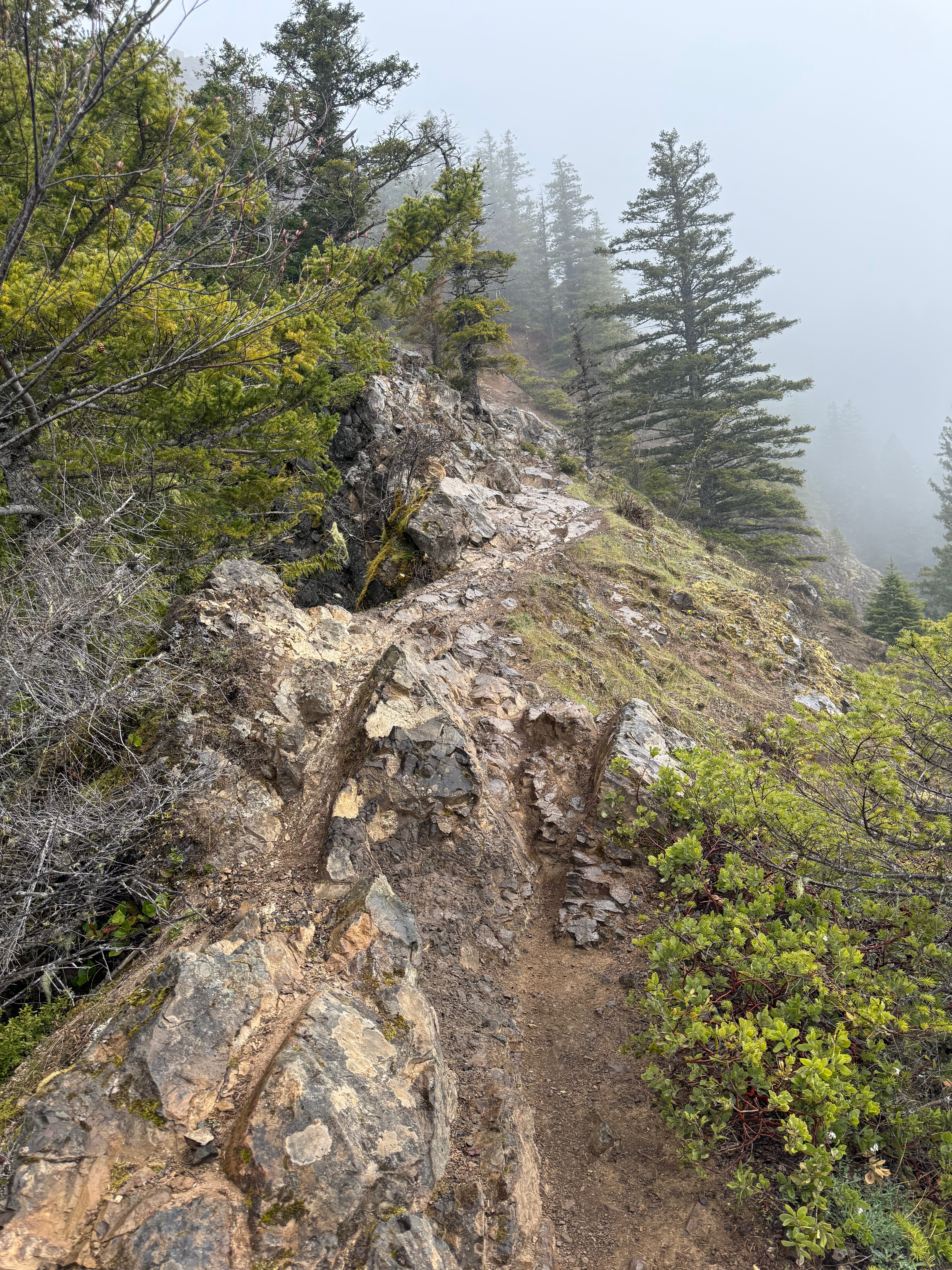Within two miles, we had already passed a variety of freshly blossomed wildflowers and the Long Lake Trail. Not long after that, we were above the treeline and deep in the fog. As we trudged along in our respective gloomy stupors, craving warmth and sunlight, little glimpses of blue sky would peek out from behind the thick clouds, offering slivers of hope.