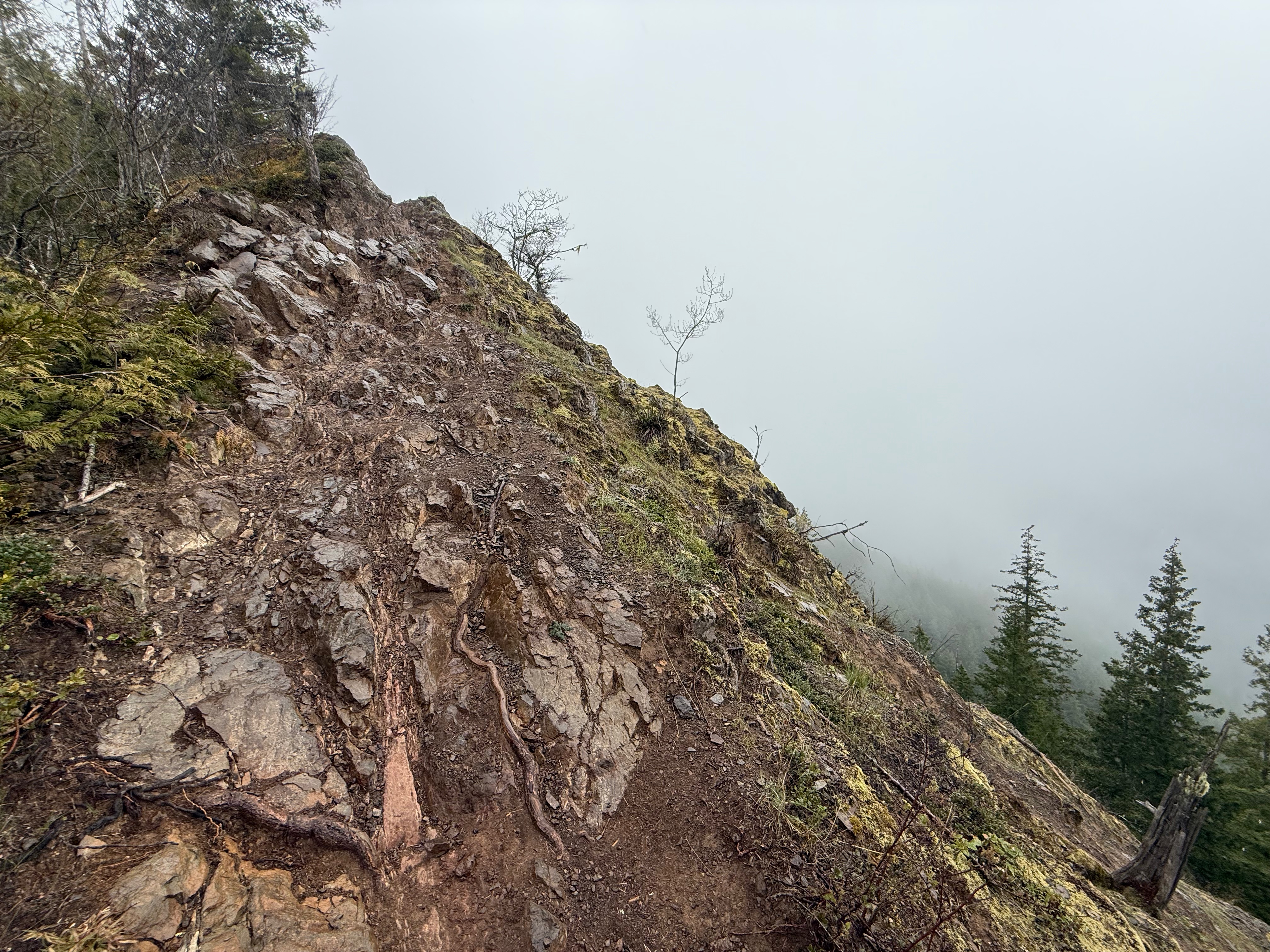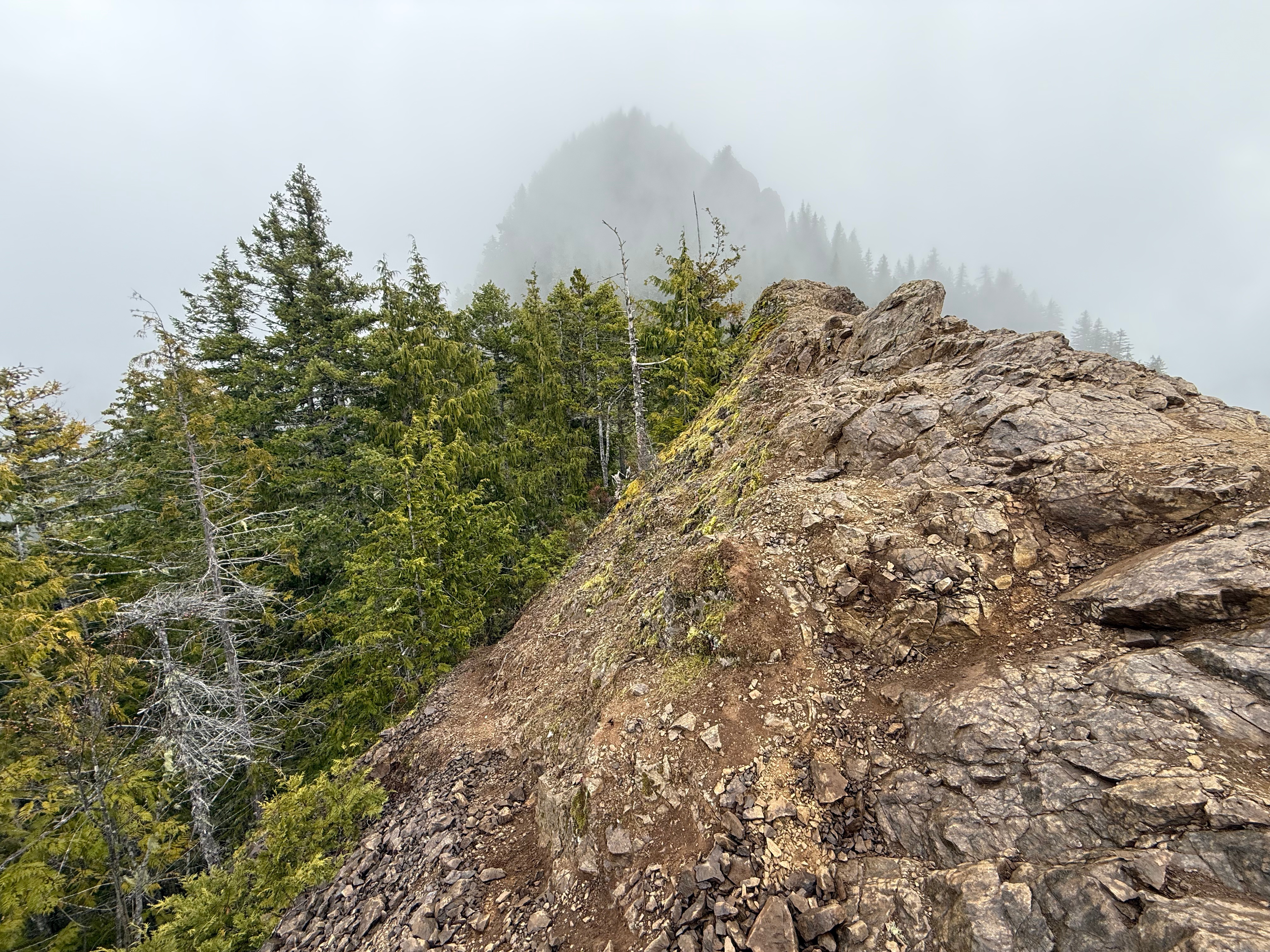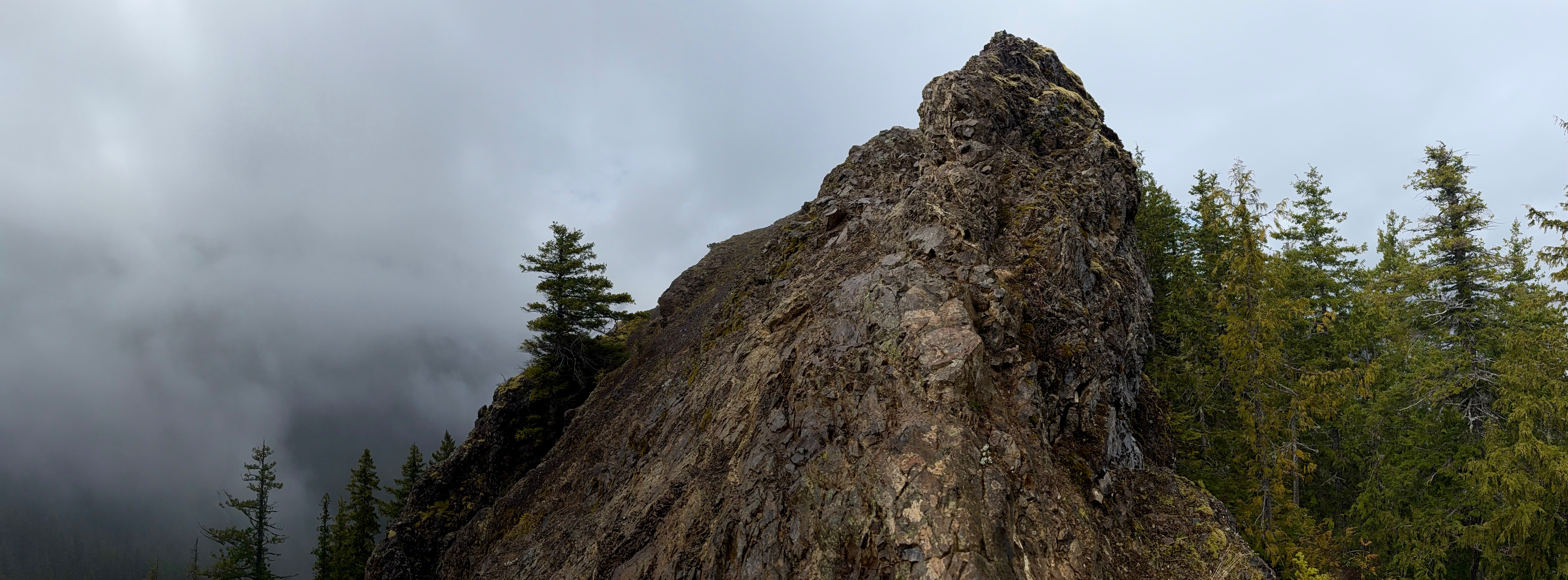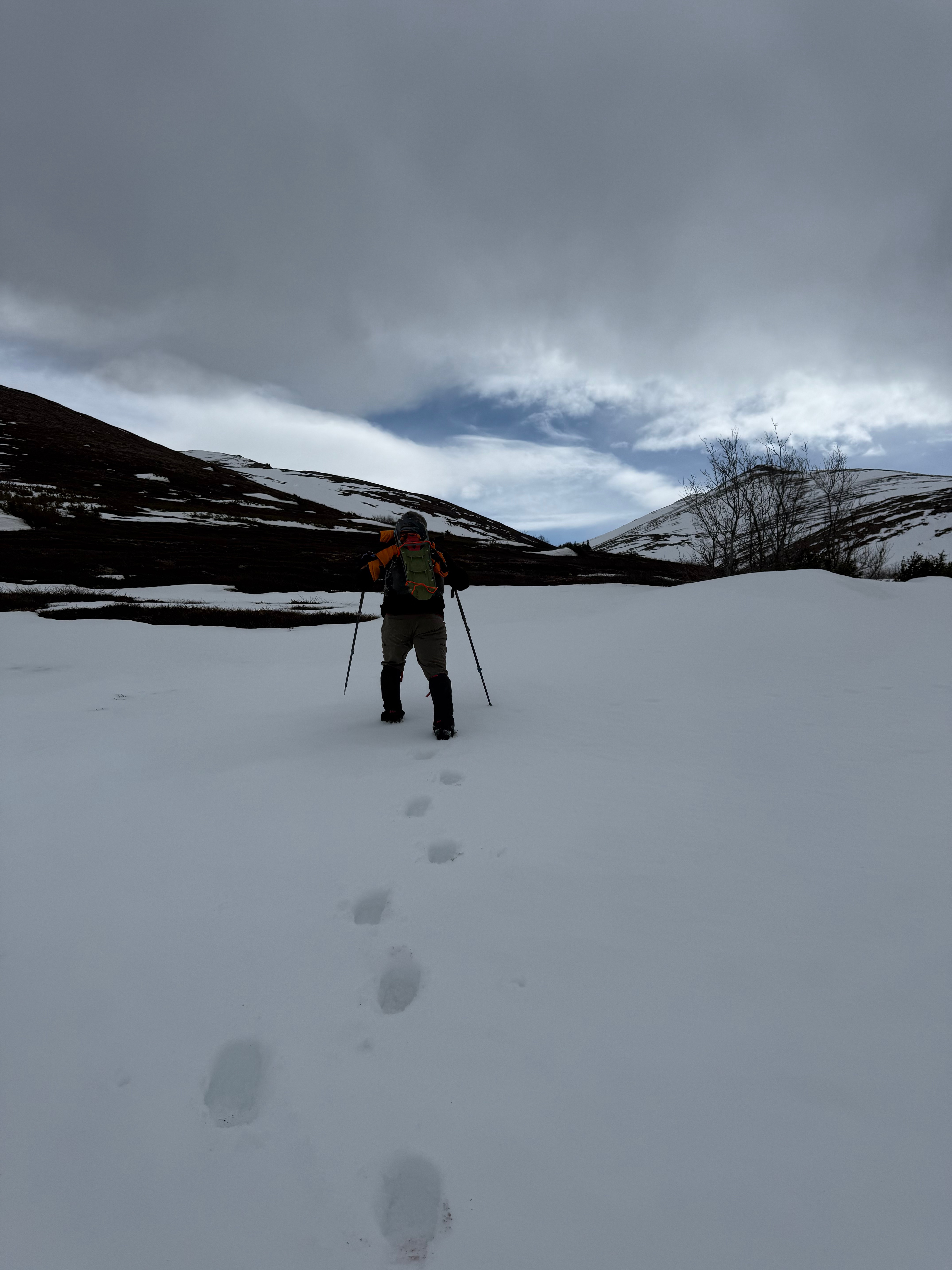 We snapped a few summit photos and turned northwest toward our next goal: Kanchee Peak. While many GPX tracks on Gaia and Peakbagger show a direct ridge route to Kanchee, we chose to retrace our steps about a quarter mile and follow a less exposed, less scrambly path along the north slope of Knoya’s false summit. The snow stopped suddenly, but the clouds lingered.