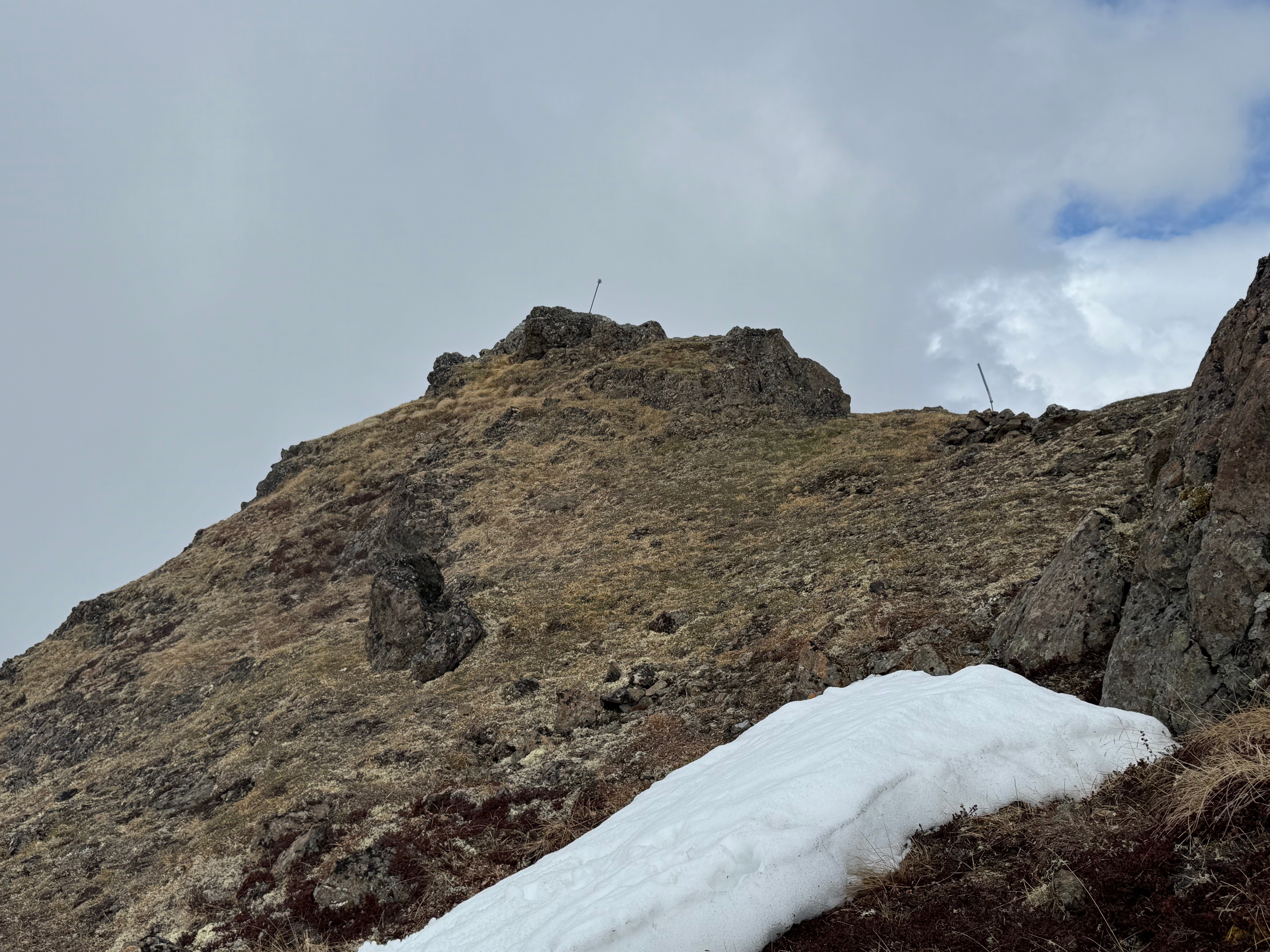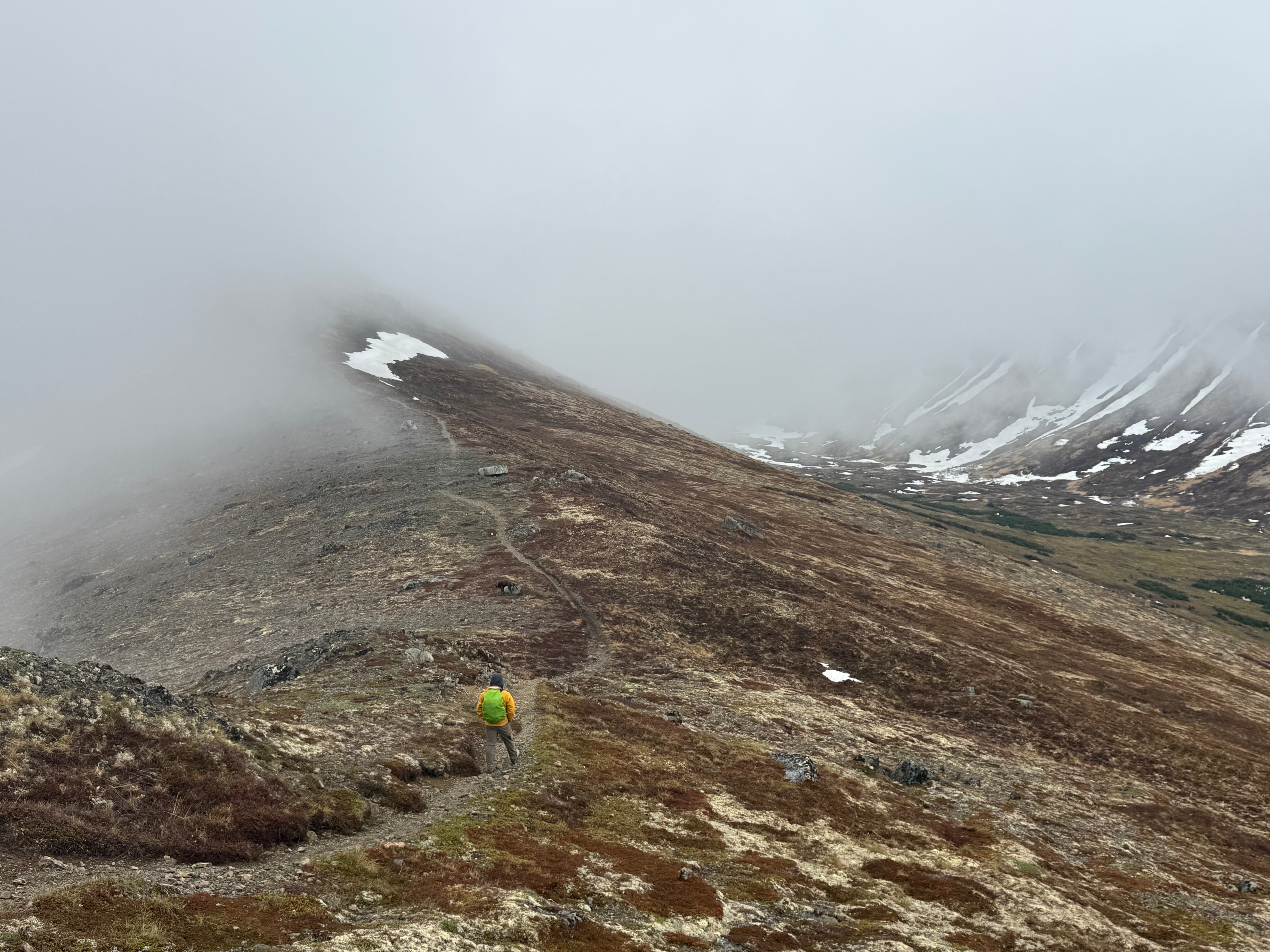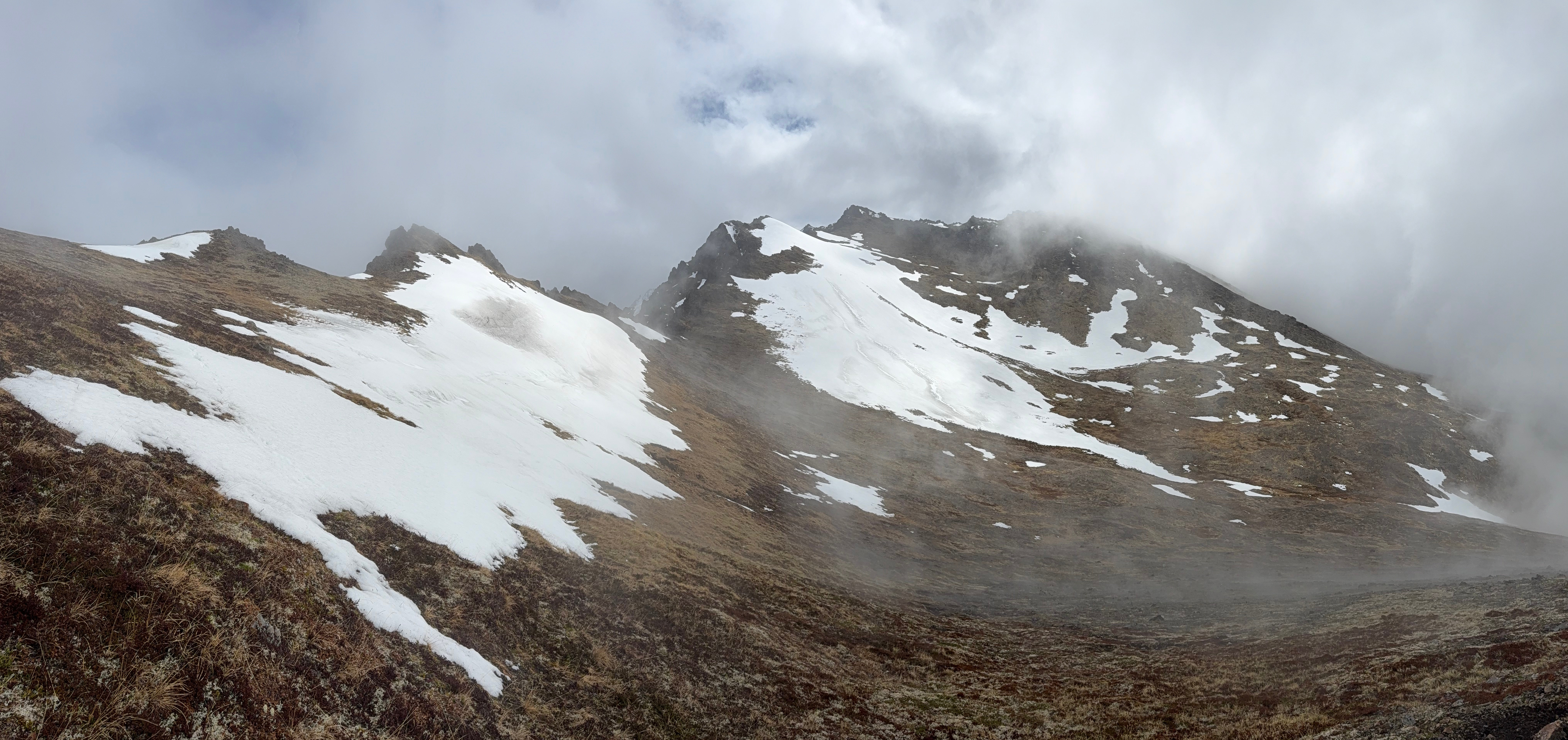 Even 700 feet below the summit, we were still postholing through knee-deep snow. I eventually chose to slide down the final few patches to the base of Nunaka. Two hundred feet above us stood the summit of Nunaka, the last peak in the ridgeline series—seven miles into our hike now. The clouds returned as we walked up the grassy slopes, and by the time we reached the top, the views had vanished again.