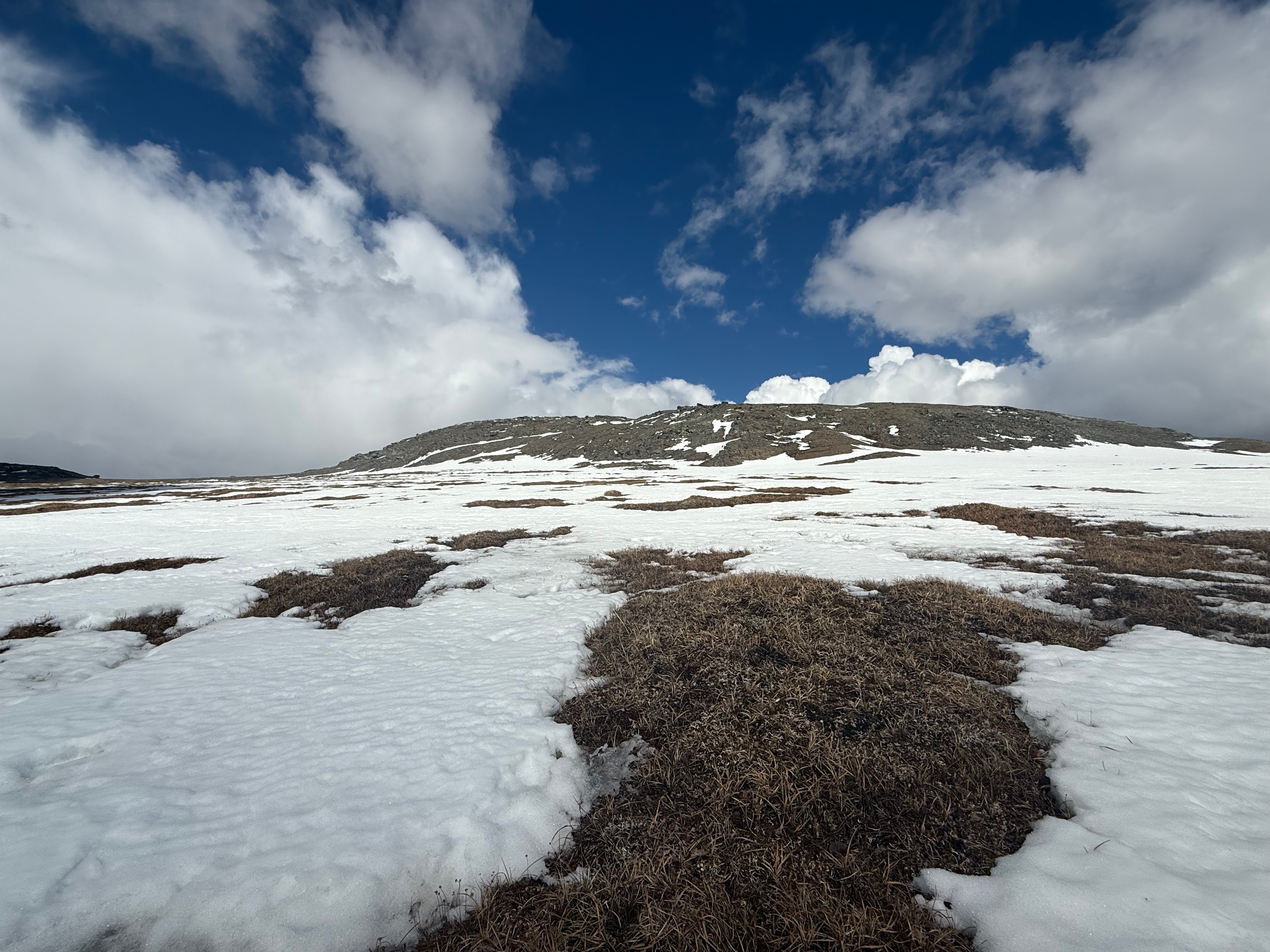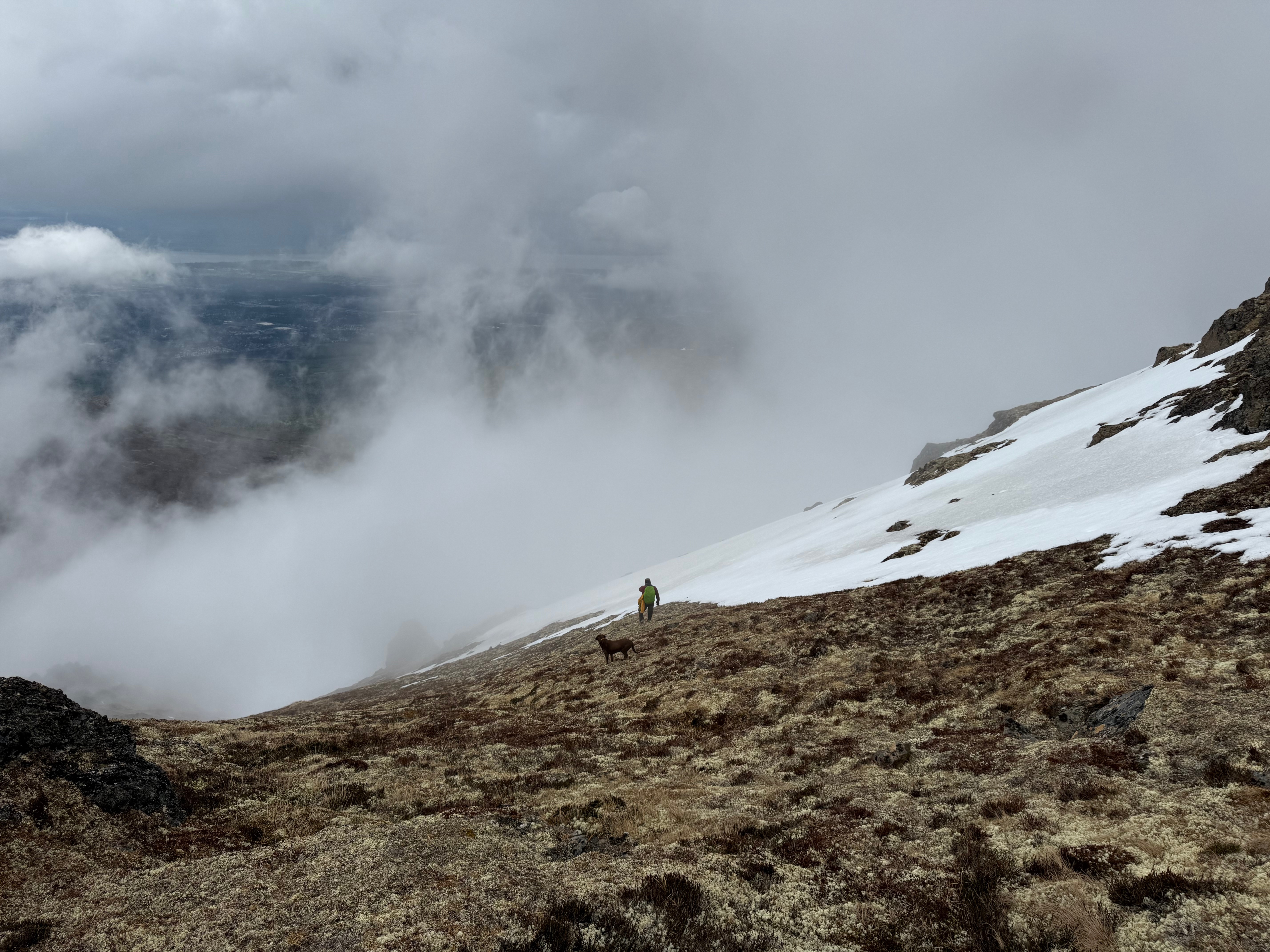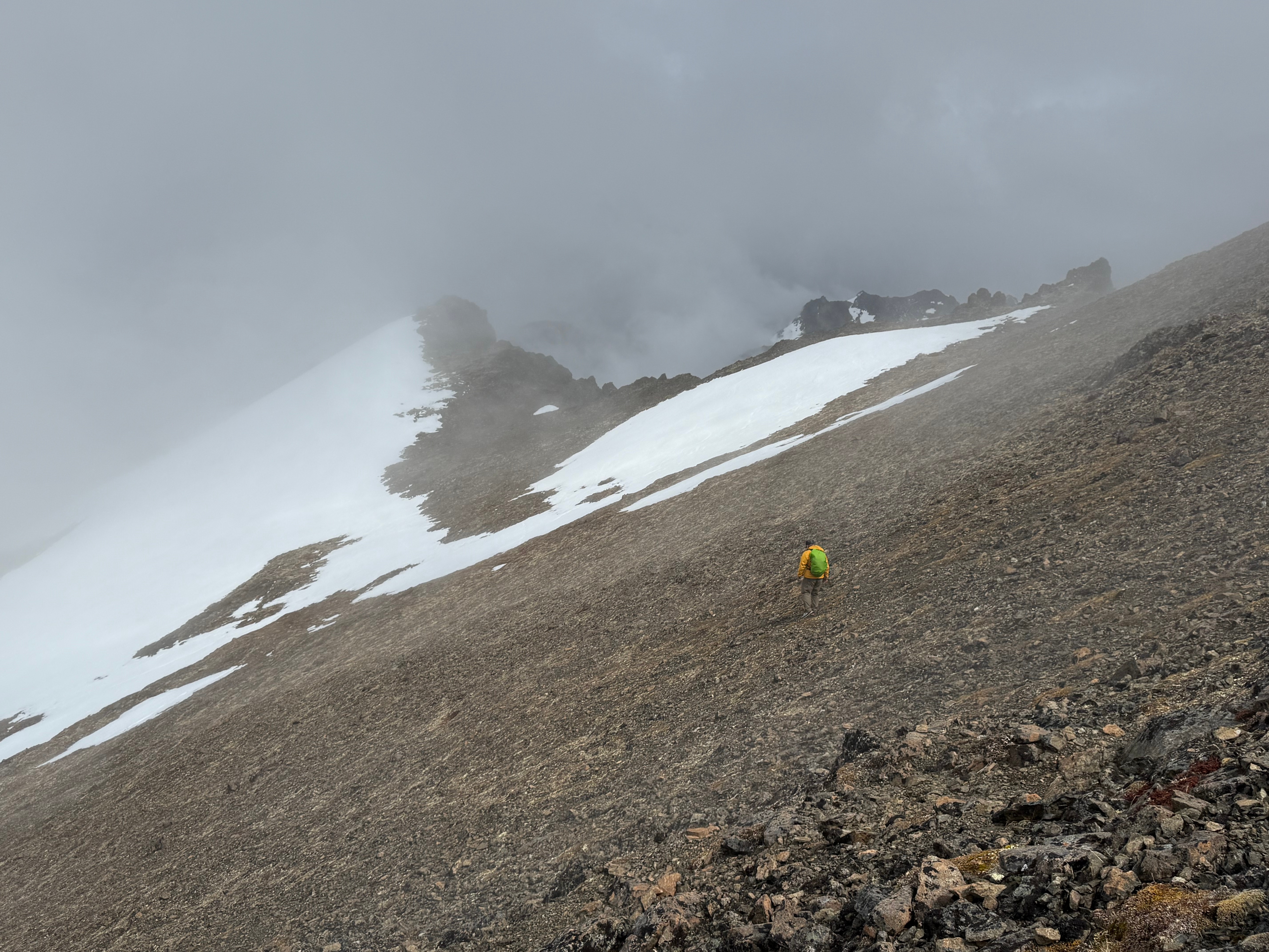 Even 700 feet below the summit, we were still postholing through knee-deep snow. I eventually chose to slide down the final few patches to the base of Nunaka. Two hundred feet above us stood the summit of Nunaka, the last peak in the ridgeline series—seven miles into our hike now. The clouds returned as we walked up the grassy slopes, and by the time we reached the top, the views had vanished again.