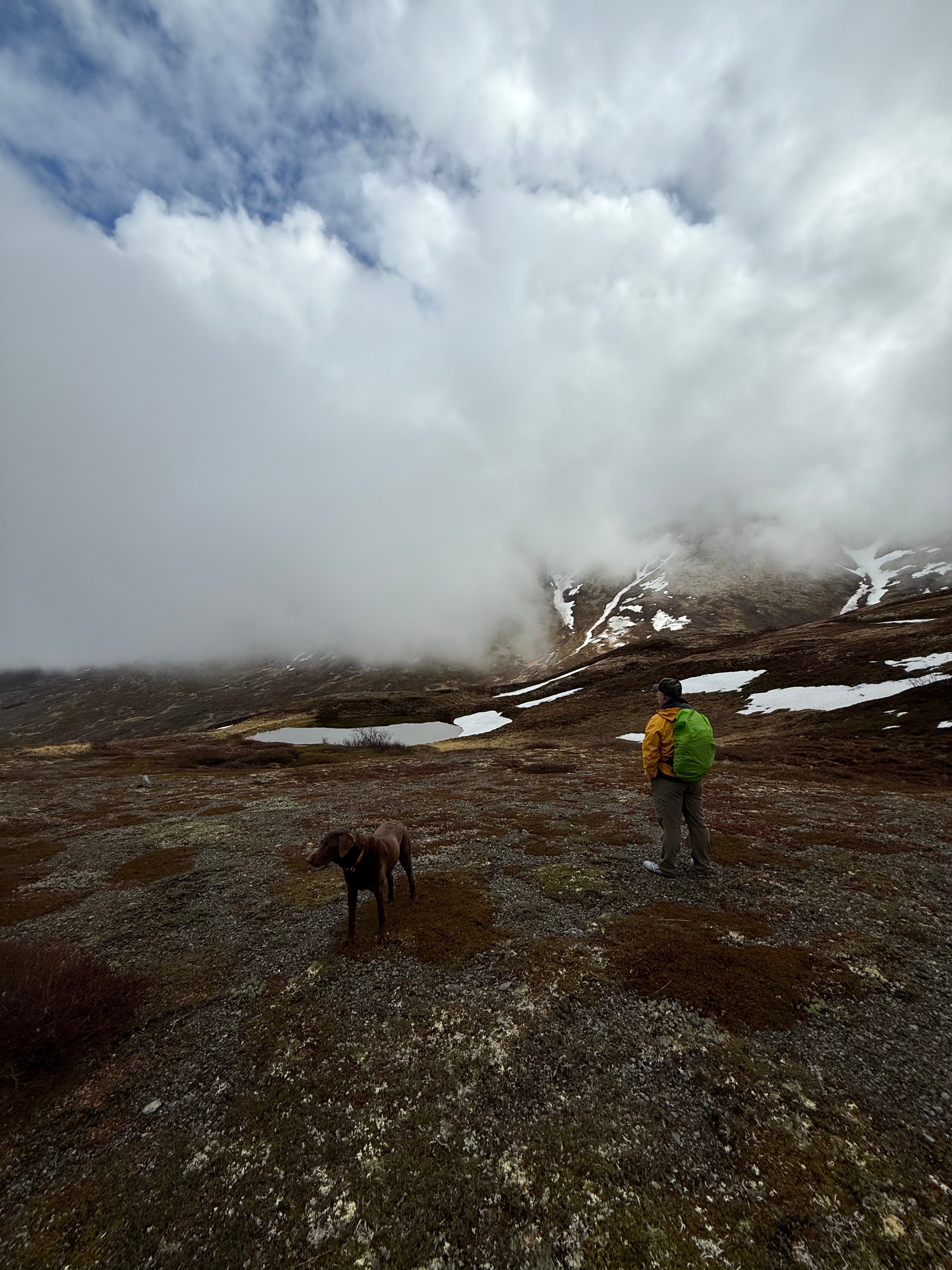 The summer wasn’t summering, and I was suffering from a bout of springtime depression that only sunshine and warm weather could cure. I dragged myself to the Klutina Trailhead to meet Jason. We left one vehicle there and carpooled up to our starting point at Stuckagain Heights—neither of us particularly excited to hike in the fog and rain. After a bit of complaining, we checked in on the JBER RecAccess website for the areas we’d be hiking and set off toward The Dome.