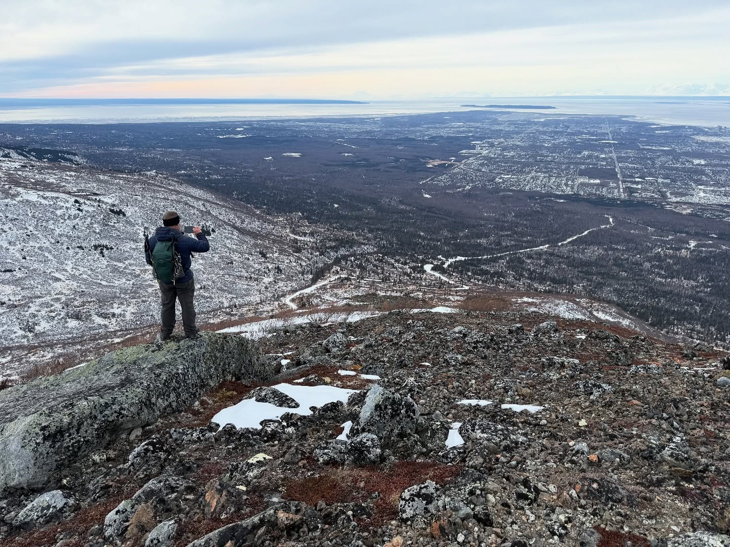 The sky continued to open up, and the little blue patch grew. We spotted a small cabin down in Snow Hawk Valley. I’ve heard of people using it, but since it’s on JBER land where overnight stays aren’t permitted, I haven’t found any official resources explaining how to legally use the shelter. I wouldn’t recommend attempting an overnight trip there without written permission from JBER officials—you don’t want to lose access to military land hikes.